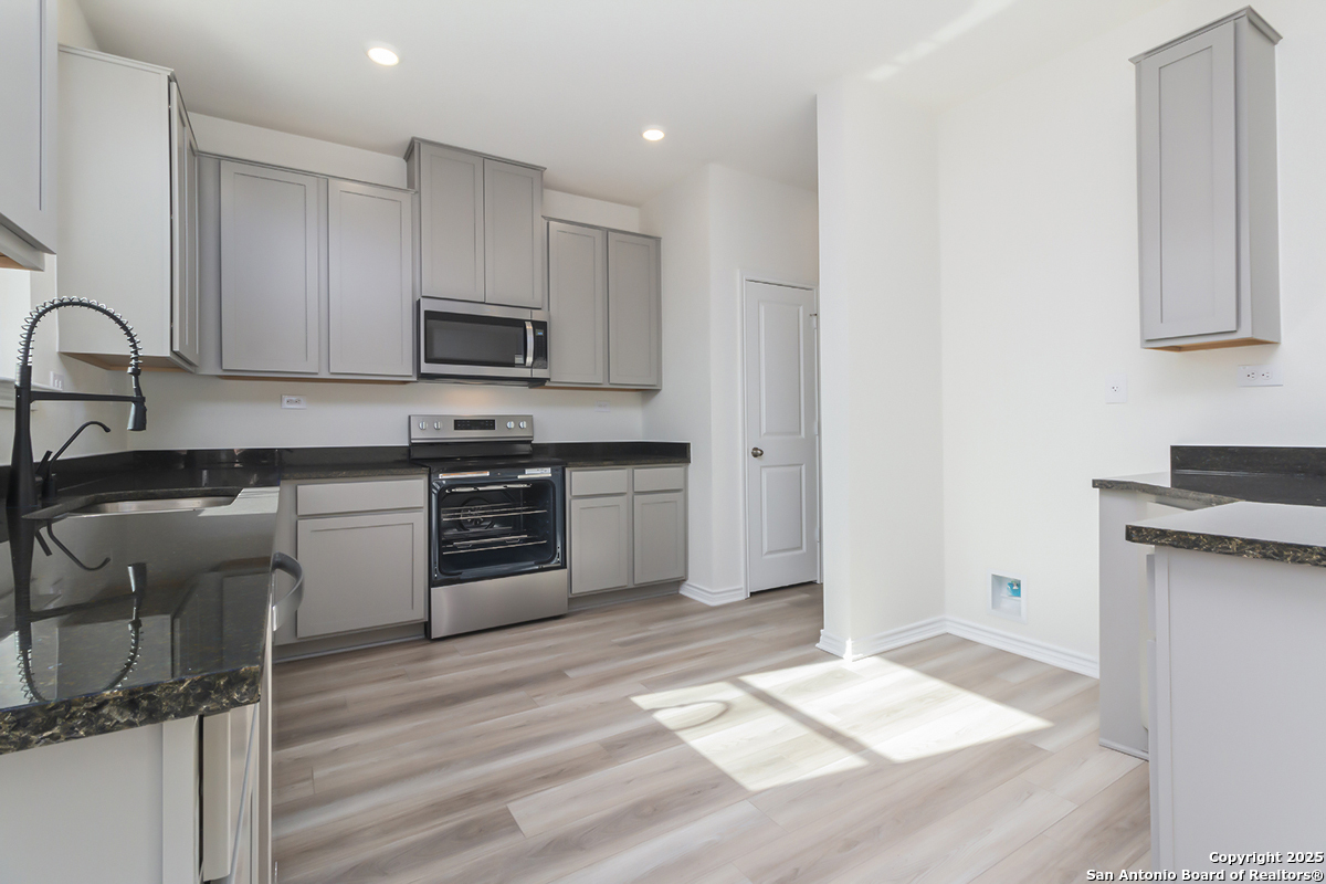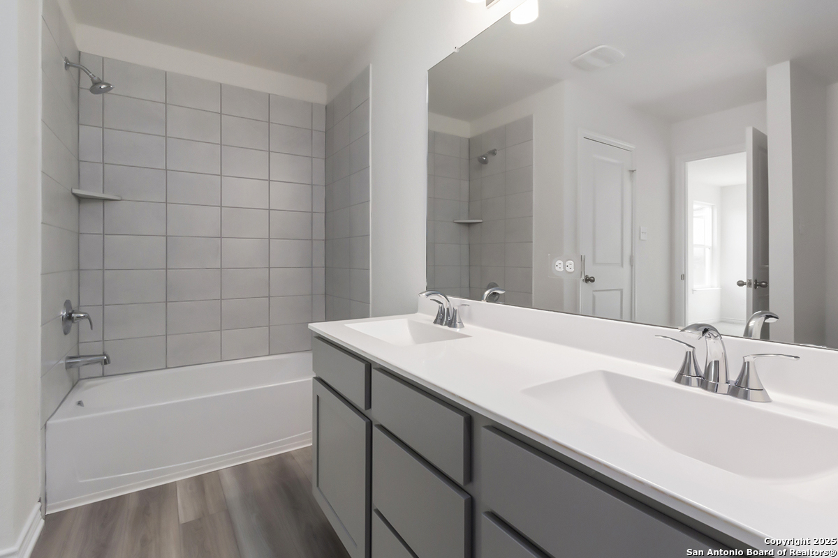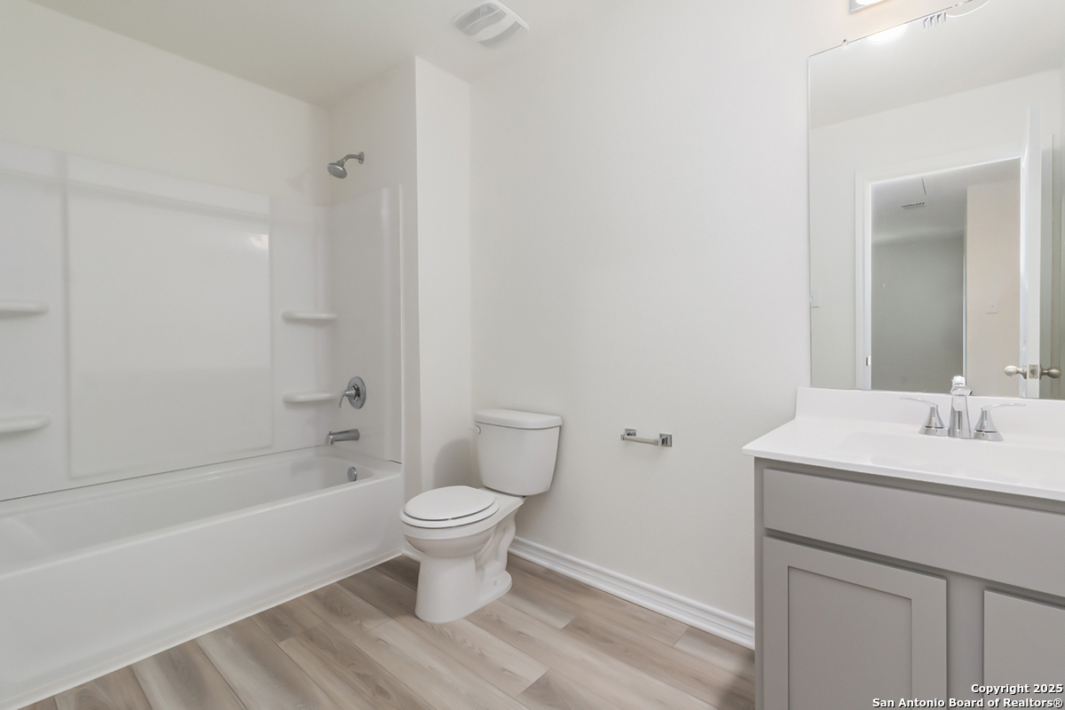 Welcome to a home where style and comfort blend seamlessly. The 9-ft. ceilings on the first floor create an open, inviting atmosphere. The kitchen features Woodmont Dakota Shaker-style 42-in. upper cabinets and Ubatuba granite countertops, including an extended breakfast bar ideal for entertaining. The primary bath offers a dual-sink raised vanity and a 42-in. garden tub/shower combo, perfect for relaxation. Elegant vinyl plank flooring adds a touch of sophistication and ease of upkeep. For added security, the home is equipped with a state-of-the-art wireless system. Outside, enjoy the covered patio and well-maintained lawn, thanks to an automatic sprinkler system. This home beautifully combines modern design with practical features for a comfortable living experience.