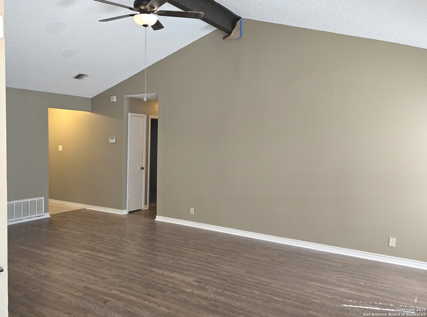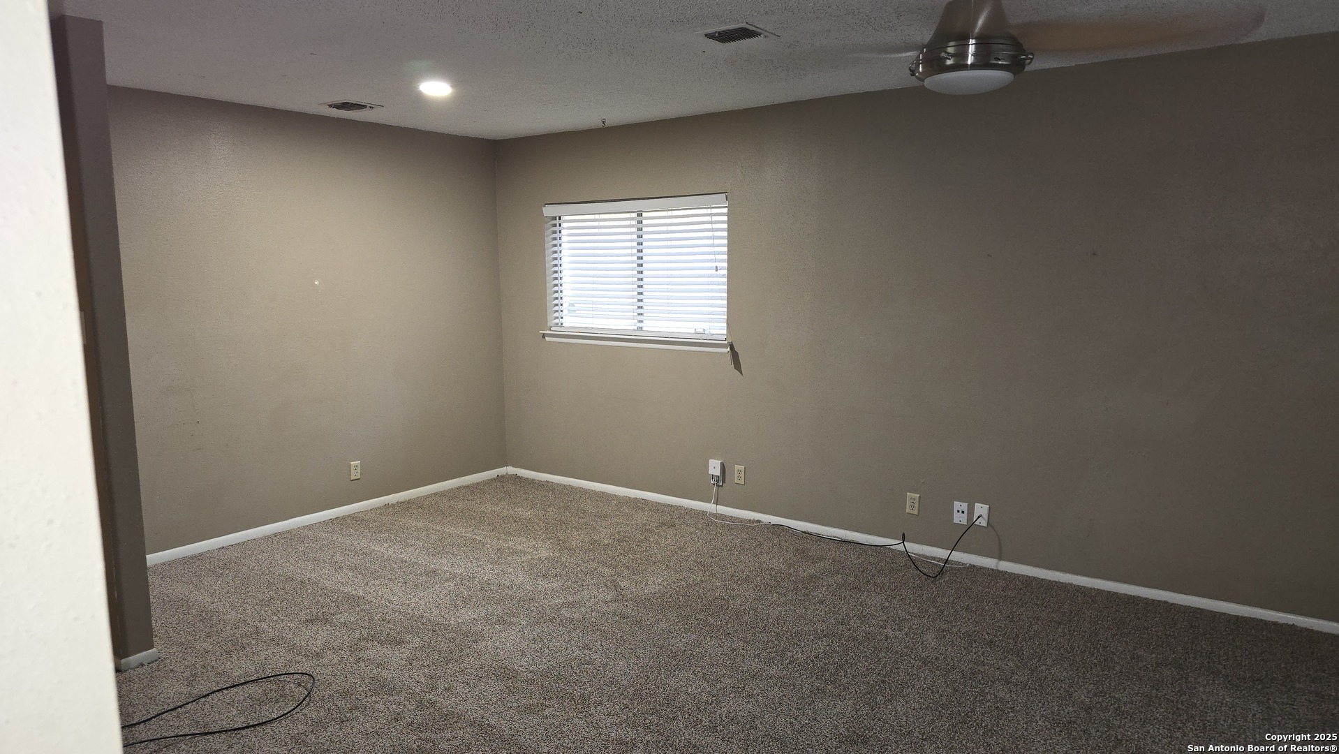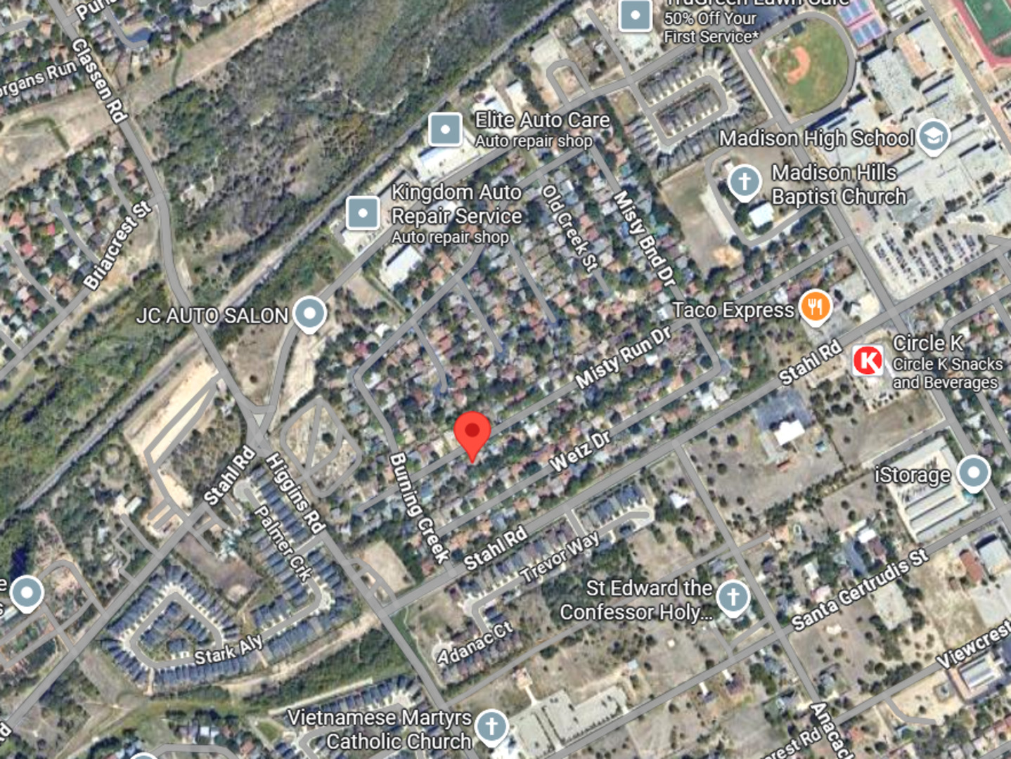 4618 Misty Run offers a convenient location less than a mile from Madison High School with easy access to Friesenhahn Park, HEB, and major roads. The home features 3 bedrooms, a large living room with a stone fireplace and cathedral ceiling, new carpet and wood laminate flooring, and a spacious galley kitchen. Mature trees add curb appeal, and the washer, dryer, and refrigerator are included.