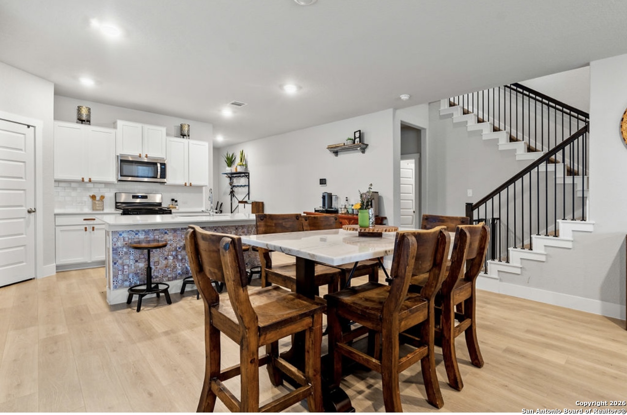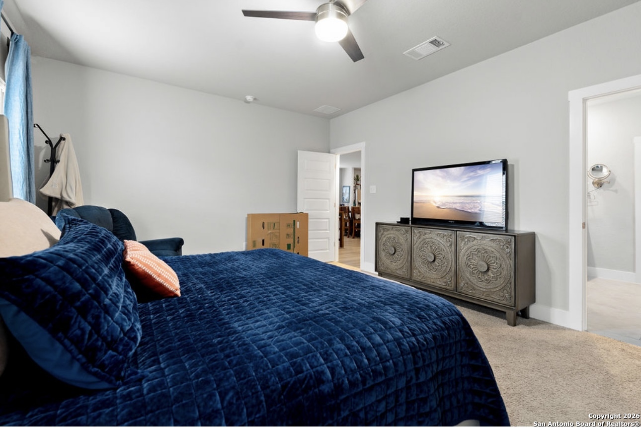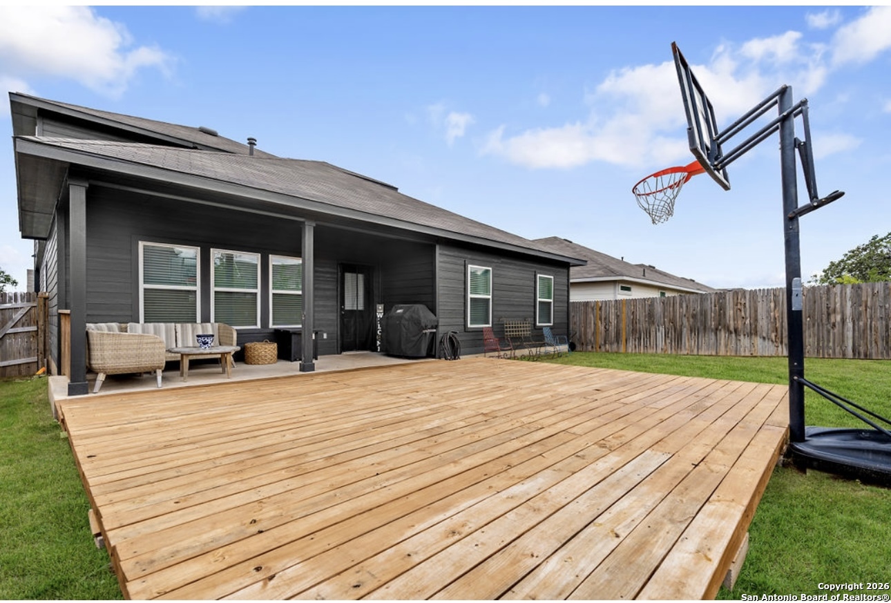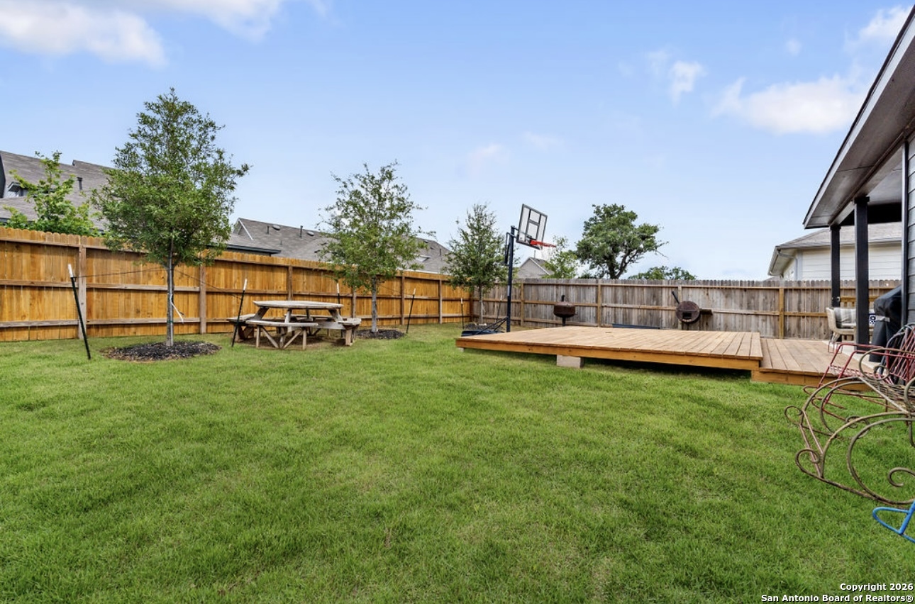 This stunning two-story home boasts 2,711 sq. ft. of thoughtfully designed living space, featuring 5 bedrooms, 3 bathrooms, and a versatile loft. As you step through the foyer, you'll find a secondary bedroom and bathroom conveniently located nearby. The heart of the home is the expansive open-concept area where the kitchen, dining room, and living space flow seamlessly together. The kitchen is a chef's dream with elegant quartz countertops, a classic white subway tile backsplash, modern stainless steel appliances, and a spacious walk-in pantry. The large kitchen island, complete with a deep, single bowl sink, is perfect for meal prep and casual dining. The primary bedroom suite is a serene retreat located at the back of the home for added privacy. It features a generous walk-in closet, double vanity sinks, and a luxurious walk-in shower with a white subway tile surround. Upstairs, you'll find a flexible loft area ideal for a game room or additional living space, along with three more secondary bedrooms and a third full bathroom. Outdoor living is equally impressive with a covered patio and an extended deck, perfect for relaxing or entertaining. The community amenities are unparalleled, featuring a pool with two waterslides, a splash pad, a playground, and a fitness center. There is a second amenity center which includes a basketball court, pickleball court, lazy river, and more!
