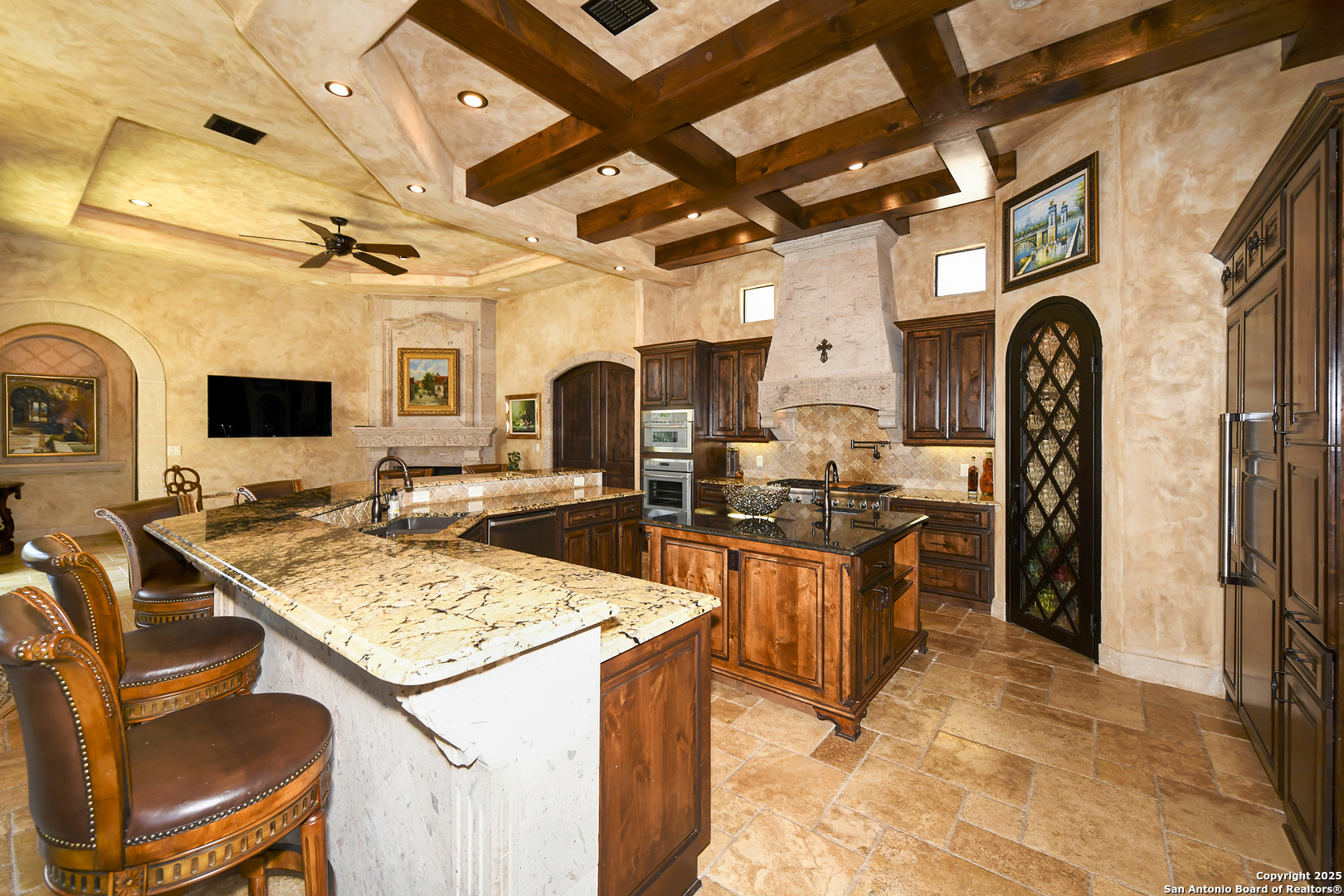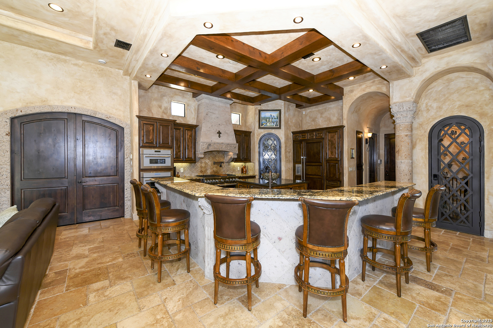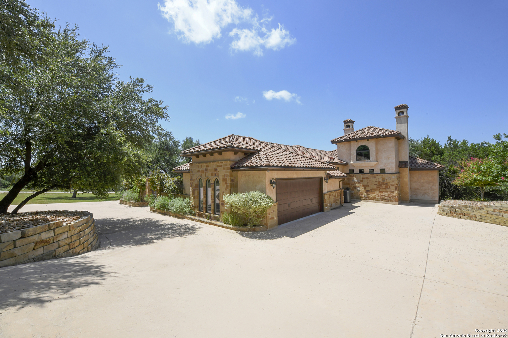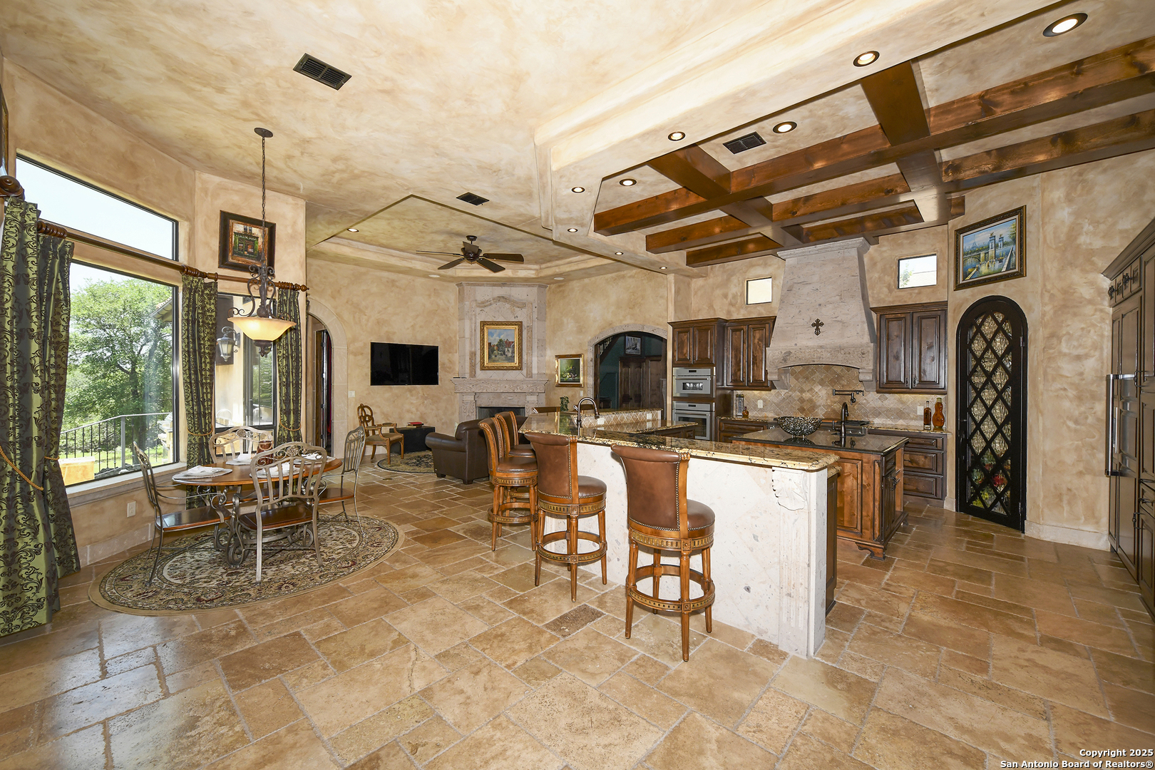Amazing one of a kind custom built home on an acre in the hill country community of River Chase. True craftsmanship and premium materials, creating stunning living spaces. The sprawling modern floor plan features high ceilings, floor-to-ceiling windows, and stained wood T&G ceilings, flooding the interiors with abundant natural light. Custom ceiling and architectural details, upgraded light fixtures, a Cantera stone fireplace surround, and Versailles-pattern travertine flooring elevate the home's elegance. The chef's kitchen boasts Thermador stainless steel appliances, including a built-in refrigerator, dual dishwashers, a dual oven range, and an additional wall oven. The oversized master retreat offers herringbone-pattern wood floors, patio access, a spa-like bath with an oversized shower featuring three shower heads and a rain head, an expansive walk-in closet, and direct access to the study. Spacious guest suites come with large walk-in closets and built-in Murphy beds. Interior upgrades include an underground wine cellar, a two-story library with wood paneling on walls and ceilings, a temperature-controlled wine room, a central vacuum system, chiseled travertine, and herringbone wood flooring. Additional features are a slide-out coffee station in both the kitchen and master, old world stucco interior walls, powder bath, and guest room, and high-level granite and marble surfaces throughout. The serene outdoor space includes a large flagstone patio with a summer kitchen, an outdoor TV enclosure, and an expansive 1-acre lot within River Chase, offering endless possibilities for customization and expansion. Exterior highlights include a tile roof, front and rear courtyards with flagstone floors and flower beds with drip irrigation, iron and glass doors, Cantera stone columns and fountain, and a circular driveway. This home is prewired for a pool, equipped with whole-house surge protection, a new HVAC system in the main house (less than one year old), a hide-a-hose vacuum system, a water softener, and whole-house audio. Additional features include an expansive 7000 sq. ft. driveway with enlarged parking and dyed concrete, a fully landscaped yard front and back, and irrigation and drip lines throughout the landscape. Over 100 square feet of front gated flagstone patio with water fountain area. Adjacent acre parcel is available as well. Community has swimming pool, work out facility & gated river park.