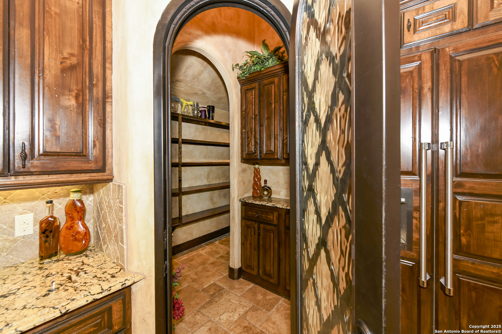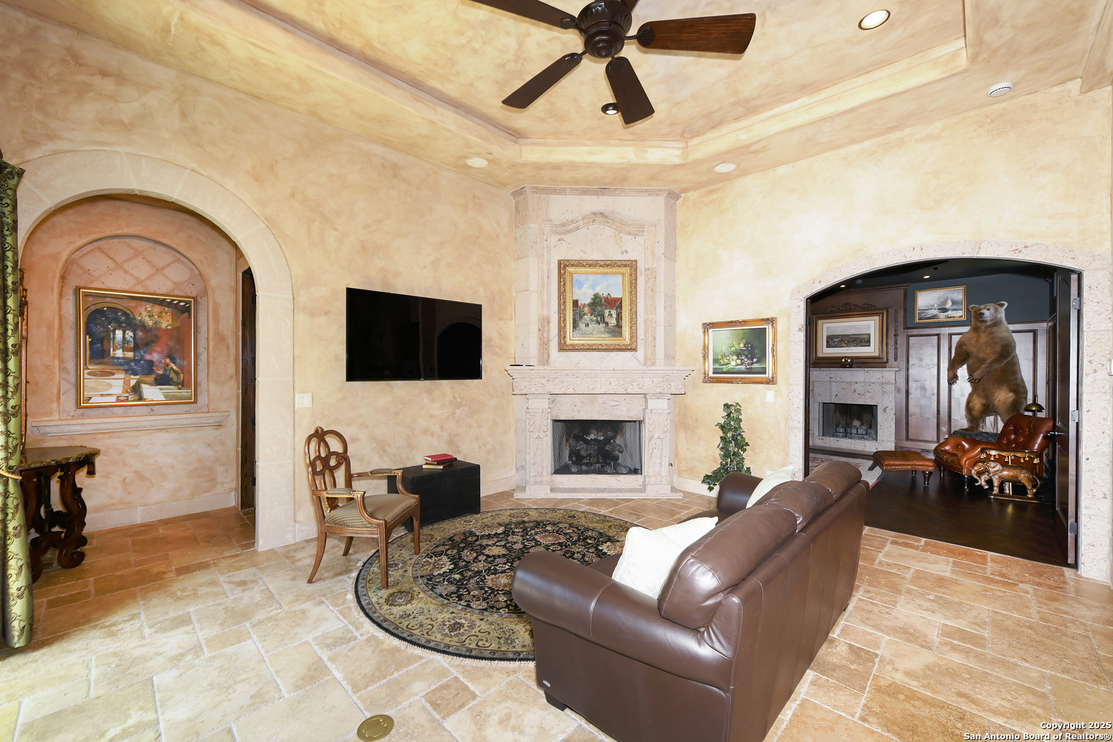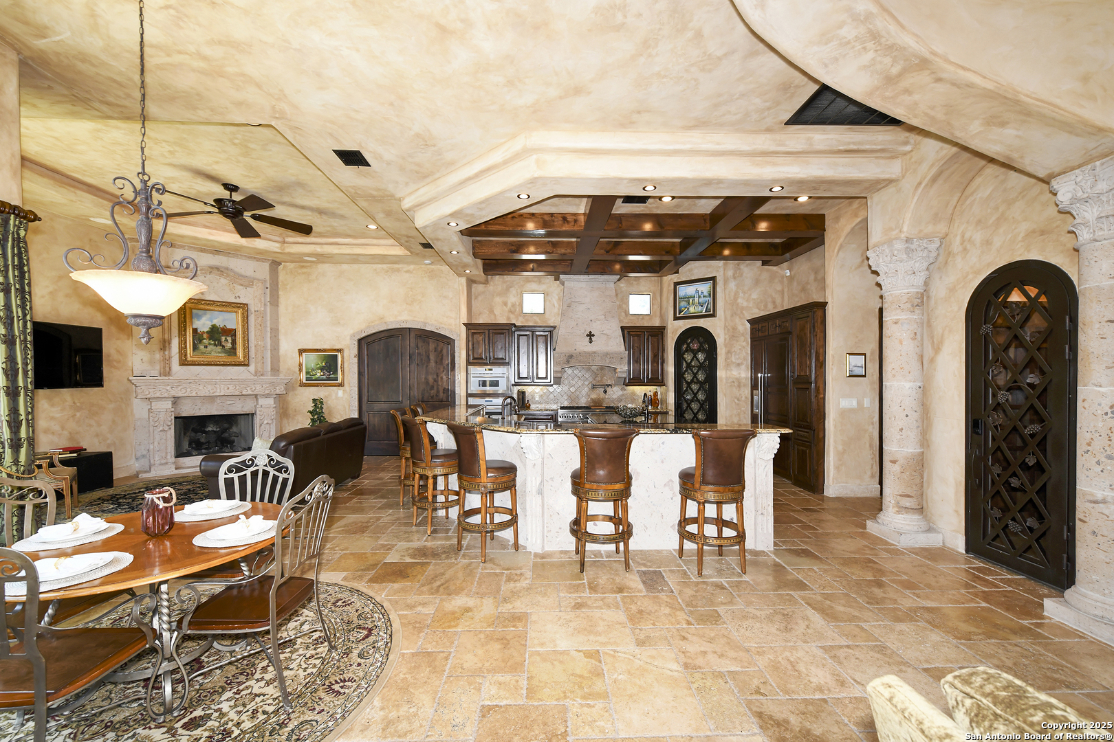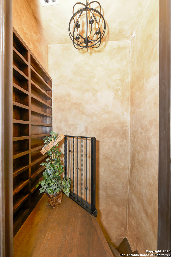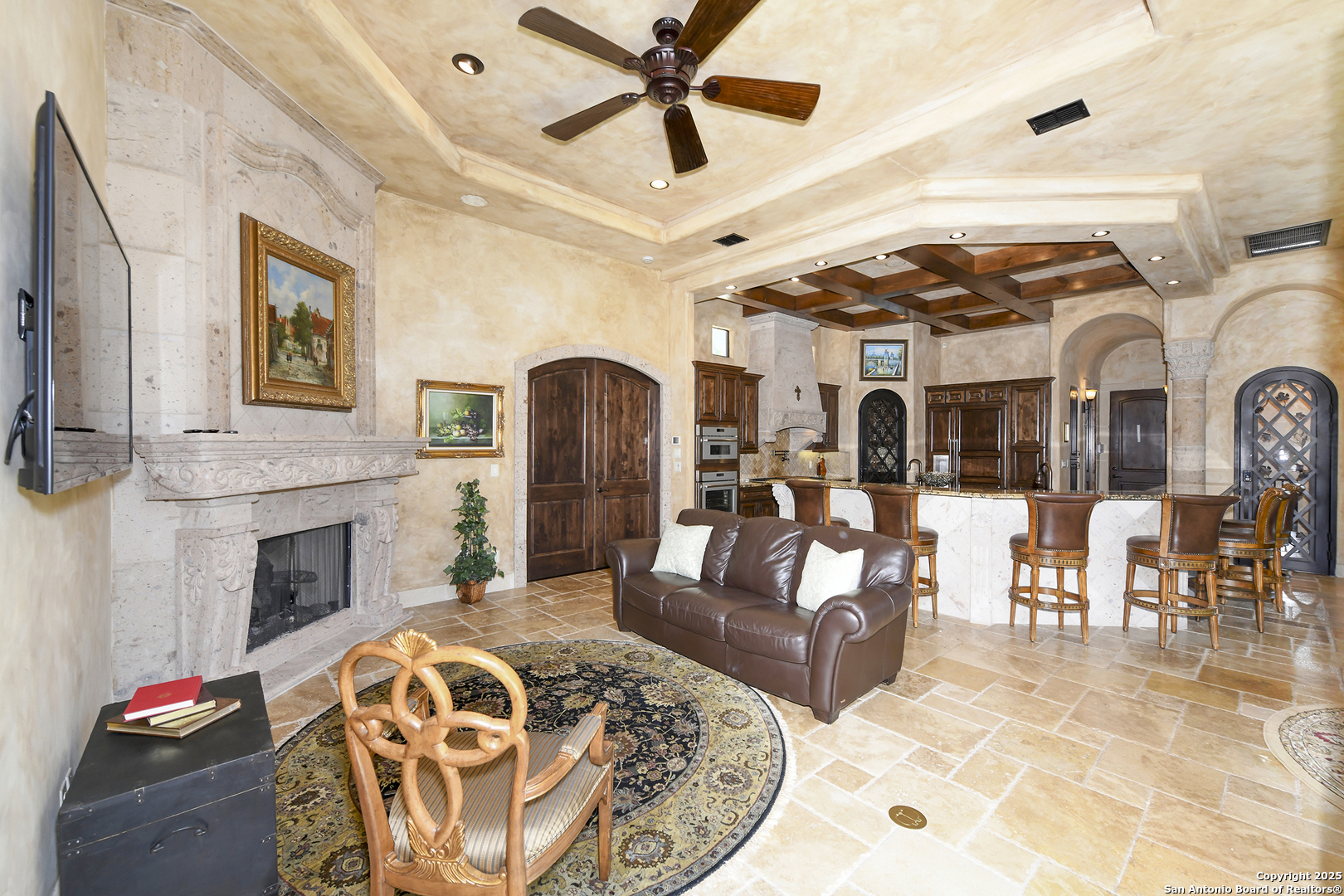 Amazing one of a kind custom built home on an acre in the hill country community of River Chase. True craftsmanship and premium materials, creating stunning living spaces. The sprawling modern floor plan features high ceilings, floor-to-ceiling windows, and stained wood T&G ceilings, flooding the interiors with abundant natural light. Custom ceiling and architectural details, upgraded light fixtures, a Cantera stone fireplace surround, and Versailles-pattern travertine flooring elevate the home's elegance. The chef's kitchen boasts Thermador stainless steel appliances, including a built-in refrigerator, dual dishwashers, a dual oven range, and an additional wall oven. The oversized master retreat offers herringbone-pattern wood floors, patio access, a spa-like bath with an oversized shower featuring three shower heads and a rain head, an expansive walk-in closet, and direct access to the study. Spacious guest suites come with large walk-in closets and built-in Murphy beds. Interior upgrades include an underground wine cellar, a two-story library with wood paneling on walls and ceilings, a temperature-controlled wine room, a central vacuum system, chiseled travertine, and herringbone wood flooring. Additional features are a slide-out coffee station in both the kitchen and master, old world stucco interior walls, powder bath, and guest room, and high-level granite and marble surfaces throughout. The serene outdoor space includes a large flagstone patio with a summer kitchen, an outdoor TV enclosure, and an expansive 1-acre lot within River Chase, offering endless possibilities for customization and expansion. Exterior highlights include a tile roof, front and rear courtyards with flagstone floors and flower beds with drip irrigation, iron and glass doors, Cantera stone columns and fountain, and a circular driveway. This home is prewired for a pool, equipped with whole-house surge protection, a new HVAC system in the main house (less than one year old), a hide-a-hose vacuum system, a water softener, and whole-house audio. Additional features include an expansive 7000 sq. ft. driveway with enlarged parking and dyed concrete, a fully landscaped yard front and back, and irrigation and drip lines throughout the landscape. Over 100 square feet of front gated flagstone patio with water fountain area. Adjacent acre parcel is available as well. Community has swimming pool, work out facility & gated river park.