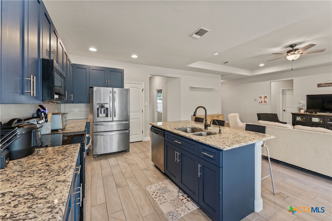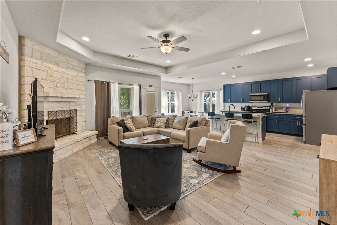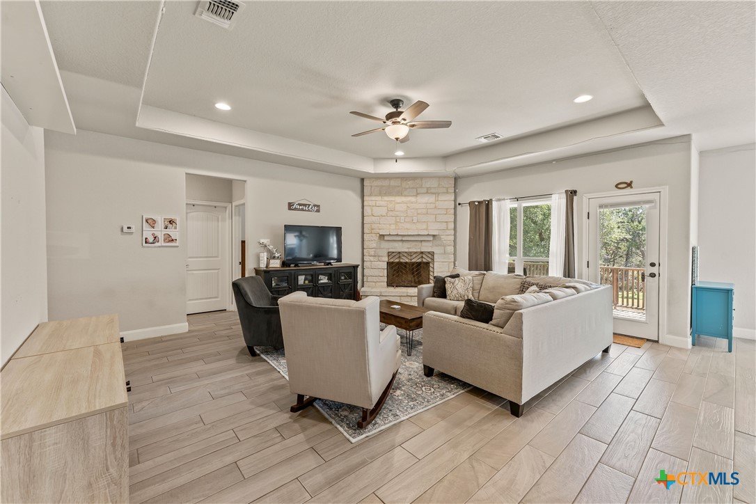 Welcome to this inviting 3-bedroom, 2-bathroom home, perfectly designed for comfortable living and entertaining. The open floor plan creates a seamless flow, with the kitchen overlooking the living area, making it ideal for gatherings. The kitchen features a spacious island and a cozy eat-in nook, perfect for casual dining. The chef of the house will love the countertops and all the cabinet space. The living area boasts a warm and welcoming fireplace, adding a touch of comfort and charm. Step outside to the covered back patio, offering a peaceful spot for your morning coffee or evening relaxation admiring all the greenery in your very own backyard. There is a new roof installed in 2024 and your furbaby also has its own designated area as well. With its thoughtful layout and inviting features, this home is perfect for creating lasting memories. Don't miss out-schedule your showing today to claim your piece of heaven in Canyon Lake!
