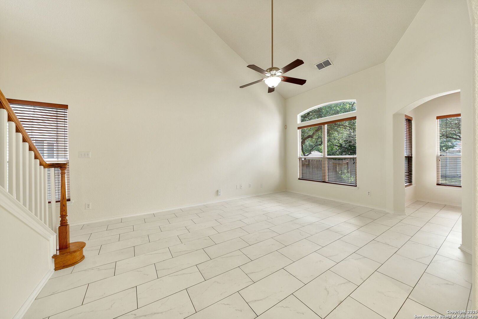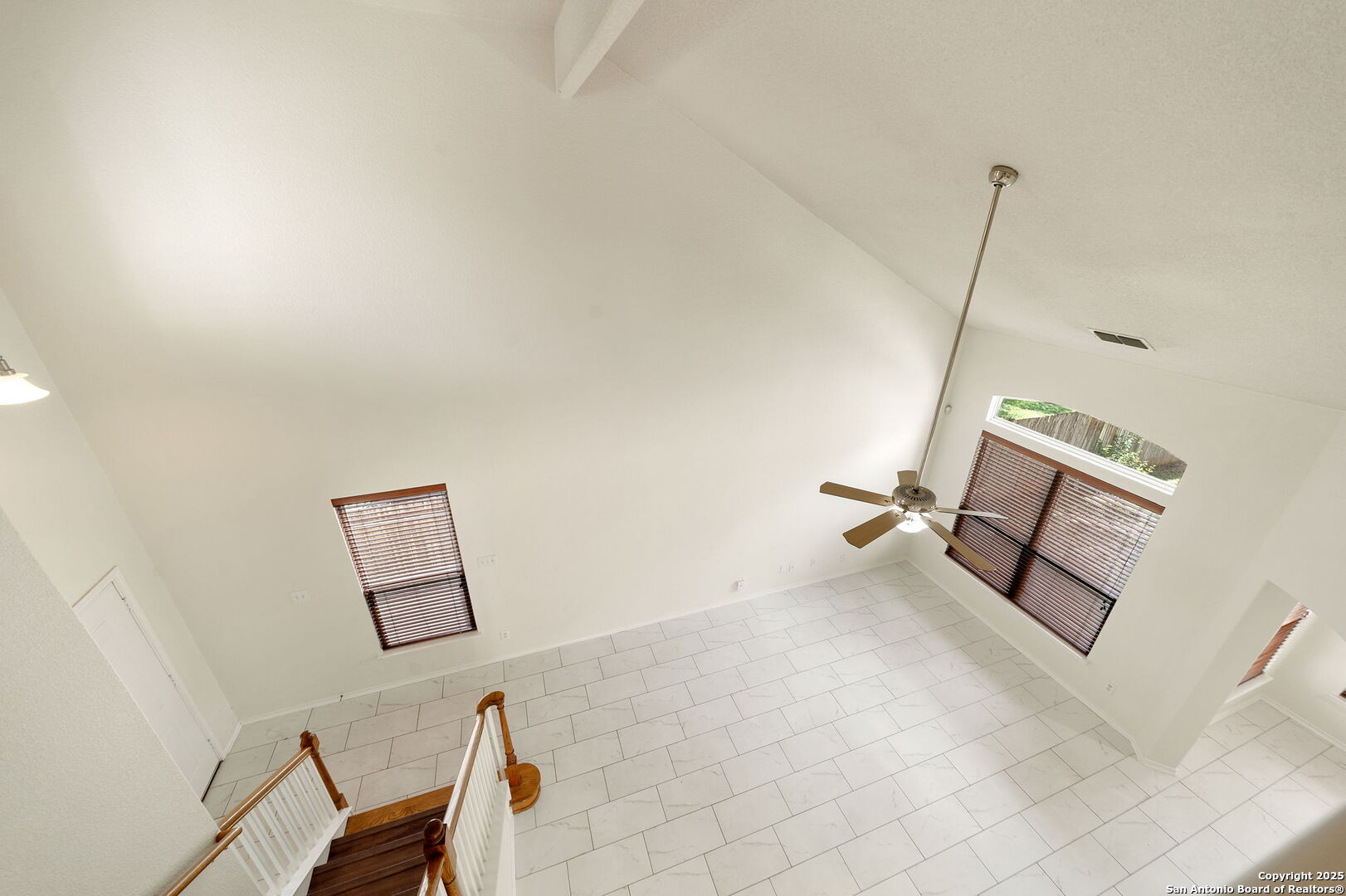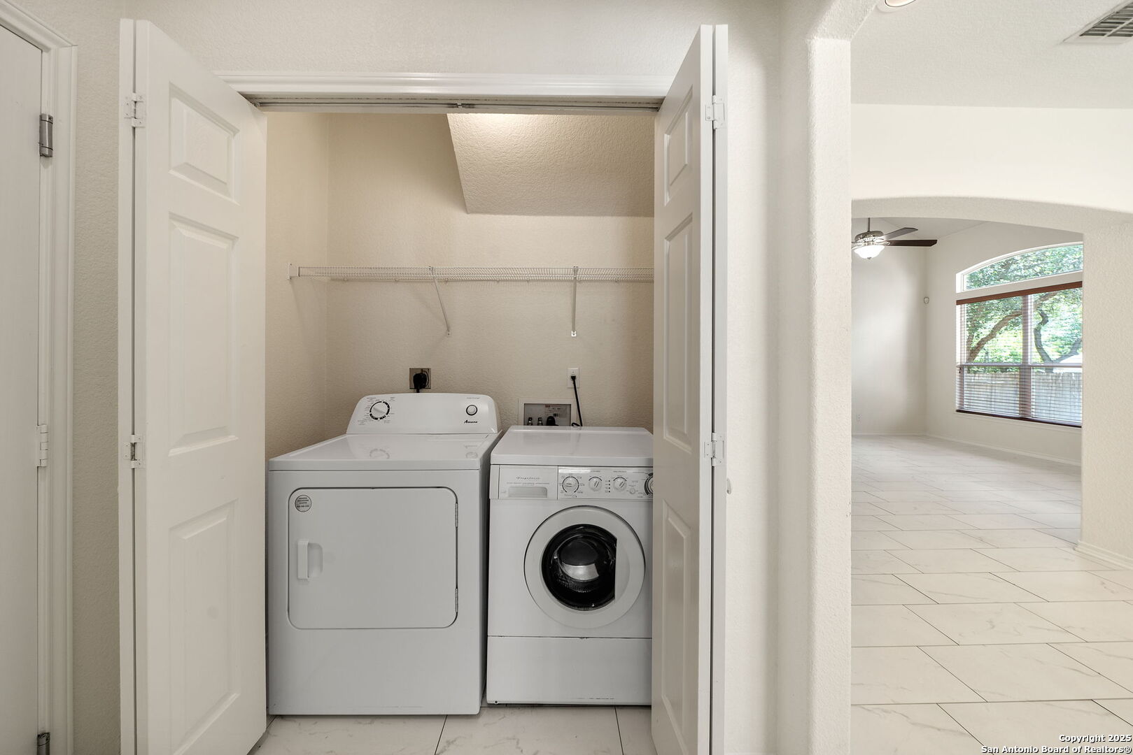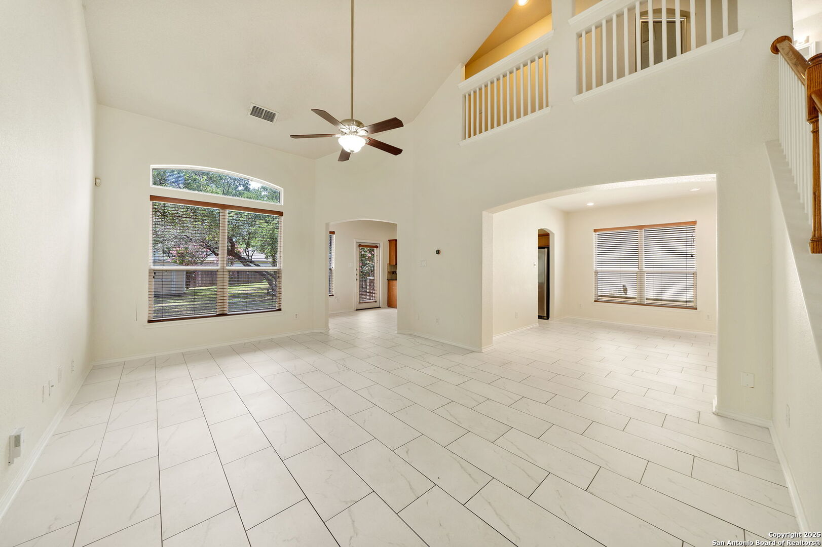 Spacious and inviting 2-story home featuring 3 bedrooms and 2 bathrooms. Enjoy soaring high ceilings that enhance the open feel of the living space. The kitchen is designed for both function and style, offering a large island, modern appliances, and ample countertop and cabinet space. Tile flooring throughout the downstairs adds durability and easy maintenance, while vinyl flooring upstairs offers comfort and a modern look. Additional highlights include a 2-car garage, washer and dryer included, and a large fenced-in backyard-perfect for outdoor enjoyment. Well-proportioned bedrooms complete this comfortable and functional home. Conveniently located with quick access to I-10, a short drive to The Rim and La Cantera, and just 20 minutes to downtown San Antonio. Front yard maintenance included