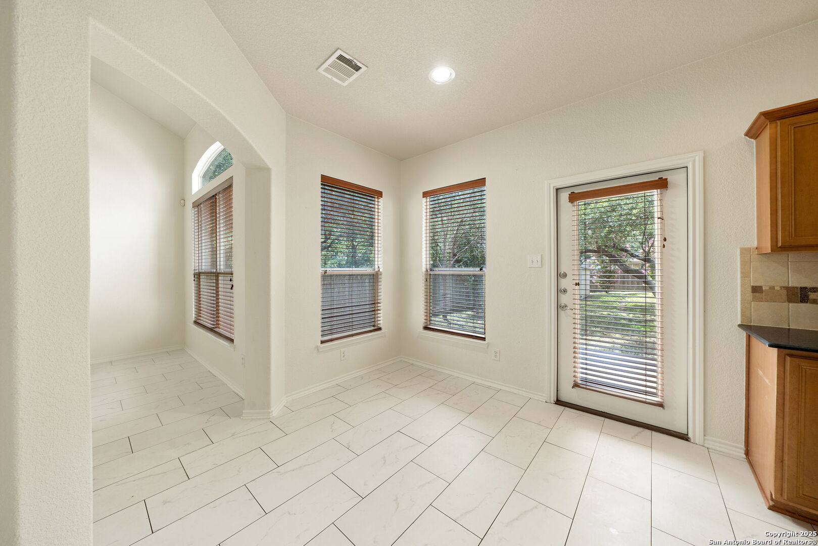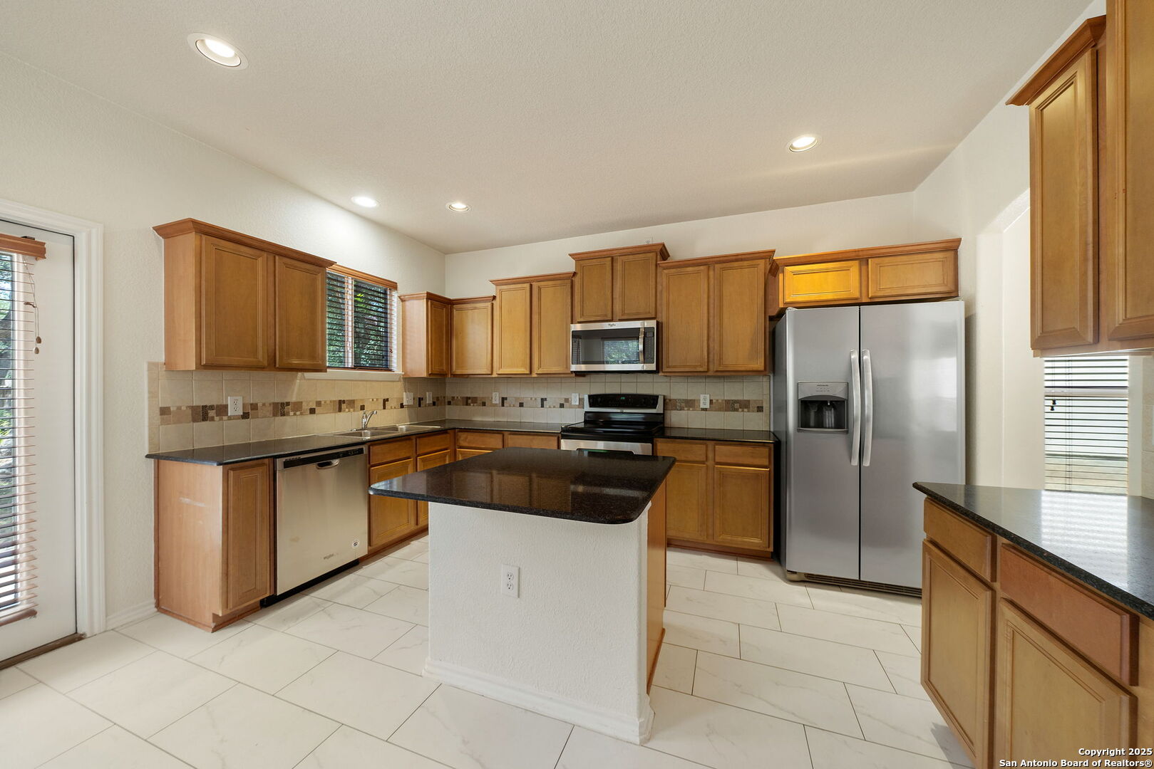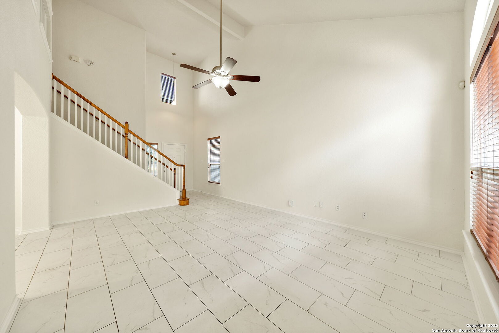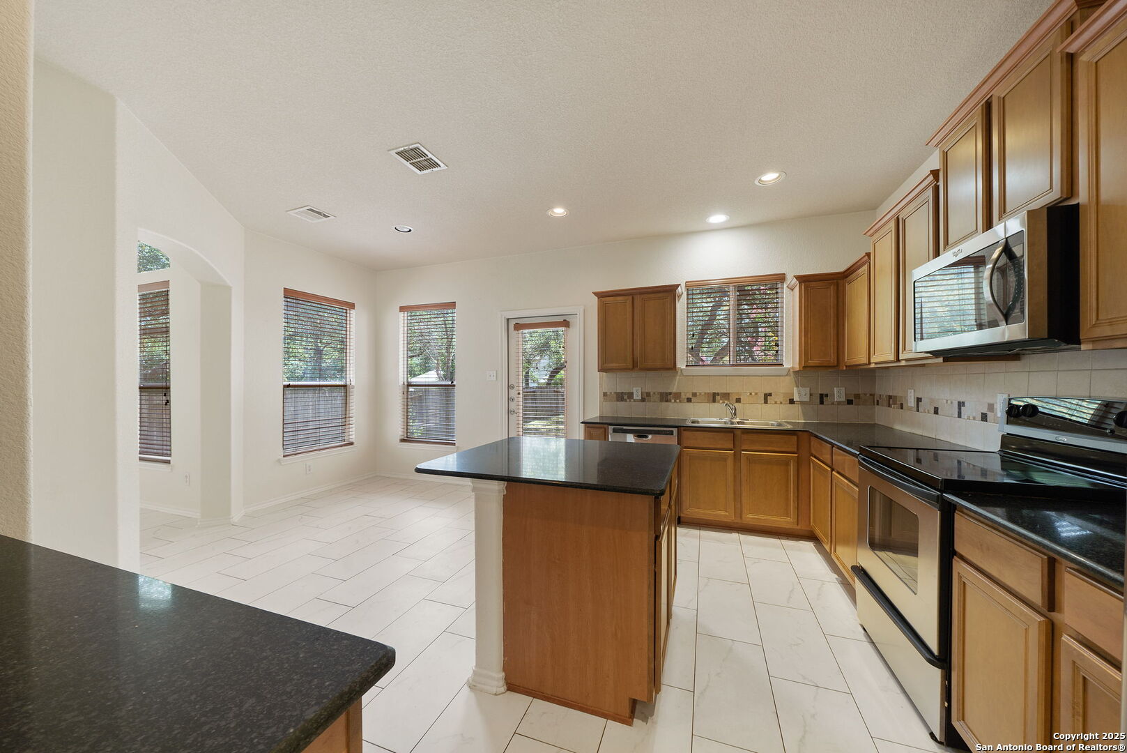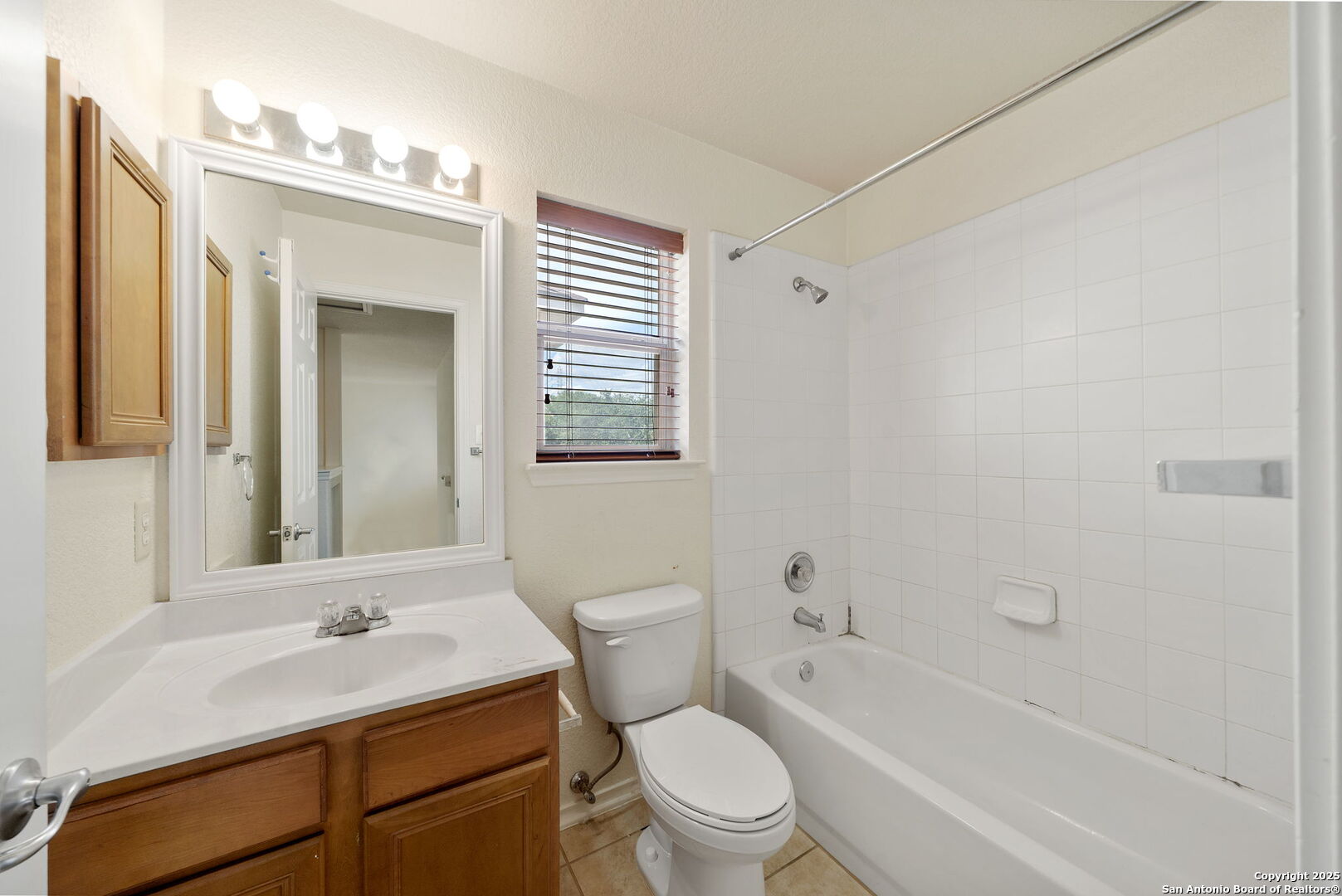 Spacious and inviting 2-story home featuring 3 bedrooms and 2 bathrooms. Enjoy soaring high ceilings that enhance the open feel of the living space. The kitchen is designed for both function and style, offering a large island, modern appliances, and ample countertop and cabinet space. Tile flooring throughout the downstairs adds durability and easy maintenance, while vinyl flooring upstairs offers comfort and a modern look. Additional highlights include a 2-car garage, washer and dryer included, and a large fenced-in backyard-perfect for outdoor enjoyment. Well-proportioned bedrooms complete this comfortable and functional home. Conveniently located with quick access to I-10, a short drive to The Rim and La Cantera, and just 20 minutes to downtown San Antonio. Front yard maintenance included