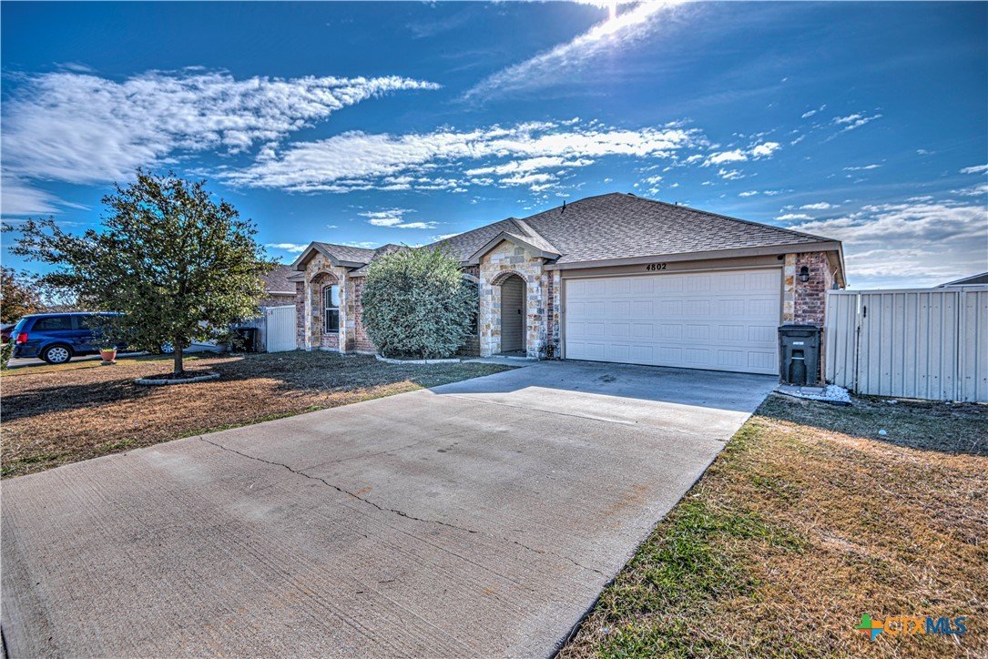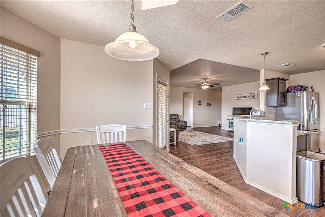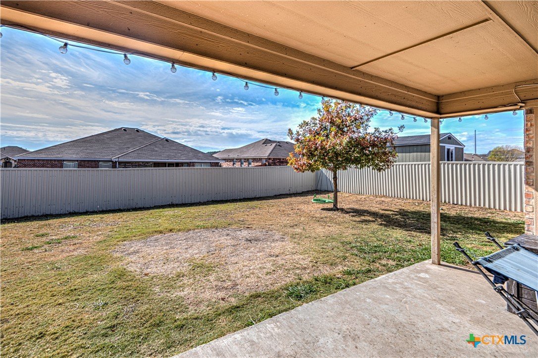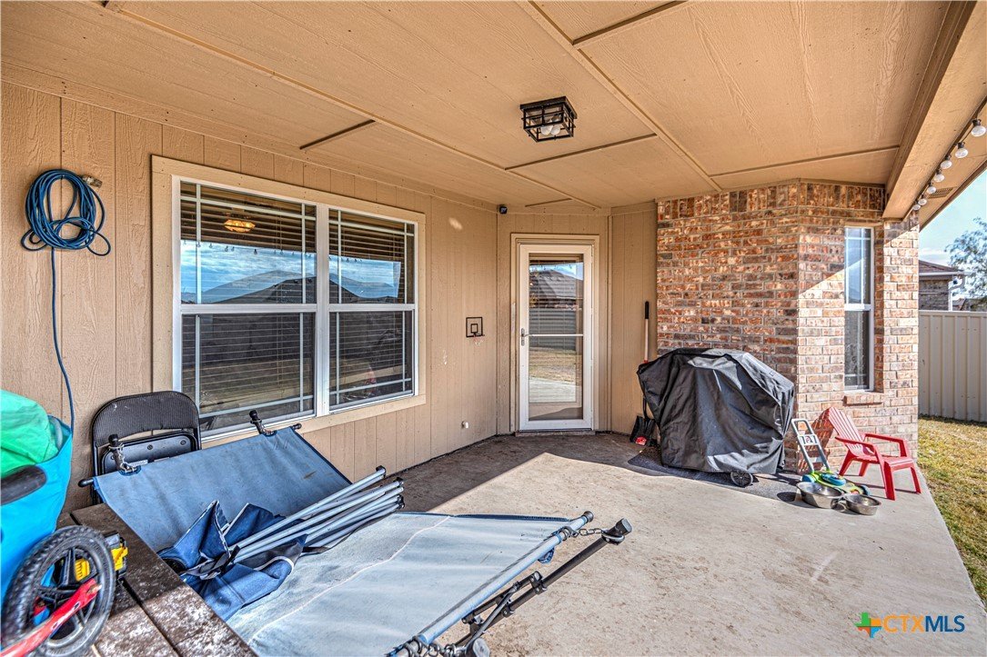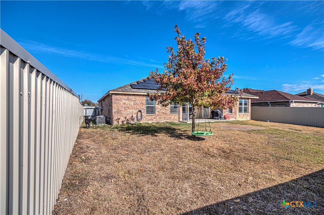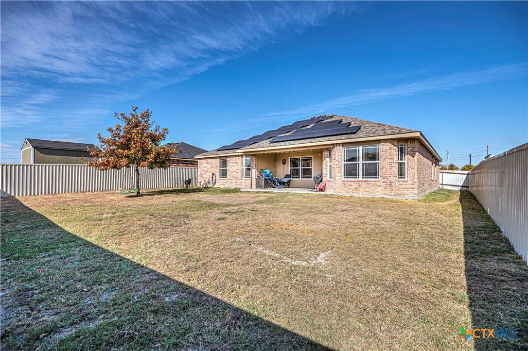 Step inside to a nice wide hallway and thoughtfully designed split floor plan. Bull nosed corners through out. Spacious living room and breakfast bar are complimented by a lot of natural light from the windows in dinning and living room. Kitchen has granite counters, LVP flooring throughout the home, and ceiling fans. The large primary bedroom also has a very large walk-in primary closet. The remaining bedrooms also have very large closets. Roof was replaced in 2023. Shelving in the garage will remain with the property. The home has front and back storm doors, a water softener, and irrigation system. Multipurpose room off the kitchen was used as a play room for the kids and a built in child size rock climbing wall. It will convey. The backyard is spacious, and the fully enclosed backyard, is complete with a durable metal privacy fence. Whether you're relaxing on the covered patio or entertaining guests, this home offers both comfort and convenience. The home is close to Fort Cavazos and multiple shopping centers. Solar is paid in full. Don’t miss out on a great opportunity—schedule your showing today!
