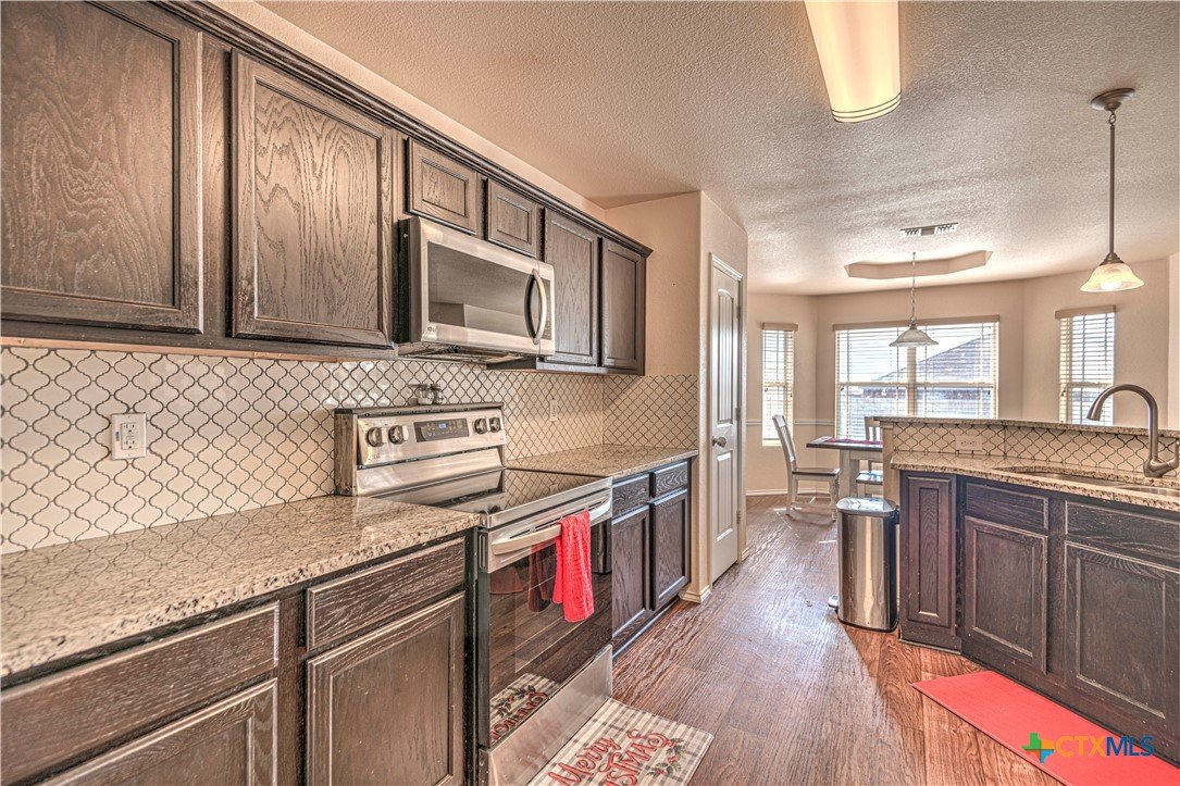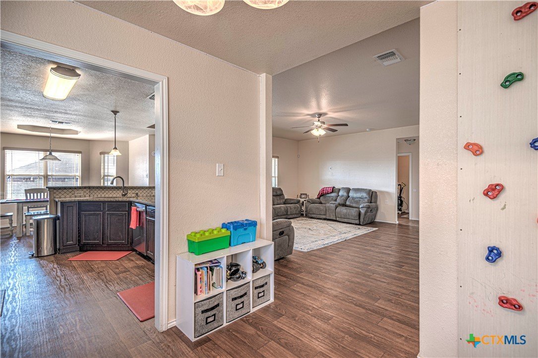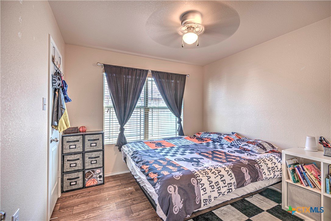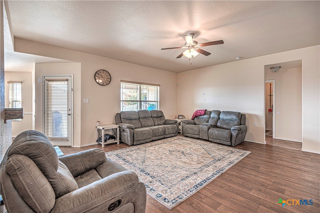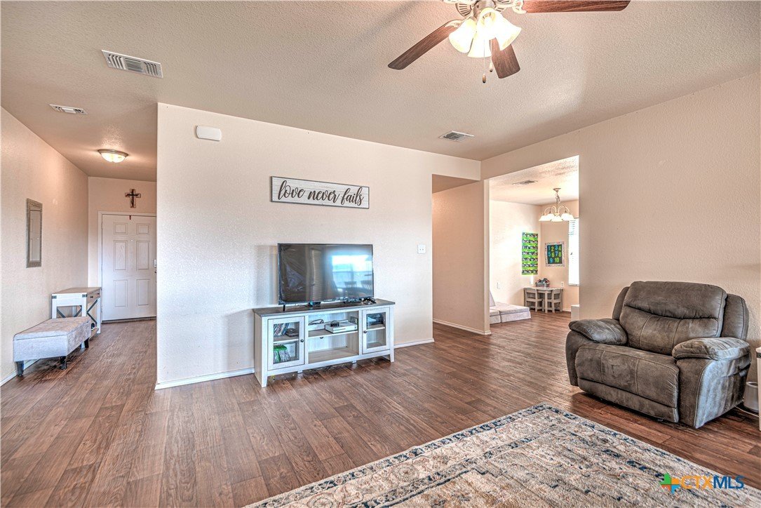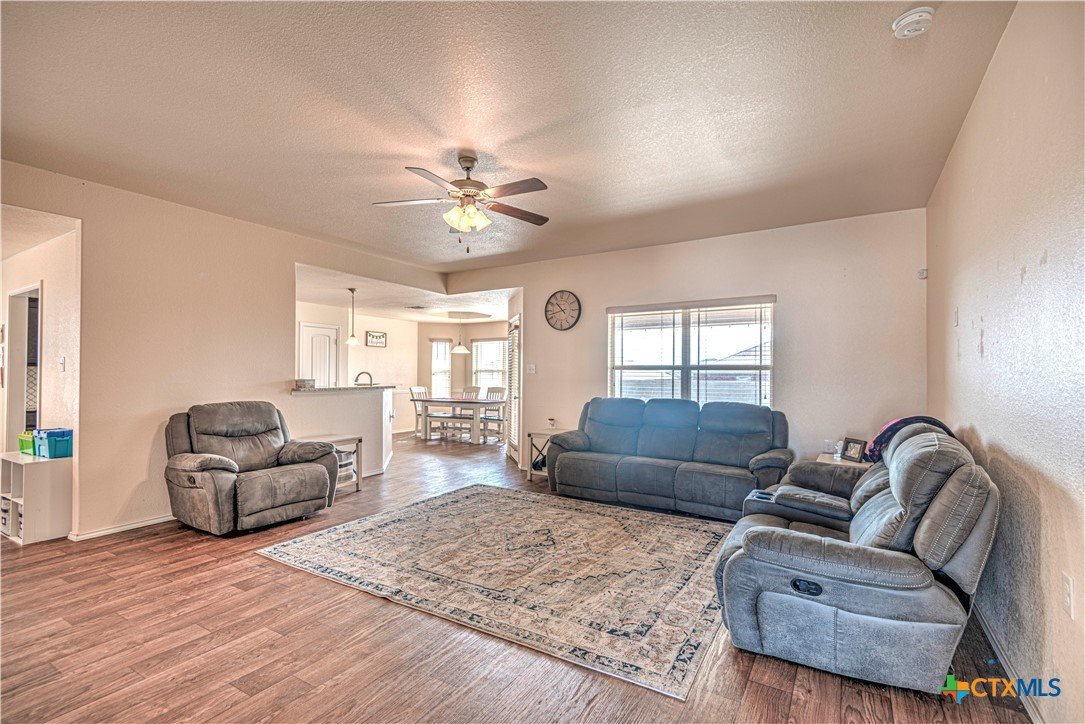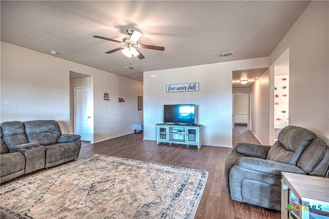 Step inside to a nice wide hallway and thoughtfully designed split floor plan. Bull nosed corners through out. Spacious living room and breakfast bar are complimented by a lot of natural light from the windows in dinning and living room. Kitchen has granite counters, LVP flooring throughout the home, and ceiling fans. The large primary bedroom also has a very large walk-in primary closet. The remaining bedrooms also have very large closets. Roof was replaced in 2023. Shelving in the garage will remain with the property. The home has front and back storm doors, a water softener, and irrigation system. Multipurpose room off the kitchen was used as a play room for the kids and a built in child size rock climbing wall. It will convey. The backyard is spacious, and the fully enclosed backyard, is complete with a durable metal privacy fence. Whether you're relaxing on the covered patio or entertaining guests, this home offers both comfort and convenience. The home is close to Fort Cavazos and multiple shopping centers. Solar is paid in full. Don’t miss out on a great opportunity—schedule your showing today!