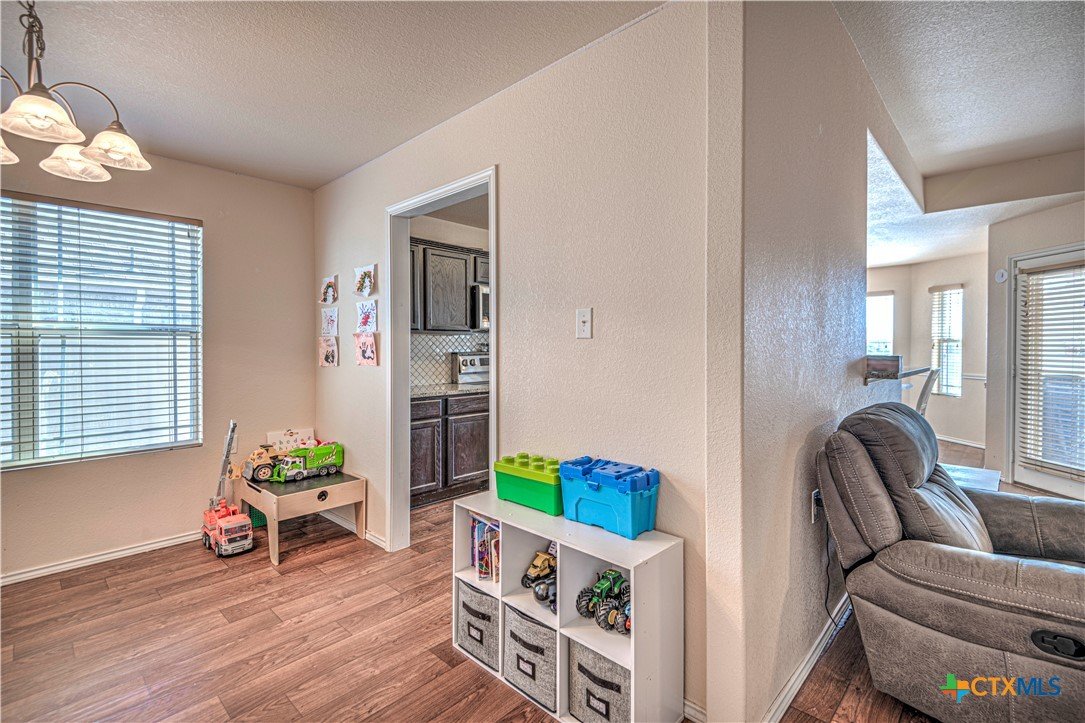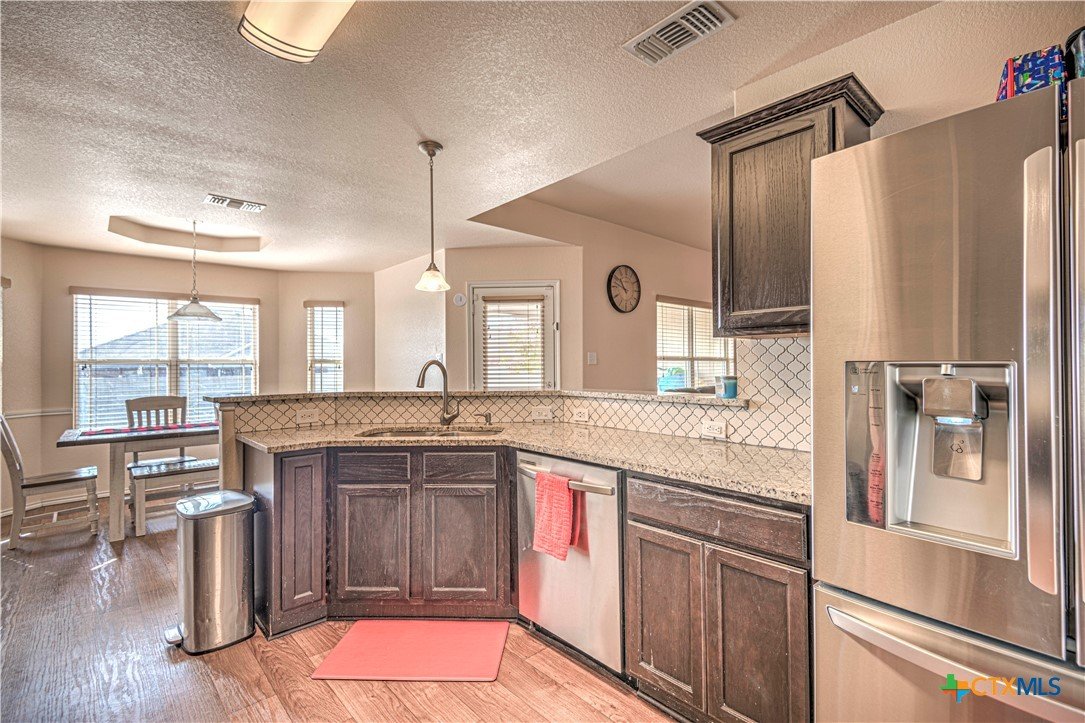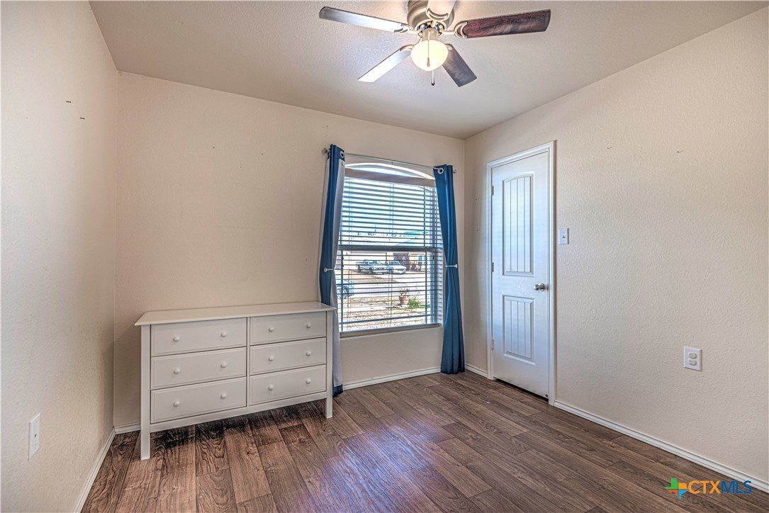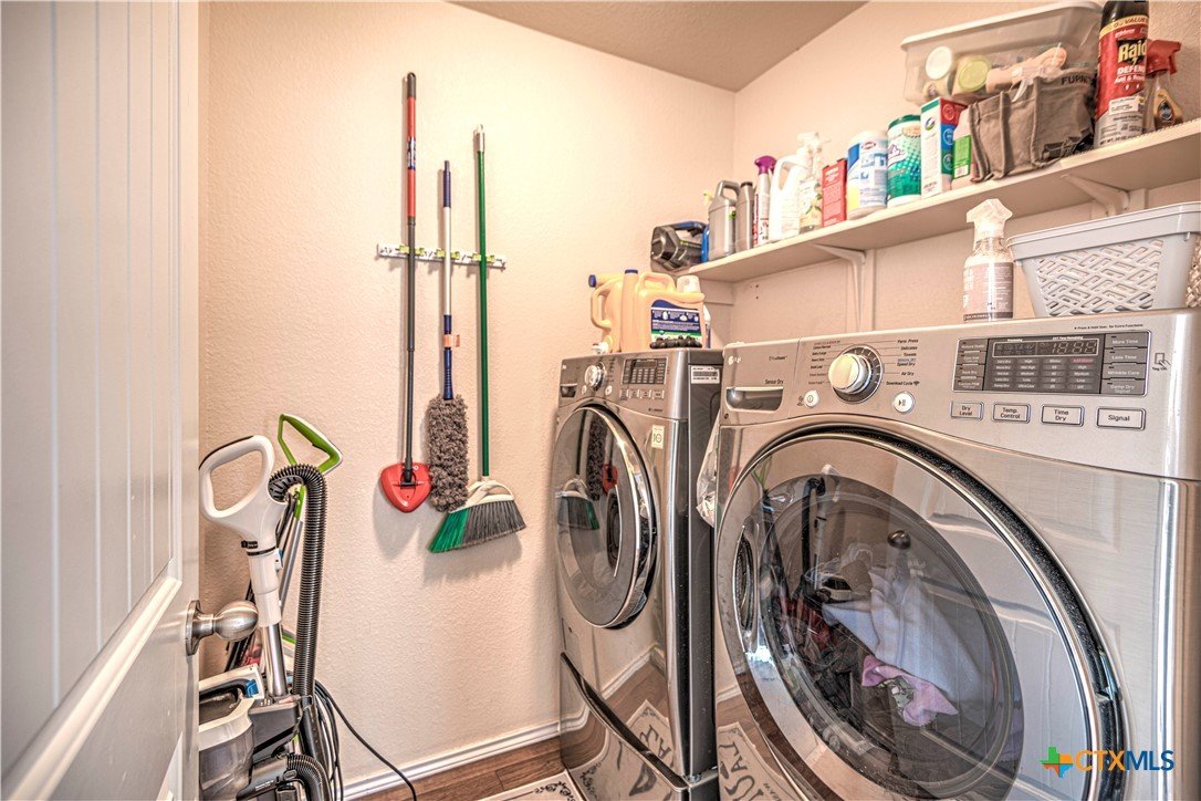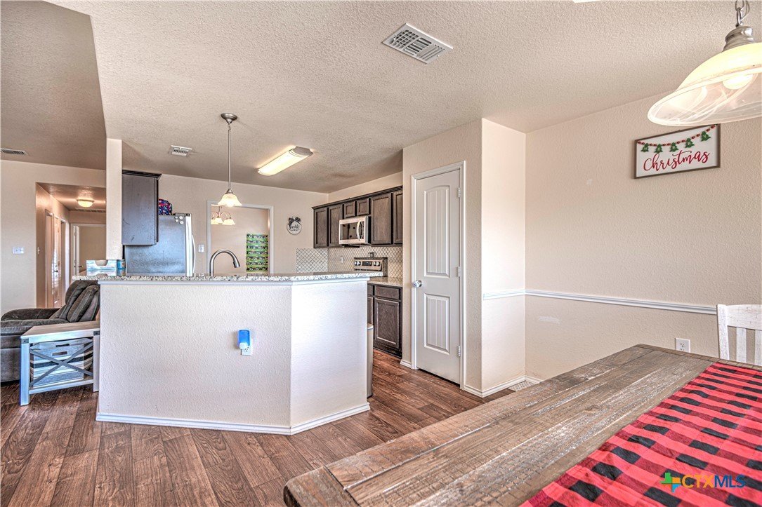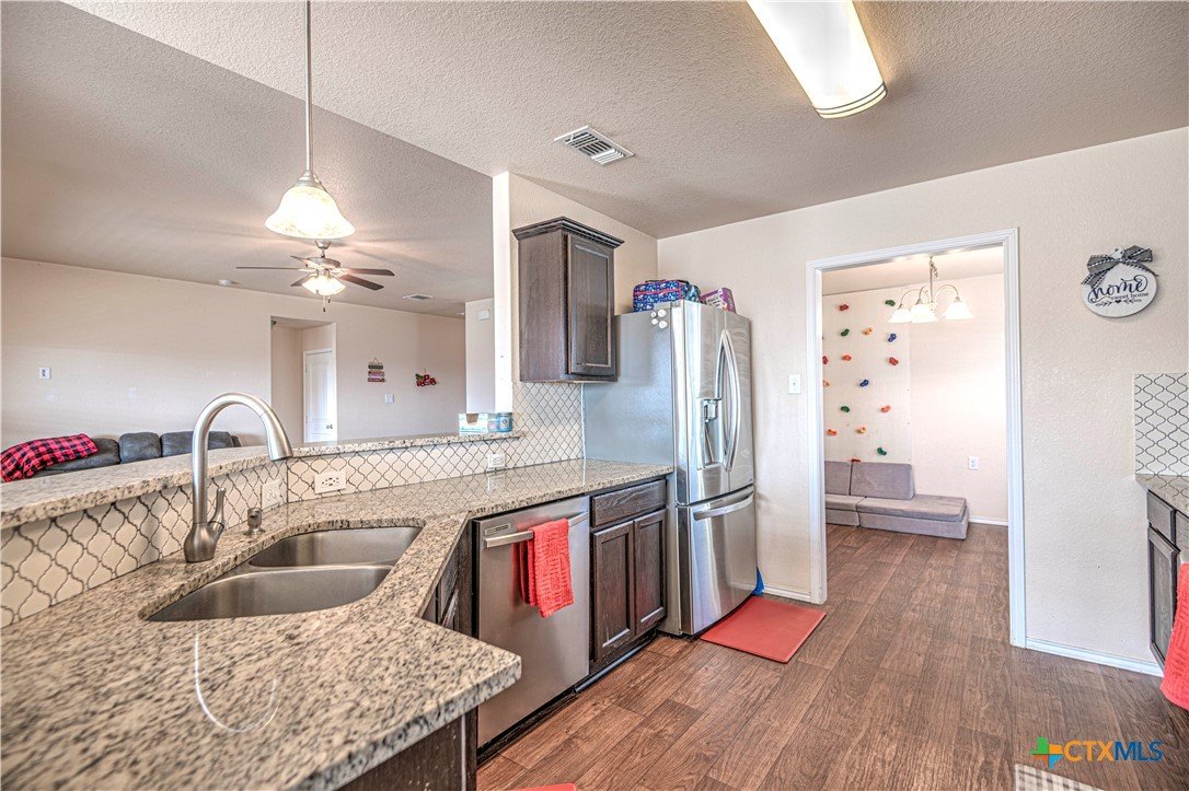 Step inside to a nice wide hallway and thoughtfully designed split floor plan. Bull nosed corners through out. Spacious living room and breakfast bar are complimented by a lot of natural light from the windows in dinning and living room. Kitchen has granite counters, LVP flooring throughout the home, and ceiling fans. The large primary bedroom also has a very large walk-in primary closet. The remaining bedrooms also have very large closets. Roof was replaced in 2023. Shelving in the garage will remain with the property. The home has front and back storm doors, a water softener, and irrigation system. Multipurpose room off the kitchen was used as a play room for the kids and a built in child size rock climbing wall. It will convey. The backyard is spacious, and the fully enclosed backyard, is complete with a durable metal privacy fence. Whether you're relaxing on the covered patio or entertaining guests, this home offers both comfort and convenience. The home is close to Fort Cavazos and multiple shopping centers. Solar is paid in full. Don’t miss out on a great opportunity—schedule your showing today!