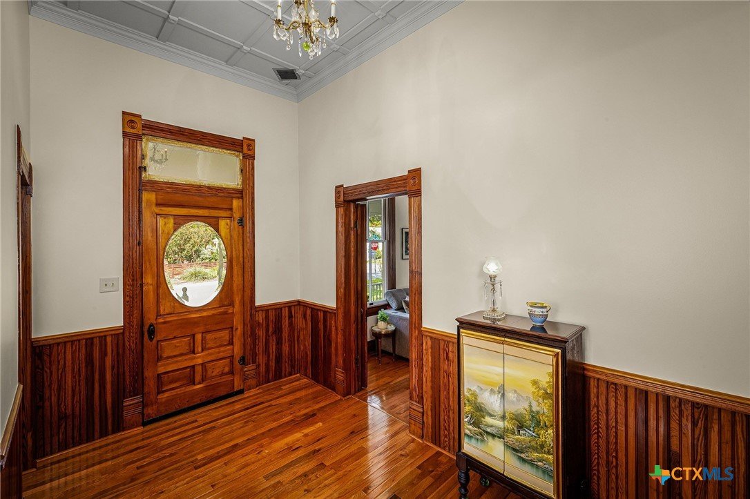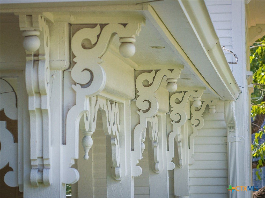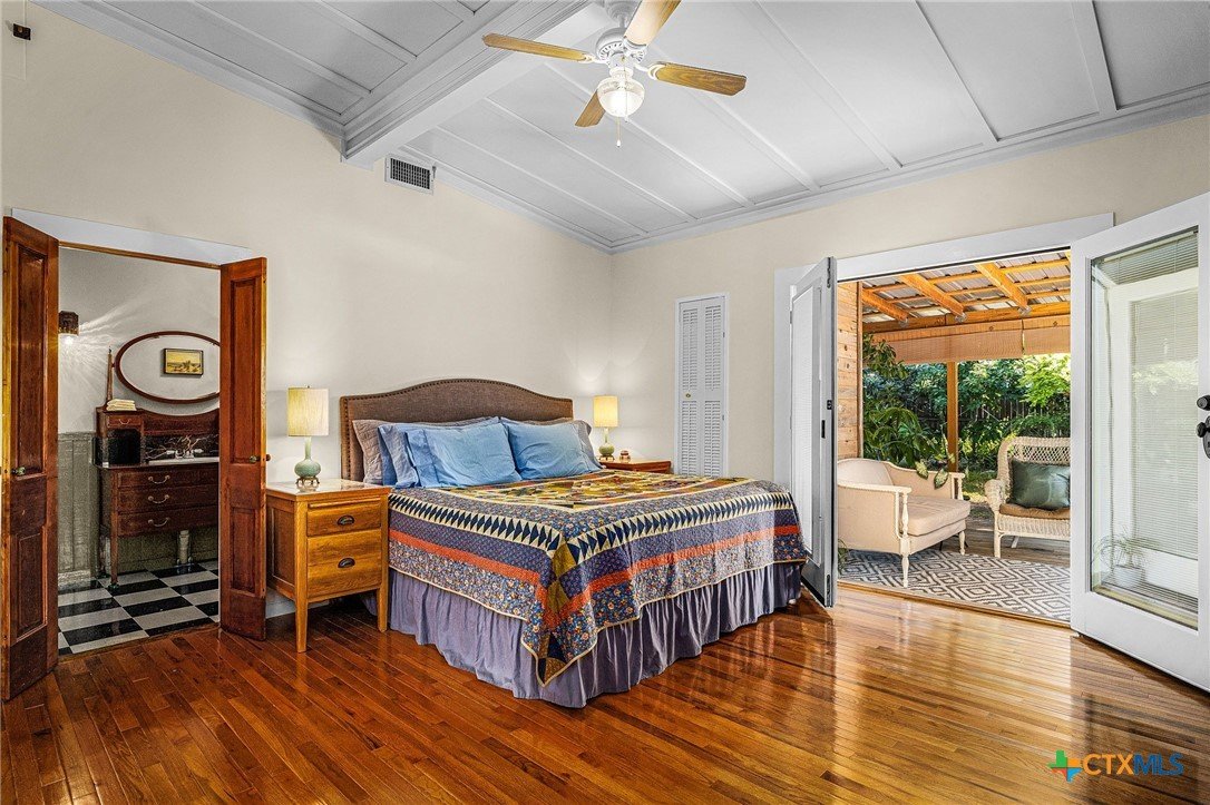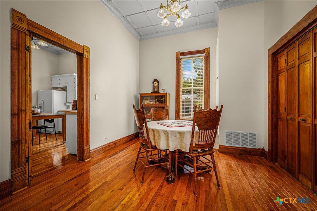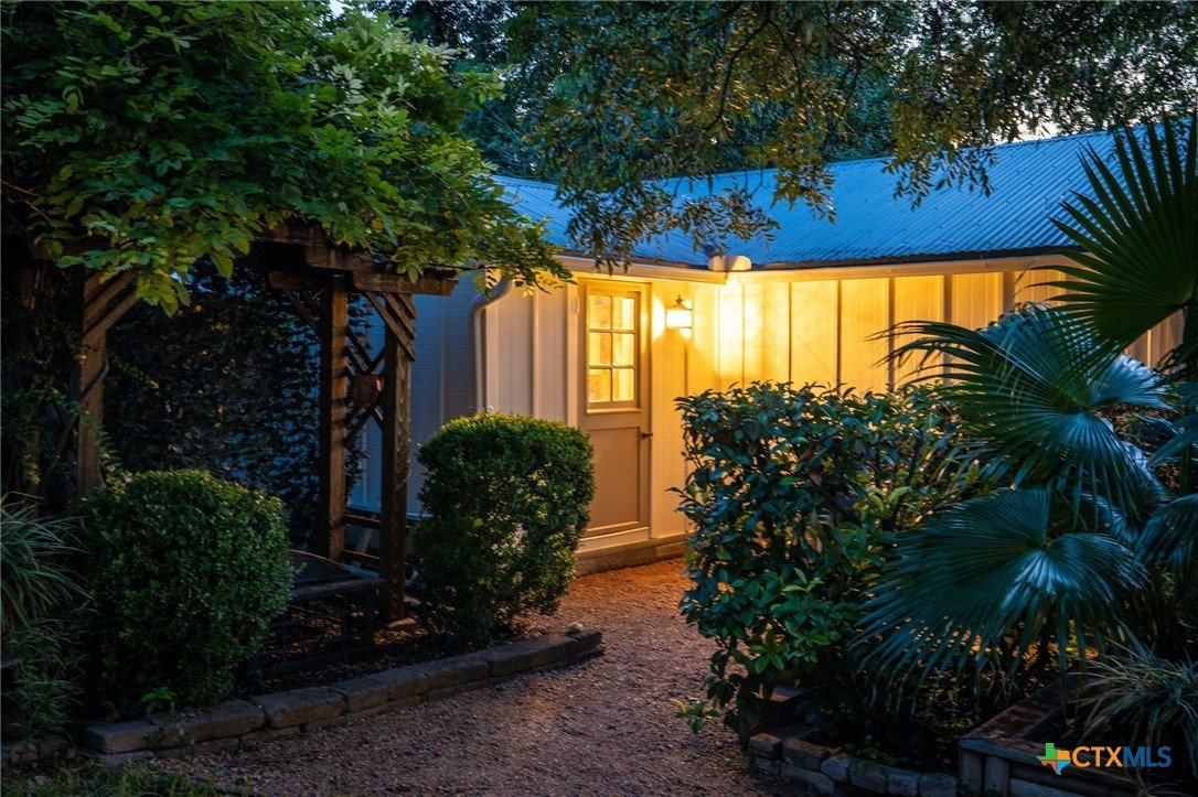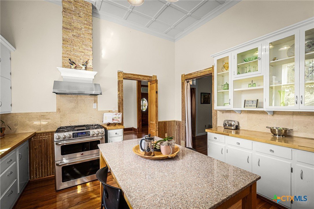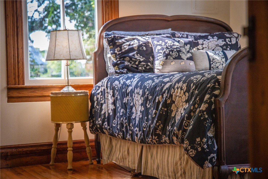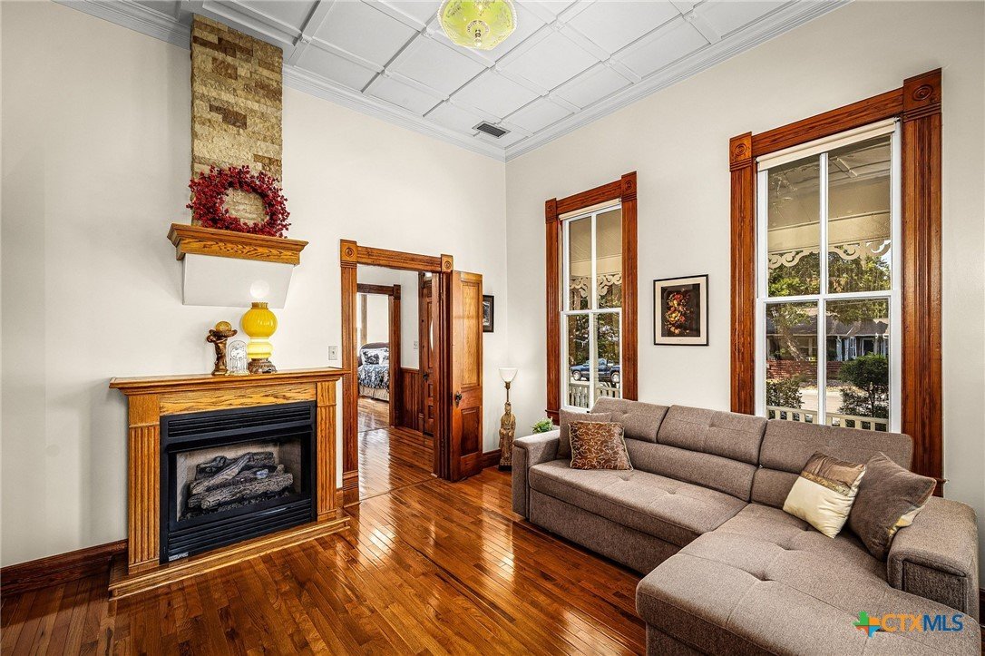 Step back in time with this beautifully preserved historic home nestled on a large corner lot in the vibrant heart of downtown New Braunfels. This residence boasts timeless elegance and character, featuring beautiful intricate architectural details and original hardwood floors that seamlessly blend old-world charm with modern comforts. The cozy floor plan includes 2 bedrooms and 1 bath, providing an intimate yet comfortable living space. The large windows fill each room with natural light, highlighting the exquisite woodwork and stunning high coffered ceilings. The updated kitchen retains its vintage appeal while offering modern conveniences, perfect for preparing gourmet meals. Situated on almost a quarter-acre, the expansive front porch offers a perfect spot to enjoy leisurely mornings, overlooking the picturesque tree-lined street. The backyard provides a private retreat with lush landscaping and a patio area, ideal for outdoor entertaining. Living in downtown New Braunfels means being just steps away from a vibrant array of shops, restaurants, and cultural attractions. Stroll to the famous Comal River, explore the historic Gruene district, or enjoy local festivals and events that make this community unique. Experience the best of historic charm and downtown convenience in this exceptional Texas Hill Country home!
