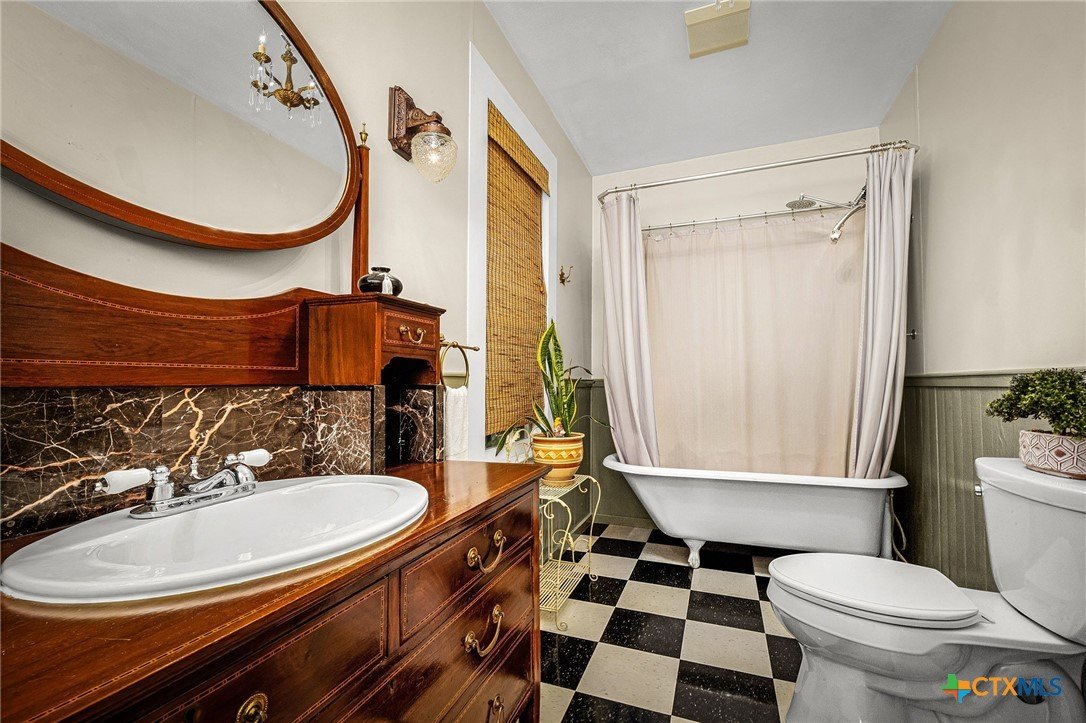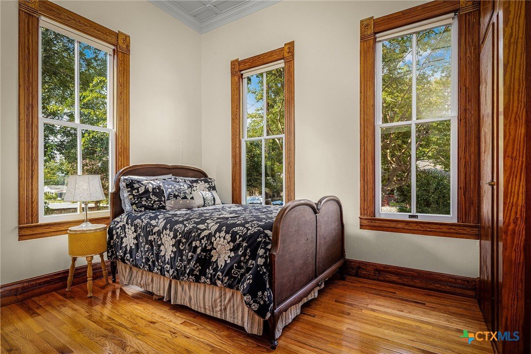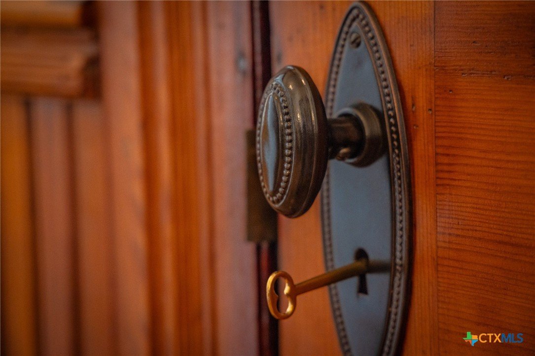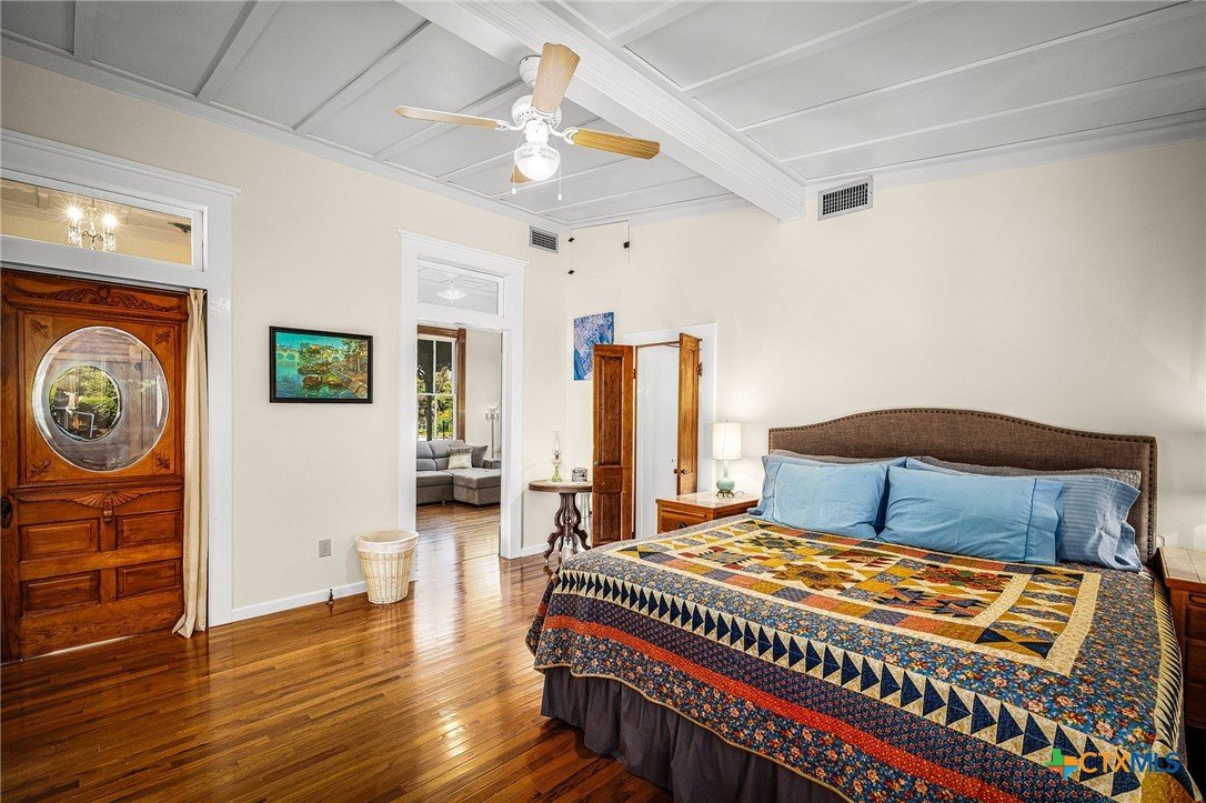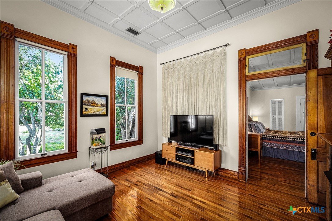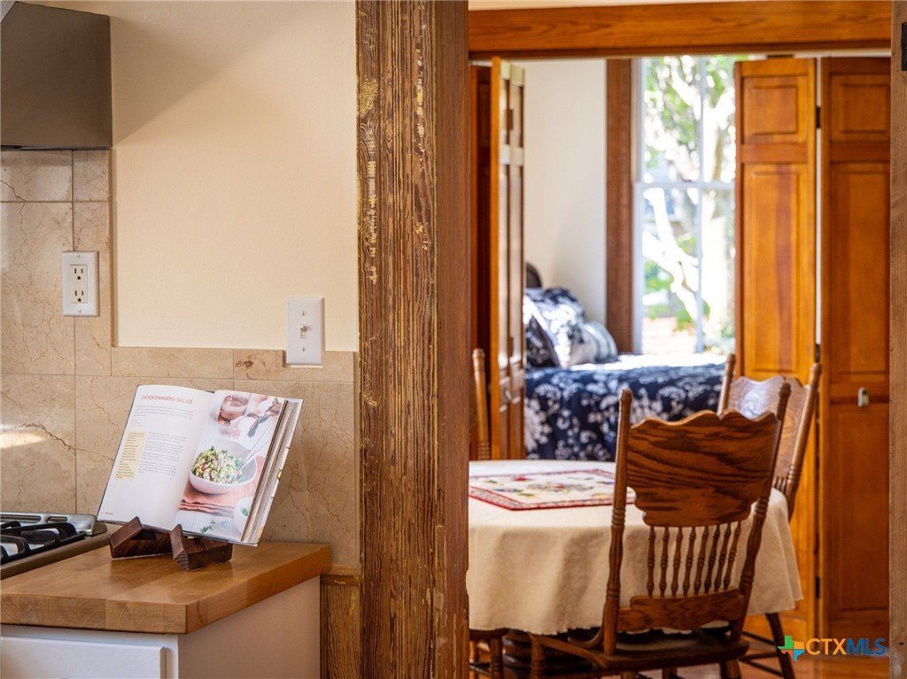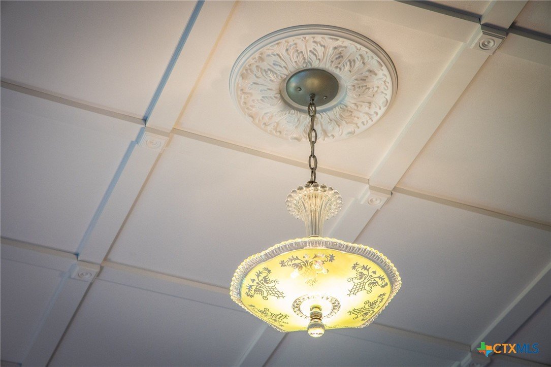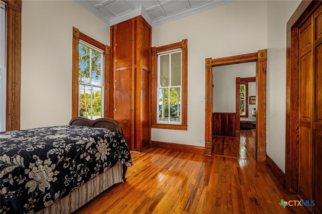 Step back in time with this beautifully preserved historic home nestled on a large corner lot in the vibrant heart of downtown New Braunfels. This residence boasts timeless elegance and character, featuring beautiful intricate architectural details and original hardwood floors that seamlessly blend old-world charm with modern comforts. The cozy floor plan includes 2 bedrooms and 1 bath, providing an intimate yet comfortable living space. The large windows fill each room with natural light, highlighting the exquisite woodwork and stunning high coffered ceilings. The updated kitchen retains its vintage appeal while offering modern conveniences, perfect for preparing gourmet meals. Situated on almost a quarter-acre, the expansive front porch offers a perfect spot to enjoy leisurely mornings, overlooking the picturesque tree-lined street. The backyard provides a private retreat with lush landscaping and a patio area, ideal for outdoor entertaining. Living in downtown New Braunfels means being just steps away from a vibrant array of shops, restaurants, and cultural attractions. Stroll to the famous Comal River, explore the historic Gruene district, or enjoy local festivals and events that make this community unique. Experience the best of historic charm and downtown convenience in this exceptional Texas Hill Country home!