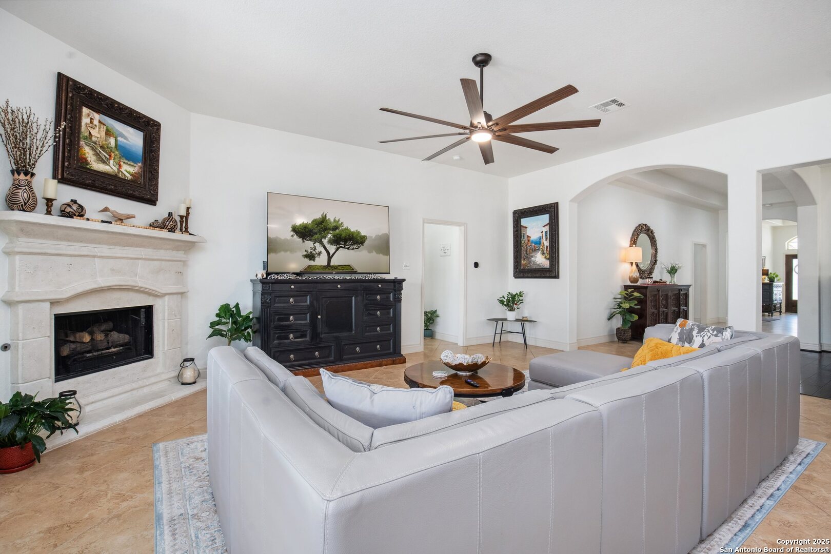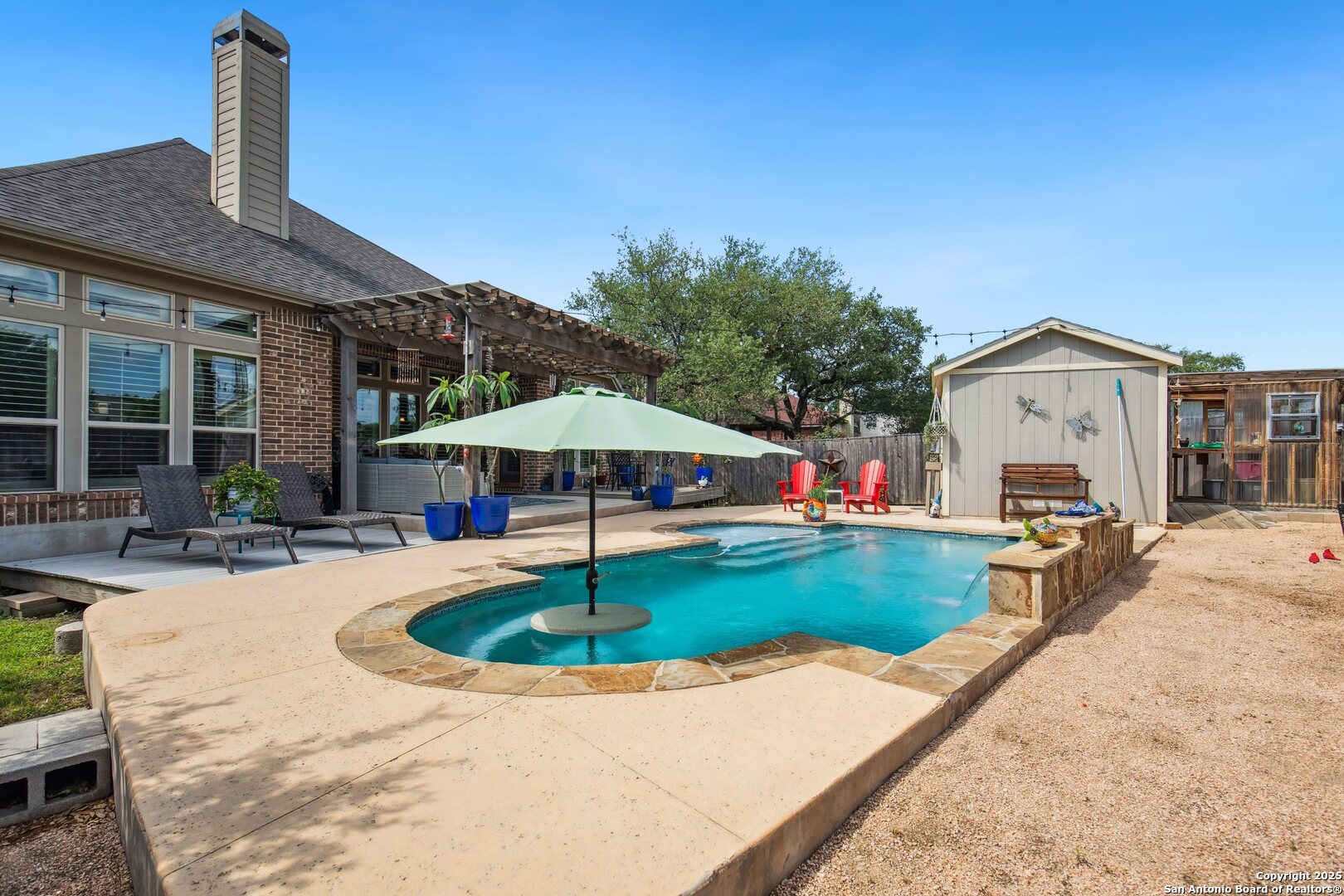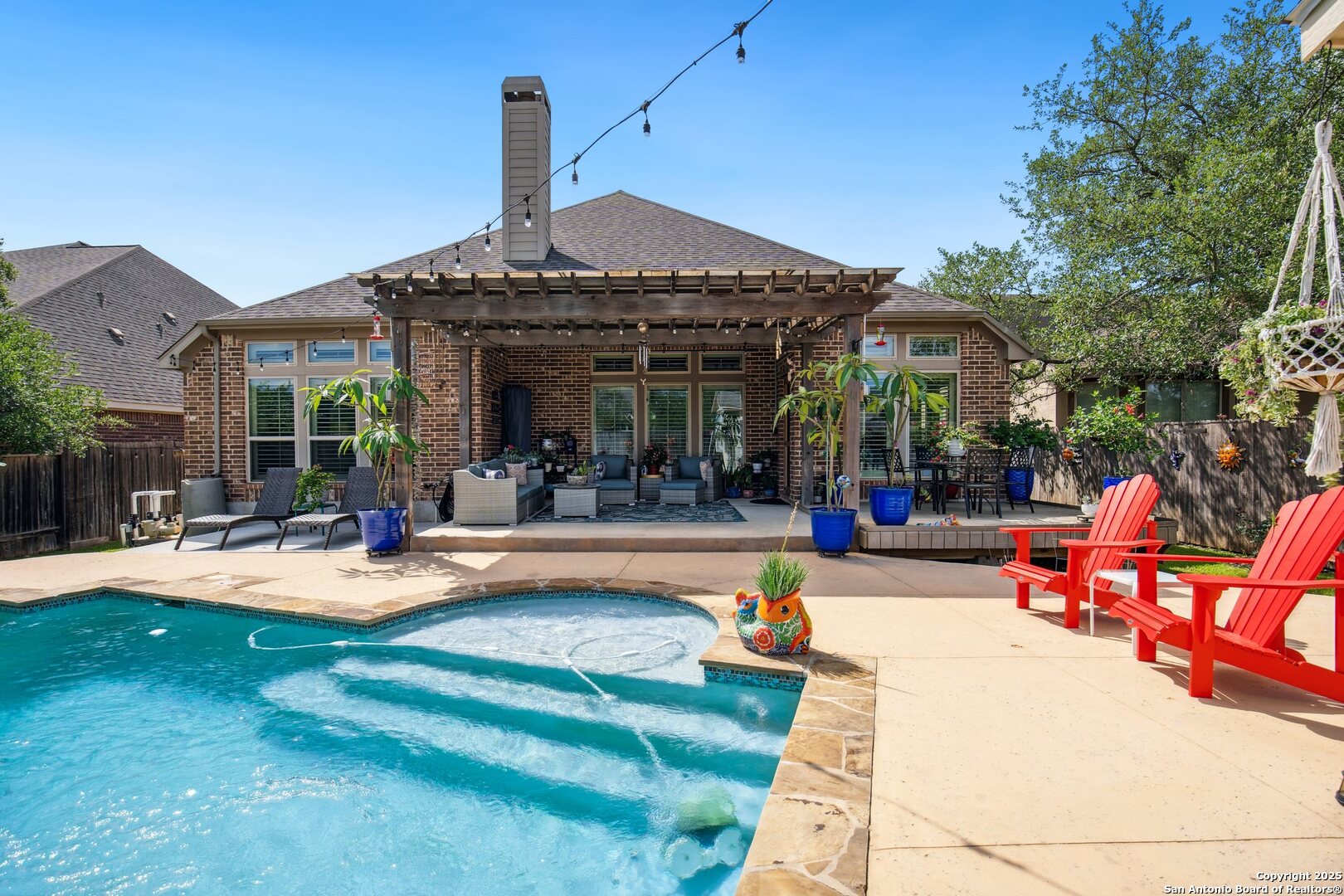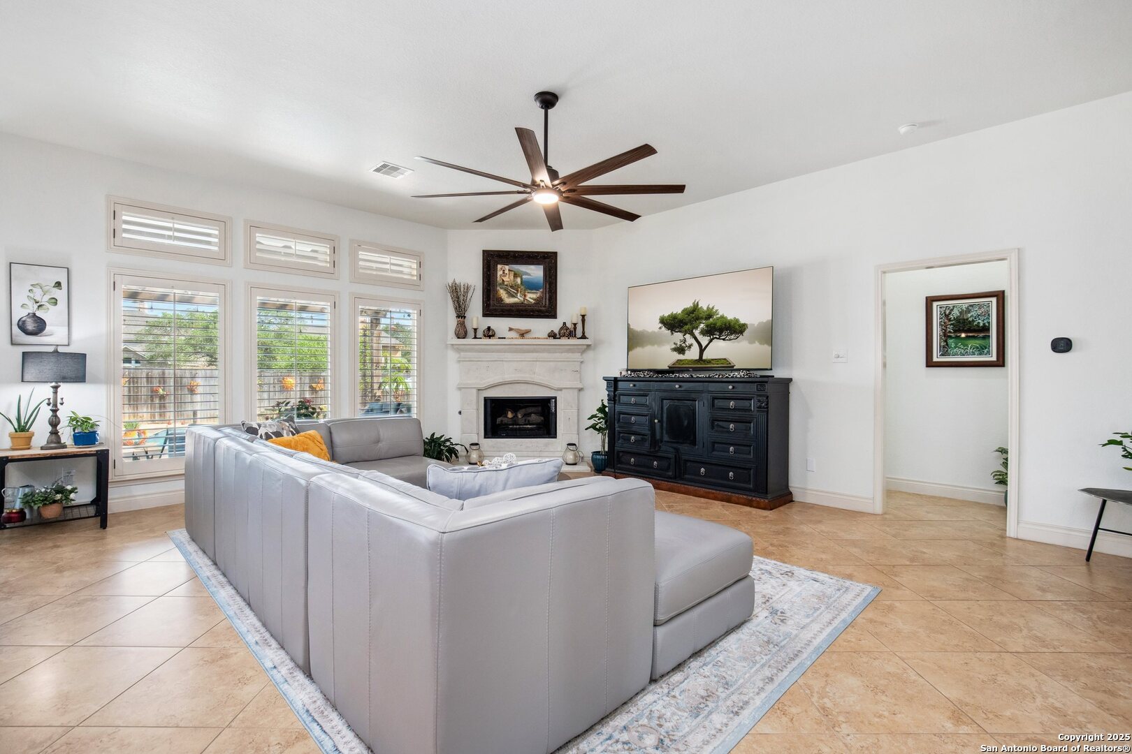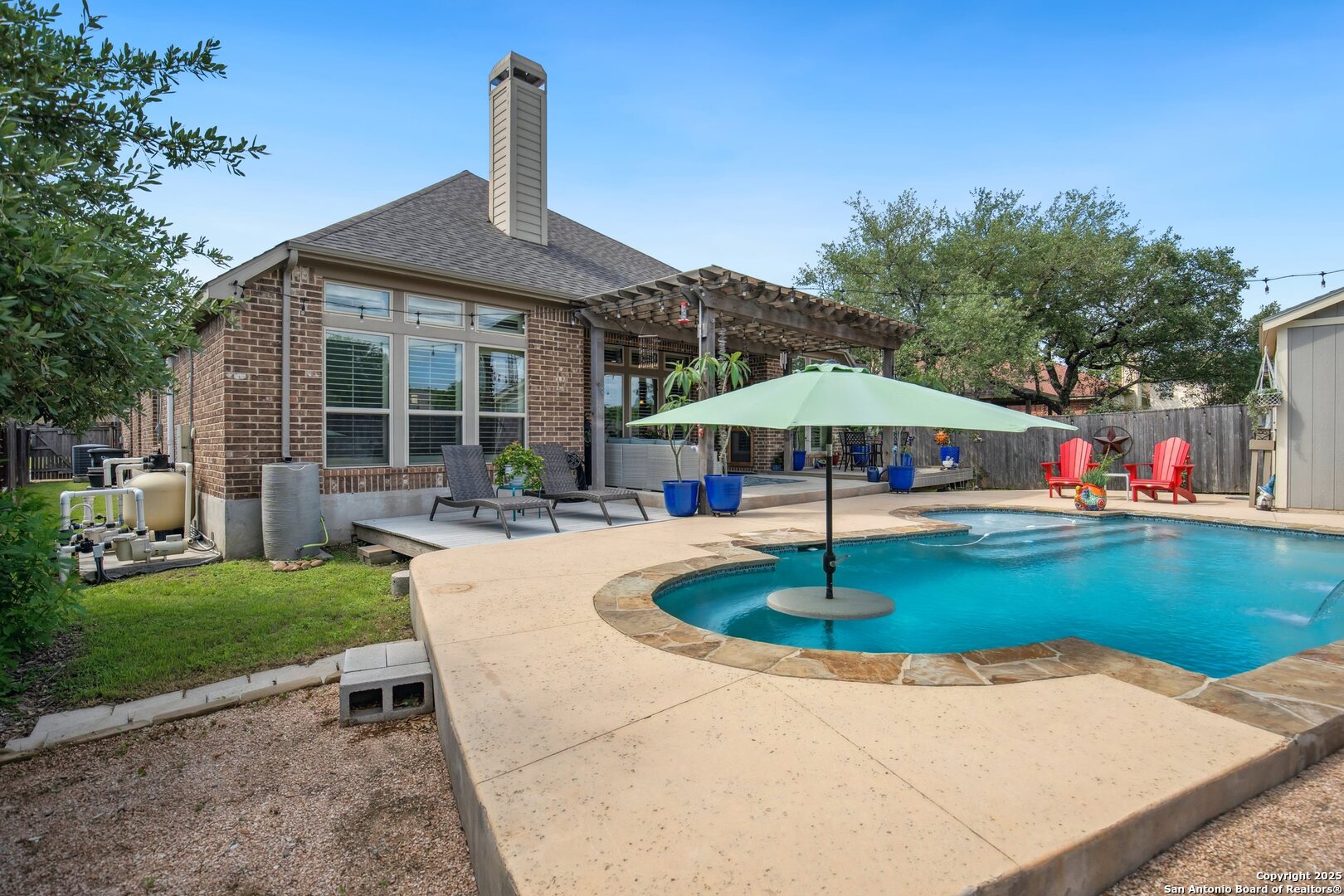 SELLER IS MOTIVATED! ALL OFFERS PRESENTED! Located in the gated community of Champions Village, this lovely single-story home offers comfort, space, and a functional layout. Inside, you'll find an open floor plan with high ceilings, wood plantation shutters, upgraded ceiling fans, and neutral tones that create a welcoming atmosphere throughout. The spacious living room features a cozy fireplace and flows seamlessly into the island kitchen and breakfast area, making it ideal for both daily living and entertaining. The kitchen is equipped with stainless steel Bosch appliances, a gas cooktop, pendant lighting, a breakfast bar, and a walk-in pantry. A formal dining room offers additional space for gatherings and special occasions. This home also includes a dedicated home office and a versatile den/media room to suit your lifestyle. The split primary suite provides a private retreat, complete with an ensuite bath that includes a soaking tub, walk-in shower, and an added mini-split A/C unit for personalized comfort. Additional upgrades include fresh interior paint, a water softener, reverse osmosis system under the kitchen sink, an alarm system, and a Tuff shed for extra storage. Step outside to the backyard oasis featuring a covered patio and open area, a swimming pool with beach entry and seating area, a privacy fence, and a storage shed and greenhouse. Don't miss your chance to own this beautifully maintained home-schedule your showing today!