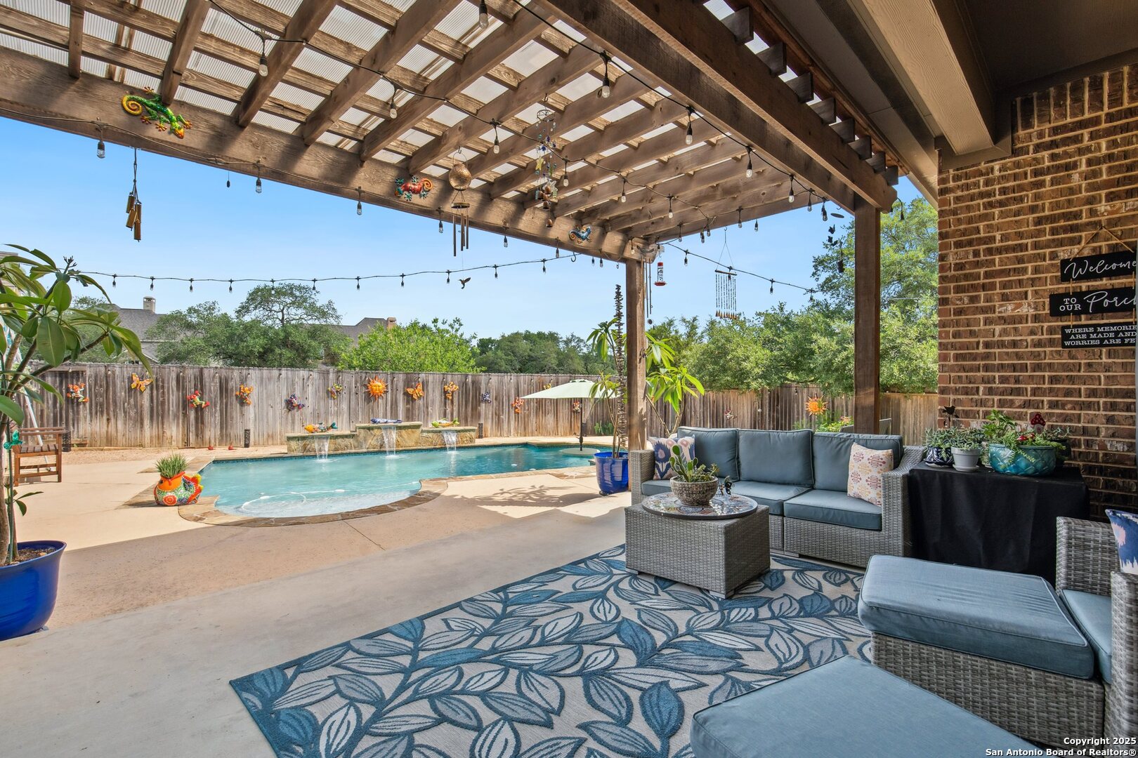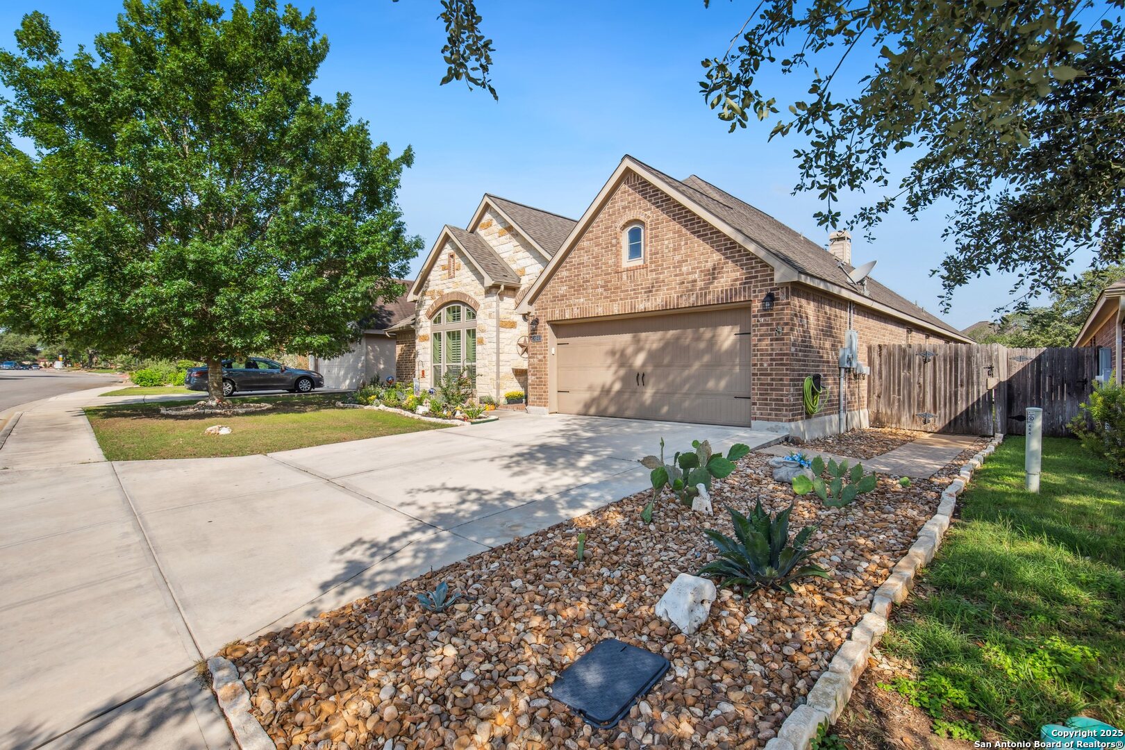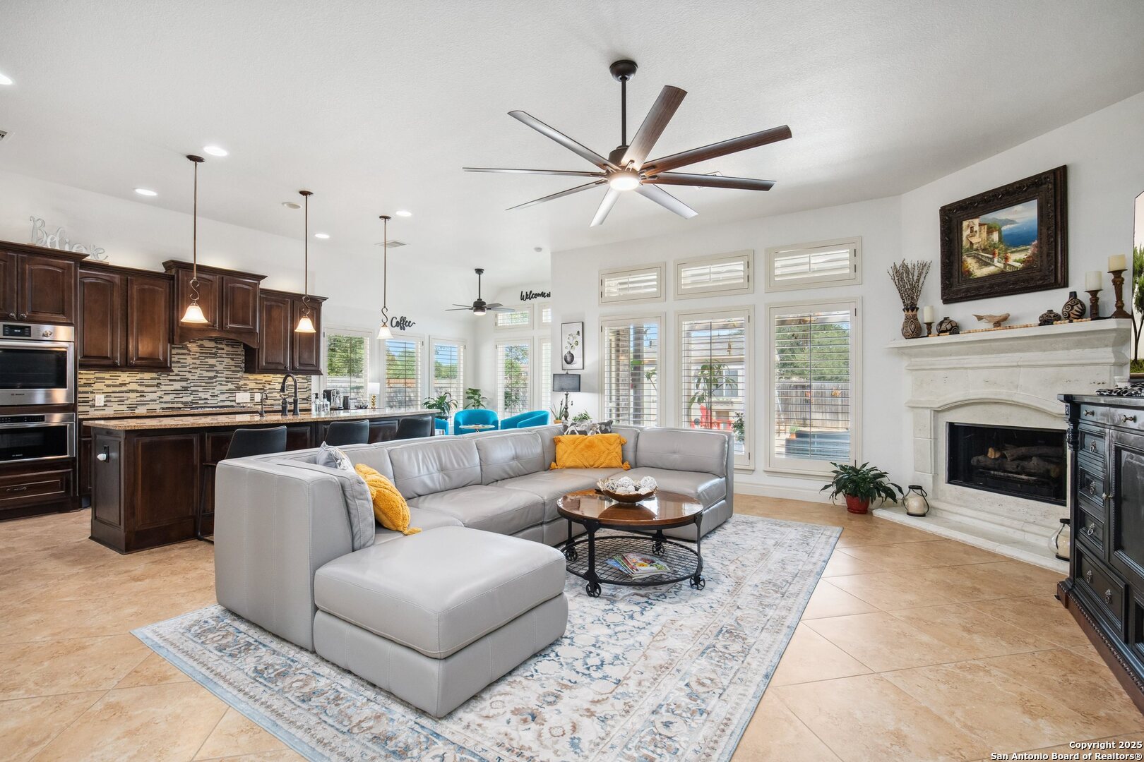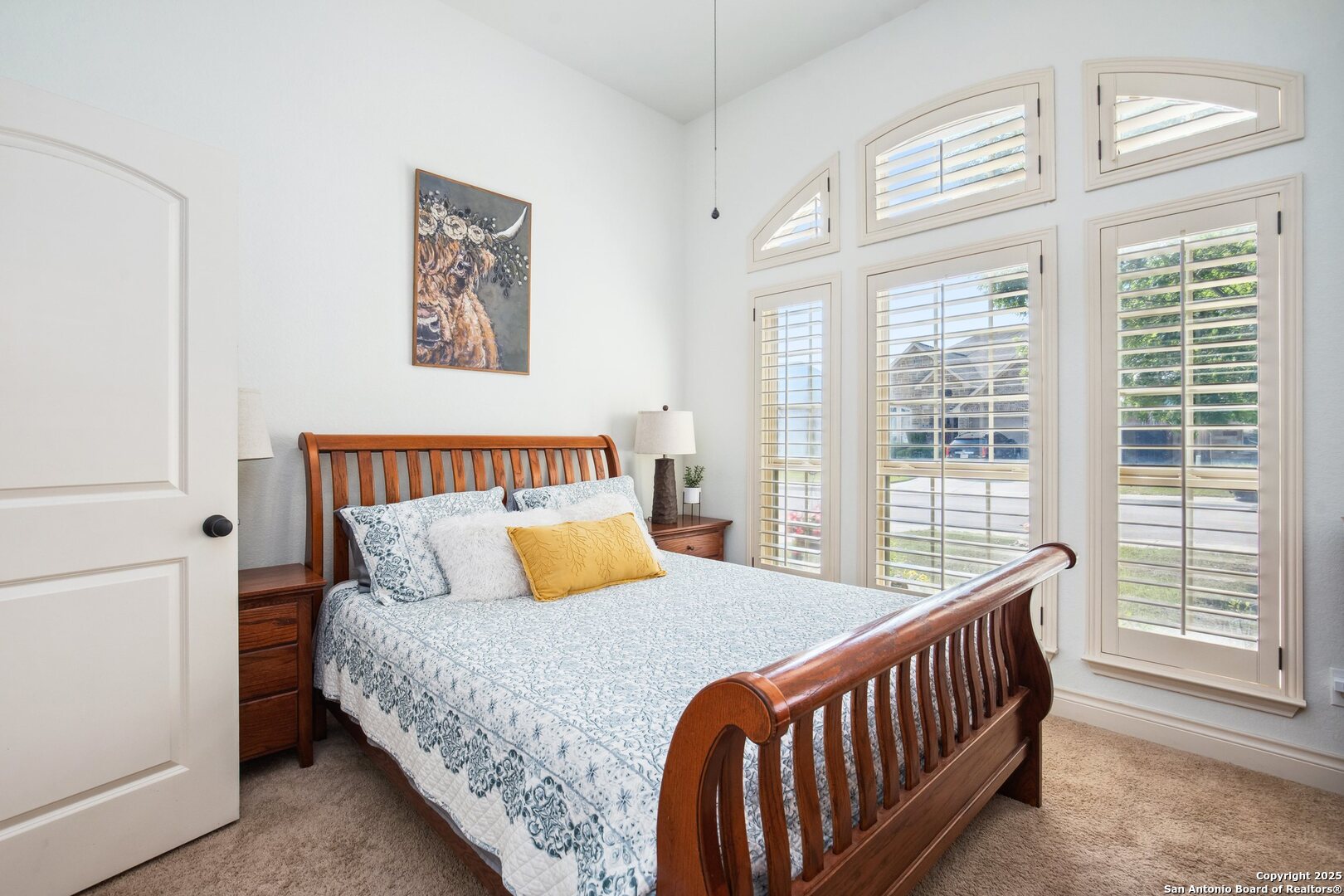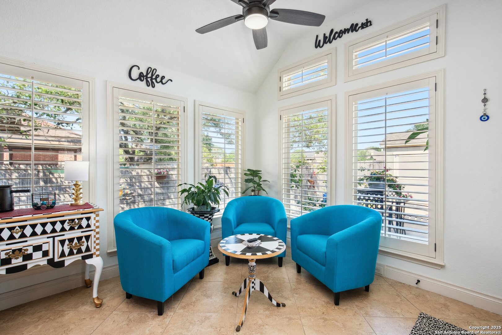 SELLER IS MOTIVATED! ALL OFFERS PRESENTED! Located in the gated community of Champions Village, this lovely single-story home offers comfort, space, and a functional layout. Inside, you'll find an open floor plan with high ceilings, wood plantation shutters, upgraded ceiling fans, and neutral tones that create a welcoming atmosphere throughout. The spacious living room features a cozy fireplace and flows seamlessly into the island kitchen and breakfast area, making it ideal for both daily living and entertaining. The kitchen is equipped with stainless steel Bosch appliances, a gas cooktop, pendant lighting, a breakfast bar, and a walk-in pantry. A formal dining room offers additional space for gatherings and special occasions. This home also includes a dedicated home office and a versatile den/media room to suit your lifestyle. The split primary suite provides a private retreat, complete with an ensuite bath that includes a soaking tub, walk-in shower, and an added mini-split A/C unit for personalized comfort. Additional upgrades include fresh interior paint, a water softener, reverse osmosis system under the kitchen sink, an alarm system, and a Tuff shed for extra storage. Step outside to the backyard oasis featuring a covered patio and open area, a swimming pool with beach entry and seating area, a privacy fence, and a storage shed and greenhouse. Don't miss your chance to own this beautifully maintained home-schedule your showing today!