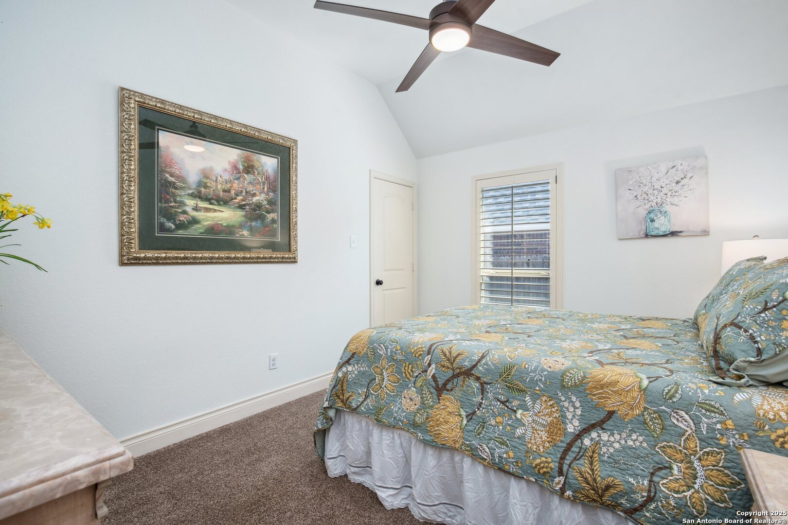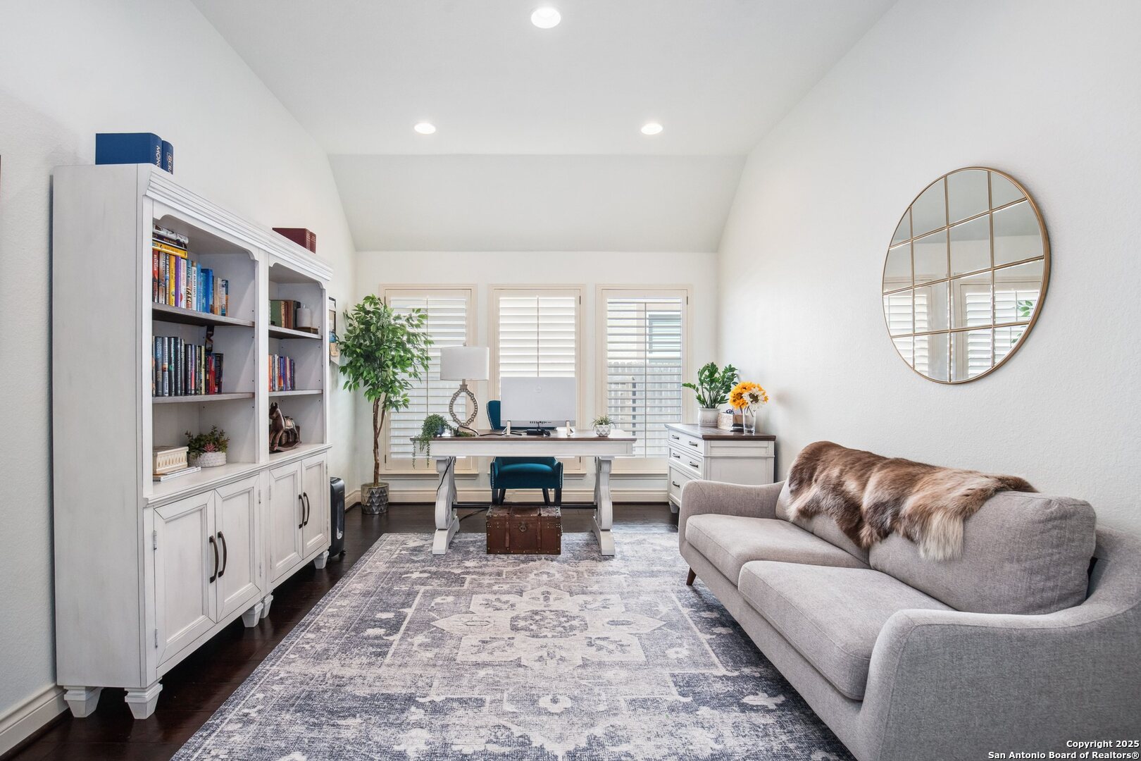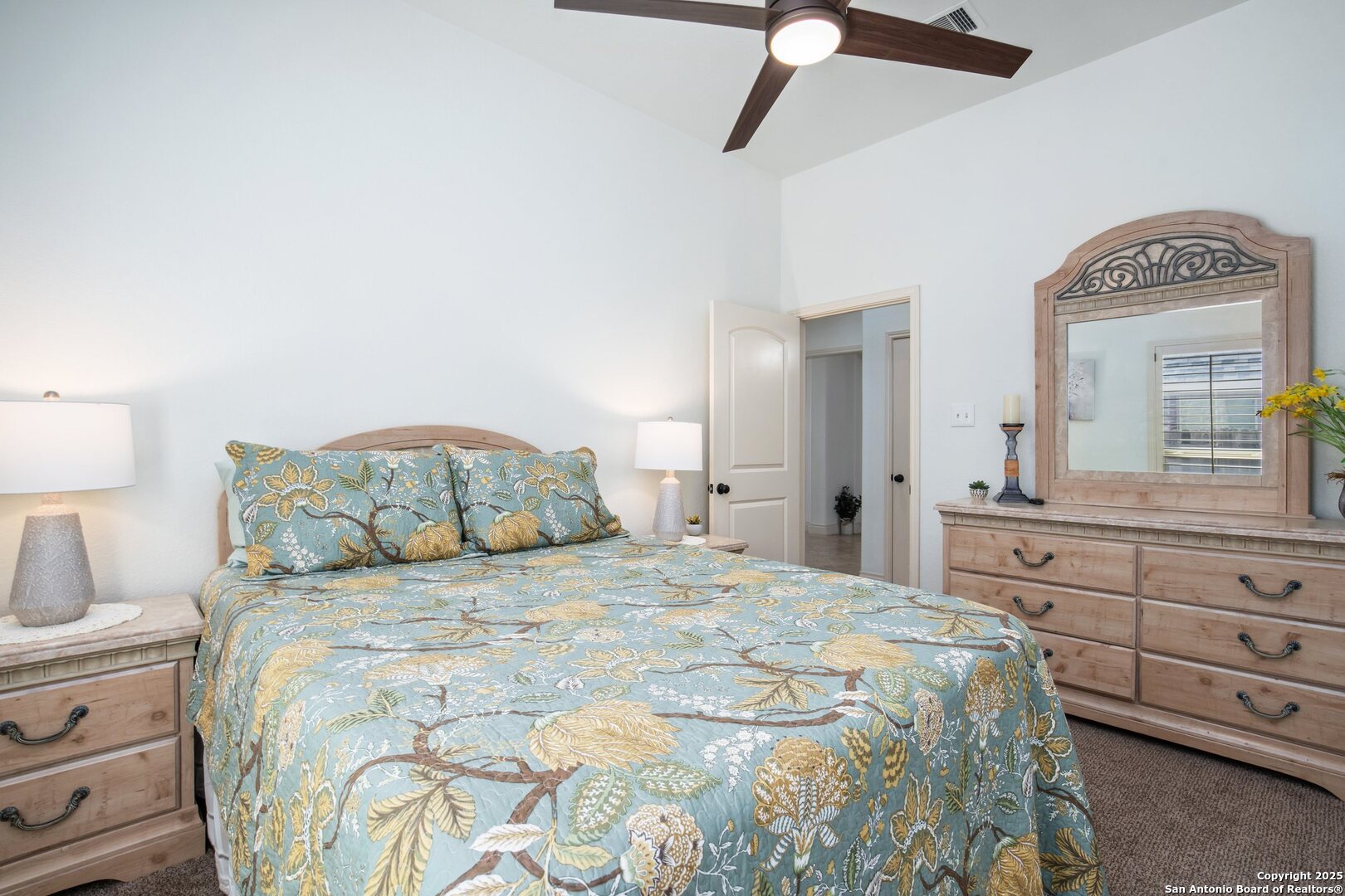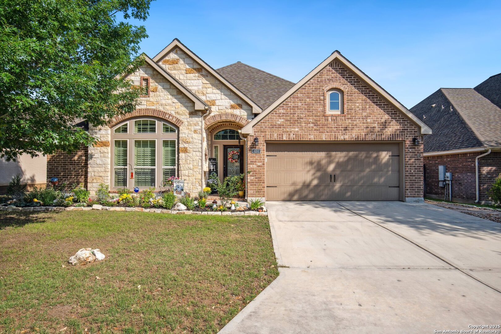 SELLER IS MOTIVATED! ALL OFFERS PRESENTED! Located in the gated community of Champions Village, this lovely single-story home offers comfort, space, and a functional layout. Inside, you'll find an open floor plan with high ceilings, wood plantation shutters, upgraded ceiling fans, and neutral tones that create a welcoming atmosphere throughout. The spacious living room features a cozy fireplace and flows seamlessly into the island kitchen and breakfast area, making it ideal for both daily living and entertaining. The kitchen is equipped with stainless steel Bosch appliances, a gas cooktop, pendant lighting, a breakfast bar, and a walk-in pantry. A formal dining room offers additional space for gatherings and special occasions. This home also includes a dedicated home office and a versatile den/media room to suit your lifestyle. The split primary suite provides a private retreat, complete with an ensuite bath that includes a soaking tub, walk-in shower, and an added mini-split A/C unit for personalized comfort. Additional upgrades include fresh interior paint, a water softener, reverse osmosis system under the kitchen sink, an alarm system, and a Tuff shed for extra storage. Step outside to the backyard oasis featuring a covered patio and open area, a swimming pool with beach entry and seating area, a privacy fence, and a storage shed and greenhouse. Don't miss your chance to own this beautifully maintained home-schedule your showing today!