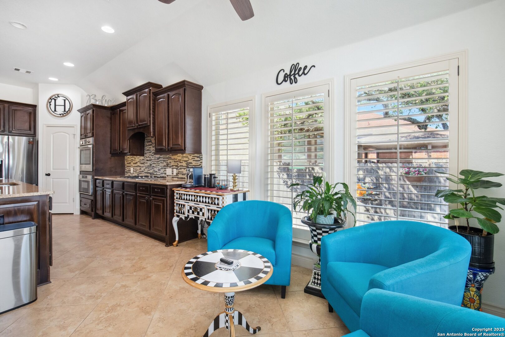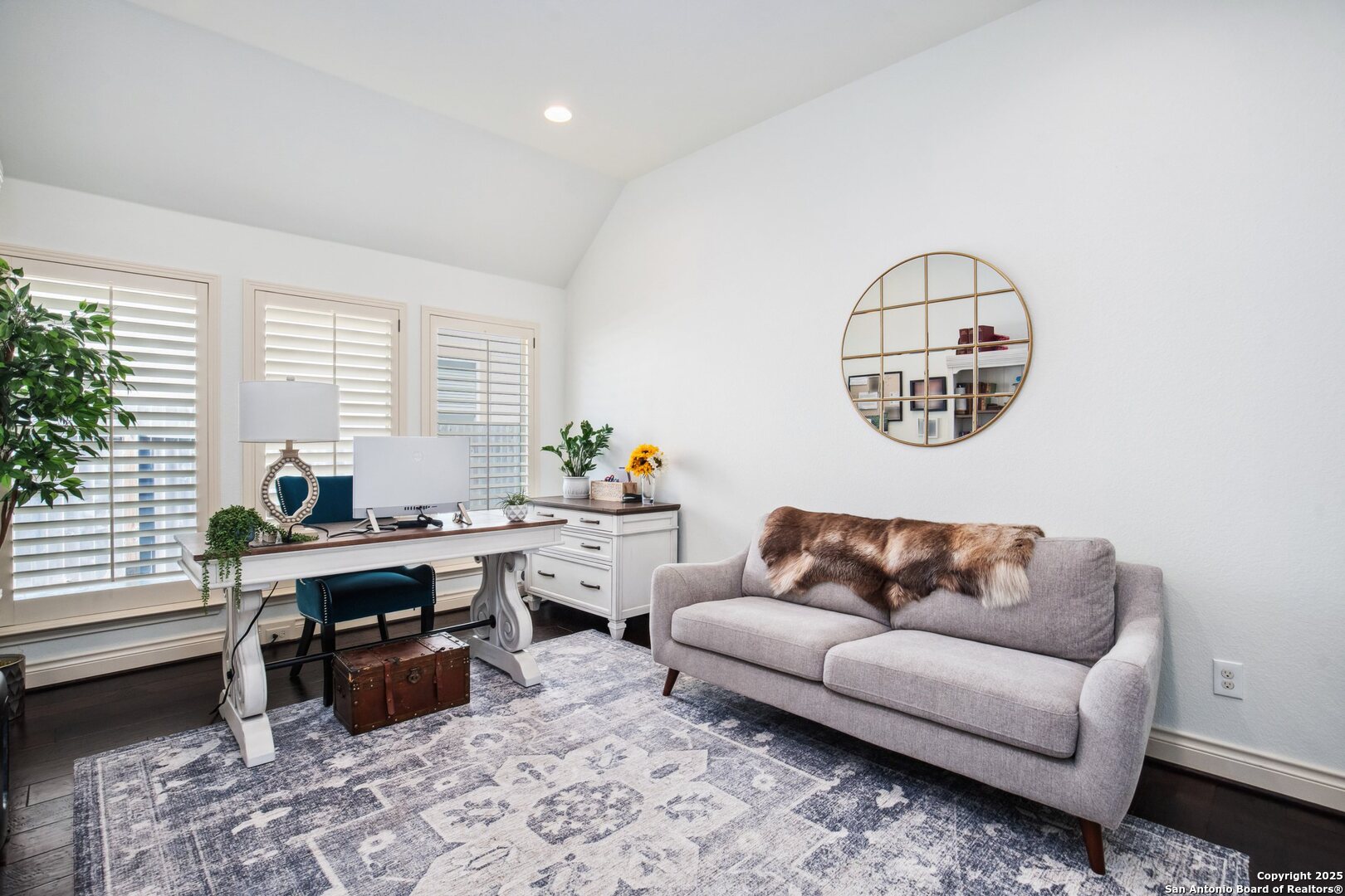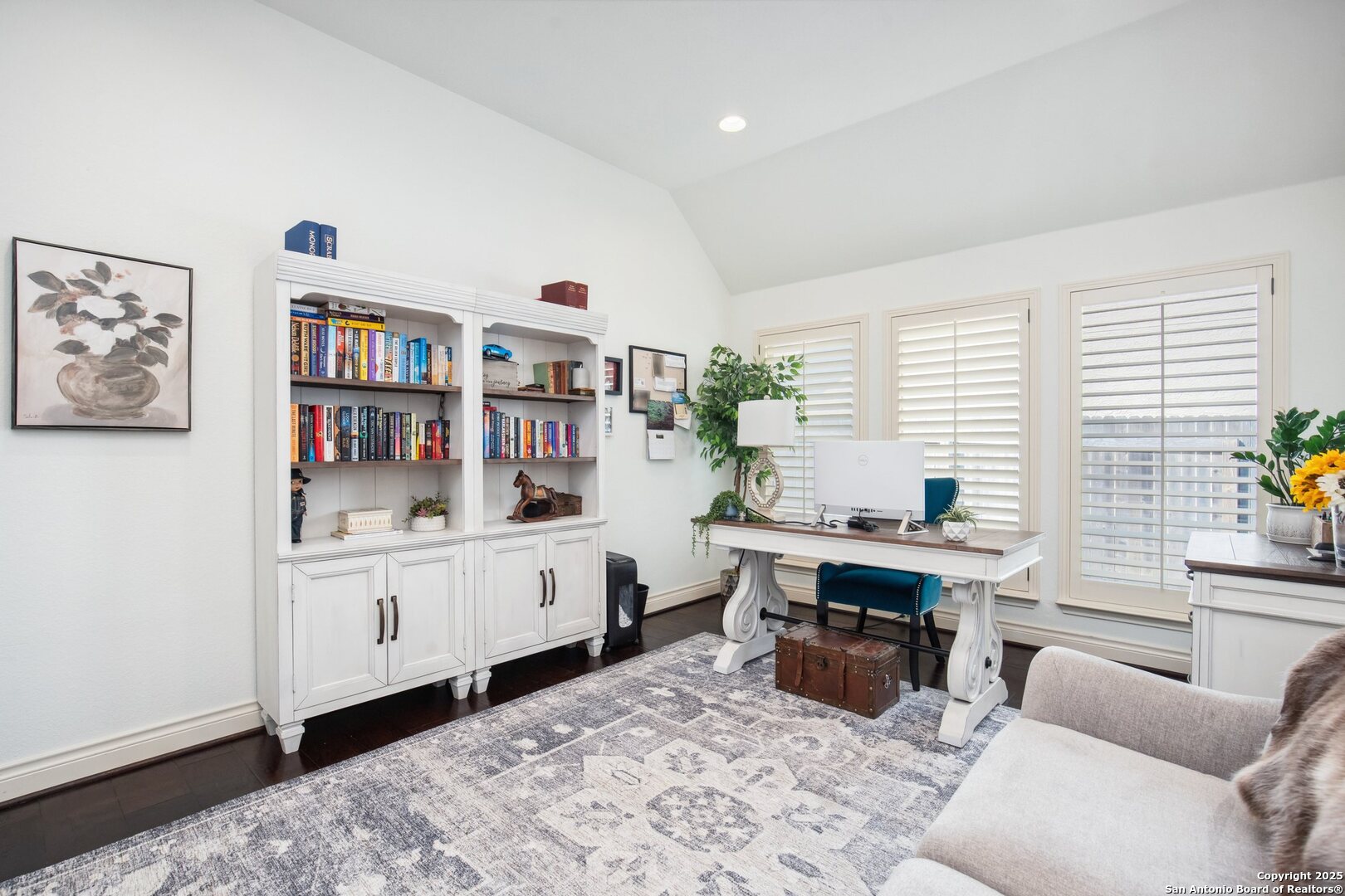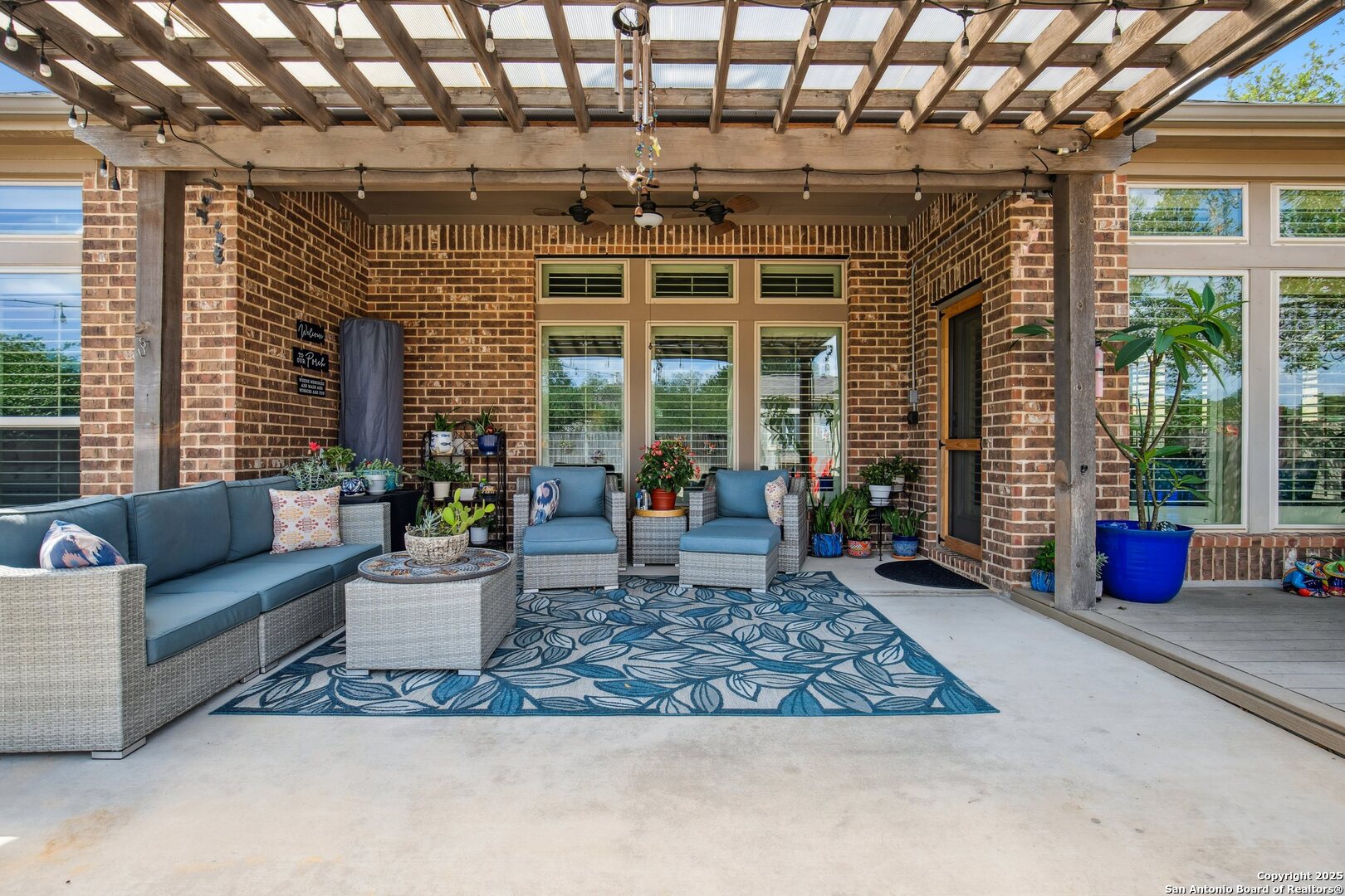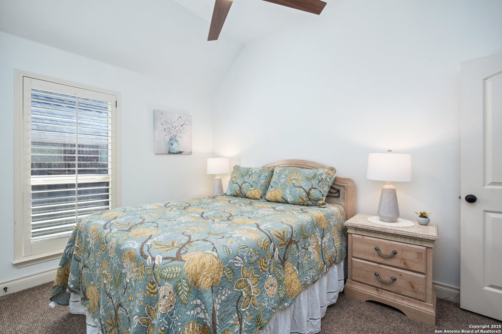 SELLER IS MOTIVATED! ALL OFFERS PRESENTED! Located in the gated community of Champions Village, this lovely single-story home offers comfort, space, and a functional layout. Inside, you'll find an open floor plan with high ceilings, wood plantation shutters, upgraded ceiling fans, and neutral tones that create a welcoming atmosphere throughout. The spacious living room features a cozy fireplace and flows seamlessly into the island kitchen and breakfast area, making it ideal for both daily living and entertaining. The kitchen is equipped with stainless steel Bosch appliances, a gas cooktop, pendant lighting, a breakfast bar, and a walk-in pantry. A formal dining room offers additional space for gatherings and special occasions. This home also includes a dedicated home office and a versatile den/media room to suit your lifestyle. The split primary suite provides a private retreat, complete with an ensuite bath that includes a soaking tub, walk-in shower, and an added mini-split A/C unit for personalized comfort. Additional upgrades include fresh interior paint, a water softener, reverse osmosis system under the kitchen sink, an alarm system, and a Tuff shed for extra storage. Step outside to the backyard oasis featuring a covered patio and open area, a swimming pool with beach entry and seating area, a privacy fence, and a storage shed and greenhouse. Don't miss your chance to own this beautifully maintained home-schedule your showing today!