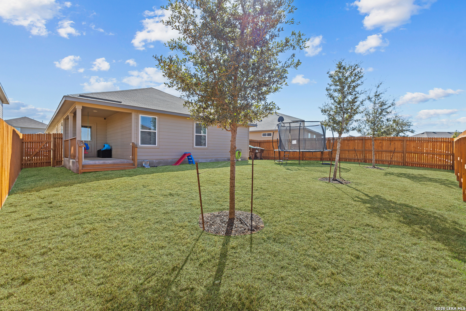 Welcome home to this beautifully maintained single-story residence offering 1,651 SF with 3 bedrooms, 2 baths, and a 2-car garage. Designed for comfortable everyday living, the layout begins with a separate dining room and flows effortlessly into a spacious open-concept kitchen featuring granite countertops, subway tile backsplash, stainless steel appliances, a gas range, abundant cabinetry, and a large island that serves as a secondary eating area while overlooking the family room - perfect for gathering and entertaining. The private primary suite provides a relaxing retreat with a double vanity, separate soaking tub and walk-in shower, private water closet, and a generous walk-in closet. Two additional bedrooms are well-sized with large closets and are conveniently located near the second full bath and utility room. Thoughtful upgrades include 9-foot ceilings, luxury vinyl plank flooring in the main living areas, ceramic tile in bathrooms and utility room, 2-inch faux wood blinds throughout, pre-plumbing for a water softener, and smart-home "Home Is Connected" features for added comfort and peace of mind. Step outside to enjoy the covered patio overlooking a fully landscaped backyard with full irrigation-ideal for relaxing or entertaining. Located in a welcoming neighborhood with community amenities, within walking distance to the elementary school, and offering the added confidence of a remaining 10-year builder warranty.