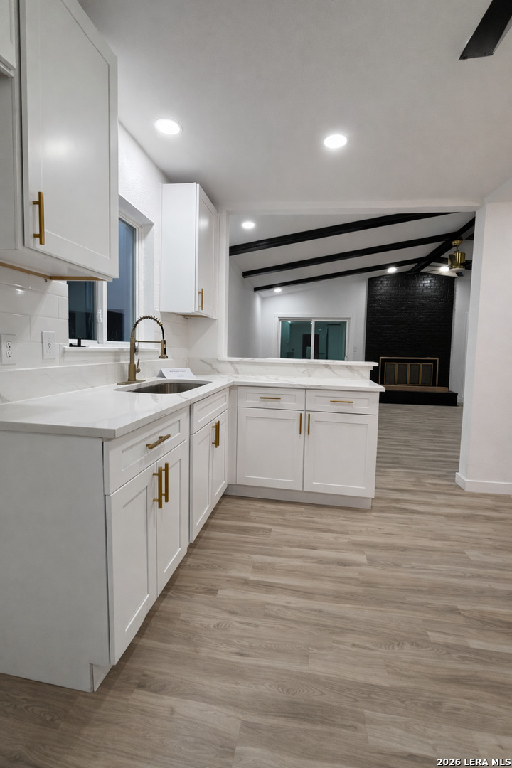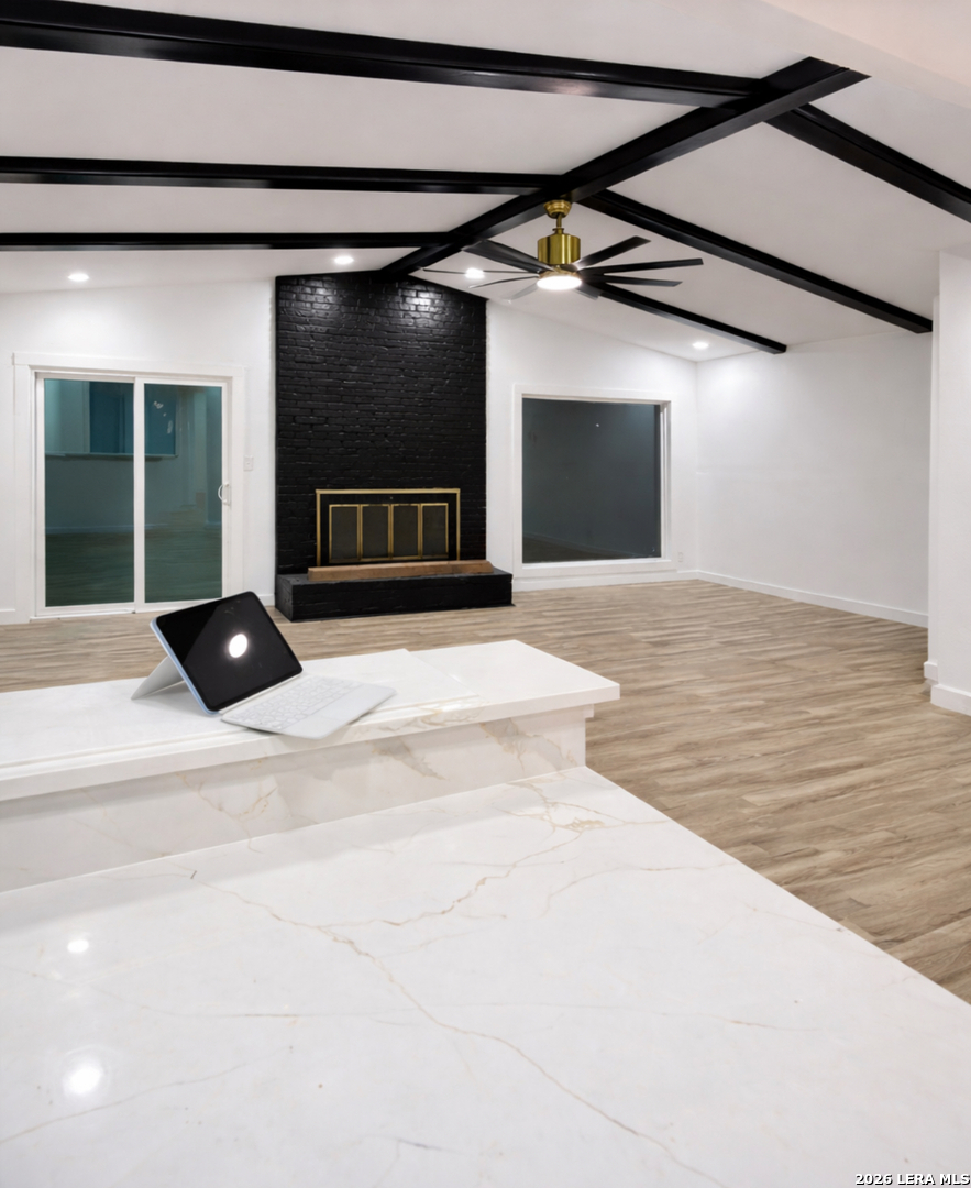 Stunning fully renovated home featuring dramatic vaulted ceilings with exposed black beams and a striking floor to ceiling black brick fireplace as the focal point of the living space. The open concept layout seamlessly connects the living area to a beautifully updated kitchen showcasing white shaker cabinetry, quartz countertops with subtle veining, gold hardware, and a statement gooseneck faucet. Natural light pours through large windows and sliding glass doors, enhancing the clean lines and contemporary finishes throughout. Luxury wood look floors runs throughout the home, complementing the bold black and gold accents a cohesive, upscale feel. Final touches are currently being completed to deliver a fully polished product. Additional professional photos coming soon.