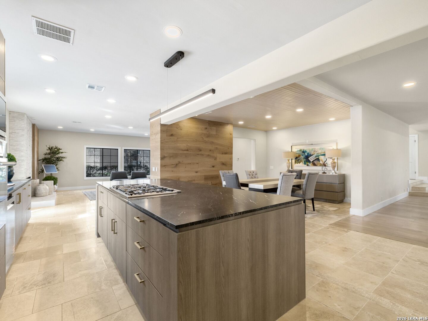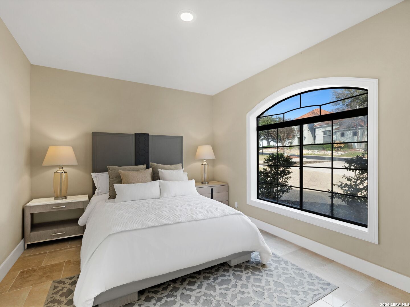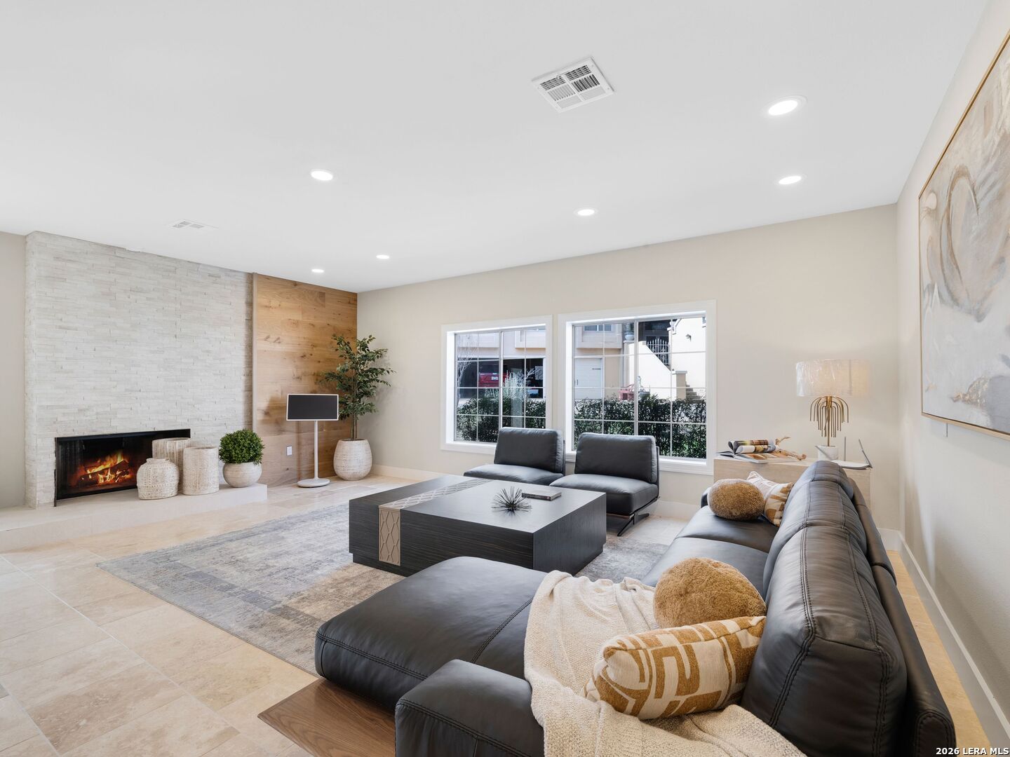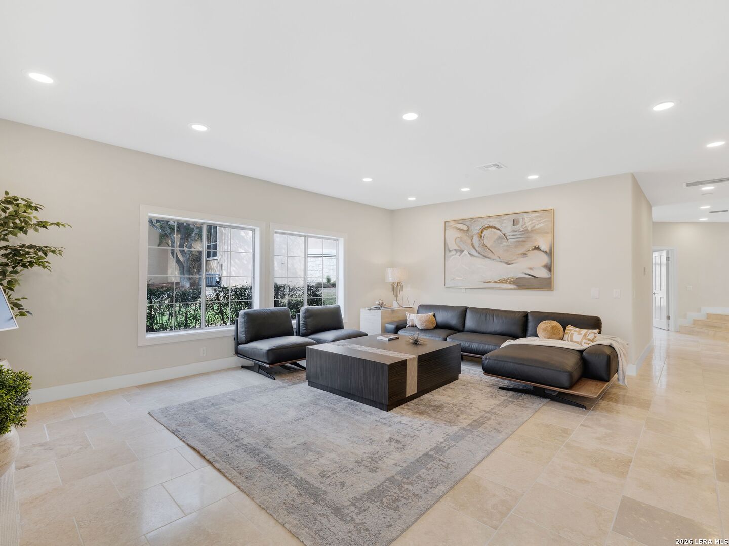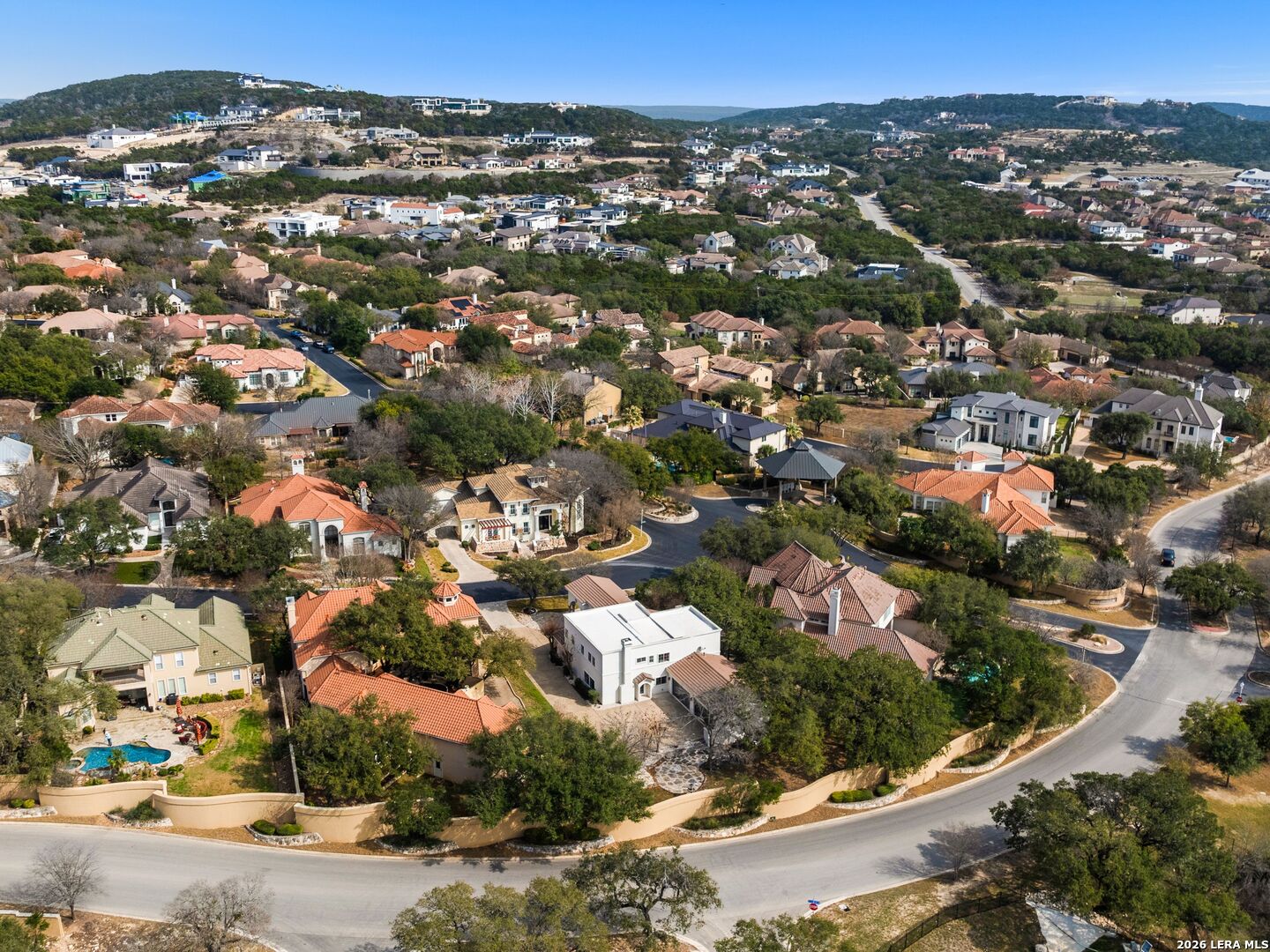 Renovated with a curated material palette, this Mediterranean residence is positioned on a tree lined cul de sac within The Dominion. The exterior presents balanced architectural proportions, while the interior reflects updated finishes and a structured layout. A custom double door entry opens to a two story foyer that establishes separation between formal and informal living areas. The primary living room features a fireplace and ceiling detail, providing a defined gathering space. The kitchen anchors the main level with an expansive island, built in appliances, gas cooking, side by side refrigeration, granite surfaces, and custom cabinetry. It connects directly to a secondary living area with a fireplace and wet bar, creating a functional layout for daily living and entertaining. The main floor includes a private study with built ins and an additional flex room suitable for an office, library, or studio. Upstairs, the primary suite includes dual walk in closets with custom organization and a bath with soaking tub, separate walk in shower, and dual vanities. Two secondary bedrooms complete the upper level, including one with a private bath. Additional features include a four car attached garage and natural gas service. Located within the guarded community of The Dominion, the home offers architectural character and updated interiors within an established setting.