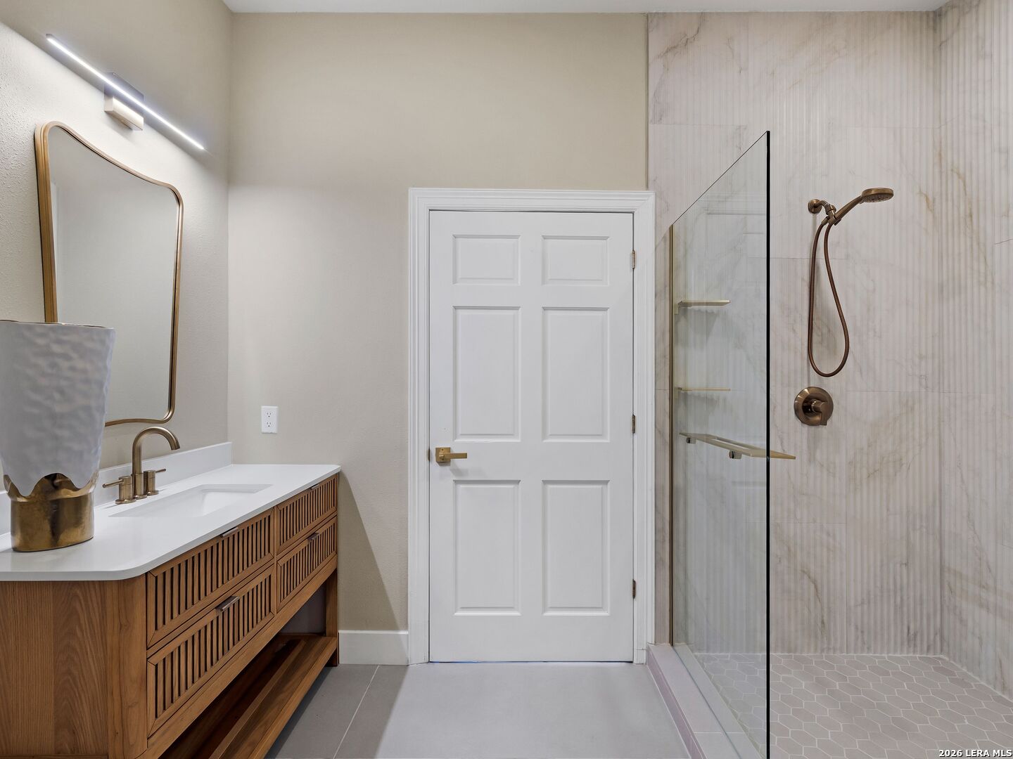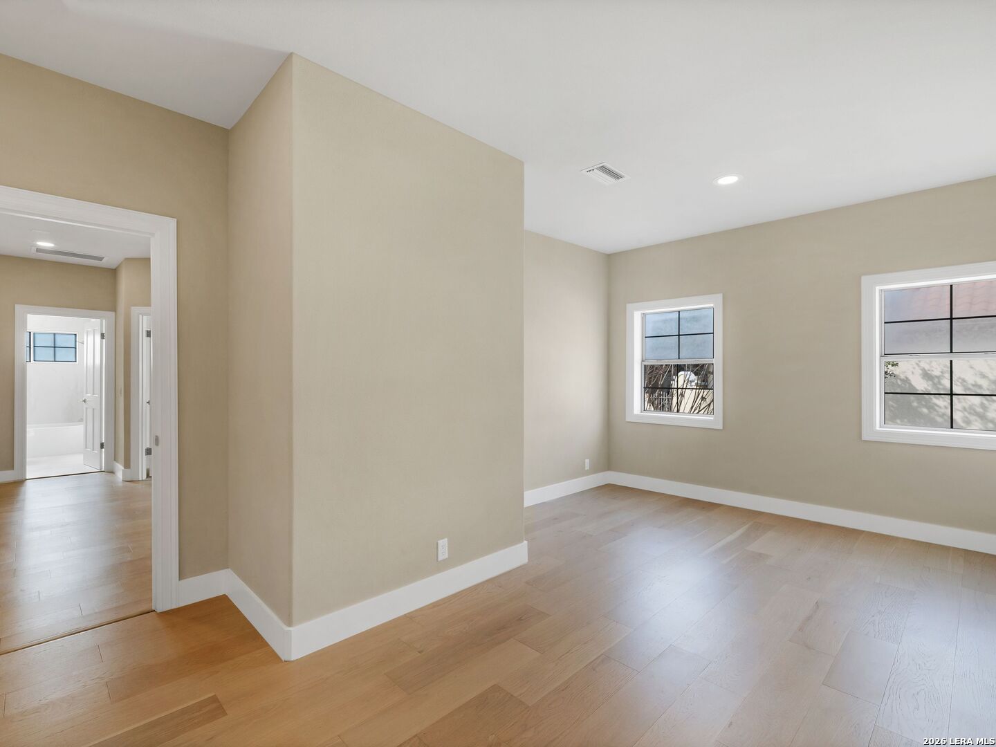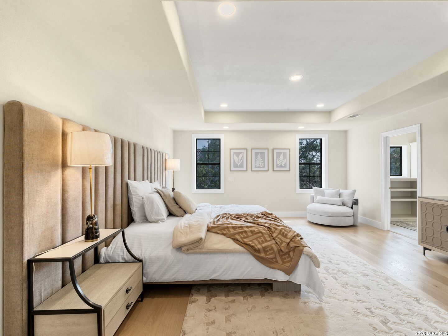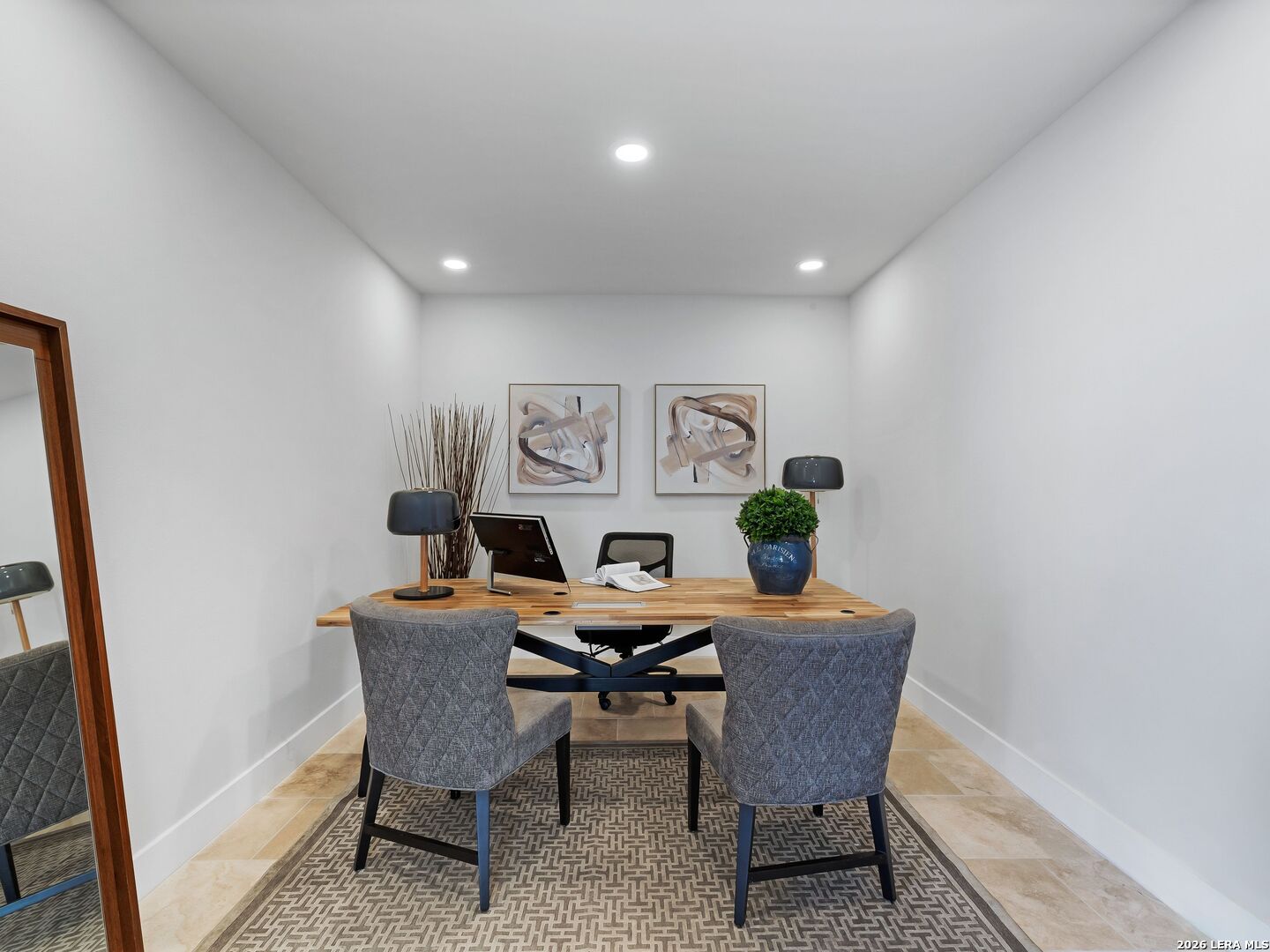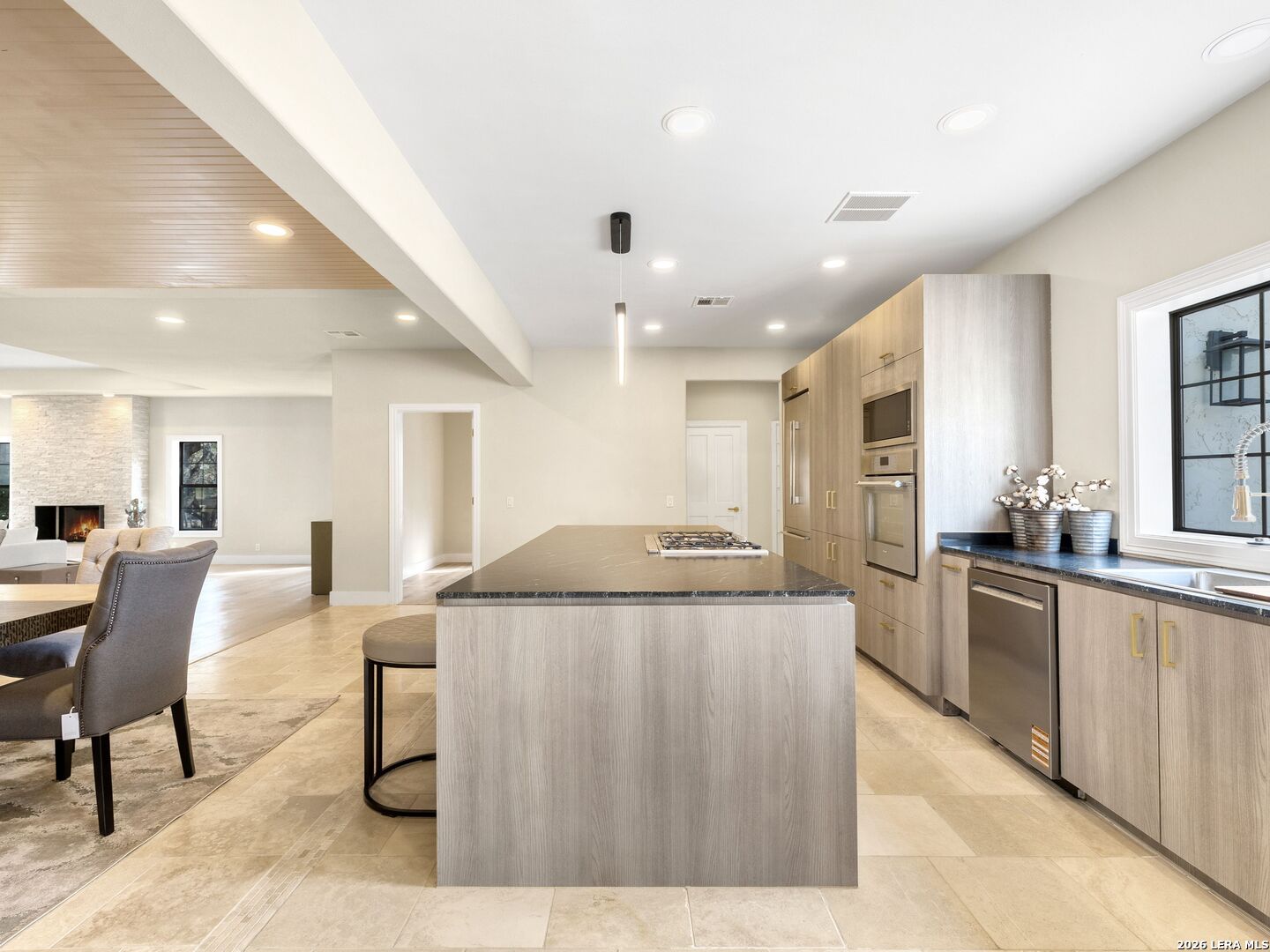 Renovated with a curated material palette, this Mediterranean residence is positioned on a tree lined cul de sac within The Dominion. The exterior presents balanced architectural proportions, while the interior reflects updated finishes and a structured layout. A custom double door entry opens to a two story foyer that establishes separation between formal and informal living areas. The primary living room features a fireplace and ceiling detail, providing a defined gathering space. The kitchen anchors the main level with an expansive island, built in appliances, gas cooking, side by side refrigeration, granite surfaces, and custom cabinetry. It connects directly to a secondary living area with a fireplace and wet bar, creating a functional layout for daily living and entertaining. The main floor includes a private study with built ins and an additional flex room suitable for an office, library, or studio. Upstairs, the primary suite includes dual walk in closets with custom organization and a bath with soaking tub, separate walk in shower, and dual vanities. Two secondary bedrooms complete the upper level, including one with a private bath. Additional features include a four car attached garage and natural gas service. Located within the guarded community of The Dominion, the home offers architectural character and updated interiors within an established setting.