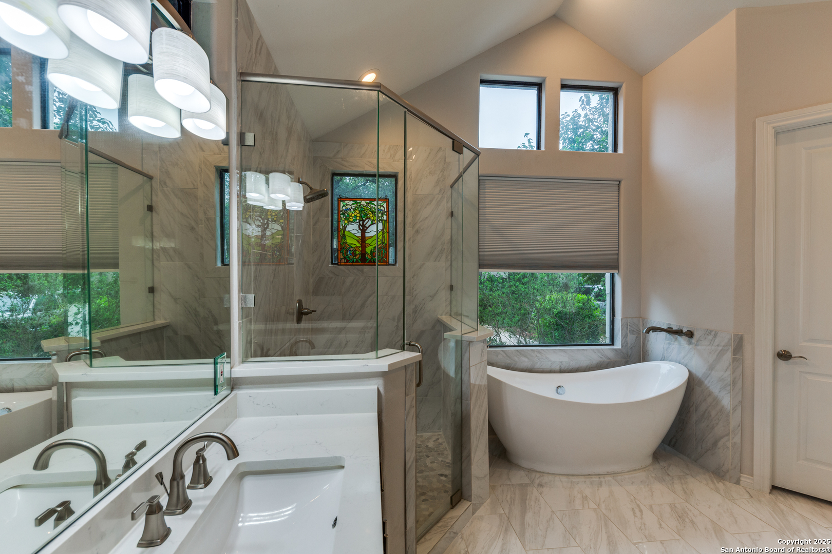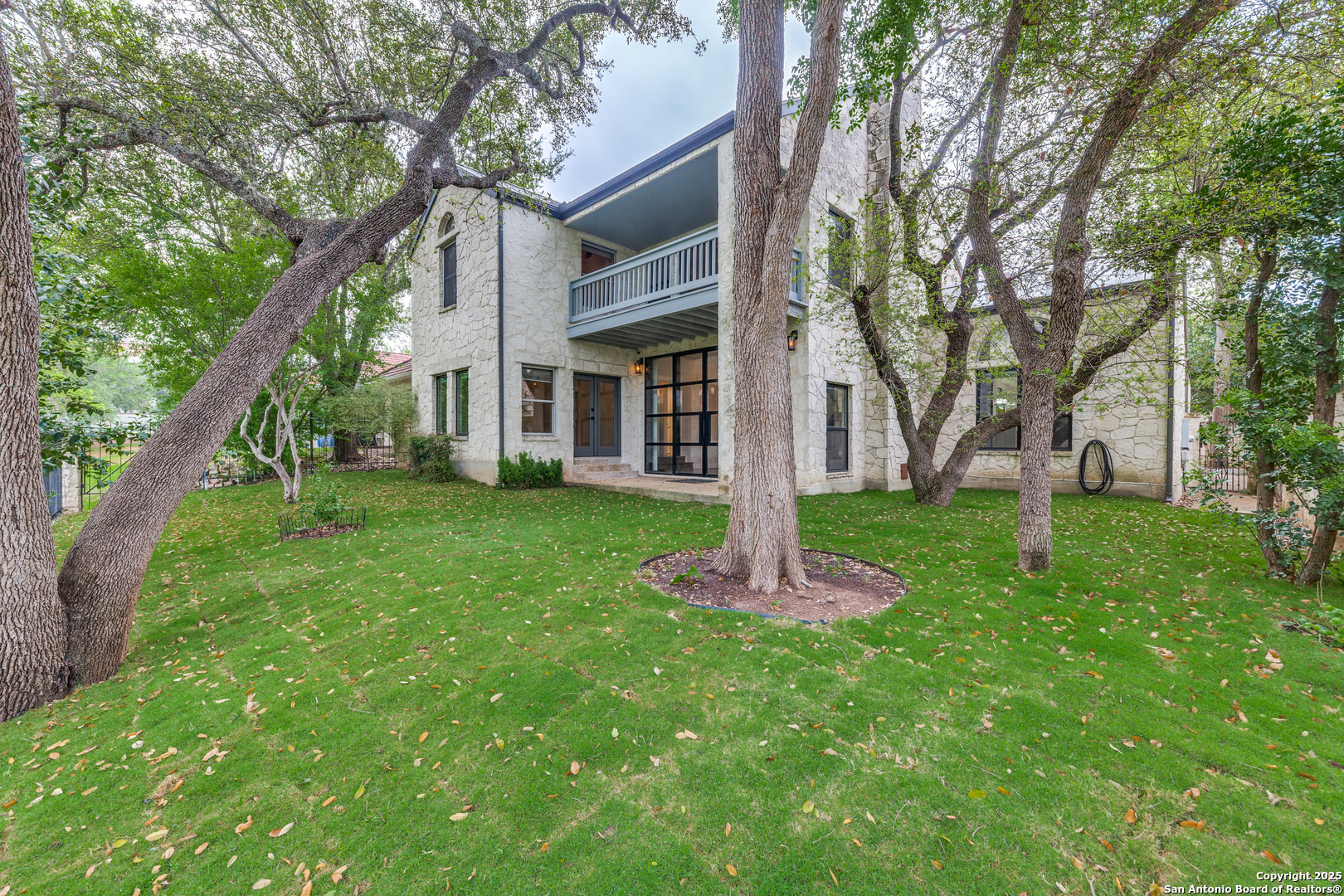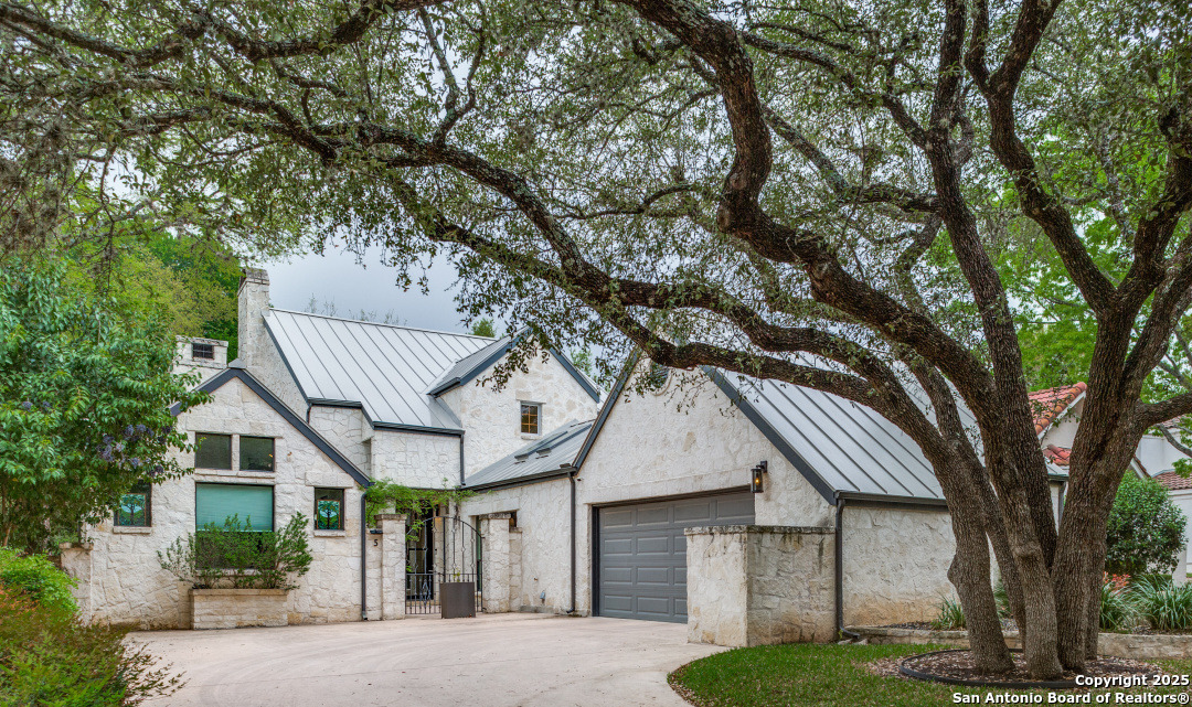 With a modern French Cottage contemporary design, this beauty has stellar finishes and a serene garden view from every room. The open living room with a stone fireplace and view of the gorgeous mature trees through the wall to wall iron door/windows, is perfect for entertaining and is also open to the designer kitchen. The kitchen features quartz countertops, ample cabinet space, a large island and two eating areas. There are two Primary bedroom suites down. Upstairs has two bedrooms, each with their own bathrooms and another large living/family or game room with a covered balcony nestled in the trees with beautiful views of the greenbelt. This home is wonderfully situated in the Dominion Community. It not only has close proximity to the Country Club with all of the amenities, but upon driving home from Ambassador Lane., you have a fabulous pond with ducks, water fountains and a mini bridge. A must see home for sure.