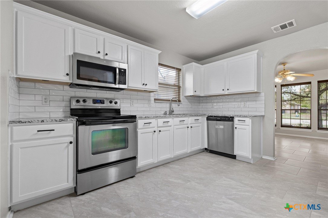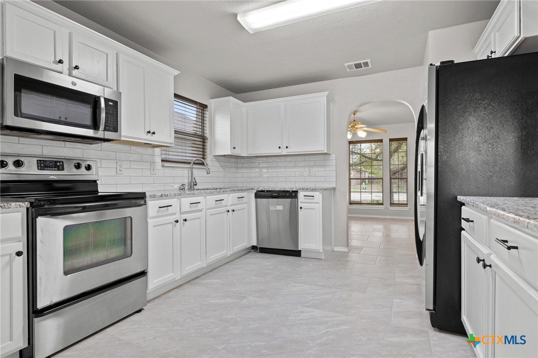 Welcome to this spacious and beautifully updated 4-bedroom, 2.5-bathroom home with over 2,100 square feet of comfortable living space. With fresh upgrades inside and out, this home is perfect for families or anyone needing extra room to spread out. Step inside to find new ceramic tile flooring, new granite countertops, and brand-new stainless steel appliances in a kitchen that’s perfect for cooking and entertaining. The open layout flows easily between the living, dining, and kitchen spaces, with plenty of natural light throughout. Upstairs, you'll find all four bedrooms, including a large primary suite with a double vanity, separate shower, and relaxing garden tub. This home also features fresh exterior paint and a one-year-old architectural shingle roof, giving you both peace of mind and great curb appeal. The covered front porch and covered back patio offer great spots to relax, and the fenced backyard is ready for pets, kids, or weekend BBQs. Located just minutes from schools, parks, shopping, and dining, this move-in ready home offers both convenience and comfort.