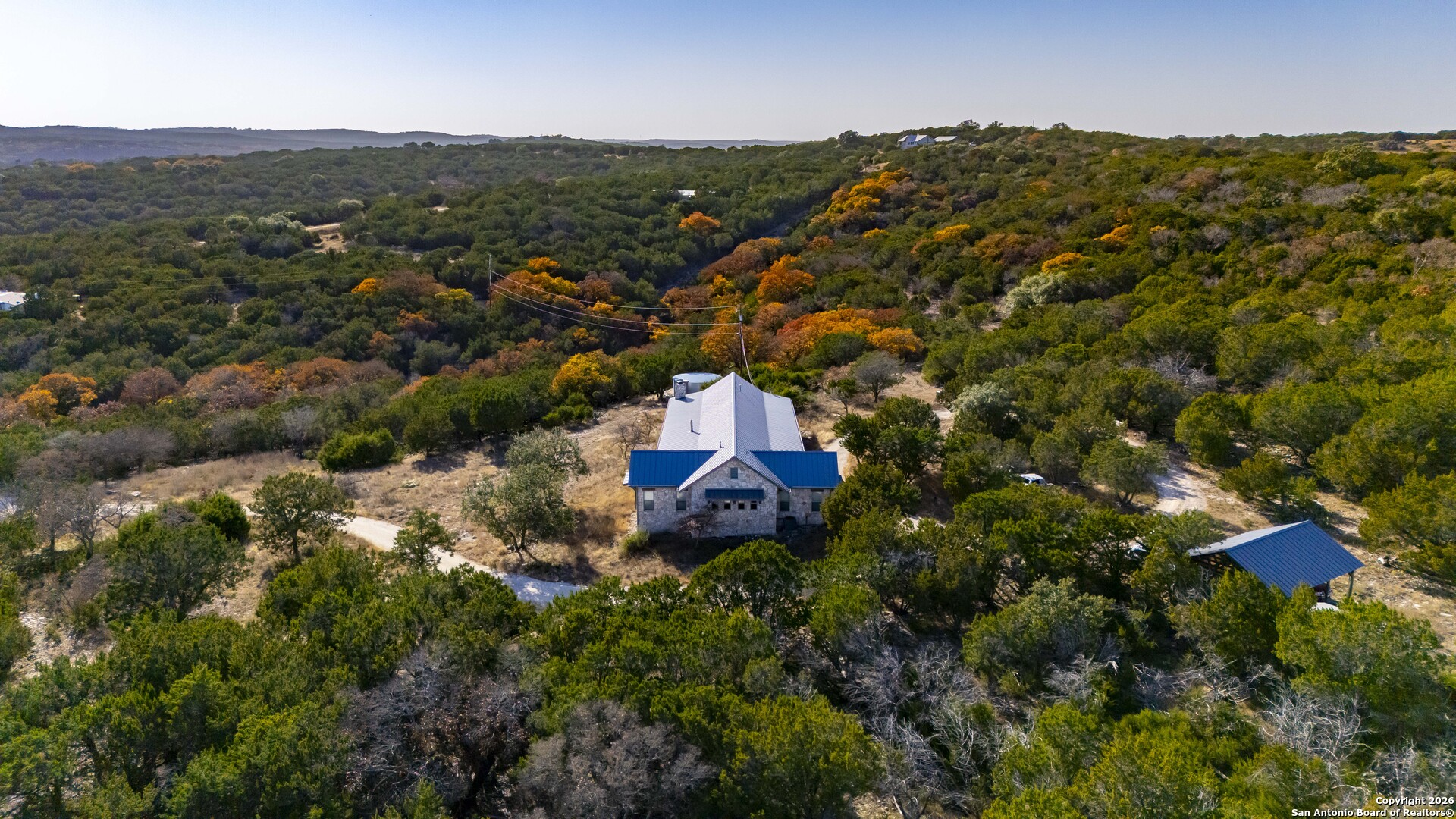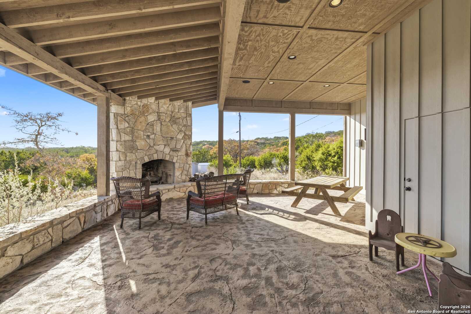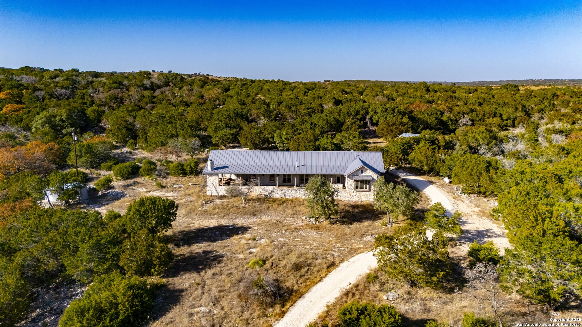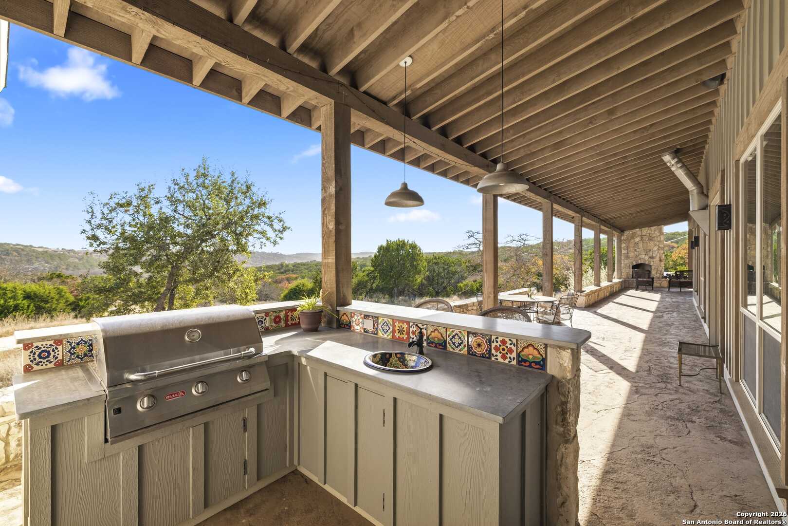 11.52 Ag Exempt Acres with Hill Country Views that truly take your breath away! The 2,825 sq. ft. residence features 3 spacious bdrms, each with its own private ensuite bath, offering comfort & privacy. Designed w/both style and functionality in mind, the home boasts soaring ceilings, an open-concept floor plan, distinctive stained floors & custom cabinetry. The chef's kitchen is highlighted by beautiful leathered granite countertops, a large pantry & seamless flow into the main living areas, perfect for entertaining. The split-bedroom layout provides an oversized primary suite complete w/additional space ideal for a home office, along w/direct access to both the front & back patios. Outdoor living is exceptional, w/expansive covered patios designed to take full advantage of the panoramic scenery. The back patio features a built-in BBQ area & striking stone fireplace, creating the perfect setting for relaxing & entertaining while enjoying Hill Country views. Additional amenities include a licensed septic system, an impressive rainwater catchment system, a two-car carport w/attached storage & an additional storage shed. Just 12 miles from Kerrville. Hill Country Living at its Best!