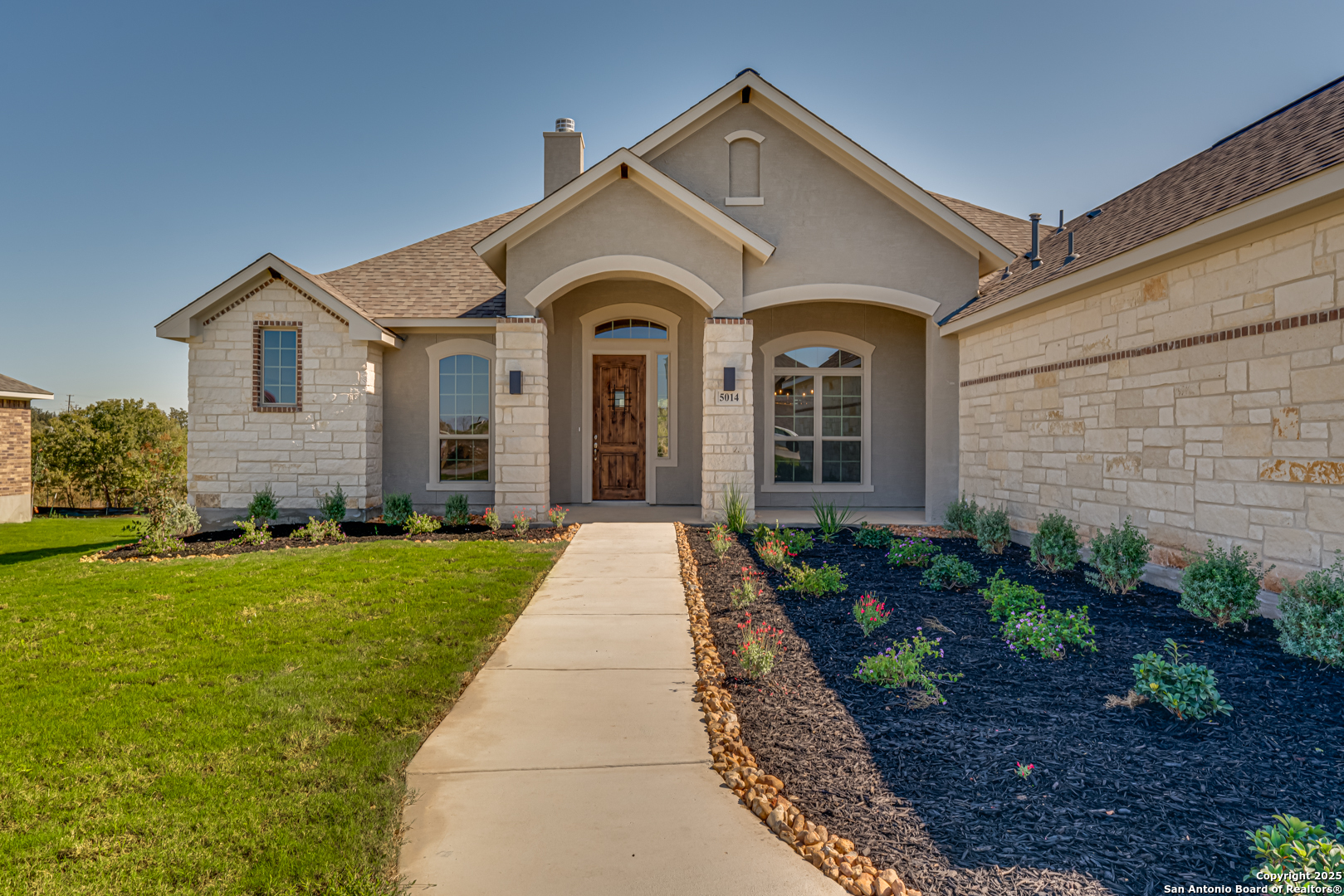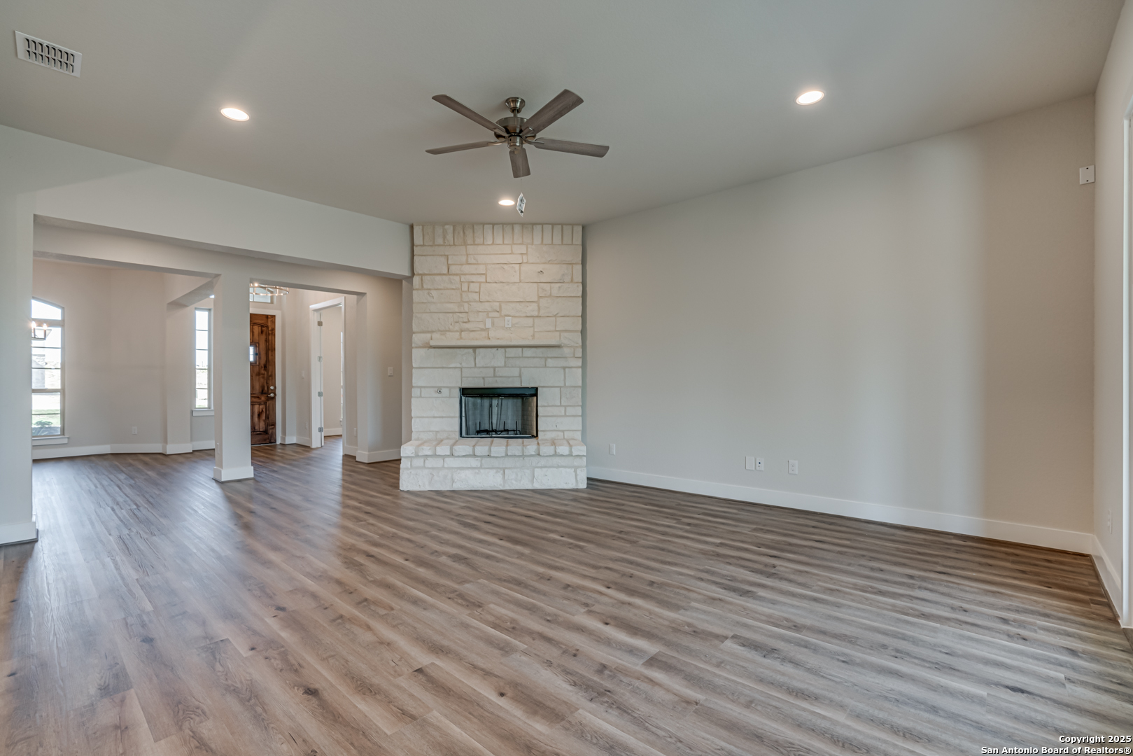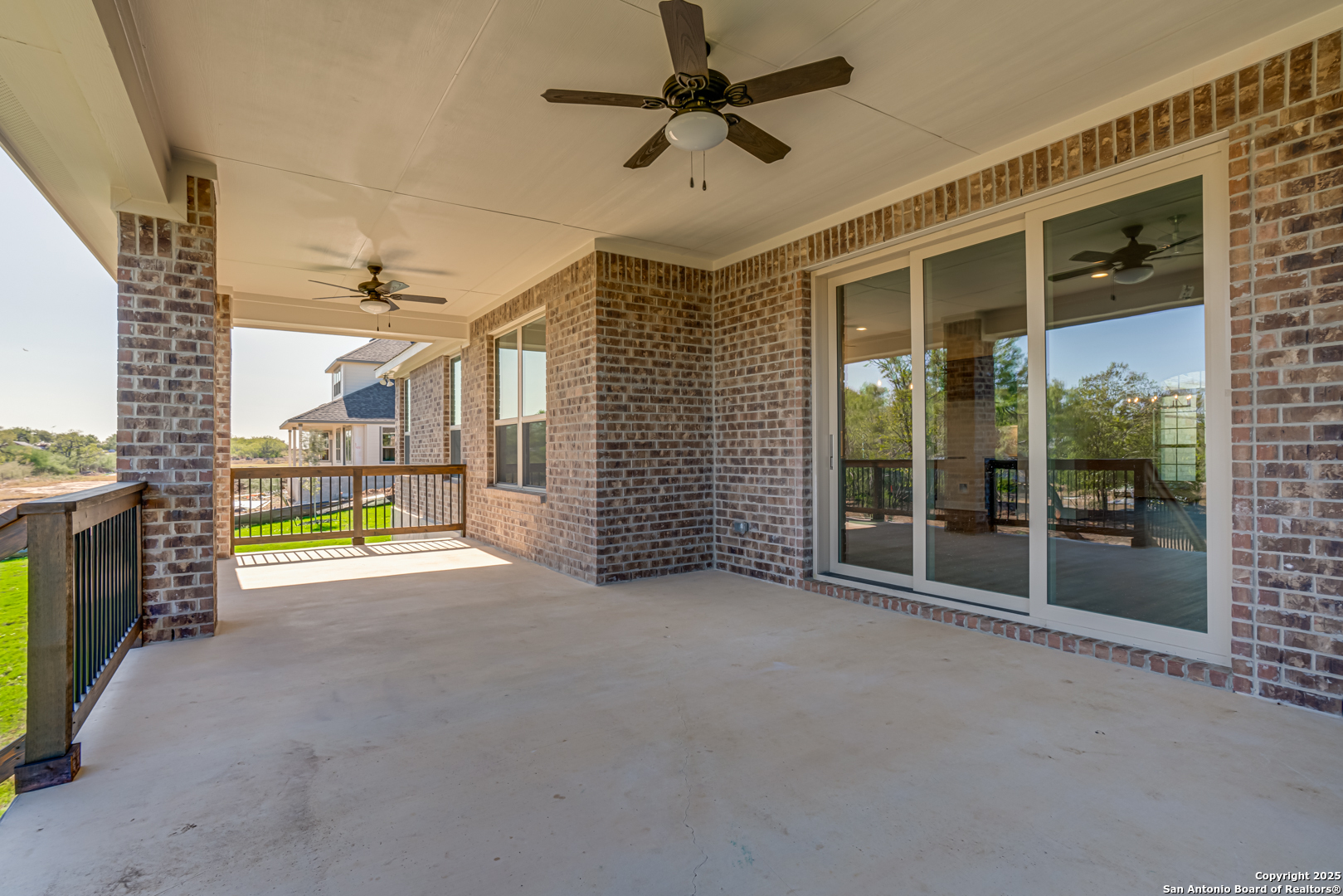 Step into luxury with this exceptional new construction by Empire Communities, where elegant design meets everyday convenience. From the moment you walk in, expansive triple sliding glass doors frame tranquil wooded views and lead to an extended covered patio-complete with an outdoor fireplace and kitchen-perfect for year-round entertaining. Set on a generous .58-acre lot, this thoughtfully designed open-concept home features soaring ceilings that create a sense of space and light throughout. A built-in office nook and a private study offer flexible options for working from home or quiet retreats. The primary suite is a true sanctuary, highlighted by a coffered ceiling, a charming bay window, and double doors that open into a spa-like en-suite bath. Enjoy dual vanities, an oversized walk-in shower, and a spacious walk-in closet designed for comfort and ease. Each bedroom is thoughtfully equipped with ceiling fans to enhance comfort year-round, adding both style and function to every personal space. Designed with the modern homeowner in mind, this property includes a Smart Home package featuring a video doorbell, Z-Wave Smart Hub, touchscreen security panel, WiFi-enabled thermostat, four USB charging ports, and a Kwikset smart lock-blending convenience with peace of mind. The exterior is equally impressive, with professionally installed sod and irrigation in the front, sides, and partially in the backyard-all controlled by a Smart Irrigation system for low-maintenance living.
