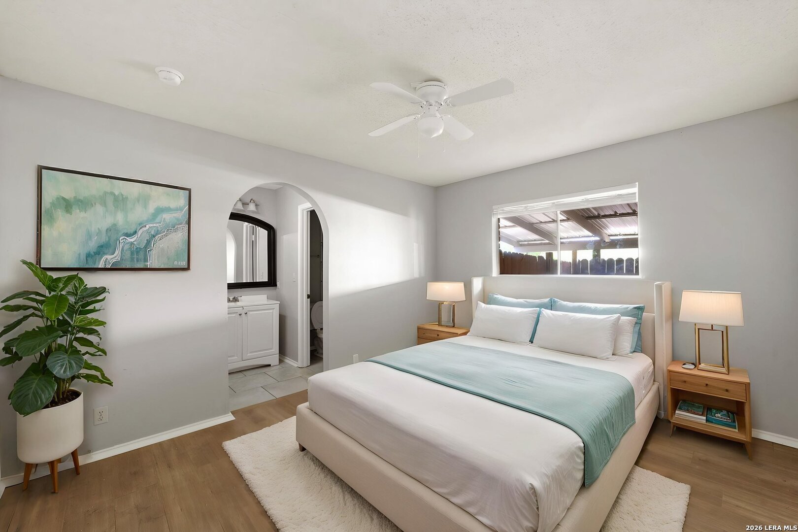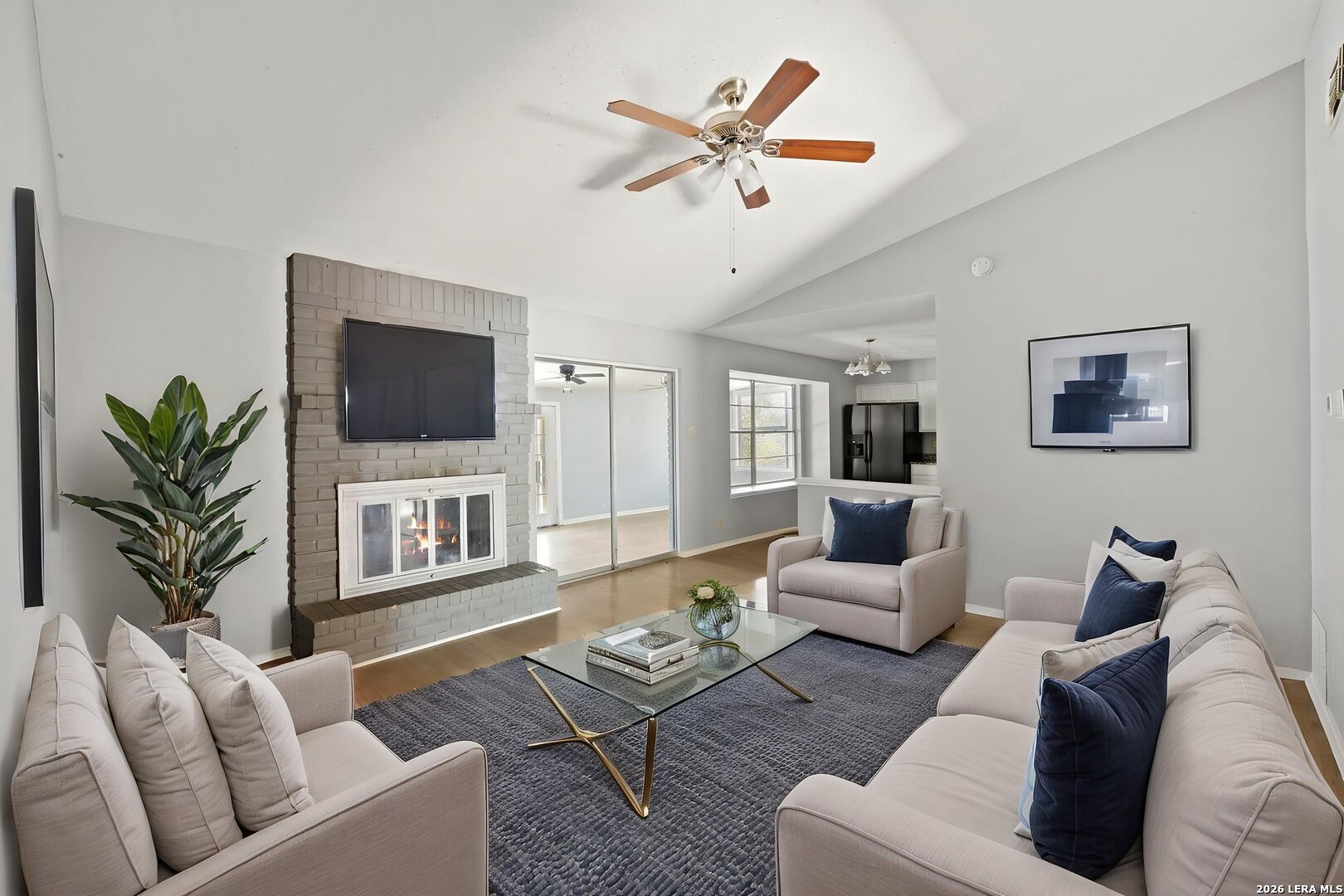 Beautifully remodeled single-story home featuring 4 bedrooms and 2 bathrooms. The spacious living room showcases vaulted ceilings and a striking floor-to-ceiling brick fireplace, while durable flooring throughout means no carpet for easy maintenance. The open kitchen overlooks the living and dining areas and offers granite countertops and stainless steel appliances. The primary suite features an arched entry to a private ensuite bath and a large walk-in closet. A bright sunroom provides the perfect space to relax, and the large fenced backyard includes a covered patio ideal for entertaining, plus a storage shed. Conveniently located near a community park and pool-with no HOA-and all schools within a mile. This move-in-ready home combines modern updates, functional space, and a prime location.