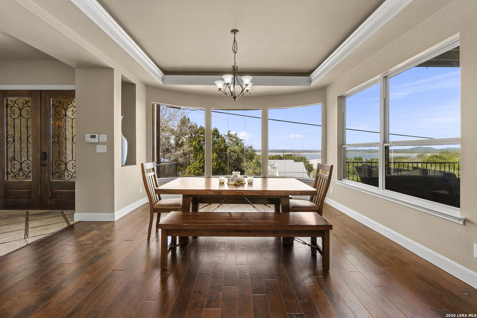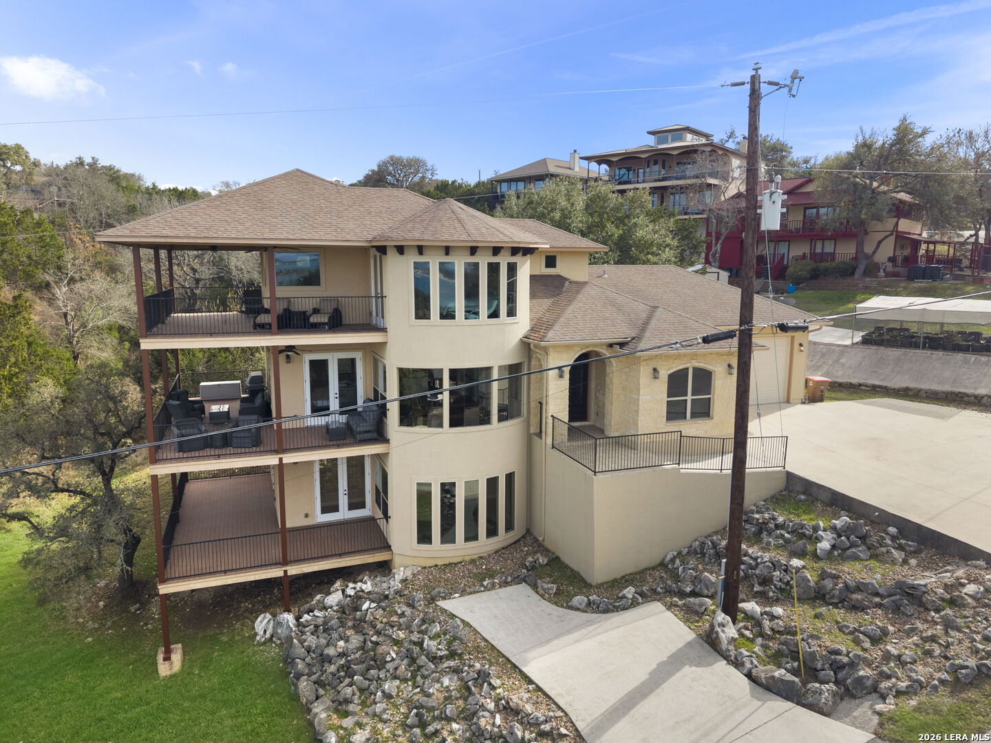 With a million dollar view as its focal point, 502 Cindy Dr is a .62 acre property delivers the lake lifestyle without compromise. Luxury finishes, a flexible multi level layout and turnkey furnishings create a rare offering on Canyon Lake for you to make this your dream lake house retreat or short term rental money maker! Airbnb short term rental is allowed by the HOA. You wait, you miss out! The fully furnished residence features 4 bedrooms and 3 full baths across 3,170 sqft. Highlighted by an open concept main level with living, dining and kitchen together for easy entertaining. Picturesque bay windows in the dining room give you an amazing view of the lake. Granite countertops and a huge frameless window over looking your backyard full of nature and no neighbors. Gas cooking is provided to the kitchen and outdoor grill by the propane tank located in the backyard. You'll also find a guest bedroom, full bath, office nook and laundry room on the main level. The third floor owner's suite is a private haven with a covered wraparound balcony, a wet bar, a spa bath with an expansive walk in shower with two shower heads, a soaking tub and a huge custom closet. The primary bedroom has the same bay windows as the dining room giving you even more beautiful views of the lake right from your bed. The lower level adds two bedrooms connected by a Jack and Jill bath and a secondary living room / game room. One bedroom opens through glass doors to another covered wraparound balcony. 3 covered wraparound balconies in total. All weather resistant, create multiple outdoor living zones focused on a sweeping Canyon Lake panorama view. A 2 car garage is designed to house a boat and an extra large SUV. Installed in the kitchen sink is an Alkaviva vesta h2 water ionizer that makes alkaline or acidic hydrogen water. Advanced water softener included. The HOA provides a pool, tennis court, clubhouse and a boat ramp 6 minutes away.