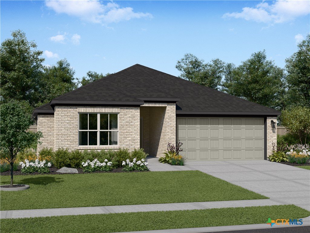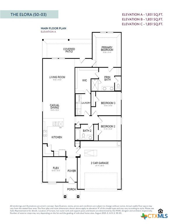 The Elora floorplan is a beautifully crafted single-story home offering 1,851 square feet of flexible, modern living. This three-bedroom, two-bath layout features a bright open-concept living room and casual dining area that seamlessly flow into a designer kitchen, complete with a large island and walk-in pantry. A flex room near the front entry provides the perfect space for a home office, gym, or reading nook. The private primary suite is tucked at the rear of the home and includes a large walk-in closet and spa-style bath with dual vanities and a glass-enclosed tiled shower. Two secondary bedrooms are thoughtfully placed near a full bath, making this layout ideal for families or guests. The covered patio expands the living space outdoors, while a spacious laundry room and two-car garage add daily convenience. Premium finishes like quartz countertops, shaker cabinetry, and Moen chrome fixtures complement energy-saving upgrades such as a tankless water heater, radiant barrier decking, and a SEER 2 Lennox HVAC system