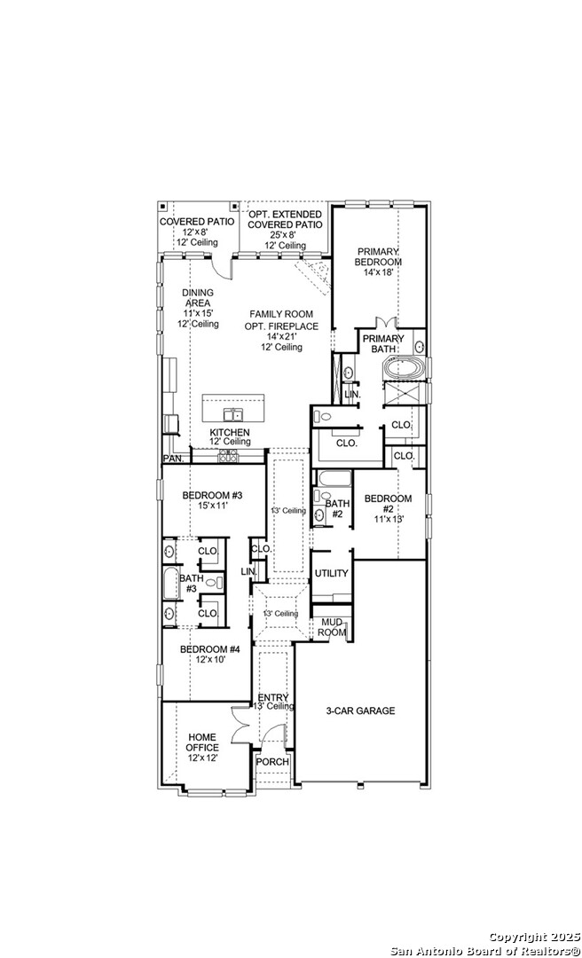 Welcoming porch extends to entry with home office at entry. Open family room with 12-foot ceiling and a large wall of windows. Dining area offers generous natural lighting with wall of windows. Island kitchen with built-in seating space and a corner walk-in pantry. Private primary suite features bedroom, double door entry to primary bathroom, dual vanities, garden tub, separate glass enclosed shower and two walk-in closets. Secondary bedrooms with walk-in closets, a utility room and a Hollywood bathroom completes this spacious design. Covered backyard patio. Mud room just off the three-car garage.