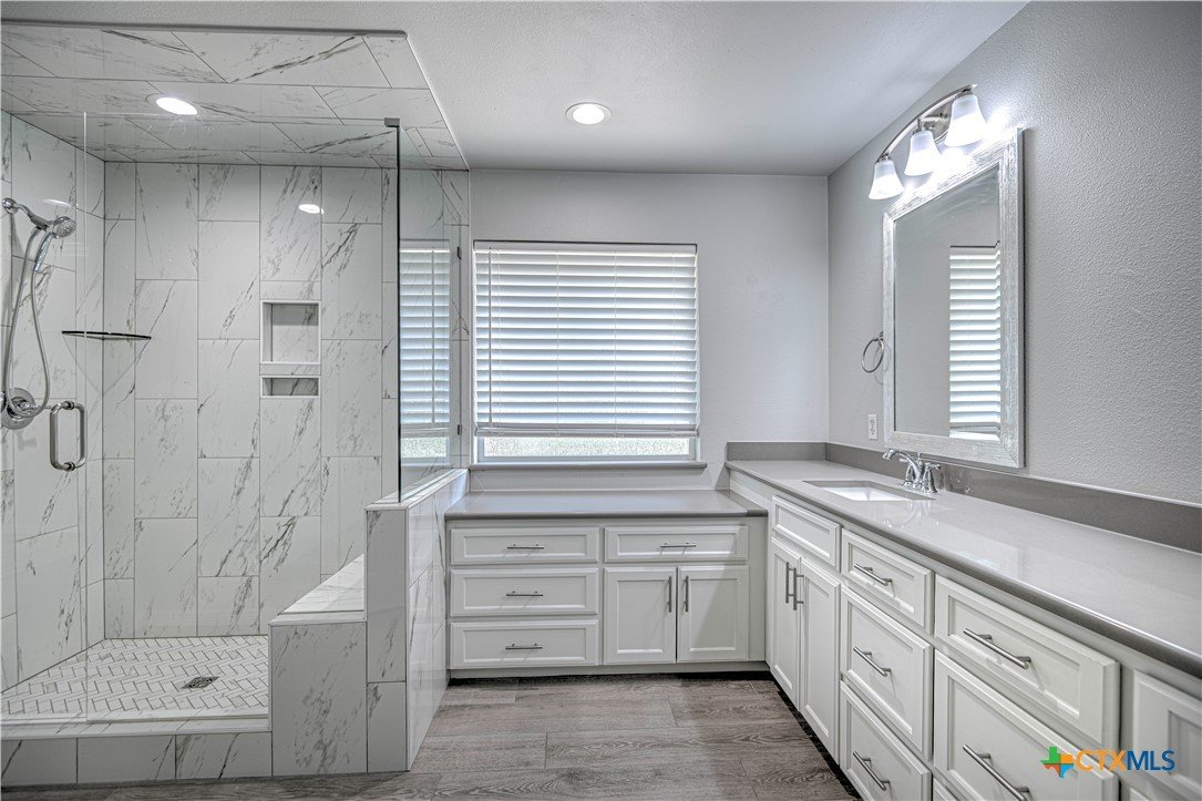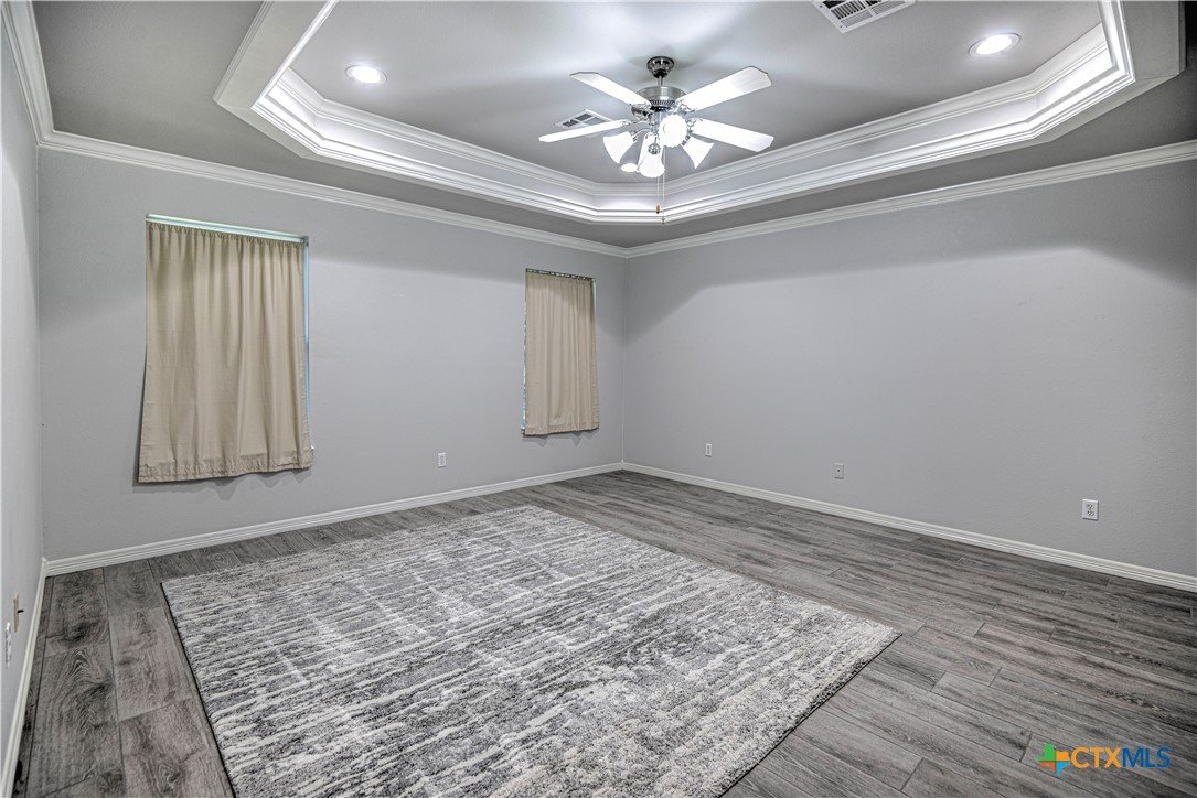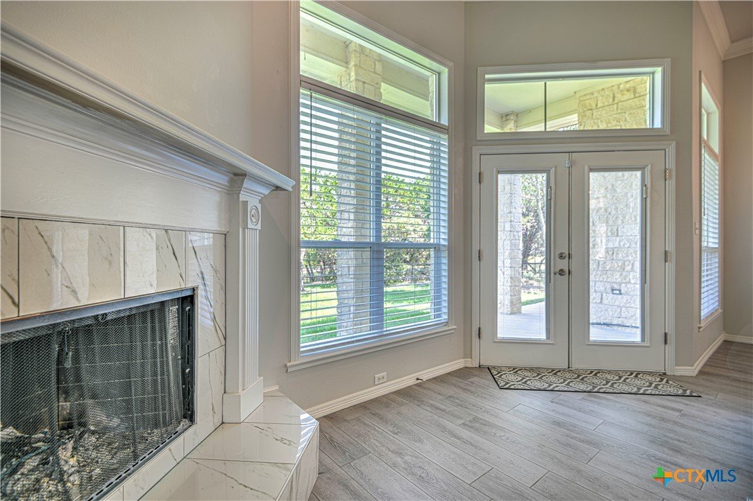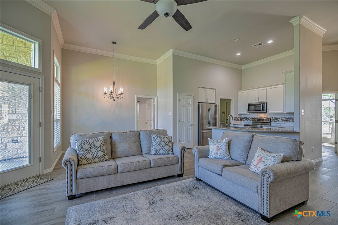 Families want more land to surround their home-well, this property has it! 3/2/2 + office has an extra lot on each side & plenty of space behind the home. Exterior features include stone masonry on 4 sides, trees, shade, newly sodded front yard, landscaping, sprinklers, 2 sheds, separate 15 x 45 concrete picnic area, pipe farm fence in concrete base, extended driveway and plenty of parking. Curb appeal makes you stop and the beautiful arched entrance beckons you inside. You will love this open floor plan with soaring 12+ ft ceilings & lots of transom windows allowing in natural lighting. Private office in front of home; open entry, spacious dining & living areas. Focal fireplace decorated with tile & raised hearth, french doors to backyard oasis. Remodeled kitchen & bathrooms, crown molding & neutral tile flooring throughout most of the house. Kitchen features black farmers sink, Samsung SS appliances (Whirlpool microwave), quartz counter tops, decorative backsplash & lots of white cabinets & pantry providing storage space. Master bedroom has gorgeous raised tray ceiling with decorative crown molding, recessed lights & sliding barn door to ensuite. Large marble shower with bench, quartz counter top with double vanities and extra separate counter top/storage. WI closet, separate water closet. Split floor plan has 2 guest rooms with carpet, lighted ceiling fans & remodeled guest bath. Handy laundry room near kitchen. SS refrigerator, washer, dryer & water softener all convey with accepted offer. Covered front & back patios, storm door, solar screens and full gutters. Gated community with a community pool, playground, and a walk to the lake to picnic, kayak, swim, canoe or enjoy any other water sport.