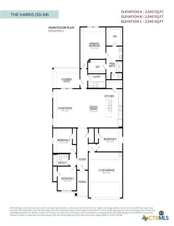 The Harris floorplan is a beautifully designed single-story home offering 2,040 square feet of open, functional living space. With four bedrooms and two full bathrooms, this layout maximizes flow and flexibility for a variety of lifestyles. The heart of the home is a spacious kitchen with a central island and casual dining area that opens into the oversized living room—perfect for gathering or unwinding. The private primary suite includes dual walk-in closets and a spa-inspired bath with a tiled walk-in shower, dual vanities, and premium finishes. A covered patio extends the living space outdoors, while the dedicated laundry room and two-car garage add everyday convenience. Designer finishes like quartz countertops, sleek tile flooring, shaker cabinets, and Moen chrome fixtures come standard . Energy-efficient features such as a tankless water heater, radiant barrier roof decking, and a SEER 2 Lennox; AC system ensure both comfort and cost savings year-round.