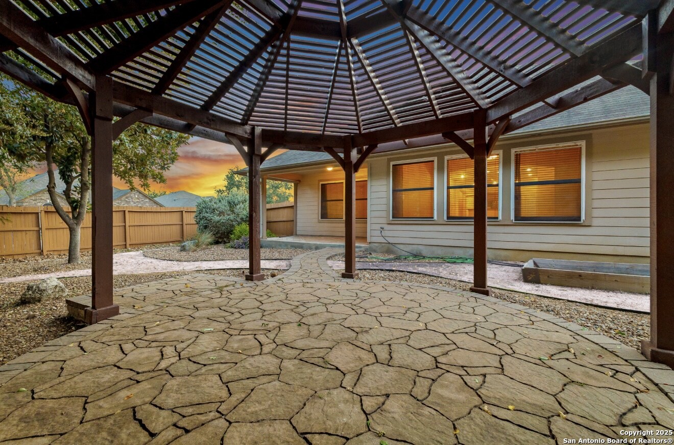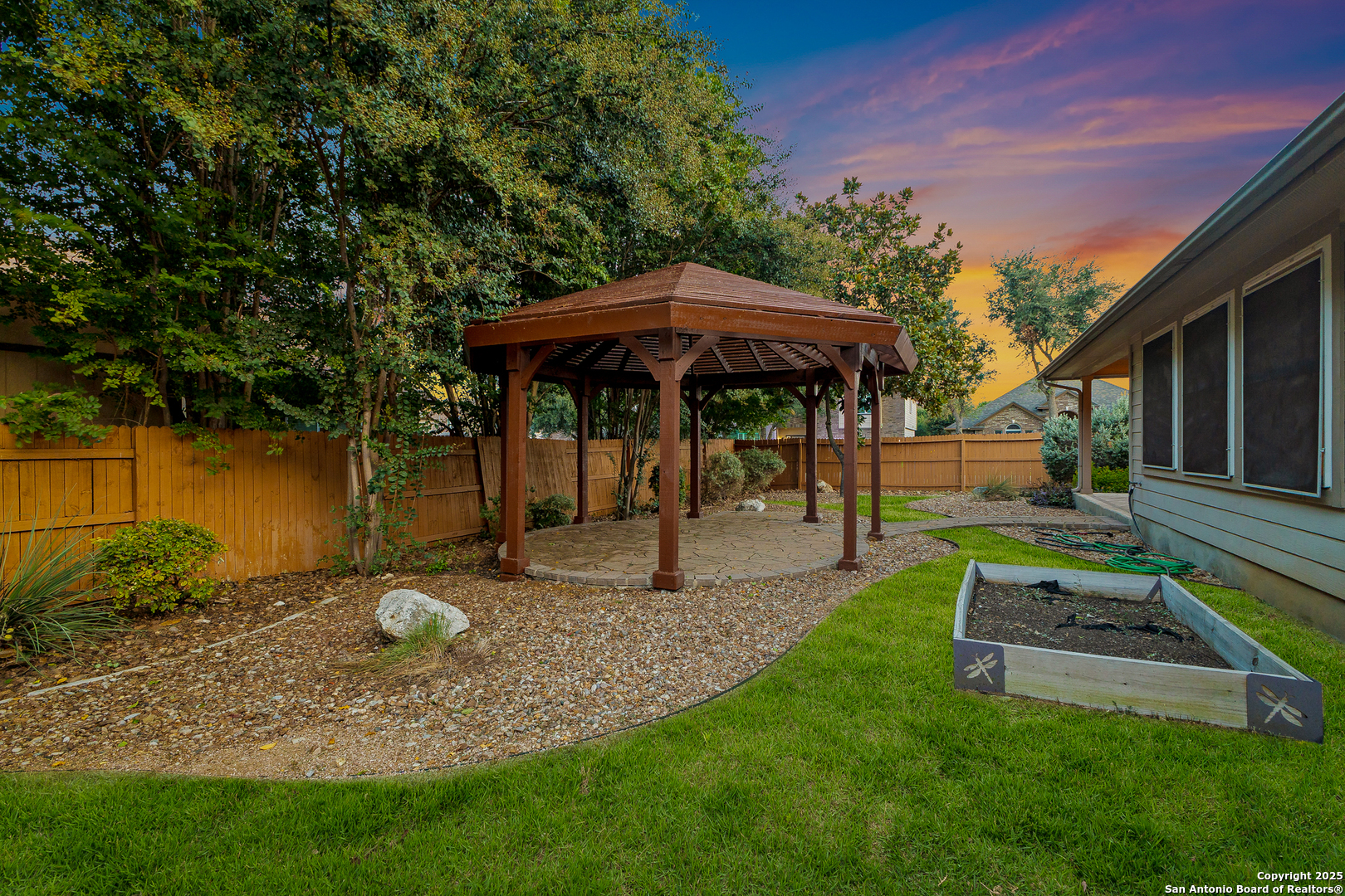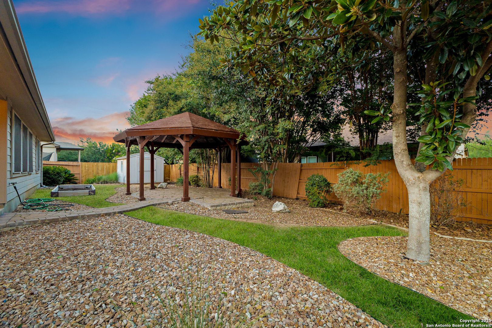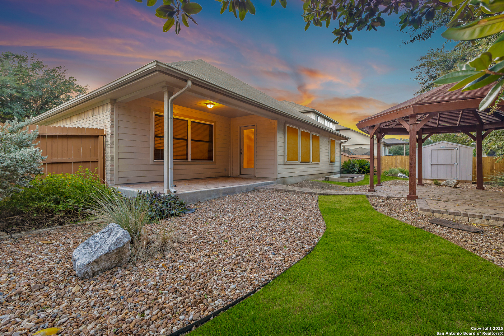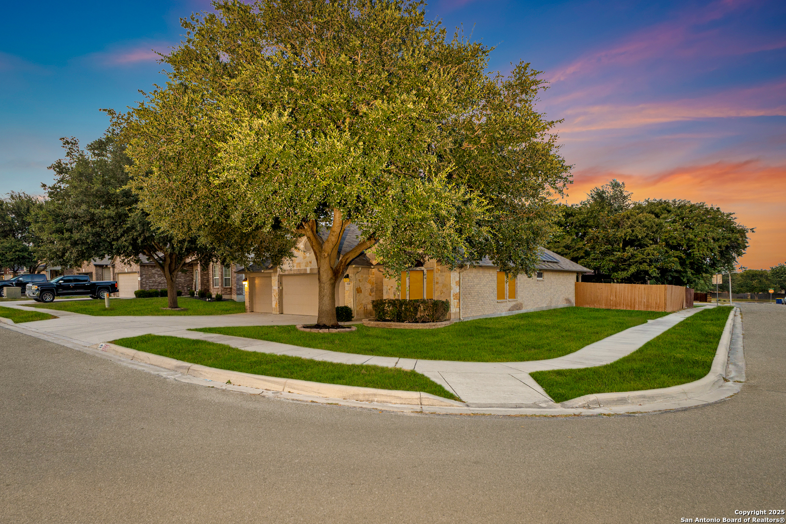 ** NEW ROOF coming soon - ready for new buyer to choose the color!! ** Welcome to this spacious and thoughtfully designed 3-bedroom, 2-bath home with a 3-car garage in the heart of Cibolo! Offering 2,229 sq. ft. of comfort, this 2008 build combines functionality with style-and includes the added benefit of paid-off solar panels for energy efficiency and savings. At the front of the home, a dedicated office makes working from home a breeze-perfect for client visits or simply enjoying the peaceful views of nature. Just off the entry, the formal dining space flows seamlessly into the oversized kitchen with abundant cabinetry, stainless steel appliances, and generous counter space. Designed for entertaining, the open concept offers clear sight lines from kitchen to dining to the expansive living room. The split-bedroom layout ensures privacy and comfort, with only the office and two secondary bedrooms featuring carpet. The rest of the home is finished in attractive laminate wood flooring for style and easy maintenance. Step outside to a xeriscaped backyard (with the option to add sod pathways, as shown in photos) featuring a stunning magnolia tree, covered patio, charming gazebo, and additional landscaping for year-round enjoyment. This corner-lot property sits at the curve of a quiet cul-de-sac, providing both privacy and curb appeal. Located in top-rated SCUCISD and just minutes from Randolph Air Force Base, the community also offers amenities including a pool, park, tennis courts, and walking trails. Schedule your showing today! With mature trees, low-maintenance landscaping, paid-off solar panels, and a flexible floorplan, this home is ideal for families, multi-generational living, or anyone who loves to entertain.