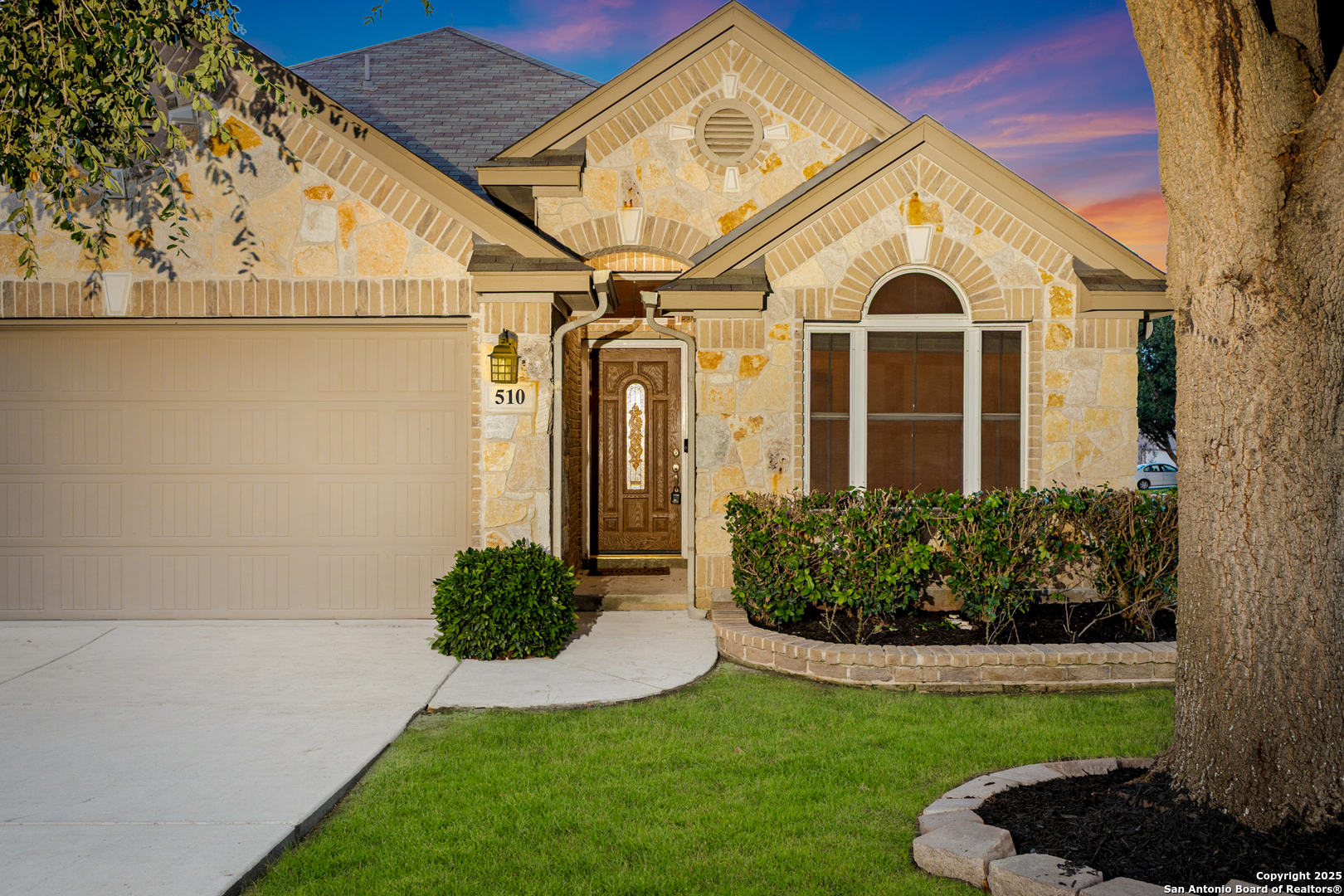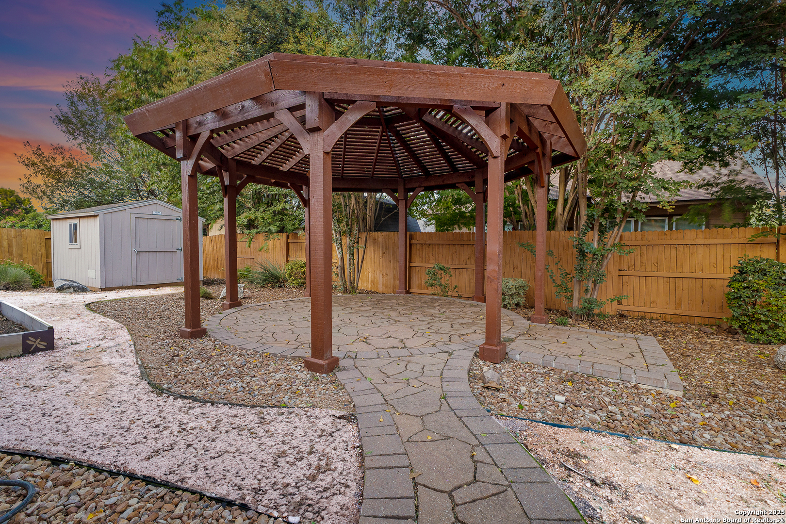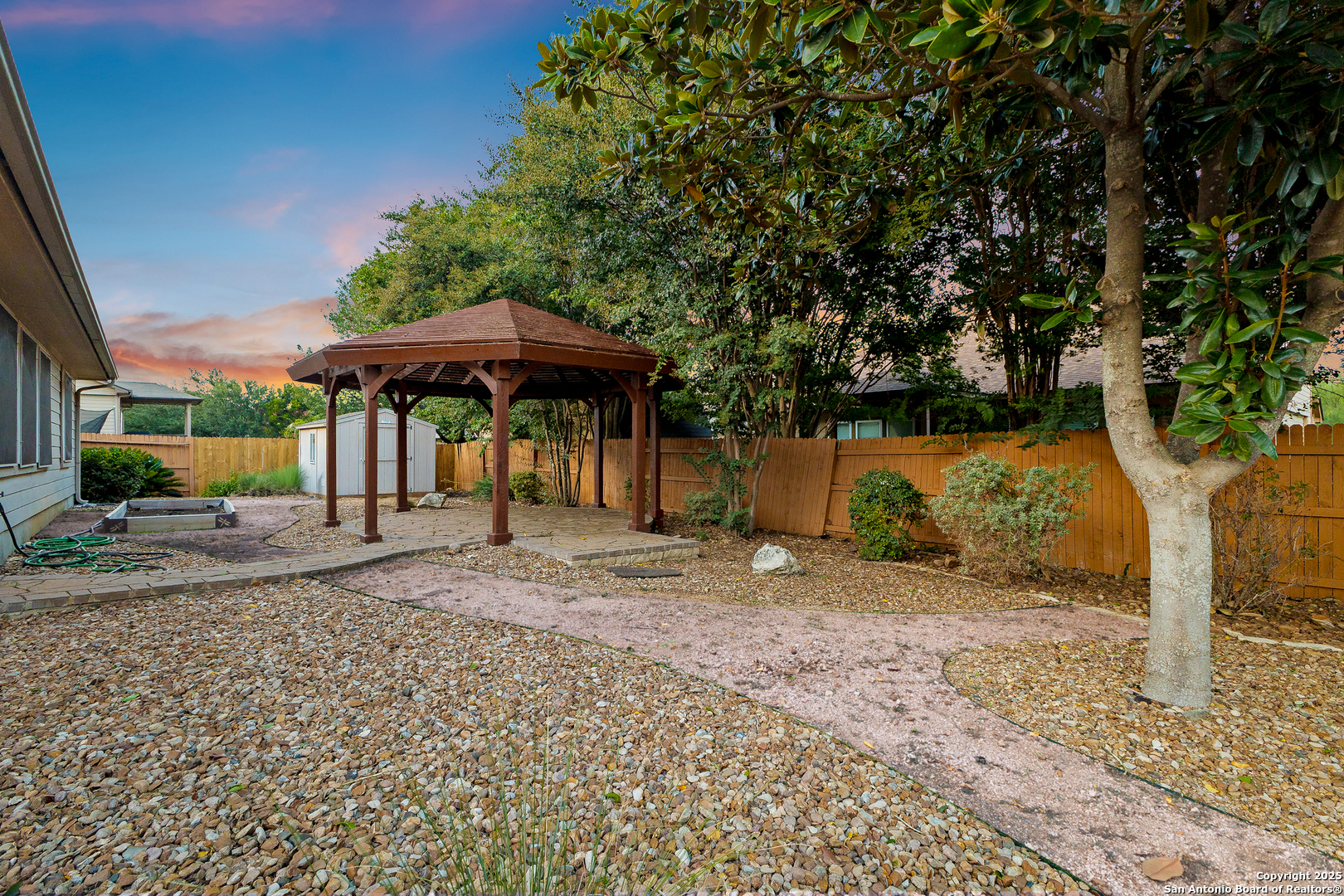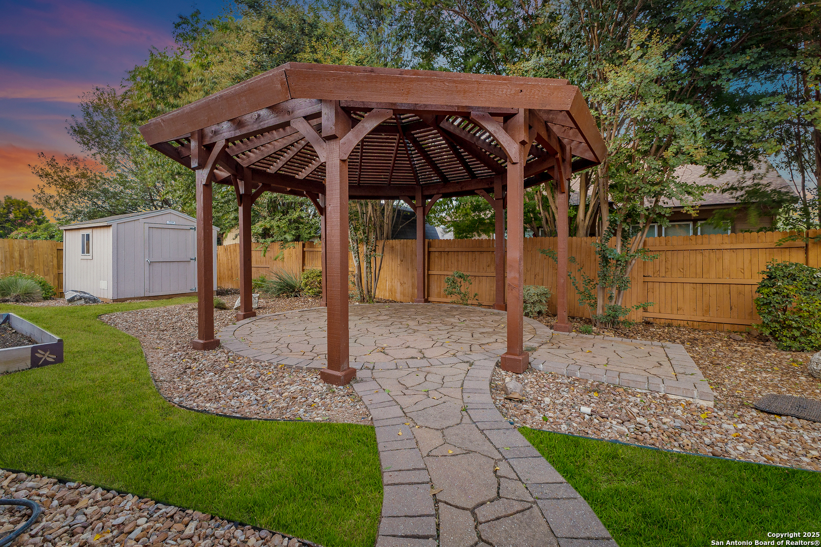 ** NEW ROOF coming soon - ready for new buyer to choose the color!! ** Welcome to this spacious and thoughtfully designed 3-bedroom, 2-bath home with a 3-car garage in the heart of Cibolo! Offering 2,229 sq. ft. of comfort, this 2008 build combines functionality with style-and includes the added benefit of paid-off solar panels for energy efficiency and savings. At the front of the home, a dedicated office makes working from home a breeze-perfect for client visits or simply enjoying the peaceful views of nature. Just off the entry, the formal dining space flows seamlessly into the oversized kitchen with abundant cabinetry, stainless steel appliances, and generous counter space. Designed for entertaining, the open concept offers clear sight lines from kitchen to dining to the expansive living room. The split-bedroom layout ensures privacy and comfort, with only the office and two secondary bedrooms featuring carpet. The rest of the home is finished in attractive laminate wood flooring for style and easy maintenance. Step outside to a xeriscaped backyard (with the option to add sod pathways, as shown in photos) featuring a stunning magnolia tree, covered patio, charming gazebo, and additional landscaping for year-round enjoyment. This corner-lot property sits at the curve of a quiet cul-de-sac, providing both privacy and curb appeal. Located in top-rated SCUCISD and just minutes from Randolph Air Force Base, the community also offers amenities including a pool, park, tennis courts, and walking trails. Schedule your showing today! With mature trees, low-maintenance landscaping, paid-off solar panels, and a flexible floorplan, this home is ideal for families, multi-generational living, or anyone who loves to entertain.