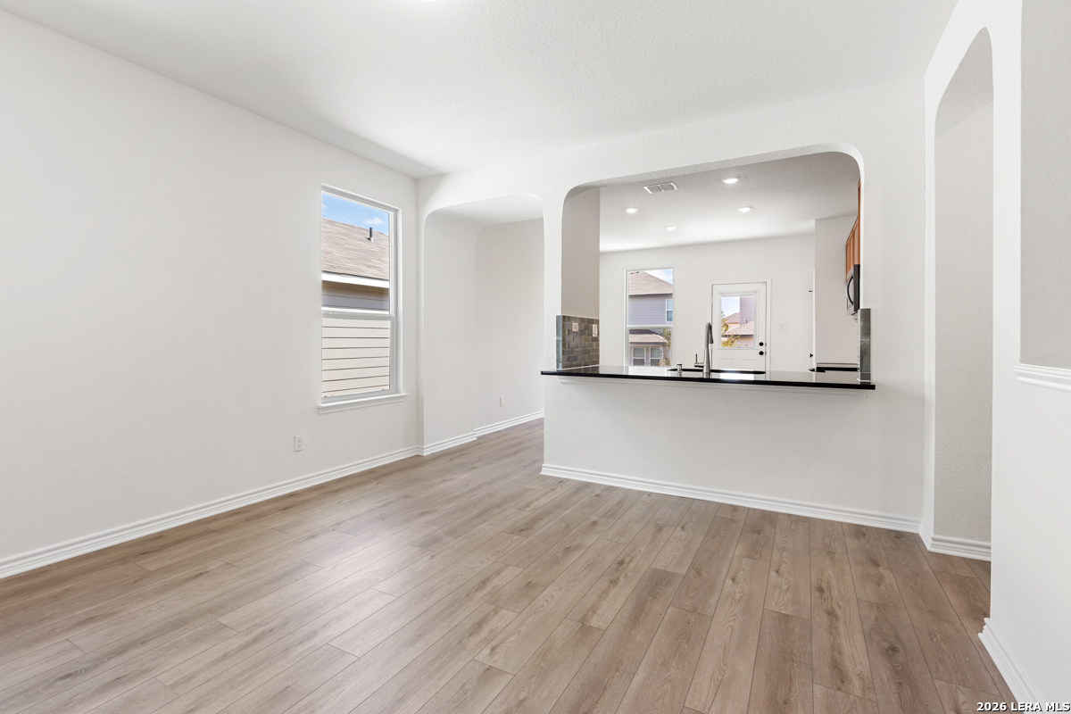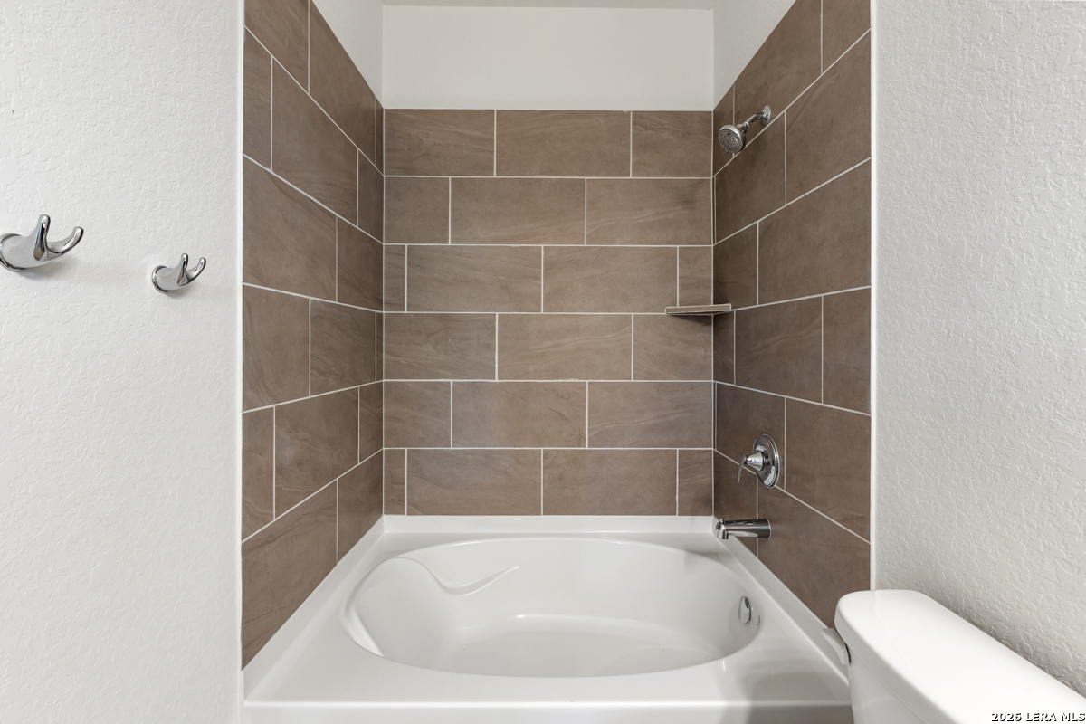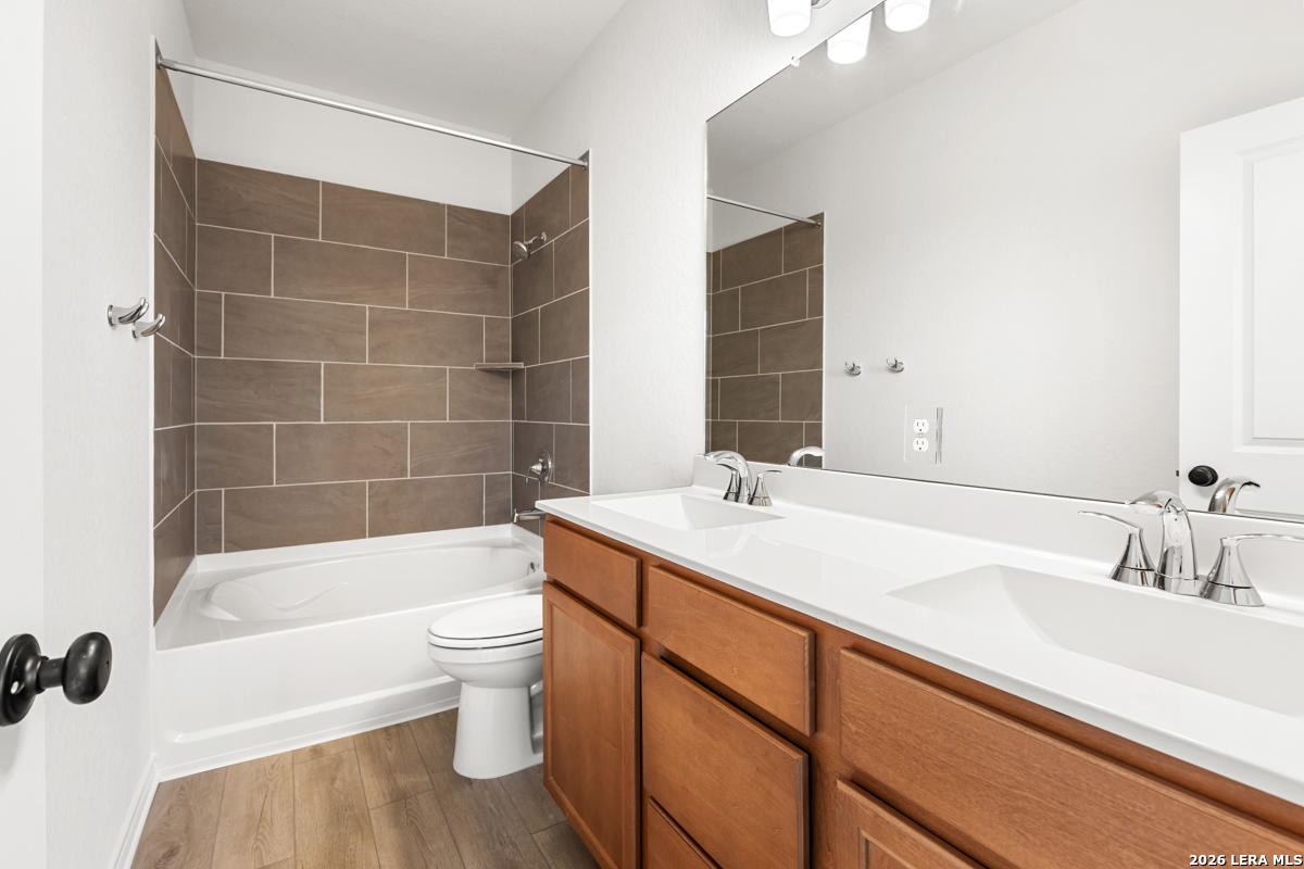 This beautifully designed home features 9-foot ceilings on the first floor, creating an open and inviting atmosphere. The kitchen is equipped with Whirlpool stainless steel appliances, Woodmont Cody 42-inch upper cabinets, a stylish Daltile tile backsplash, an extended breakfast bar, and granite countertops in Uba Tuba. The primary bath offers a raised vanity, upgraded cabinetry, and a 42-inch garden tub/shower with a Daltile tile surround. Decorative touches include a Monterey-style entry door, Kwikset Ladera interior door hardware, and vinyl plank flooring throughout the bathrooms, kitchen, and living room. Additional highlights include a wireless security system, an automatic sprinkler system, and a fully sodded yard, perfect for easy maintenance and outdoor enjoyment.