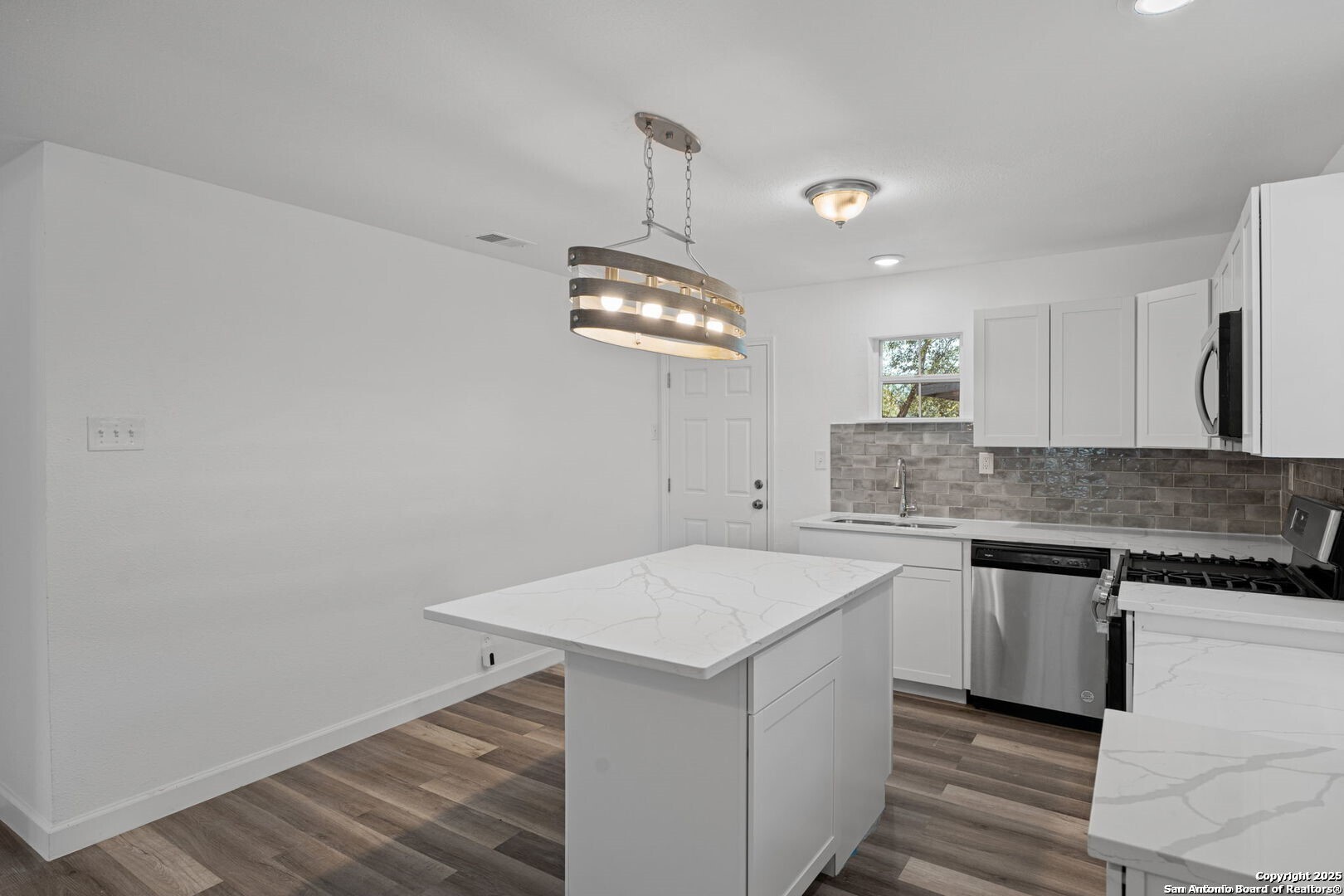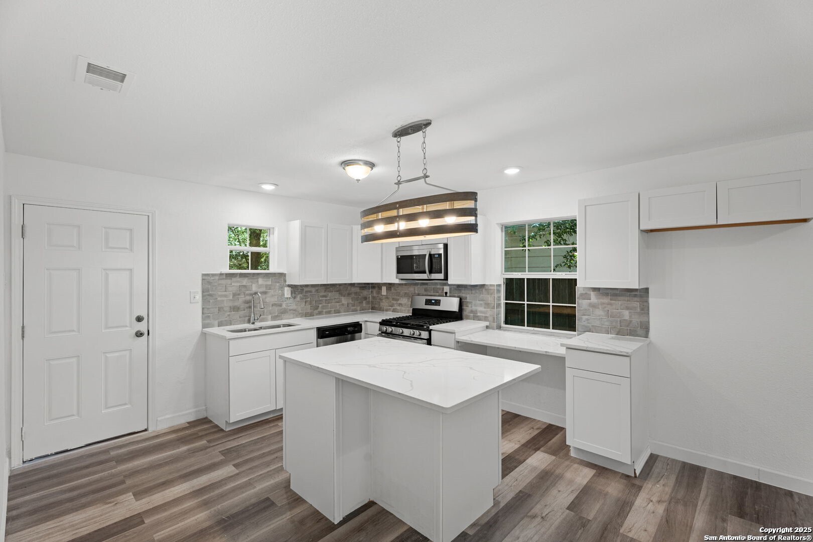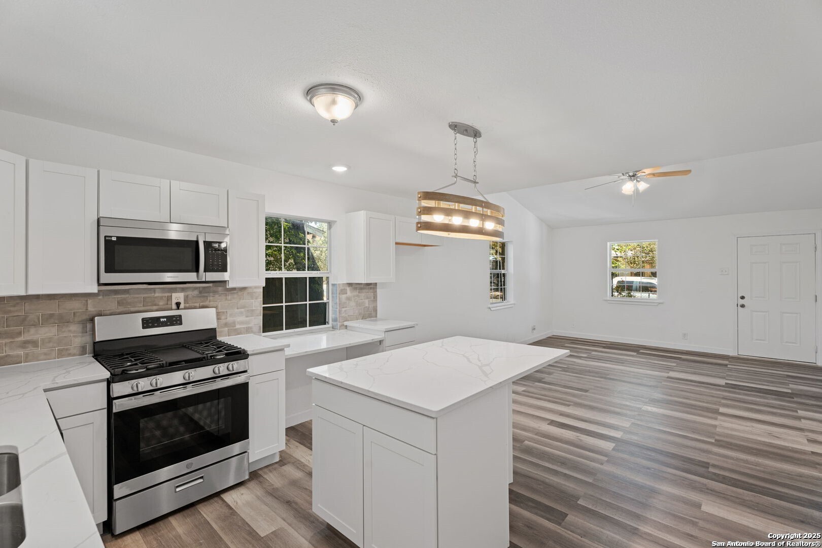 Completely Updated and Move-In Ready! This beautifully remodeled home features a new roof, new AC, and an open-concept floor plan that's perfect for modern living. Step inside to find high ceilings, brand-new cabinets, quartz countertops, a center island with a breakfast bar, and a gorgeous tile backsplash in the kitchen. The home also includes new waterproof vinyl flooring throughout, new light fixtures and faucets, and stainless steel appliances.