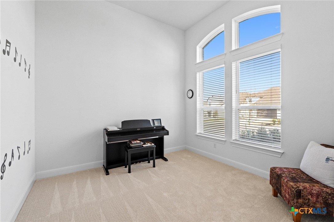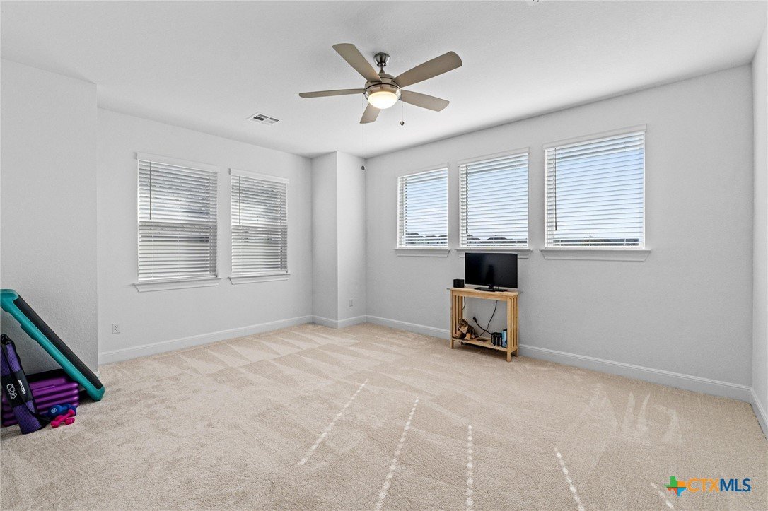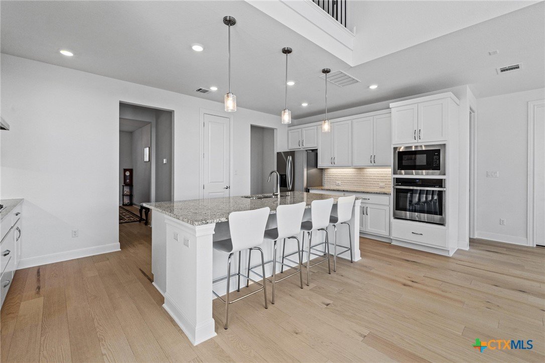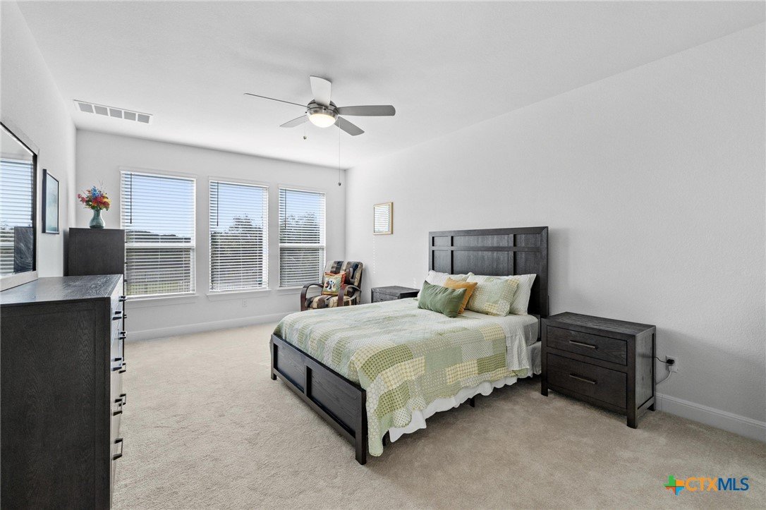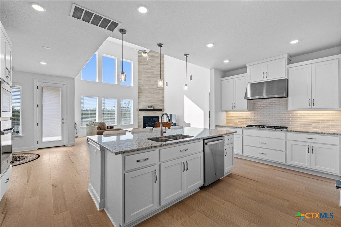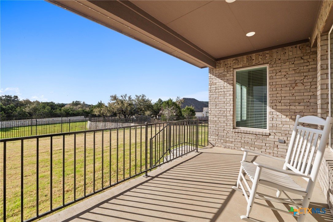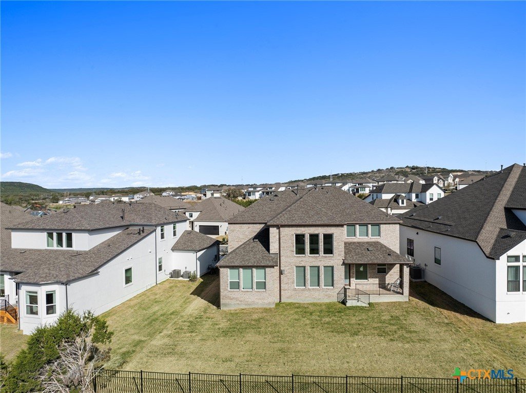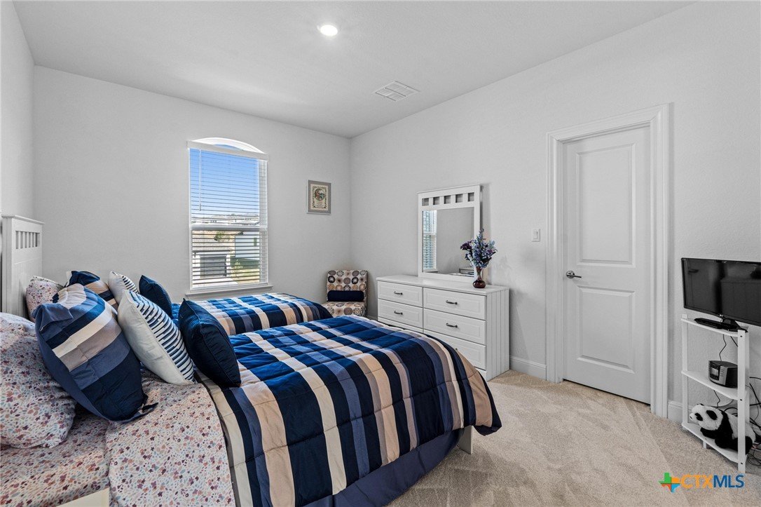 Beautiful home in new Calabria section of Travisso. INCENTIVES 3% of final PURCHASE PRICE applied towards closing costs, rate buydown and/or price reduction. Sapphire open concept floorplan with 5 bedrooms/4.5 baths on NORTH WEST facing GREENBELT LOT. Stately 100% brick home standouts as a distinctive classic. TWO MAIN LEVEL BEDROOMS: Spacious master suite (with 3’x1’ 2'7"construction add on) plus private guest quarters with ensuite bathroom. Perfect for family or parents from abroad visiting for a lengthy stay or friends dropping in for a weekend stay. Front foyer with 19’4” ceiling grandly leads past OFFICE/STUDY (11’4”x11’) with French doors and FORMAL DINING (10.3”x13’11”) directly to the GREAT ROOM. Powder bath with pedestal sink off long foyer. Wrought iron railing on second story showcases GREAT ROOM (18’1”x21’10”) below with tall windows looking out over the greenbelt and hill country beyond. Oodles of natural light coming through tall picture windows plus ~40 recessed can lights makes this a bright and light home. MEDIA ROOM wired for data, sound and projector makes for memorable family movie nights. Large GAME ROOM (16’7”x13’3”) upstairs could be teen get away, playroom, craft room, project central, quiet area for homework, or flex. Granite kitchen island (7’9”x3’8”) with spacious breakfast bar plus CASUAL DINING with access to large covered patio. Huge gourmet kitchen with 5 burner gas cooktop, built-in oven and microwave plus 14’9” linear counter space. Refrigerator (~1+ yr. old) coveys. Second bedroom at top of stairs with ensuite bath offers privacy for college student, resident princess, or favorite child. Loop for water softener in garage. Two HVAC units plus two tankless water heaters. Covered patio is 16’10”x8’3”. Washer and dryer (~1+ yr. old) in laundry room convey. No need to build from scratch, this beauty with a fully transferable warranty and 3% INCENTIVES is ready for move in now!