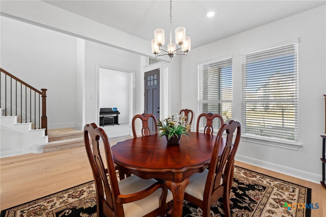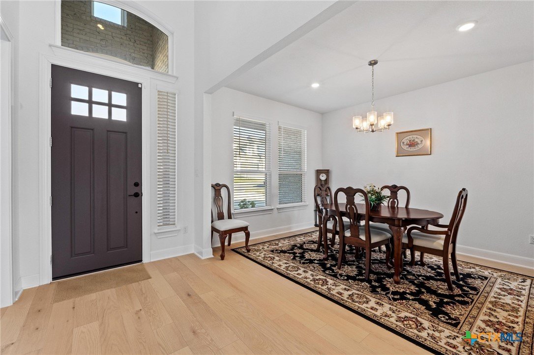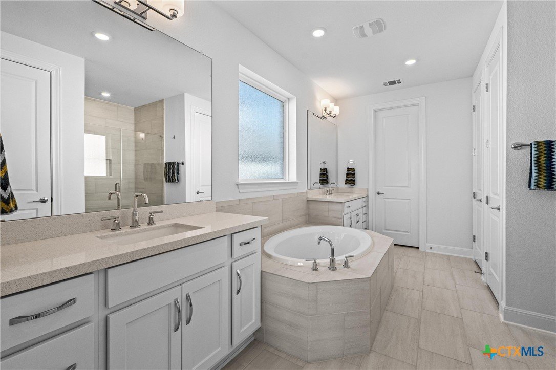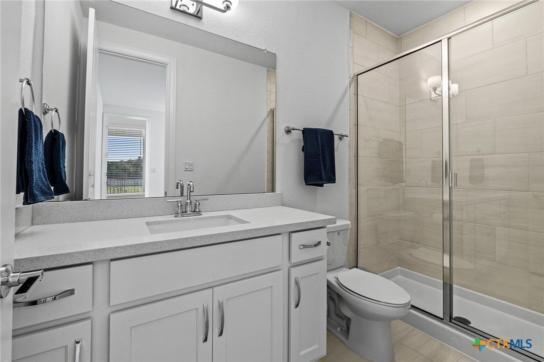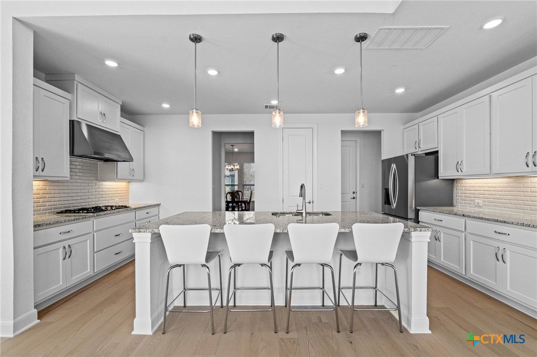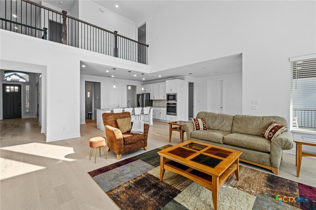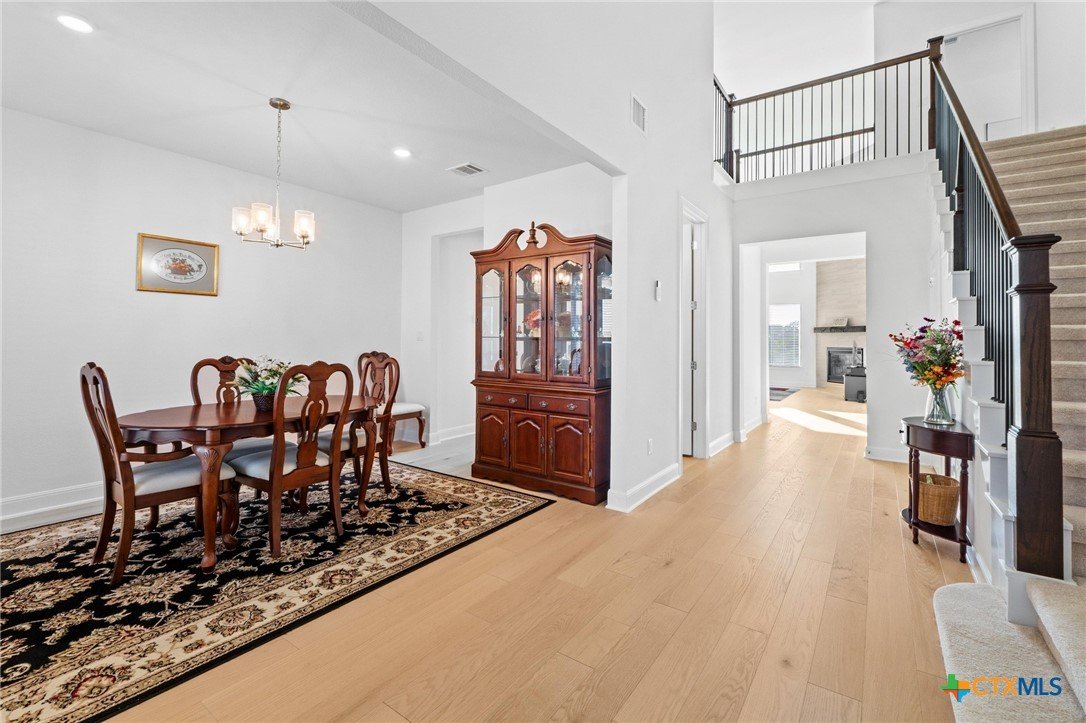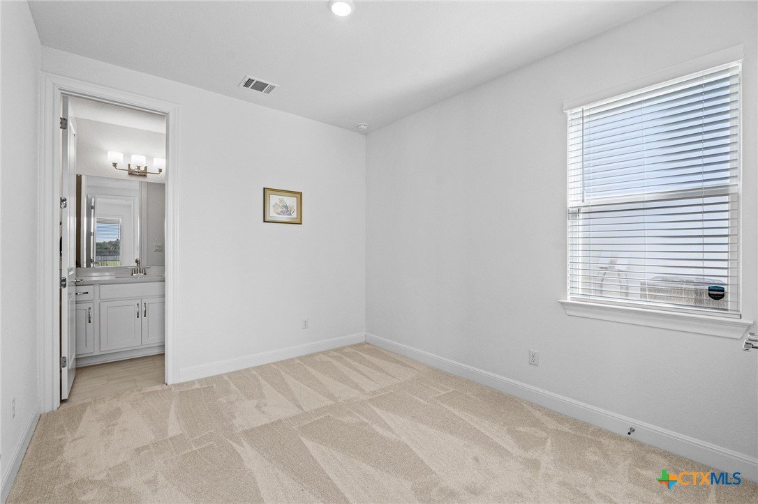 Beautiful home in new Calabria section of Travisso. INCENTIVES 3% of final PURCHASE PRICE applied towards closing costs, rate buydown and/or price reduction. Sapphire open concept floorplan with 5 bedrooms/4.5 baths on NORTH WEST facing GREENBELT LOT. Stately 100% brick home standouts as a distinctive classic. TWO MAIN LEVEL BEDROOMS: Spacious master suite (with 3’x1’ 2'7"construction add on) plus private guest quarters with ensuite bathroom. Perfect for family or parents from abroad visiting for a lengthy stay or friends dropping in for a weekend stay. Front foyer with 19’4” ceiling grandly leads past OFFICE/STUDY (11’4”x11’) with French doors and FORMAL DINING (10.3”x13’11”) directly to the GREAT ROOM. Powder bath with pedestal sink off long foyer. Wrought iron railing on second story showcases GREAT ROOM (18’1”x21’10”) below with tall windows looking out over the greenbelt and hill country beyond. Oodles of natural light coming through tall picture windows plus ~40 recessed can lights makes this a bright and light home. MEDIA ROOM wired for data, sound and projector makes for memorable family movie nights. Large GAME ROOM (16’7”x13’3”) upstairs could be teen get away, playroom, craft room, project central, quiet area for homework, or flex. Granite kitchen island (7’9”x3’8”) with spacious breakfast bar plus CASUAL DINING with access to large covered patio. Huge gourmet kitchen with 5 burner gas cooktop, built-in oven and microwave plus 14’9” linear counter space. Refrigerator (~1+ yr. old) coveys. Second bedroom at top of stairs with ensuite bath offers privacy for college student, resident princess, or favorite child. Loop for water softener in garage. Two HVAC units plus two tankless water heaters. Covered patio is 16’10”x8’3”. Washer and dryer (~1+ yr. old) in laundry room convey. No need to build from scratch, this beauty with a fully transferable warranty and 3% INCENTIVES is ready for move in now!