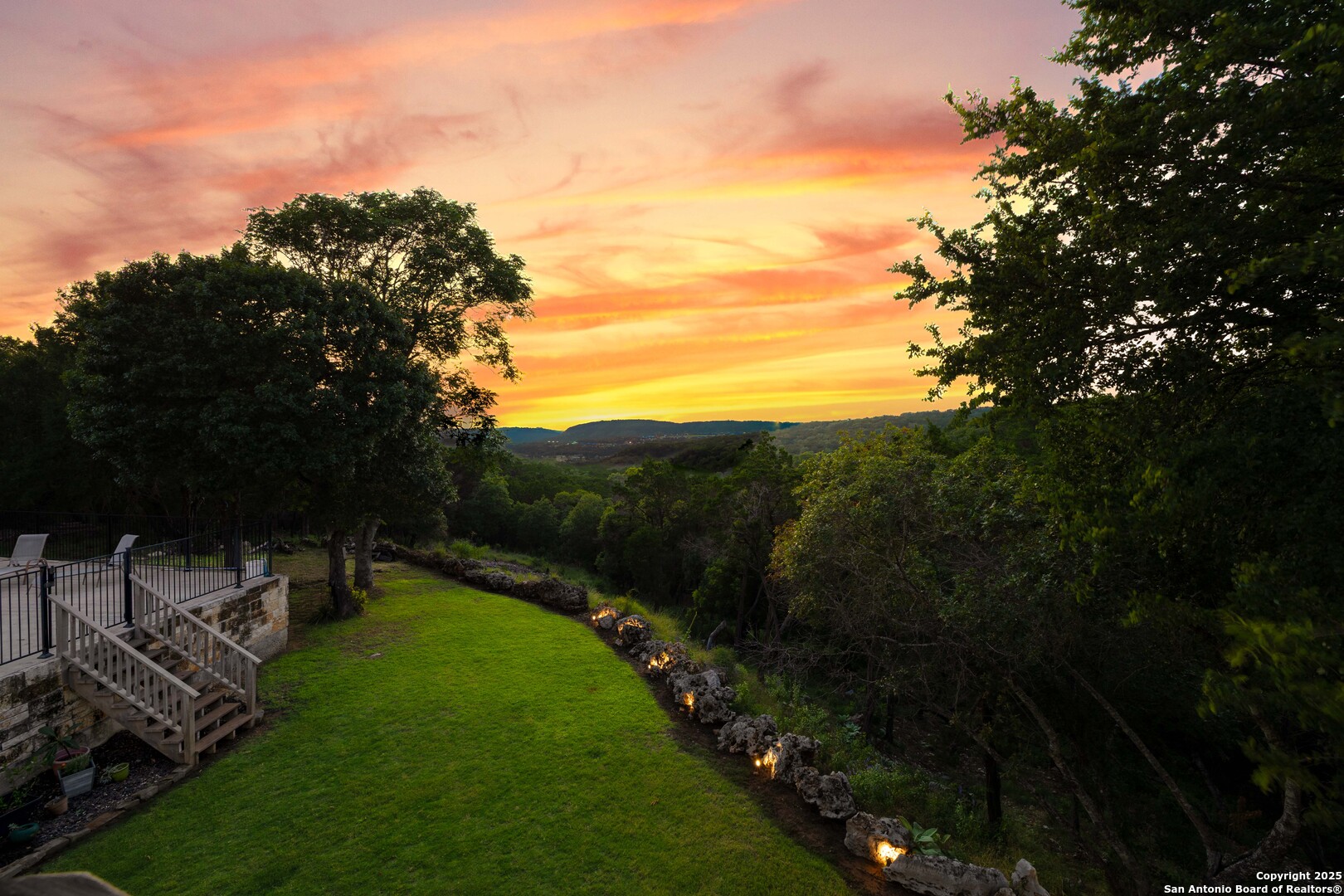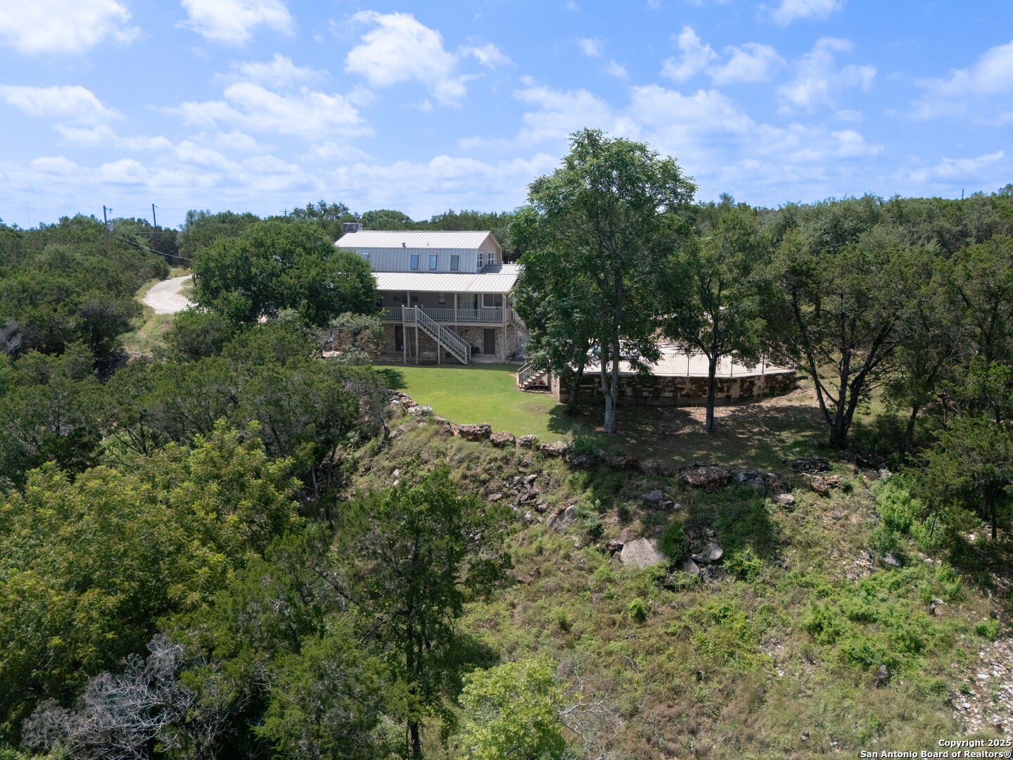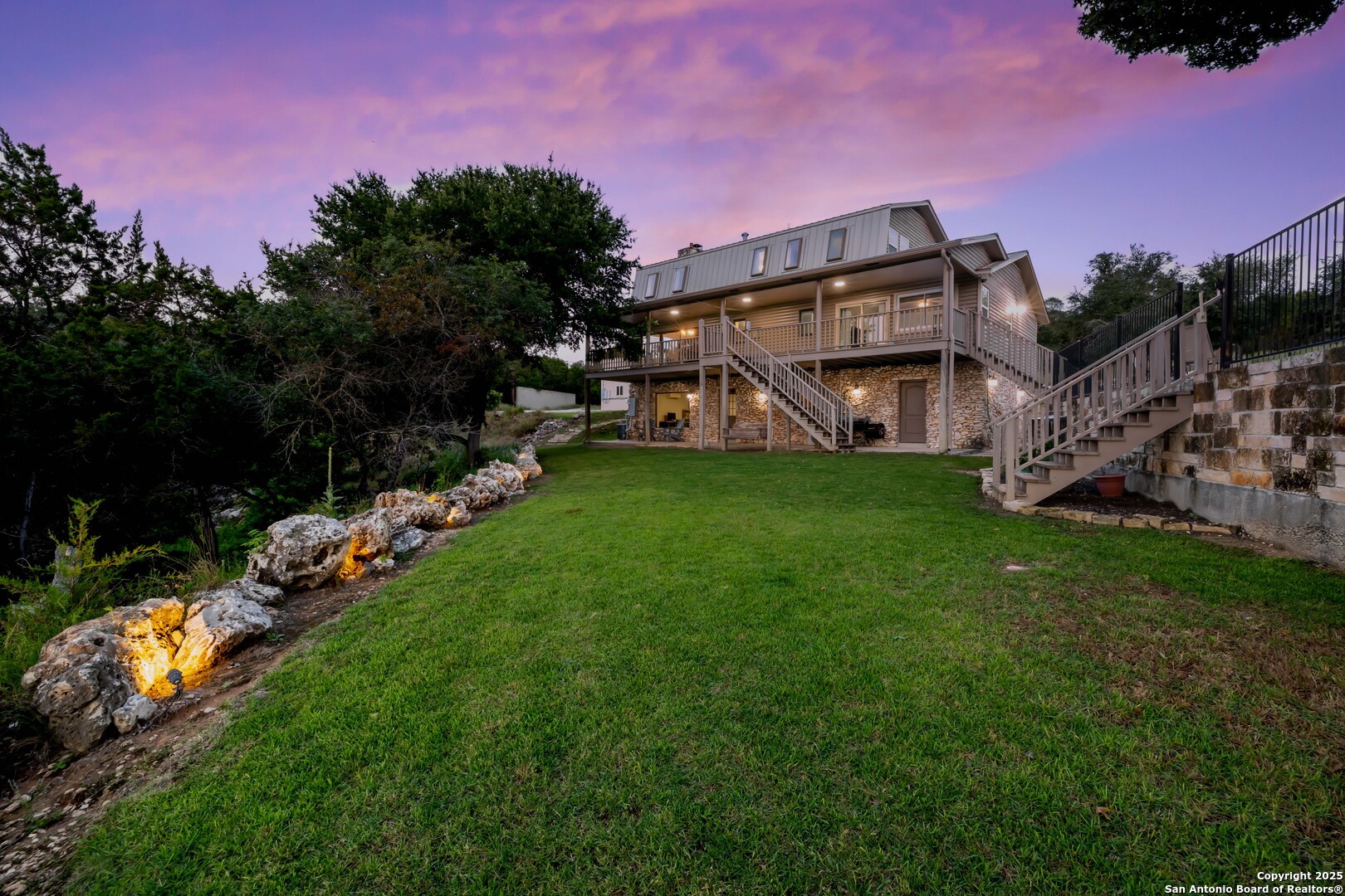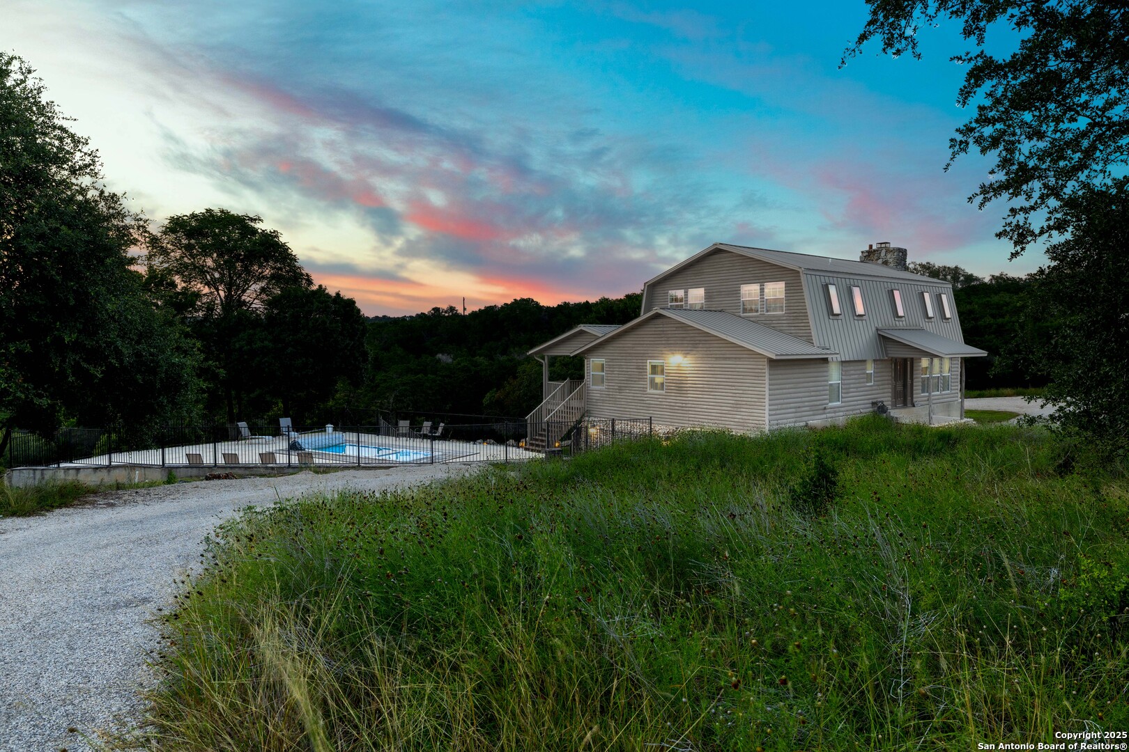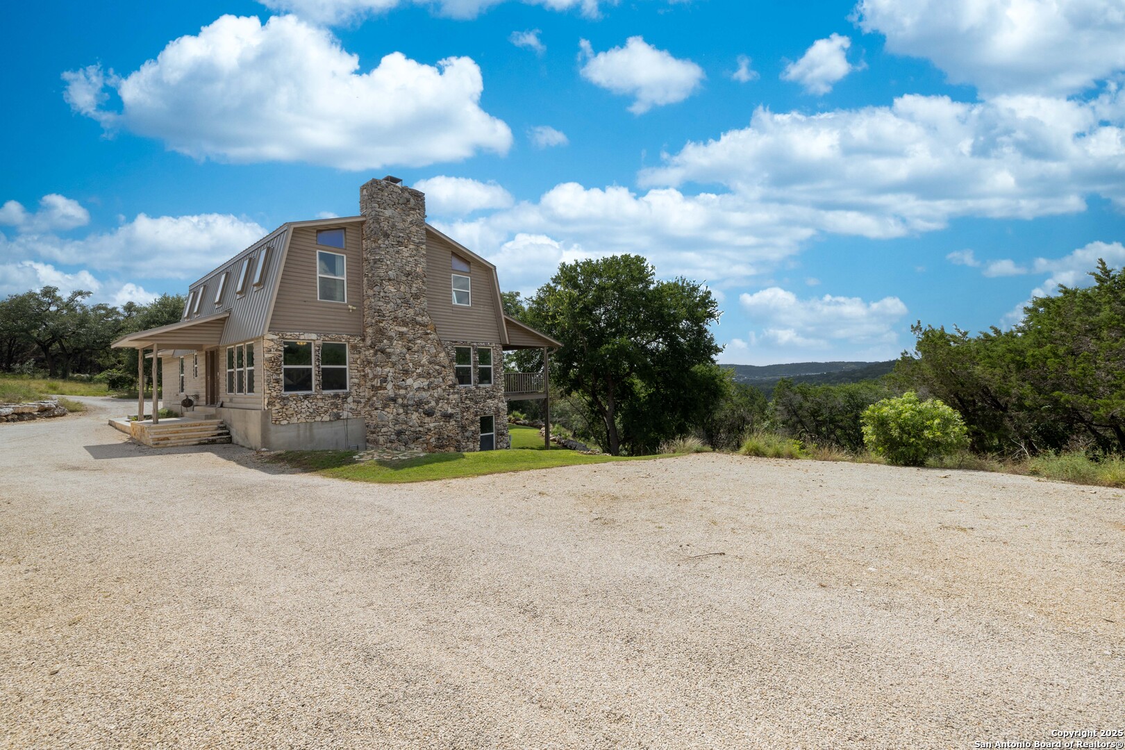 Tucked away in the scenic Eden Ranch community, this versatile Hill Country property offers privacy, flexibility, and incredible views from every level-including golden-hour sunsets that stretch across the horizon. With over 5 acres of native beauty, spacious interiors, and a fully private mother-in-law suite with its own entrance, this home checks all the boxes for multi-generational living, guest accommodations, or rental income potential. The main (mid) level is open and airy, filled with natural light and expansive windows that showcase the hilltop setting. The living, kitchen, and dining area are centered around a charming stone wood-burning fireplace, creating a warm and inviting space. The primary suite is tucked privately on this level and offers peaceful views, direct private access to the outdoors, a spacious layout, walk-in closet, and a luxurious en-suite bath with a walk-in shower featuring both a rain and secondary showerhead. A large laundry room with added storage and a guest half bath complete this level. Upstairs are three additional bedrooms, a full bath with a tub/shower combo, and two generous storage closets-one with floor-to-ceiling shelving, and another offering flex space for hobbies, storage, or a home office. The true gem of this property lies on the lower level: a fully finished, separately accessible mother-in-law suite or private apartment complete with its own entrance. This space features a living/media area, a fully equipped kitchenette with induction stove, sink, and convection microwave with air fry, plus a full bath, built-in cabinetry, and an under-stair storage closet. Whether for extended family, long-term guests, or even STR potential, this space offers privacy, independence, and outstanding versatility. Outdoors, the property is just as impressive. A 60'x40' workshop includes drive-through RV doors, 220V power, a 200amp panel, and RV plug-perfect for business owners, hobbyists, or RV travelers. Additional features include a chicken coop with extended run, a fenced garden, and a 21-foot Catalina Swim Spa with a 2022 End2End cover. A private 1/3-mile walking trail meanders through wildflowers, native grasses, and a seasonal creek, offering peaceful nature right outside your door. With room to roam, live, and host-while enjoying breathtaking Hill Country views-this property is truly one-of-a-kind.