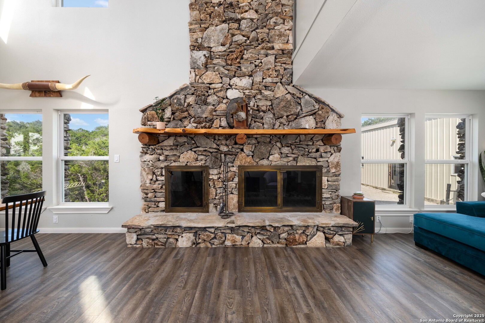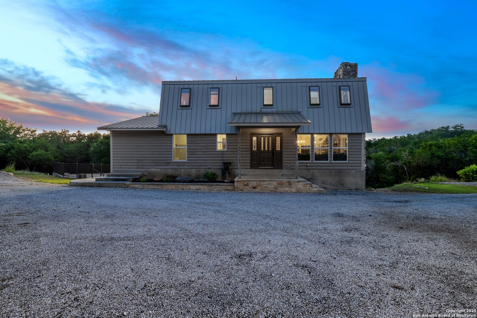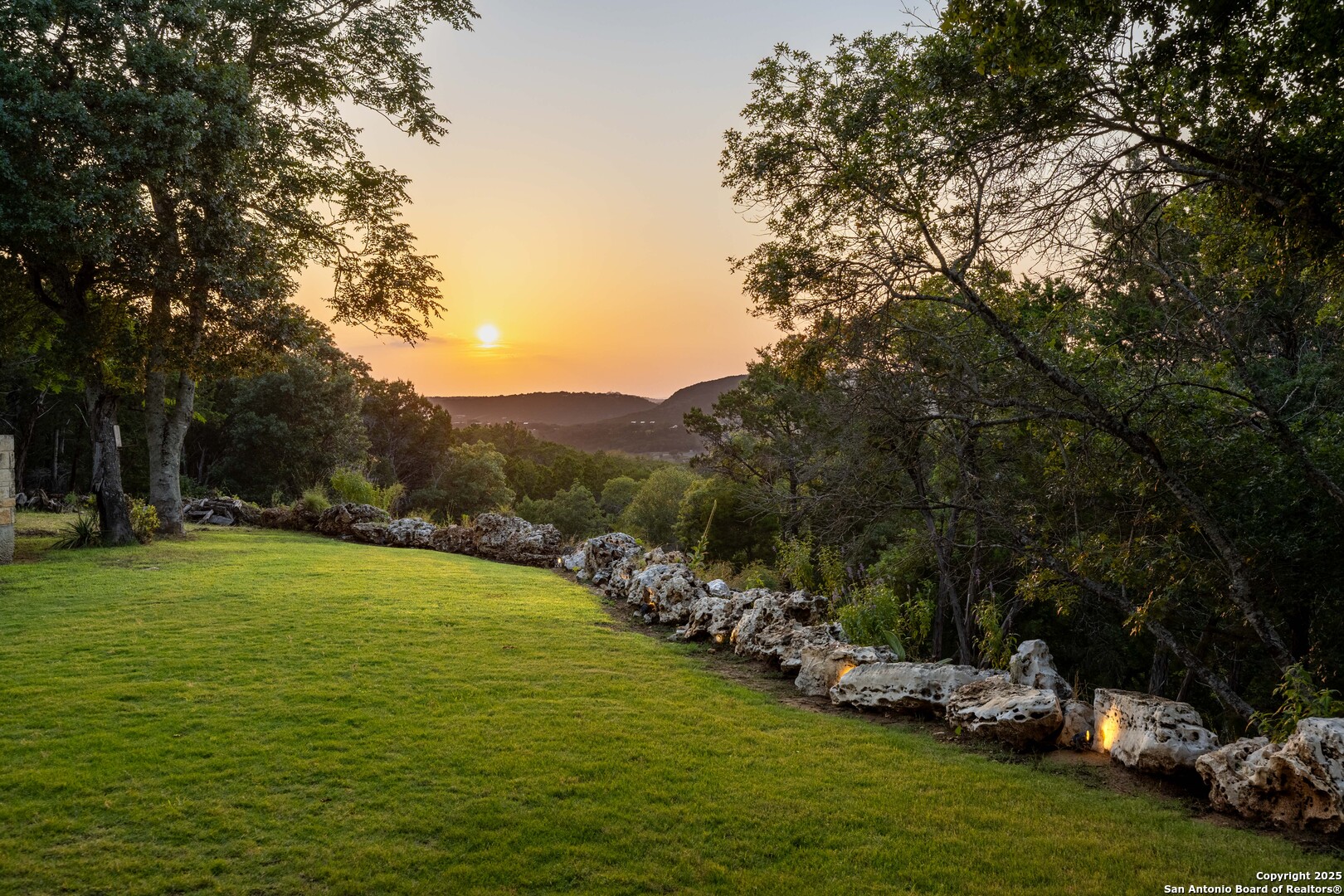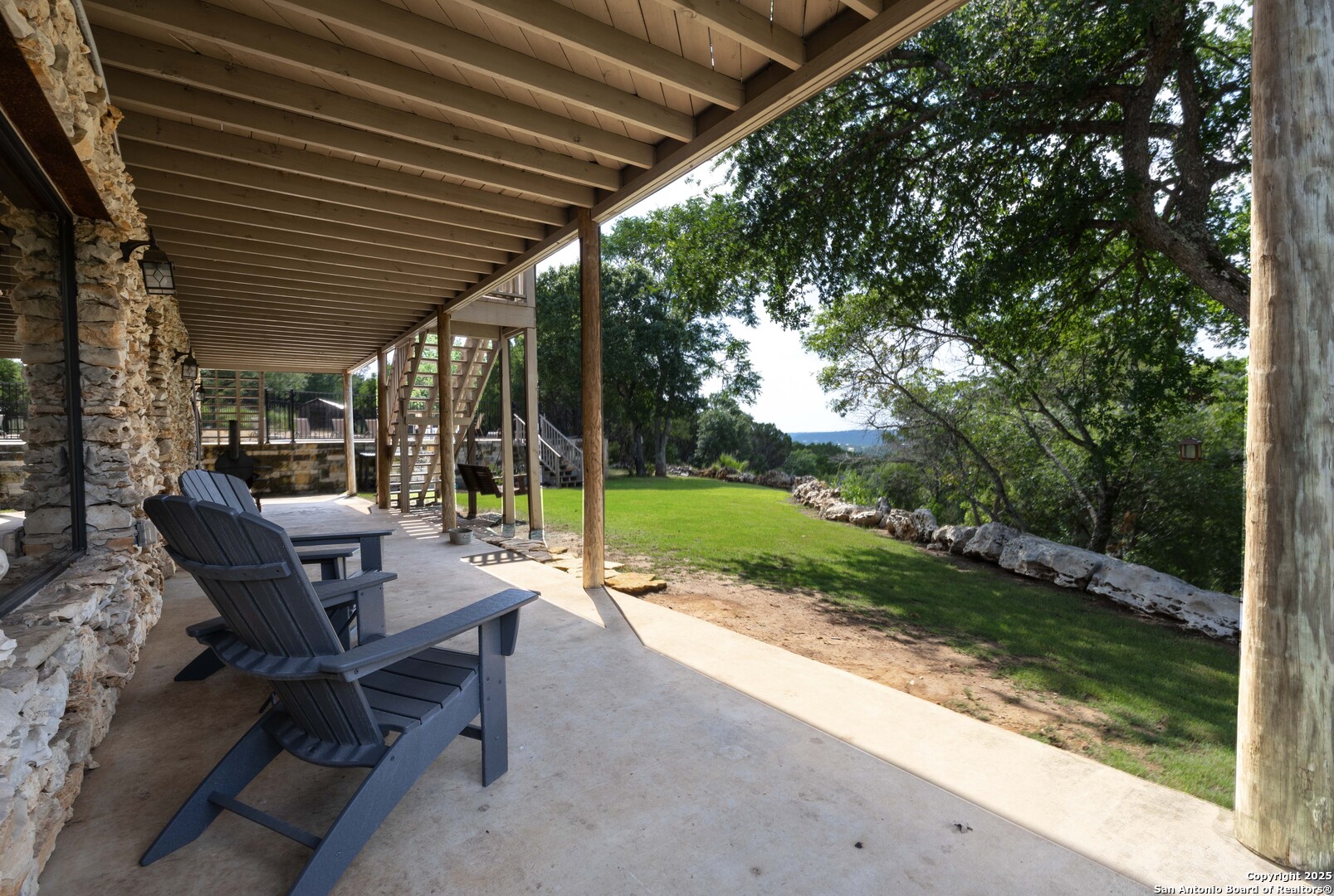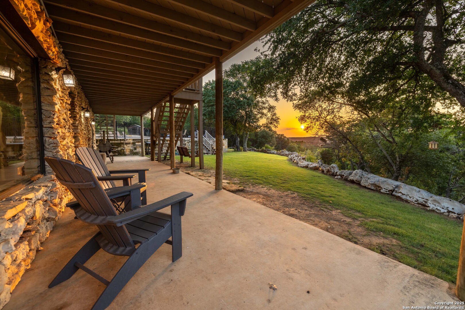 Tucked away in the scenic Eden Ranch community, this versatile Hill Country property offers privacy, flexibility, and incredible views from every level-including golden-hour sunsets that stretch across the horizon. With over 5 acres of native beauty, spacious interiors, and a fully private mother-in-law suite with its own entrance, this home checks all the boxes for multi-generational living, guest accommodations, or rental income potential. The main (mid) level is open and airy, filled with natural light and expansive windows that showcase the hilltop setting. The living, kitchen, and dining area are centered around a charming stone wood-burning fireplace, creating a warm and inviting space. The primary suite is tucked privately on this level and offers peaceful views, direct private access to the outdoors, a spacious layout, walk-in closet, and a luxurious en-suite bath with a walk-in shower featuring both a rain and secondary showerhead. A large laundry room with added storage and a guest half bath complete this level. Upstairs are three additional bedrooms, a full bath with a tub/shower combo, and two generous storage closets-one with floor-to-ceiling shelving, and another offering flex space for hobbies, storage, or a home office. The true gem of this property lies on the lower level: a fully finished, separately accessible mother-in-law suite or private apartment complete with its own entrance. This space features a living/media area, a fully equipped kitchenette with induction stove, sink, and convection microwave with air fry, plus a full bath, built-in cabinetry, and an under-stair storage closet. Whether for extended family, long-term guests, or even STR potential, this space offers privacy, independence, and outstanding versatility. Outdoors, the property is just as impressive. A 60'x40' workshop includes drive-through RV doors, 220V power, a 200amp panel, and RV plug-perfect for business owners, hobbyists, or RV travelers. Additional features include a chicken coop with extended run, a fenced garden, and a 21-foot Catalina Swim Spa with a 2022 End2End cover. A private 1/3-mile walking trail meanders through wildflowers, native grasses, and a seasonal creek, offering peaceful nature right outside your door. With room to roam, live, and host-while enjoying breathtaking Hill Country views-this property is truly one-of-a-kind.