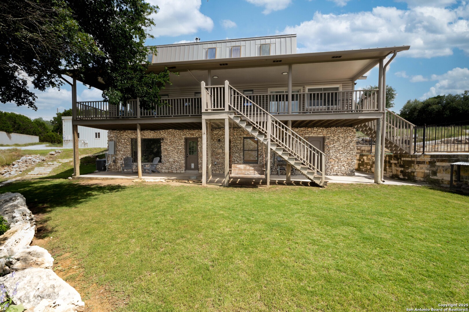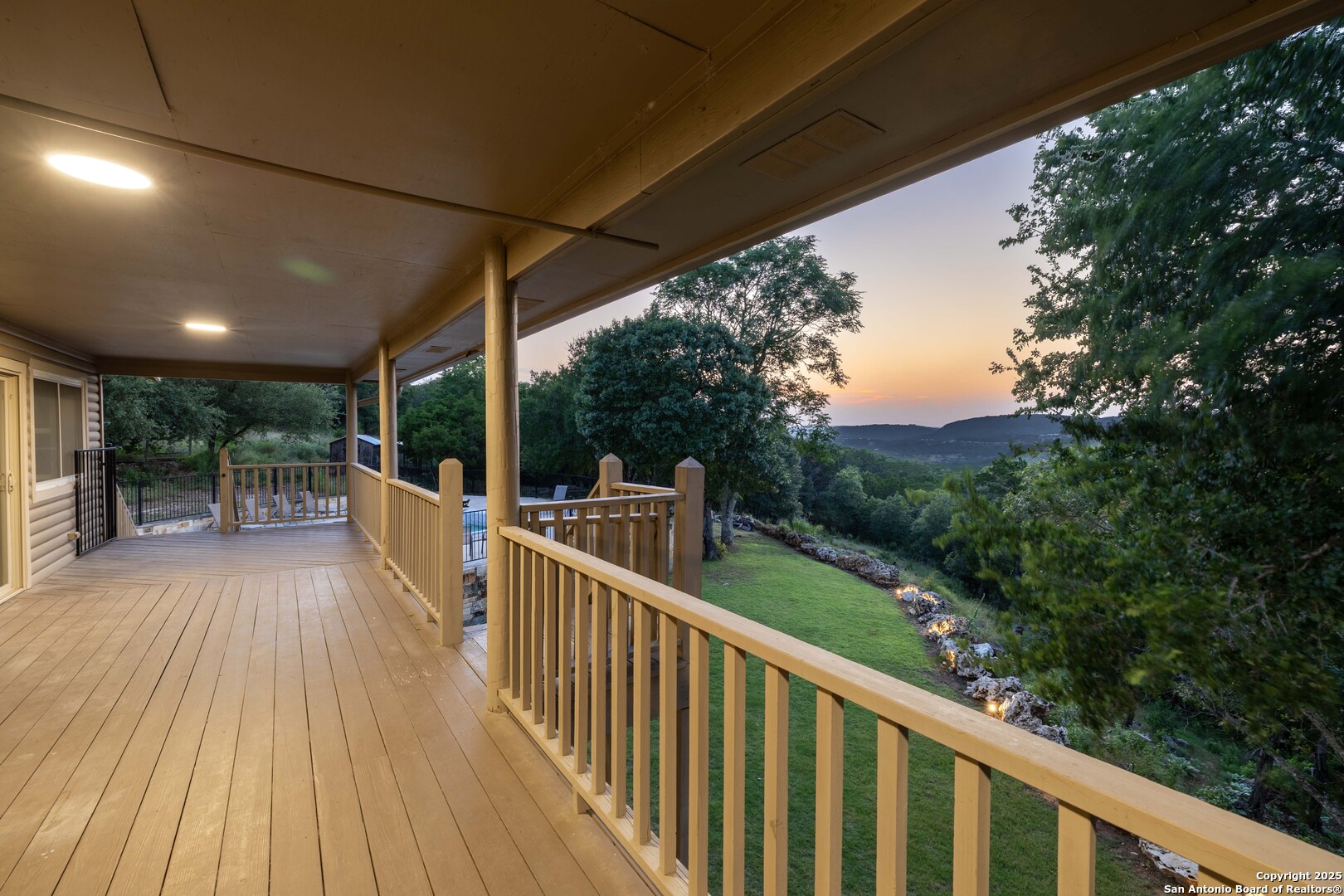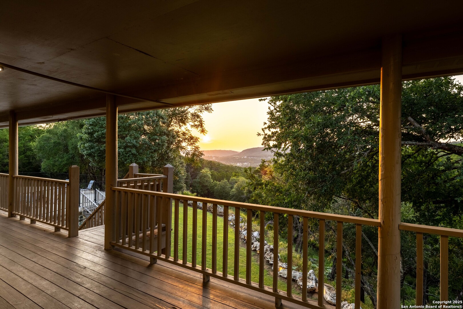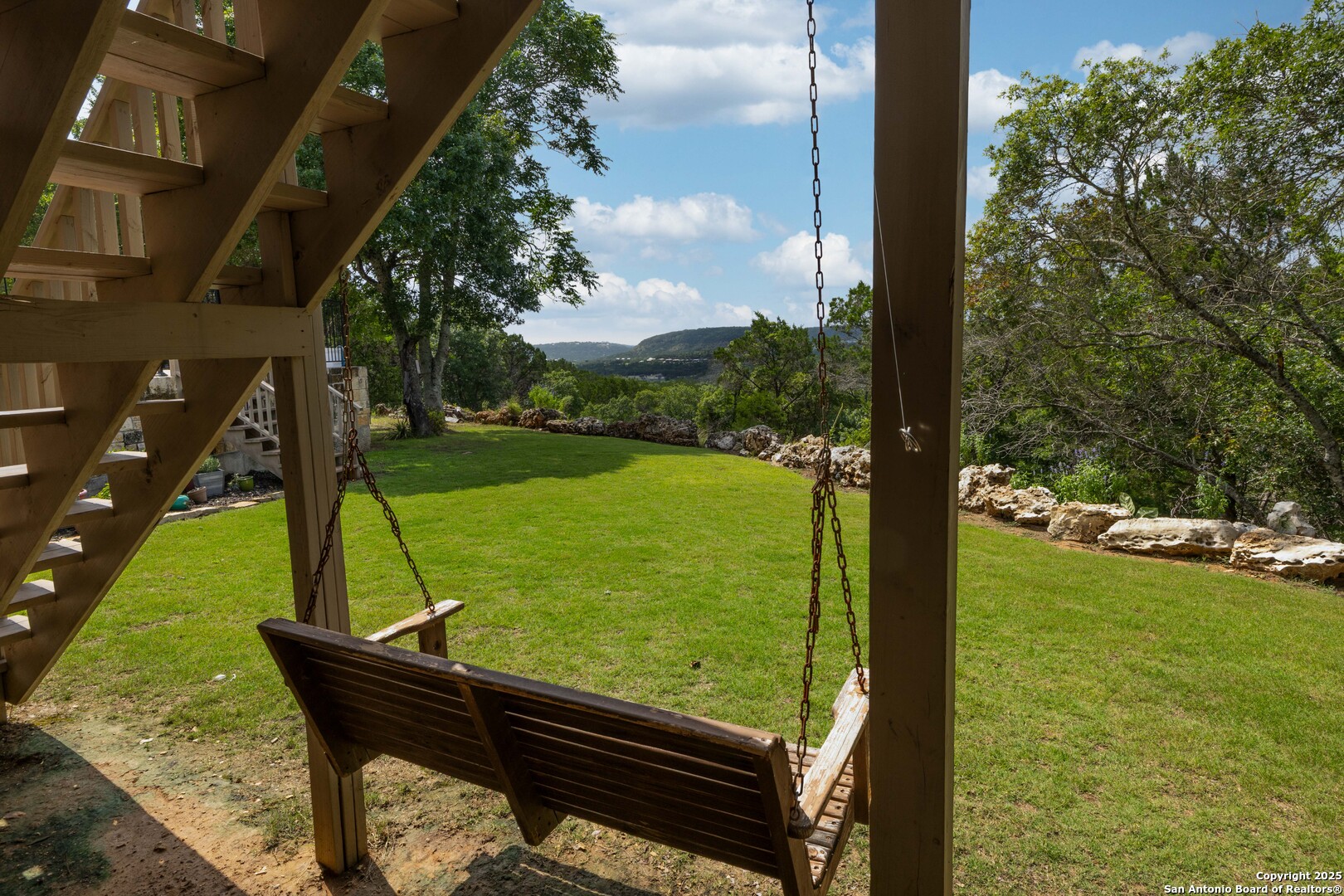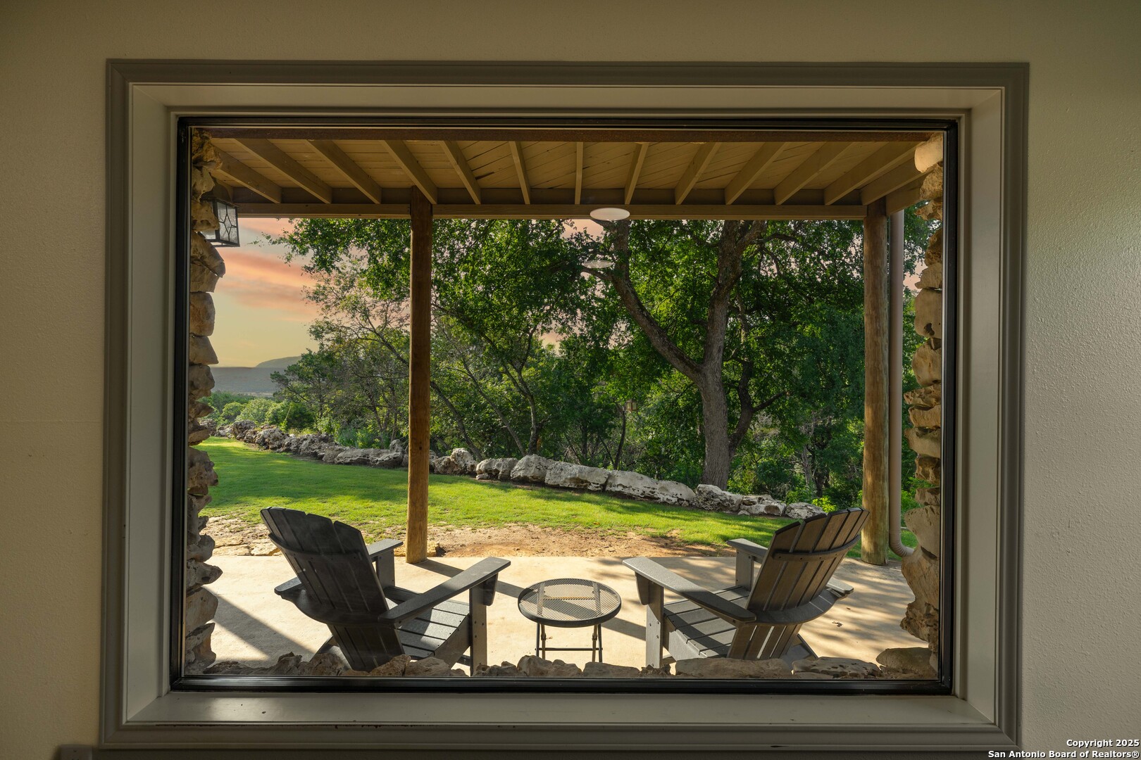Tucked away in the scenic Eden Ranch community, this versatile Hill Country property offers privacy, flexibility, and incredible views from every level-including golden-hour sunsets that stretch across the horizon. With over 5 acres of native beauty, spacious interiors, and a fully private mother-in-law suite with its own entrance, this home checks all the boxes for multi-generational living, guest accommodations, or rental income potential. The main (mid) level is open and airy, filled with natural light and expansive windows that showcase the hilltop setting. The living, kitchen, and dining area are centered around a charming stone wood-burning fireplace, creating a warm and inviting space. The primary suite is tucked privately on this level and offers peaceful views, direct private access to the outdoors, a spacious layout, walk-in closet, and a luxurious en-suite bath with a walk-in shower featuring both a rain and secondary showerhead. A large laundry room with added storage and a guest half bath complete this level. Upstairs are three additional bedrooms, a full bath with a tub/shower combo, and two generous storage closets-one with floor-to-ceiling shelving, and another offering flex space for hobbies, storage, or a home office. The true gem of this property lies on the lower level: a fully finished, separately accessible mother-in-law suite or private apartment complete with its own entrance. This space features a living/media area, a fully equipped kitchenette with induction stove, sink, and convection microwave with air fry, plus a full bath, built-in cabinetry, and an under-stair storage closet. Whether for extended family, long-term guests, or even STR potential, this space offers privacy, independence, and outstanding versatility. Outdoors, the property is just as impressive. A 60'x40' workshop includes drive-through RV doors, 220V power, a 200amp panel, and RV plug-perfect for business owners, hobbyists, or RV travelers. Additional features include a chicken coop with extended run, a fenced garden, and a 21-foot Catalina Swim Spa with a 2022 End2End cover. A private 1/3-mile walking trail meanders through wildflowers, native grasses, and a seasonal creek, offering peaceful nature right outside your door. With room to roam, live, and host-while enjoying breathtaking Hill Country views-this property is truly one-of-a-kind.