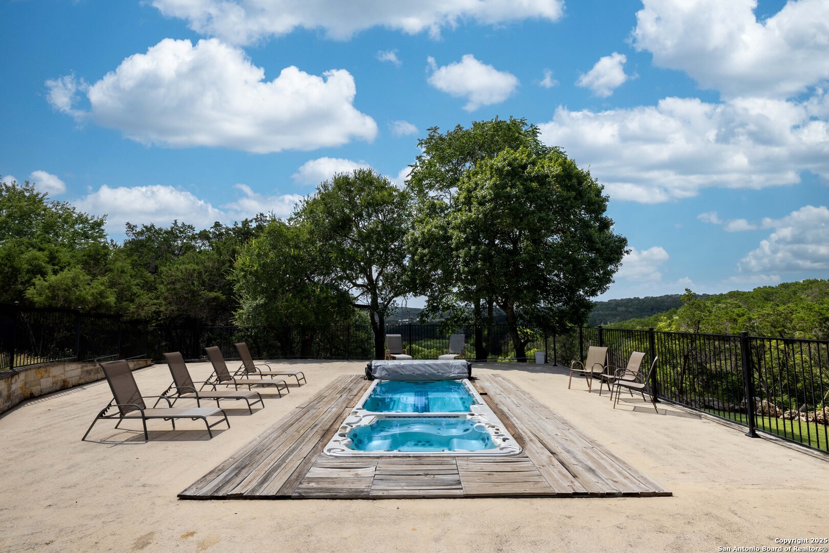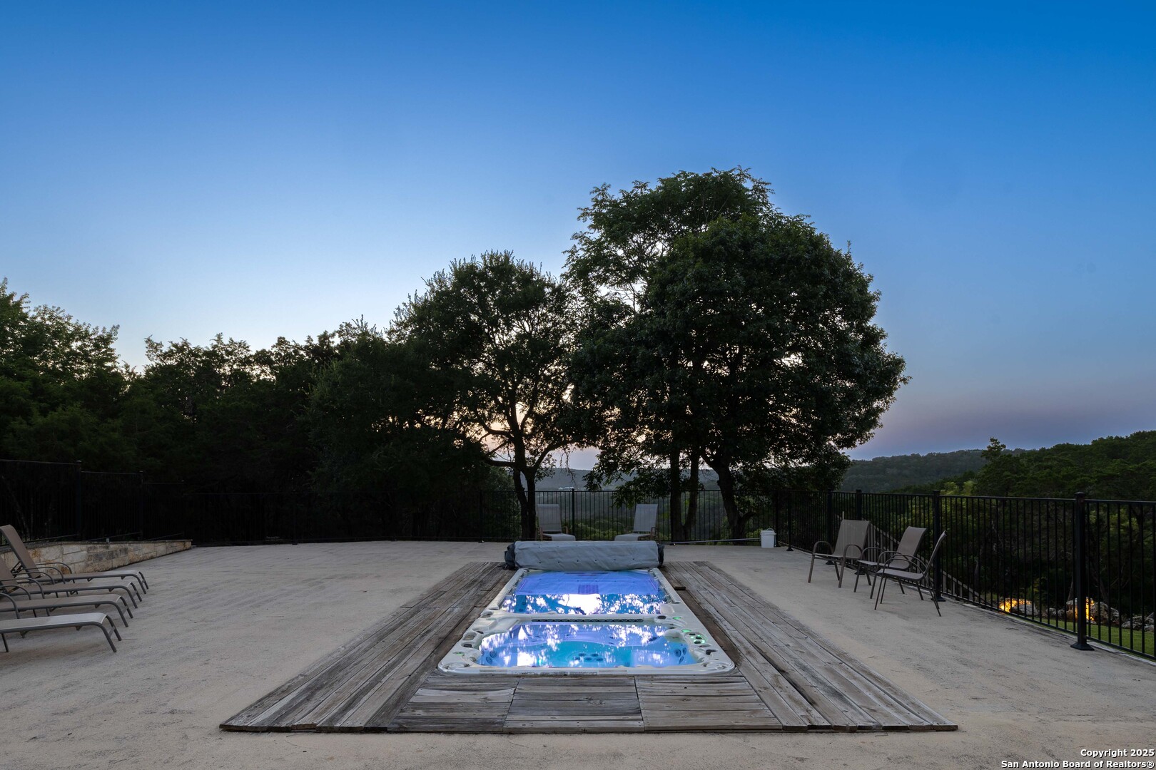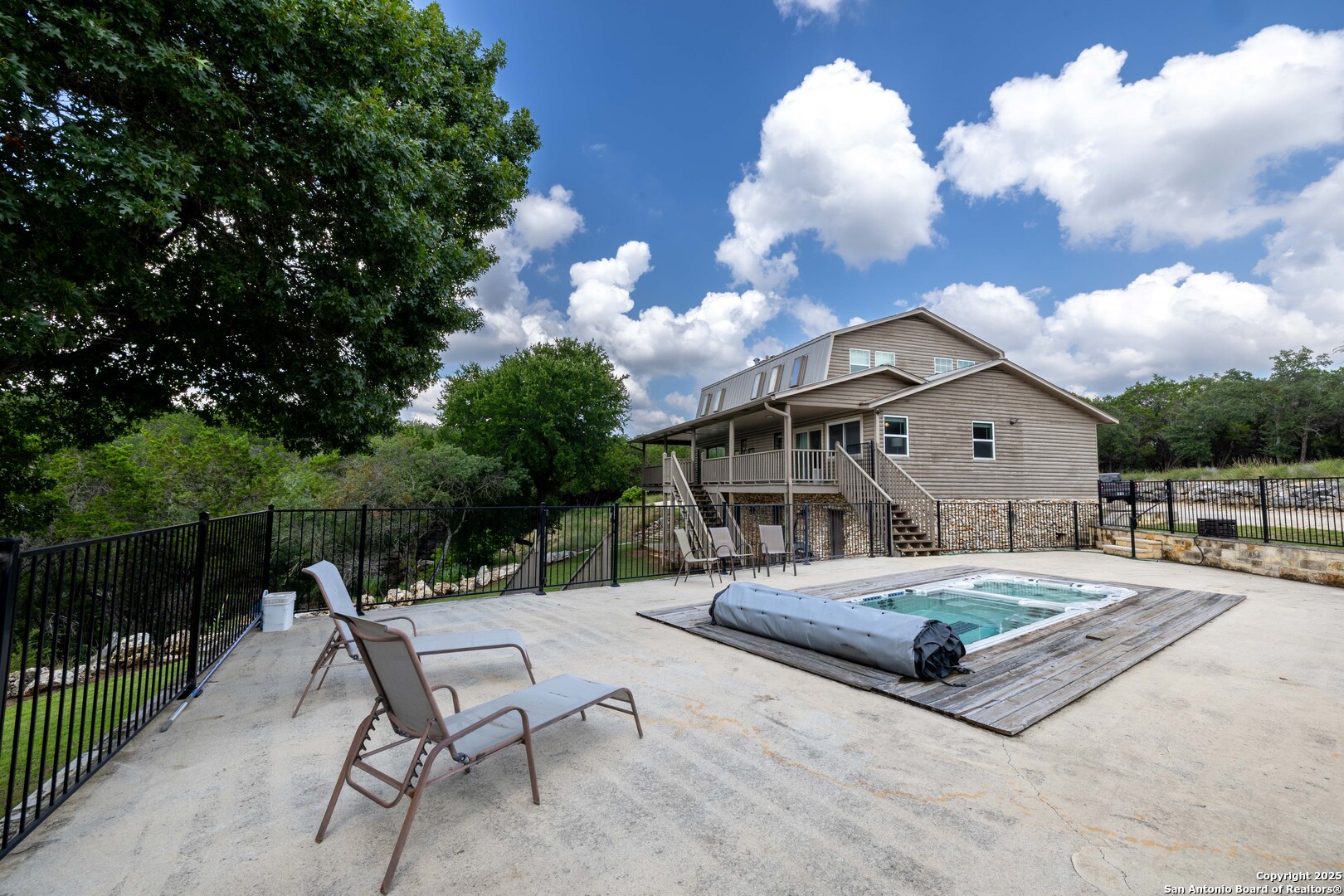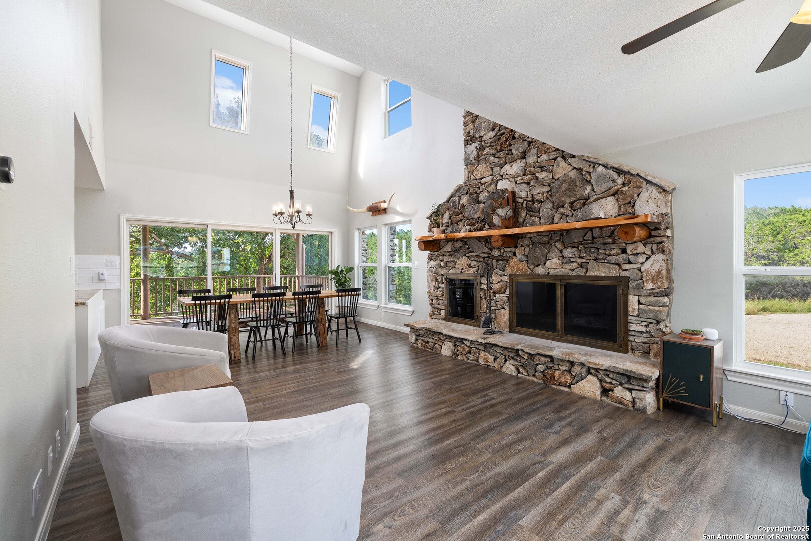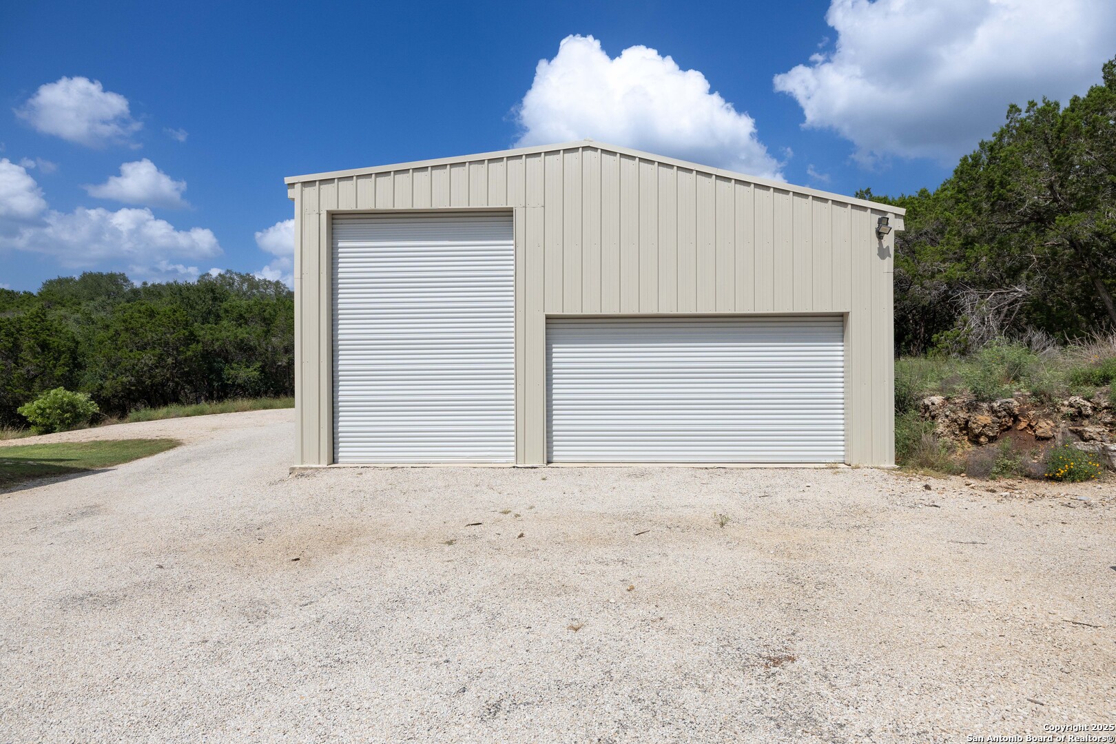 Tucked away in the scenic Eden Ranch community, this versatile Hill Country property offers privacy, flexibility, and incredible views from every level-including golden-hour sunsets that stretch across the horizon. With over 5 acres of native beauty, spacious interiors, and a fully private mother-in-law suite with its own entrance, this home checks all the boxes for multi-generational living, guest accommodations, or rental income potential. The main (mid) level is open and airy, filled with natural light and expansive windows that showcase the hilltop setting. The living, kitchen, and dining area are centered around a charming stone wood-burning fireplace, creating a warm and inviting space. The primary suite is tucked privately on this level and offers peaceful views, direct private access to the outdoors, a spacious layout, walk-in closet, and a luxurious en-suite bath with a walk-in shower featuring both a rain and secondary showerhead. A large laundry room with added storage and a guest half bath complete this level. Upstairs are three additional bedrooms, a full bath with a tub/shower combo, and two generous storage closets-one with floor-to-ceiling shelving, and another offering flex space for hobbies, storage, or a home office. The true gem of this property lies on the lower level: a fully finished, separately accessible mother-in-law suite or private apartment complete with its own entrance. This space features a living/media area, a fully equipped kitchenette with induction stove, sink, and convection microwave with air fry, plus a full bath, built-in cabinetry, and an under-stair storage closet. Whether for extended family, long-term guests, or even STR potential, this space offers privacy, independence, and outstanding versatility. Outdoors, the property is just as impressive. A 60'x40' workshop includes drive-through RV doors, 220V power, a 200amp panel, and RV plug-perfect for business owners, hobbyists, or RV travelers. Additional features include a chicken coop with extended run, a fenced garden, and a 21-foot Catalina Swim Spa with a 2022 End2End cover. A private 1/3-mile walking trail meanders through wildflowers, native grasses, and a seasonal creek, offering peaceful nature right outside your door. With room to roam, live, and host-while enjoying breathtaking Hill Country views-this property is truly one-of-a-kind.