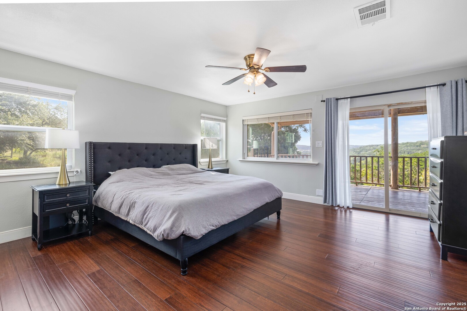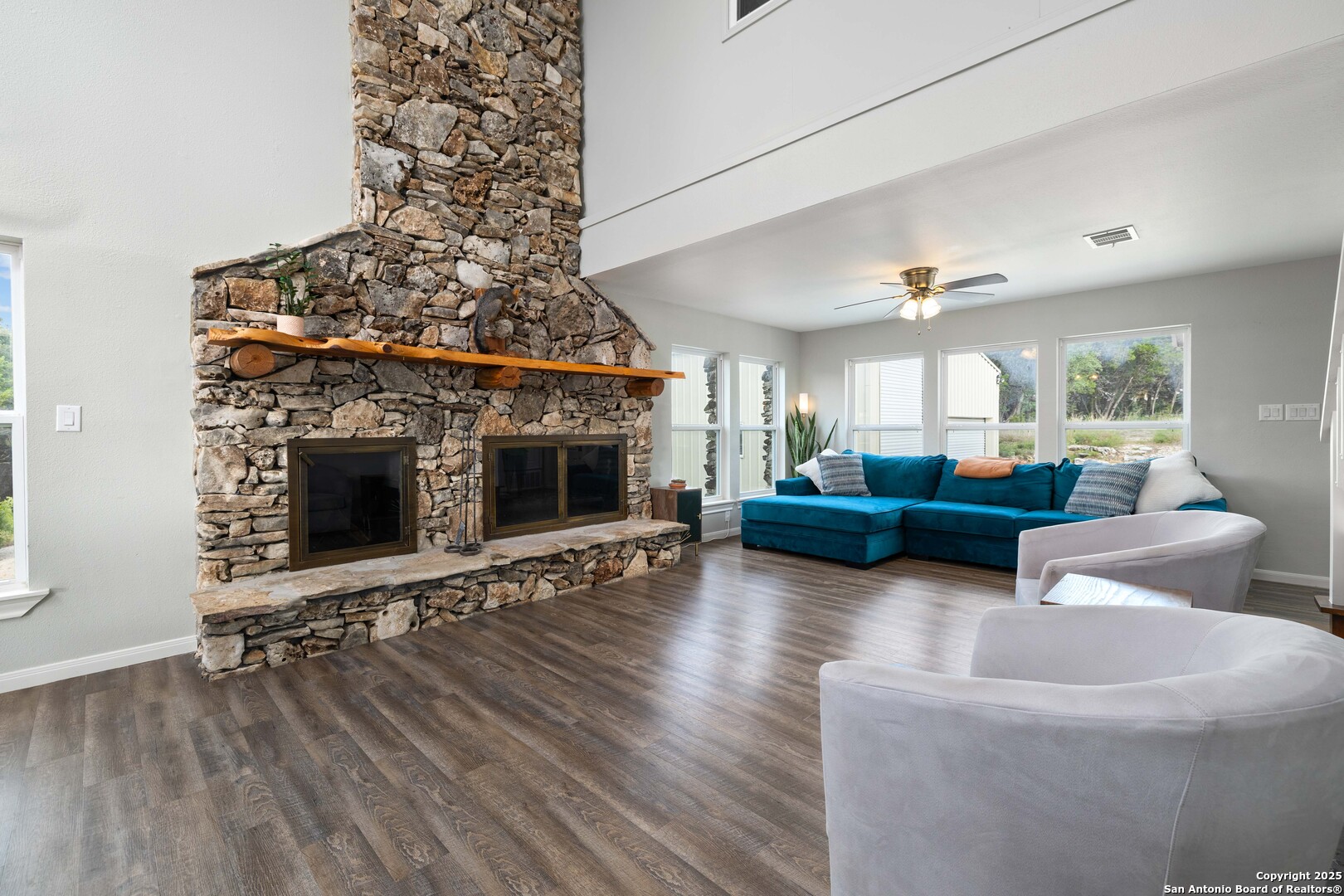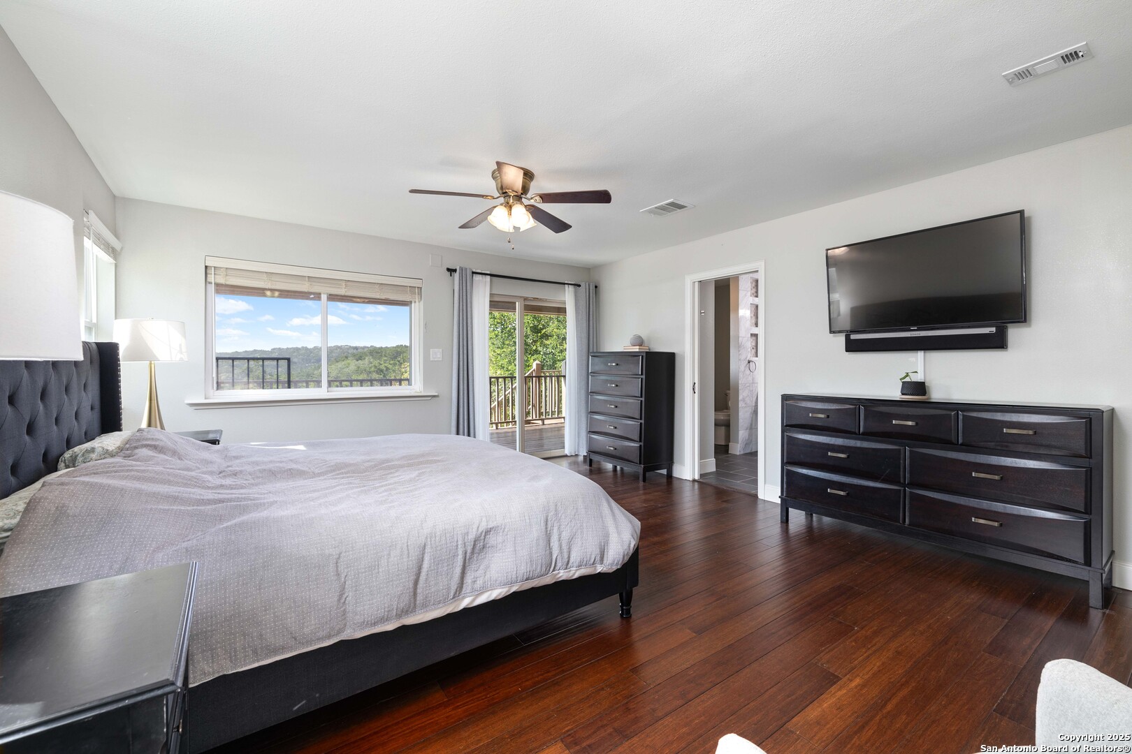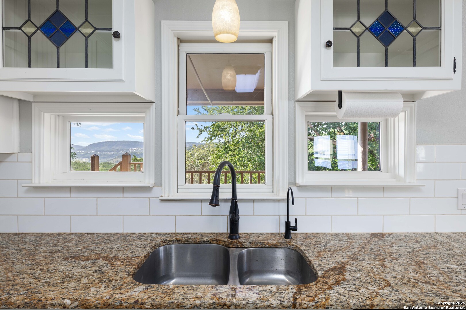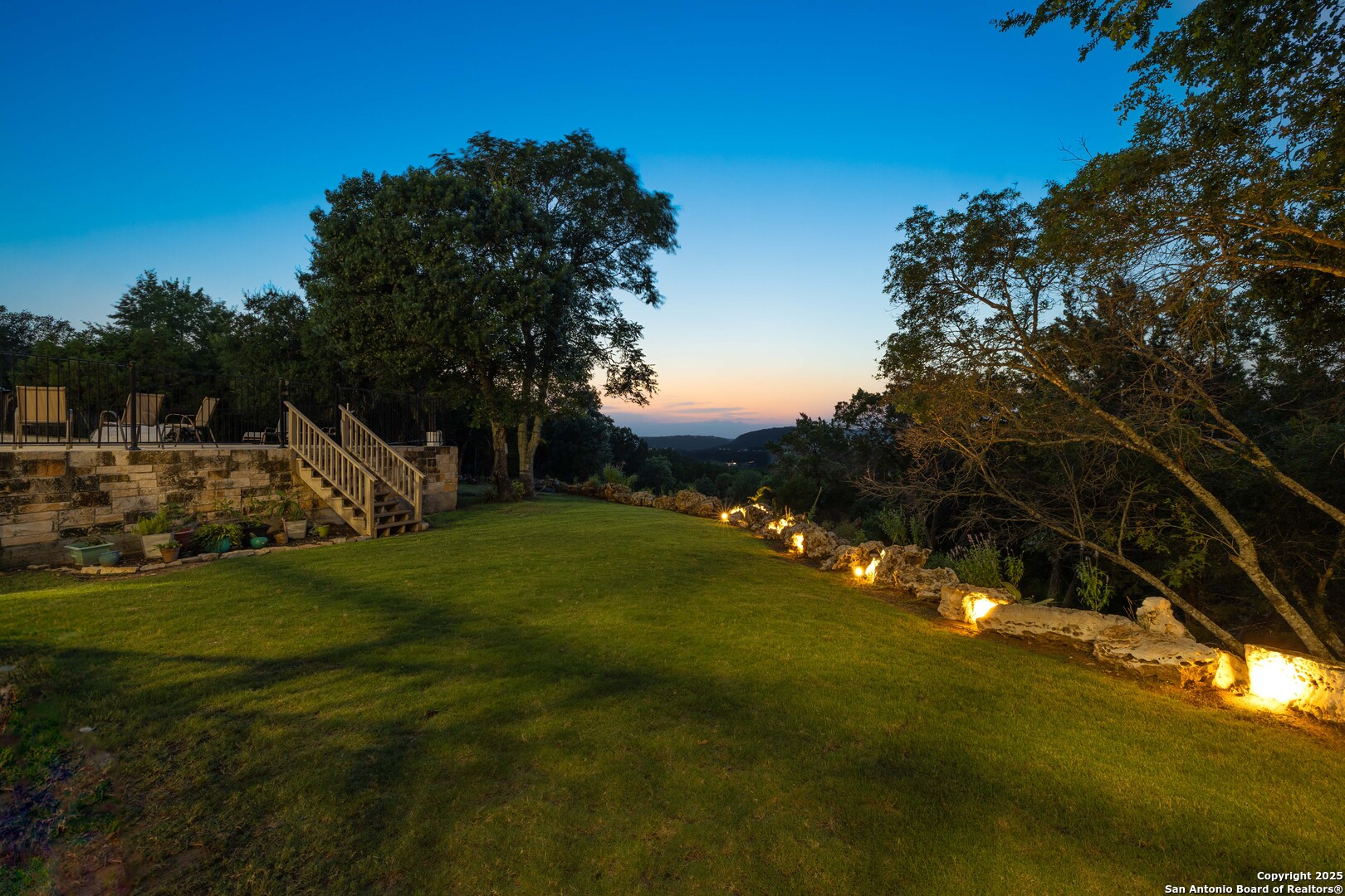 Tucked away in the scenic Eden Ranch community, this versatile Hill Country property offers privacy, flexibility, and incredible views from every level-including golden-hour sunsets that stretch across the horizon. With over 5 acres of native beauty, spacious interiors, and a fully private mother-in-law suite with its own entrance, this home checks all the boxes for multi-generational living, guest accommodations, or rental income potential. The main (mid) level is open and airy, filled with natural light and expansive windows that showcase the hilltop setting. The living, kitchen, and dining area are centered around a charming stone wood-burning fireplace, creating a warm and inviting space. The primary suite is tucked privately on this level and offers peaceful views, direct private access to the outdoors, a spacious layout, walk-in closet, and a luxurious en-suite bath with a walk-in shower featuring both a rain and secondary showerhead. A large laundry room with added storage and a guest half bath complete this level. Upstairs are three additional bedrooms, a full bath with a tub/shower combo, and two generous storage closets-one with floor-to-ceiling shelving, and another offering flex space for hobbies, storage, or a home office. The true gem of this property lies on the lower level: a fully finished, separately accessible mother-in-law suite or private apartment complete with its own entrance. This space features a living/media area, a fully equipped kitchenette with induction stove, sink, and convection microwave with air fry, plus a full bath, built-in cabinetry, and an under-stair storage closet. Whether for extended family, long-term guests, or even STR potential, this space offers privacy, independence, and outstanding versatility. Outdoors, the property is just as impressive. A 60'x40' workshop includes drive-through RV doors, 220V power, a 200amp panel, and RV plug-perfect for business owners, hobbyists, or RV travelers. Additional features include a chicken coop with extended run, a fenced garden, and a 21-foot Catalina Swim Spa with a 2022 End2End cover. A private 1/3-mile walking trail meanders through wildflowers, native grasses, and a seasonal creek, offering peaceful nature right outside your door. With room to roam, live, and host-while enjoying breathtaking Hill Country views-this property is truly one-of-a-kind.