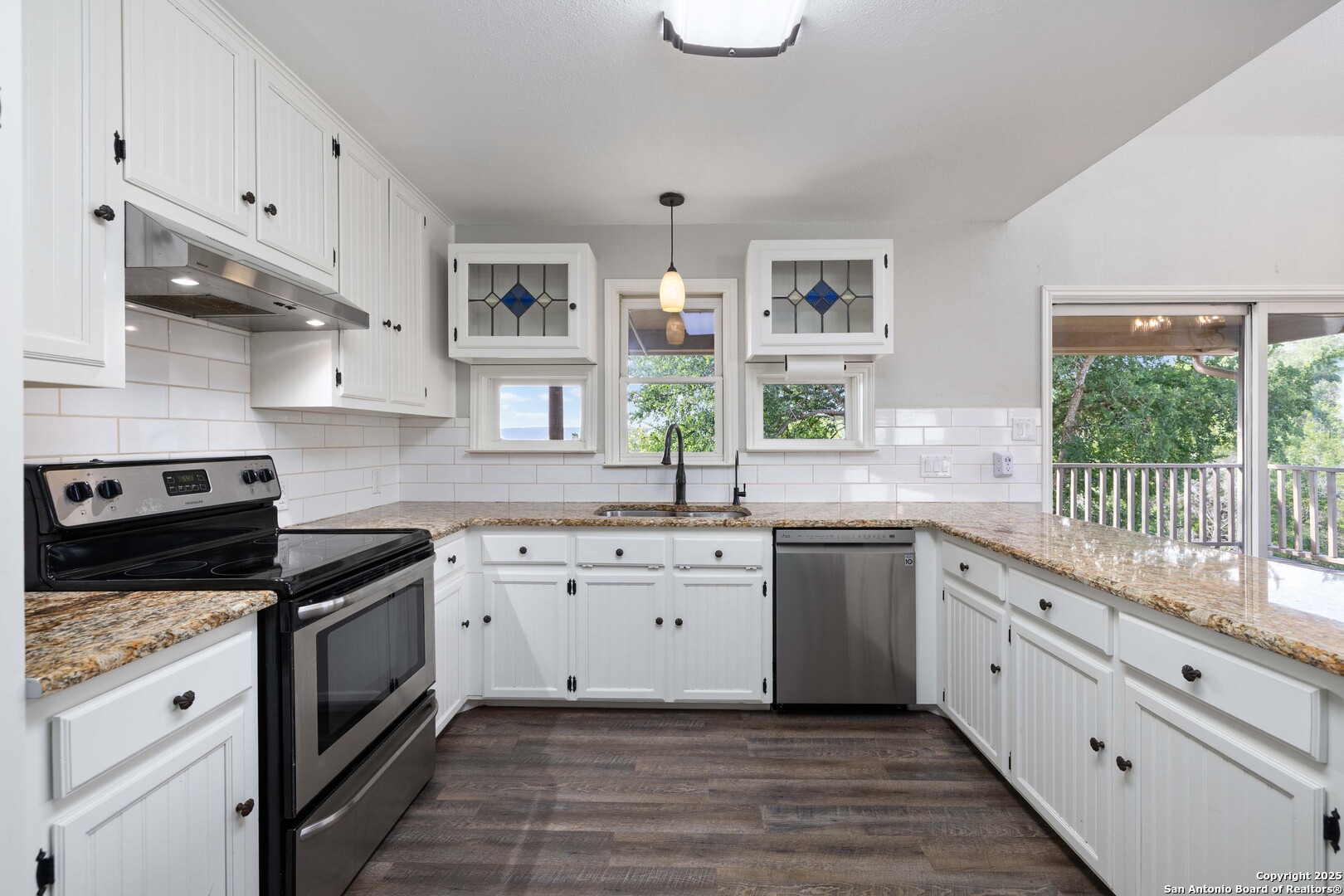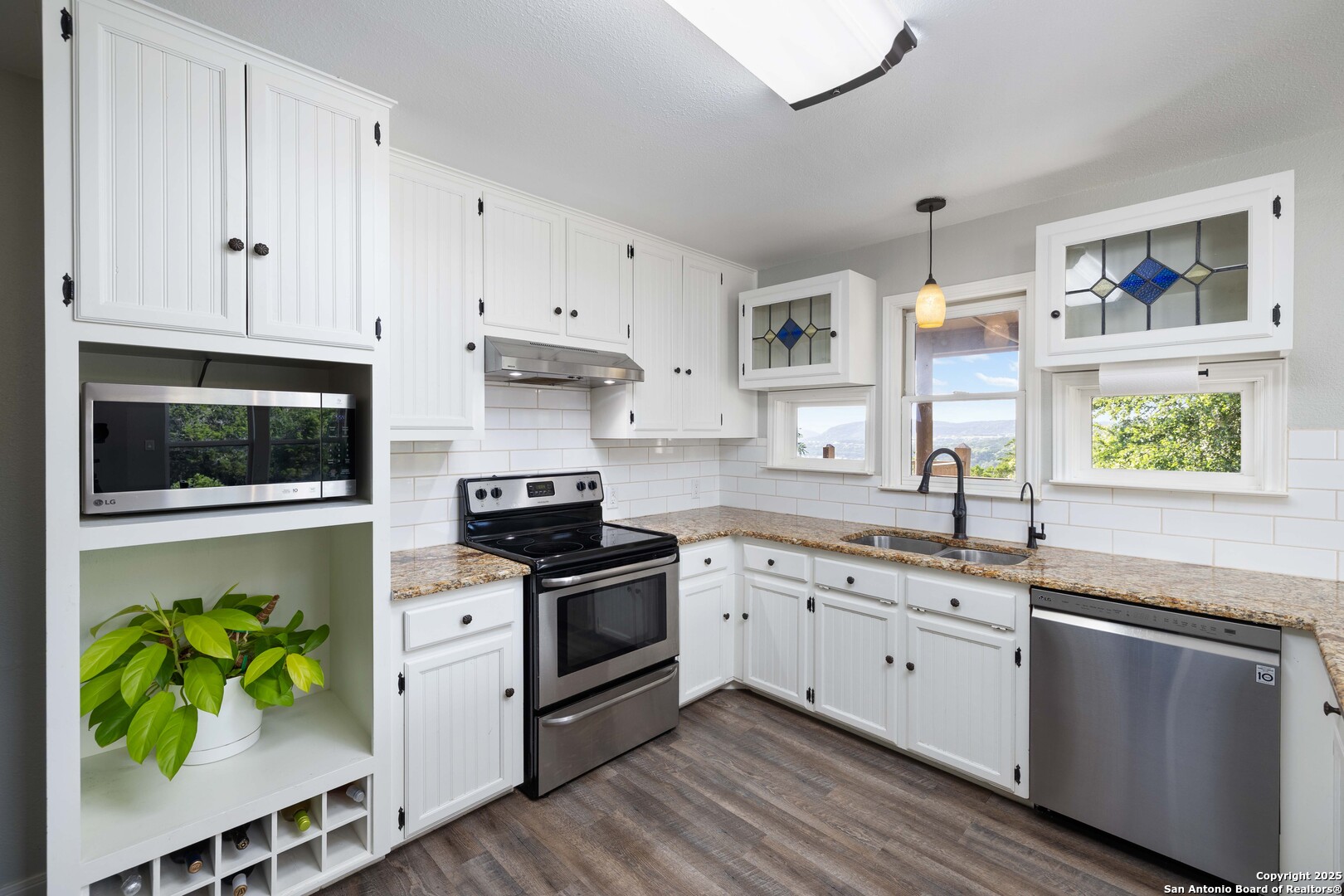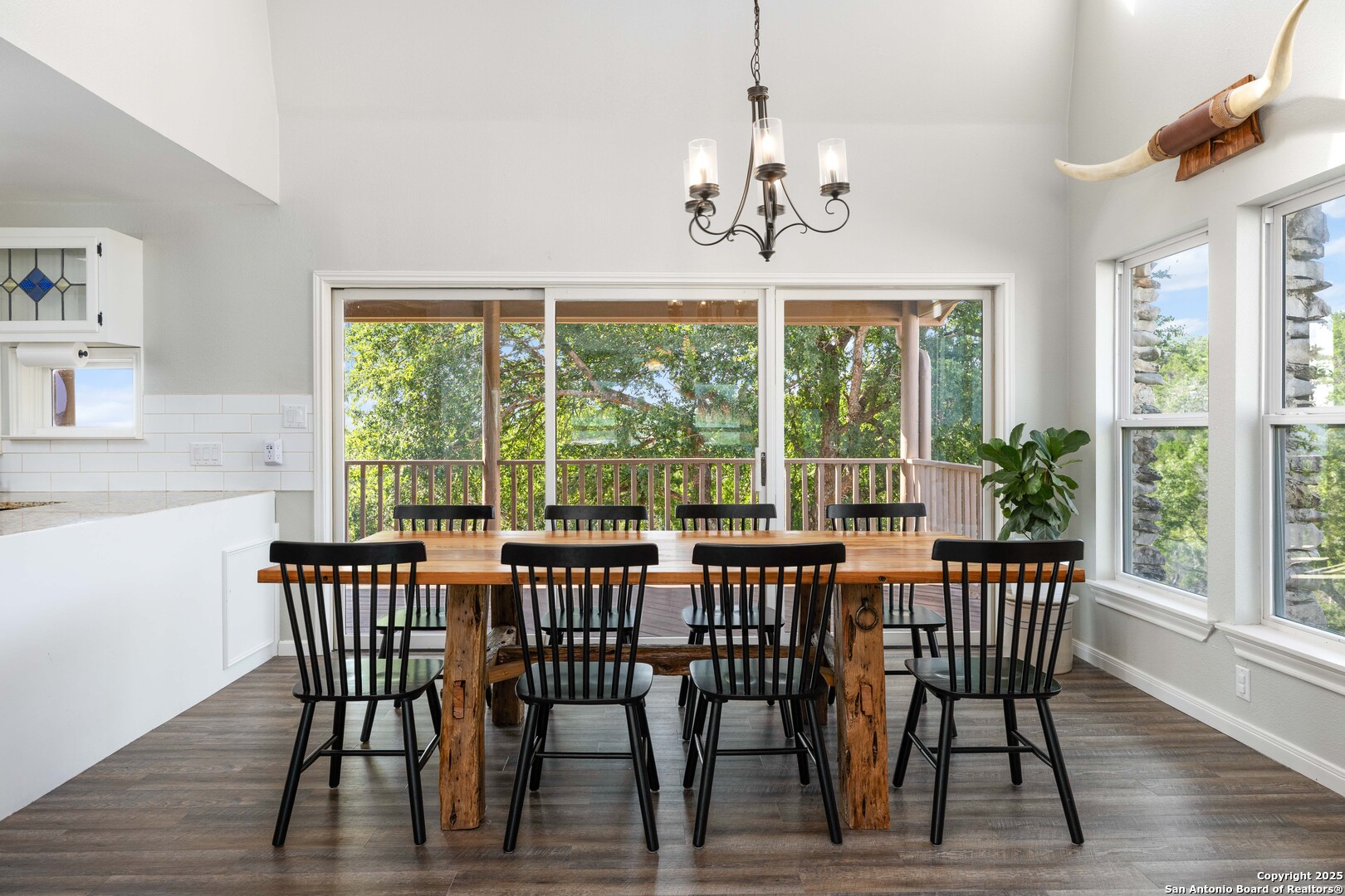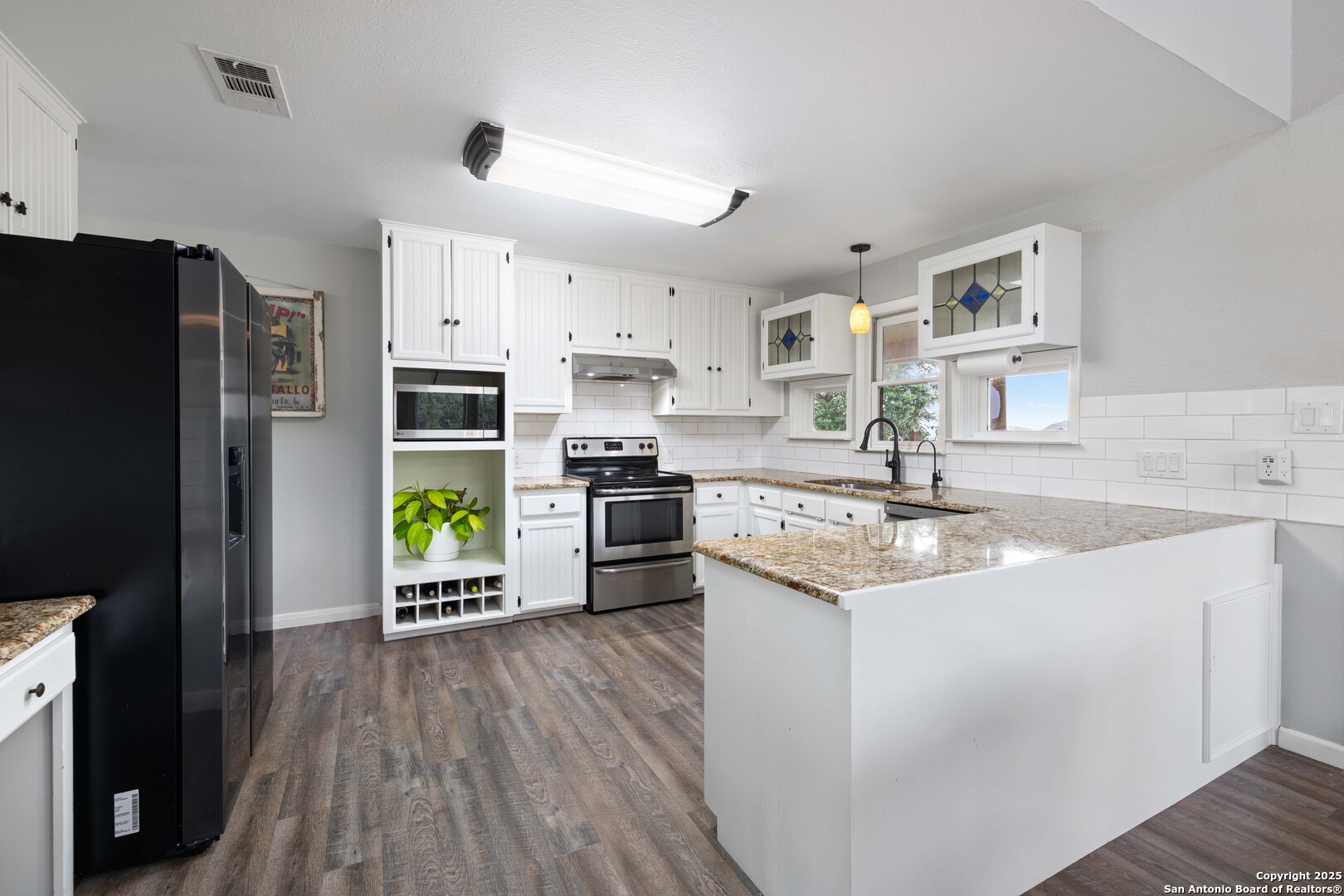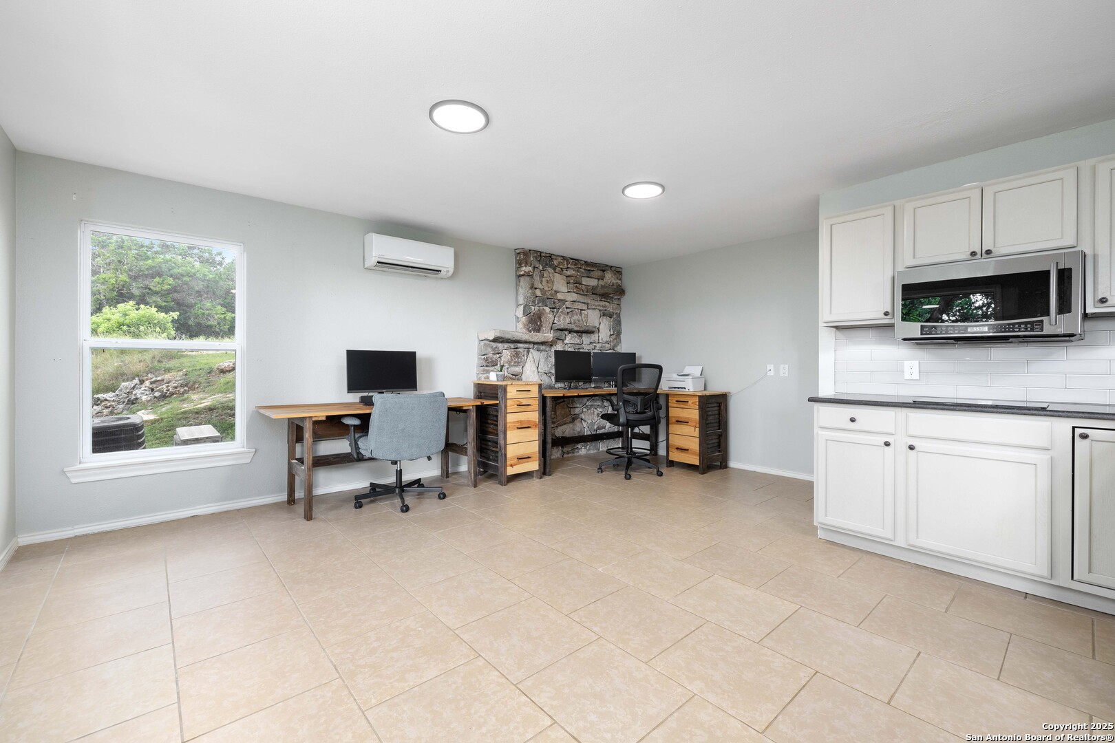 Tucked away in the scenic Eden Ranch community, this versatile Hill Country property offers privacy, flexibility, and incredible views from every level-including golden-hour sunsets that stretch across the horizon. With over 5 acres of native beauty, spacious interiors, and a fully private mother-in-law suite with its own entrance, this home checks all the boxes for multi-generational living, guest accommodations, or rental income potential. The main (mid) level is open and airy, filled with natural light and expansive windows that showcase the hilltop setting. The living, kitchen, and dining area are centered around a charming stone wood-burning fireplace, creating a warm and inviting space. The primary suite is tucked privately on this level and offers peaceful views, direct private access to the outdoors, a spacious layout, walk-in closet, and a luxurious en-suite bath with a walk-in shower featuring both a rain and secondary showerhead. A large laundry room with added storage and a guest half bath complete this level. Upstairs are three additional bedrooms, a full bath with a tub/shower combo, and two generous storage closets-one with floor-to-ceiling shelving, and another offering flex space for hobbies, storage, or a home office. The true gem of this property lies on the lower level: a fully finished, separately accessible mother-in-law suite or private apartment complete with its own entrance. This space features a living/media area, a fully equipped kitchenette with induction stove, sink, and convection microwave with air fry, plus a full bath, built-in cabinetry, and an under-stair storage closet. Whether for extended family, long-term guests, or even STR potential, this space offers privacy, independence, and outstanding versatility. Outdoors, the property is just as impressive. A 60'x40' workshop includes drive-through RV doors, 220V power, a 200amp panel, and RV plug-perfect for business owners, hobbyists, or RV travelers. Additional features include a chicken coop with extended run, a fenced garden, and a 21-foot Catalina Swim Spa with a 2022 End2End cover. A private 1/3-mile walking trail meanders through wildflowers, native grasses, and a seasonal creek, offering peaceful nature right outside your door. With room to roam, live, and host-while enjoying breathtaking Hill Country views-this property is truly one-of-a-kind.