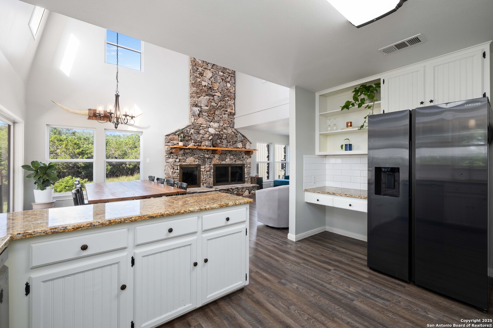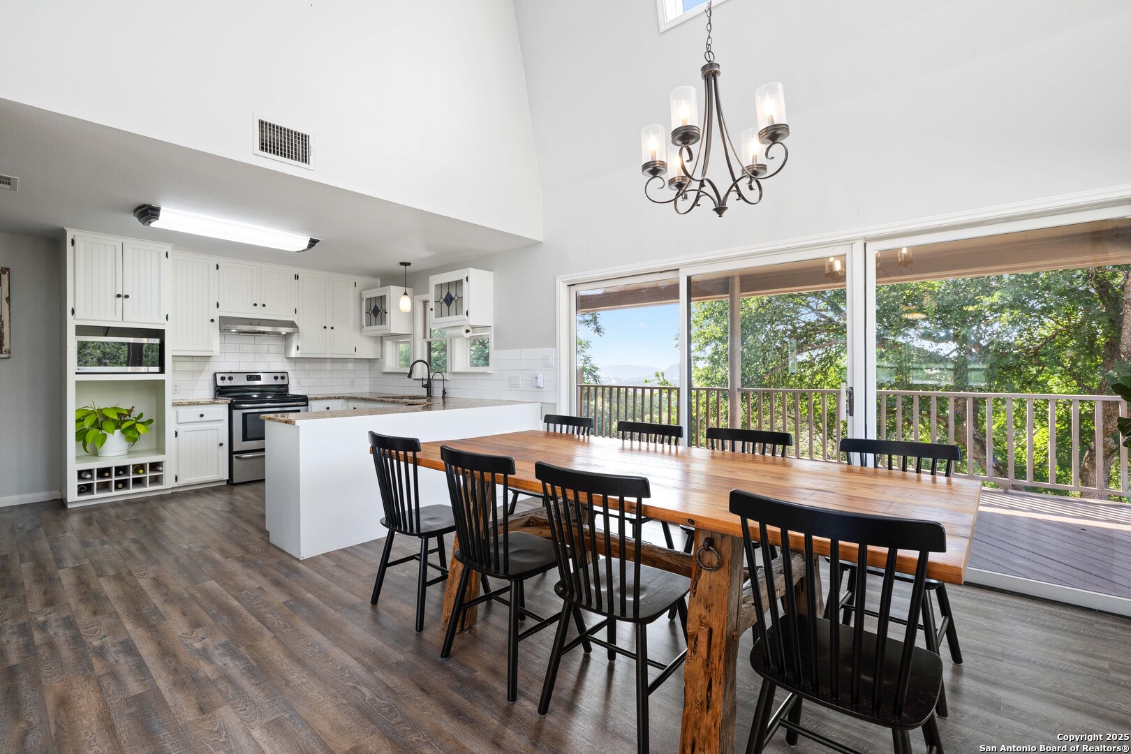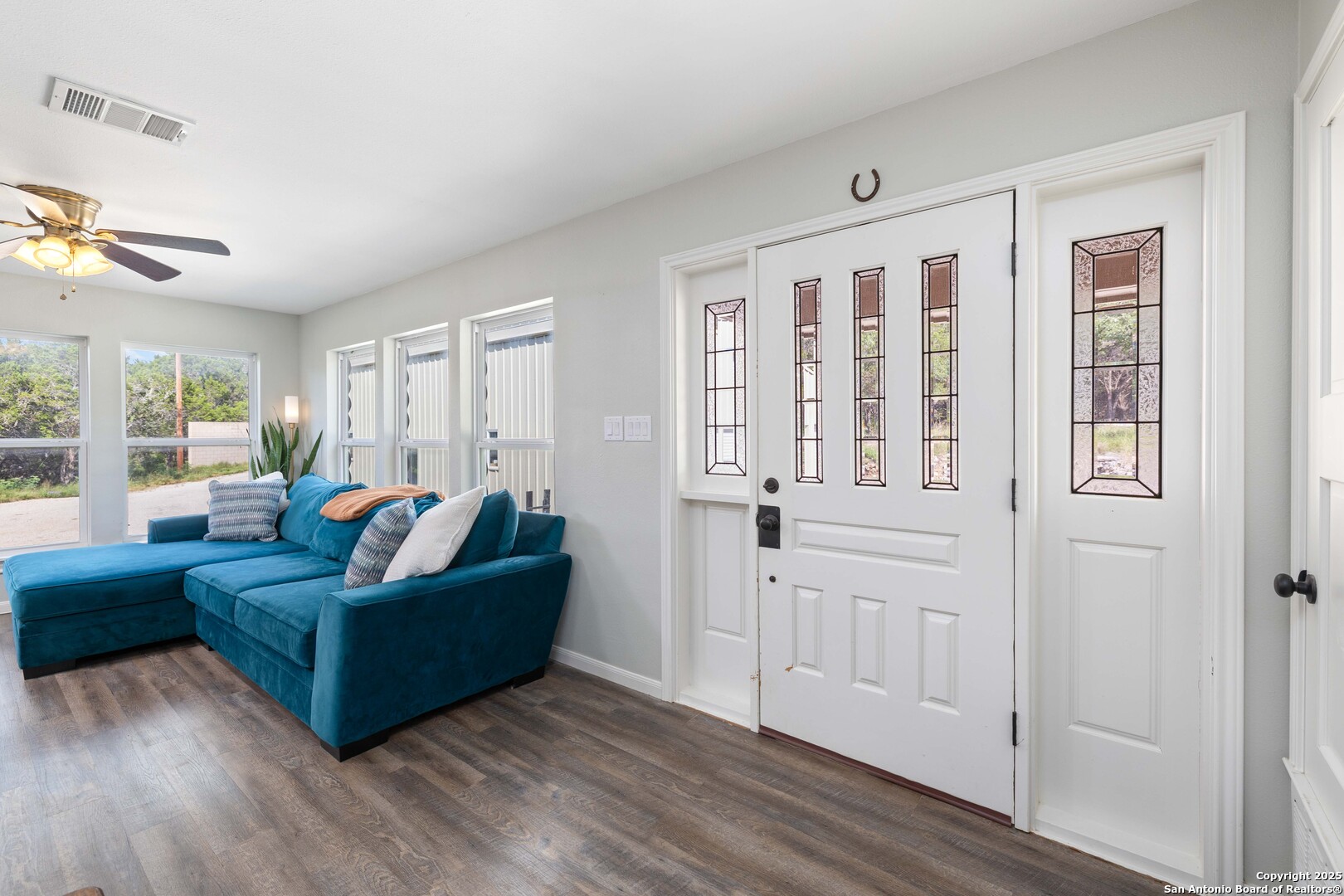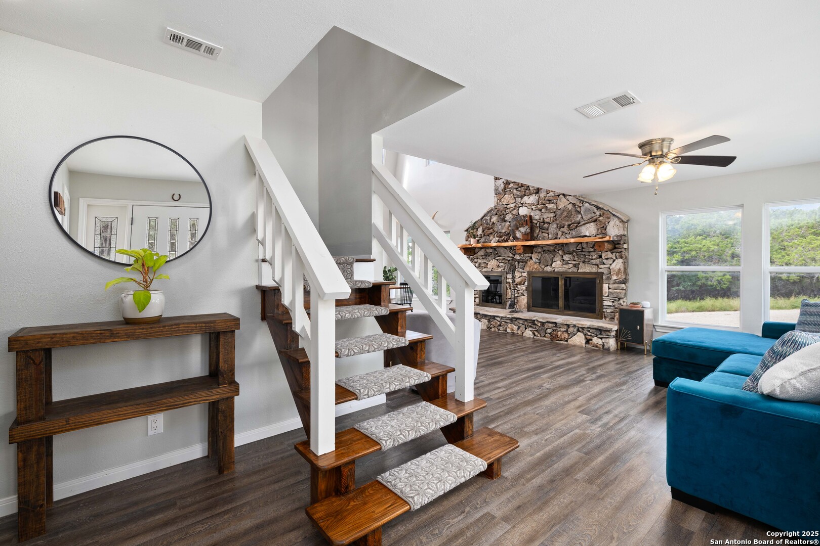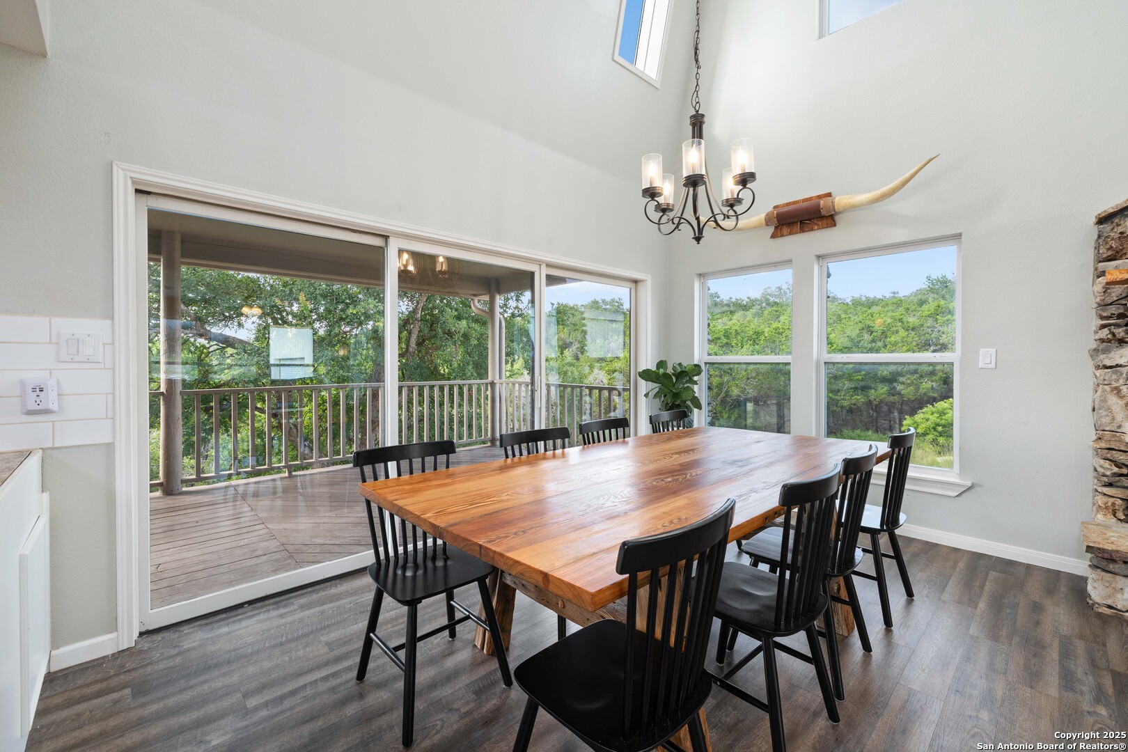 Tucked away in the scenic Eden Ranch community, this versatile Hill Country property offers privacy, flexibility, and incredible views from every level-including golden-hour sunsets that stretch across the horizon. With over 5 acres of native beauty, spacious interiors, and a fully private mother-in-law suite with its own entrance, this home checks all the boxes for multi-generational living, guest accommodations, or rental income potential. The main (mid) level is open and airy, filled with natural light and expansive windows that showcase the hilltop setting. The living, kitchen, and dining area are centered around a charming stone wood-burning fireplace, creating a warm and inviting space. The primary suite is tucked privately on this level and offers peaceful views, direct private access to the outdoors, a spacious layout, walk-in closet, and a luxurious en-suite bath with a walk-in shower featuring both a rain and secondary showerhead. A large laundry room with added storage and a guest half bath complete this level. Upstairs are three additional bedrooms, a full bath with a tub/shower combo, and two generous storage closets-one with floor-to-ceiling shelving, and another offering flex space for hobbies, storage, or a home office. The true gem of this property lies on the lower level: a fully finished, separately accessible mother-in-law suite or private apartment complete with its own entrance. This space features a living/media area, a fully equipped kitchenette with induction stove, sink, and convection microwave with air fry, plus a full bath, built-in cabinetry, and an under-stair storage closet. Whether for extended family, long-term guests, or even STR potential, this space offers privacy, independence, and outstanding versatility. Outdoors, the property is just as impressive. A 60'x40' workshop includes drive-through RV doors, 220V power, a 200amp panel, and RV plug-perfect for business owners, hobbyists, or RV travelers. Additional features include a chicken coop with extended run, a fenced garden, and a 21-foot Catalina Swim Spa with a 2022 End2End cover. A private 1/3-mile walking trail meanders through wildflowers, native grasses, and a seasonal creek, offering peaceful nature right outside your door. With room to roam, live, and host-while enjoying breathtaking Hill Country views-this property is truly one-of-a-kind.