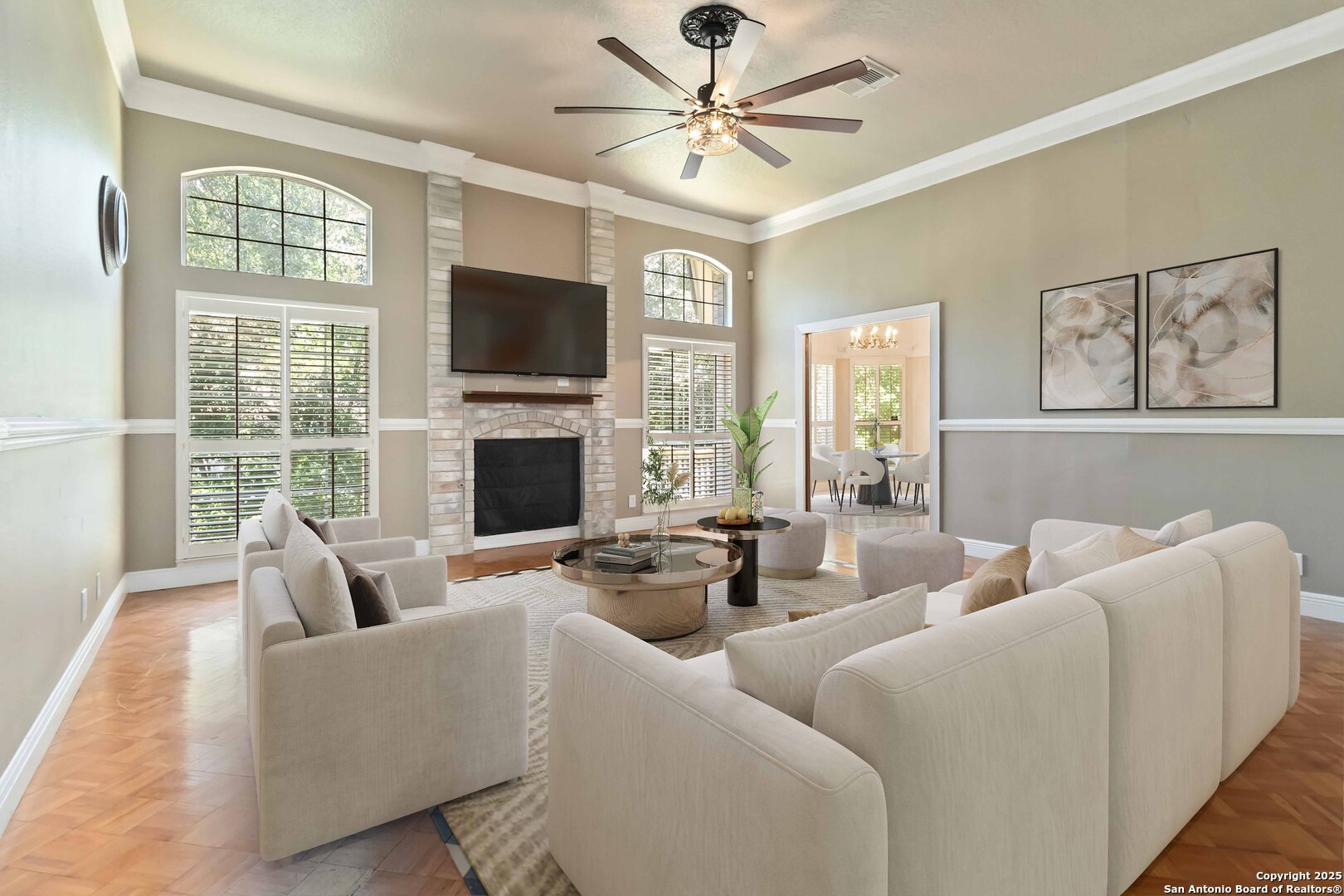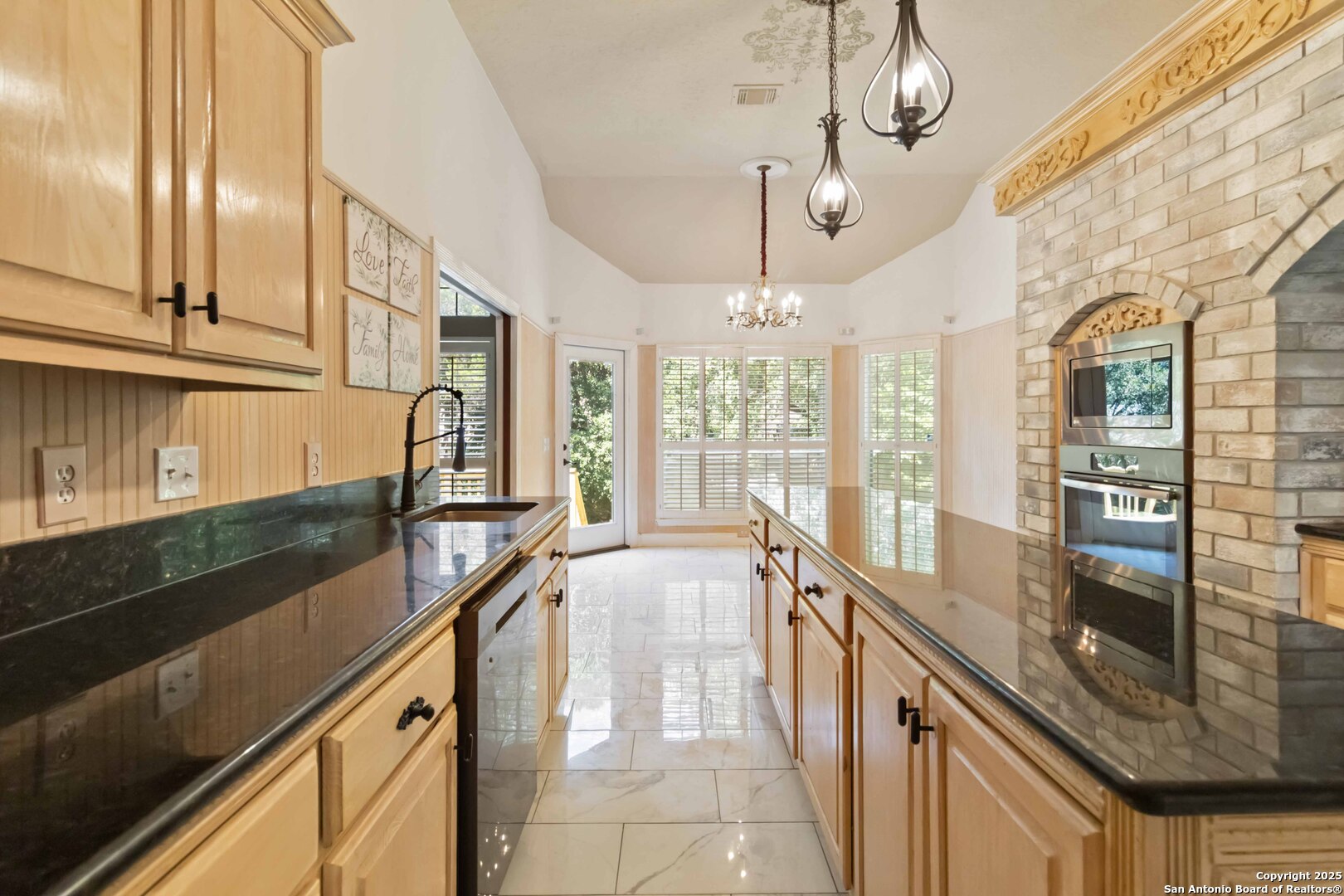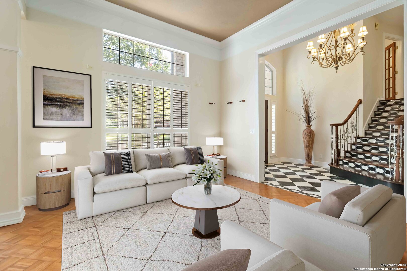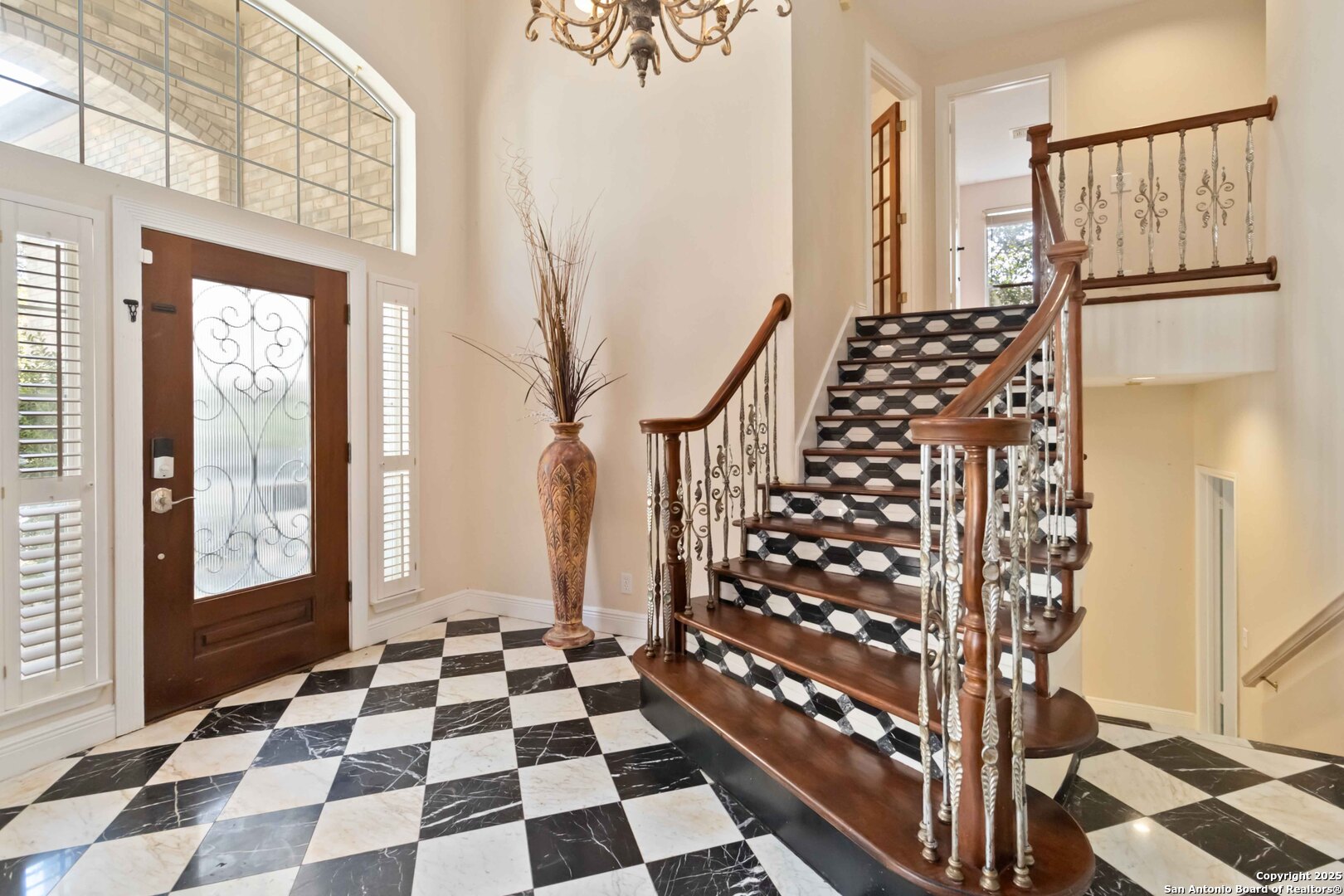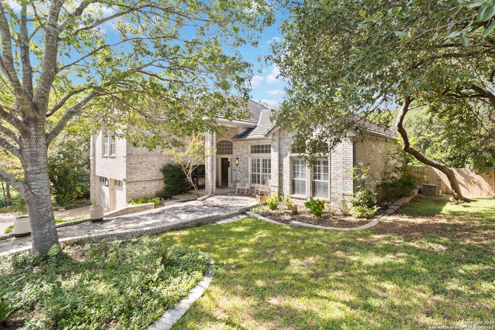 Tucked away behind the gates of the exclusive, guard-gated Mission Ridge community, this custom Sitterle home with 3147 sf, 4 bedrooms, 3.5 bath, offers privacy, charm, and timeless style. With mature trees and lush landscaping framing every window, you'll enjoy a serene, green view from every room. Designed with both elegance and comfort in mind, this spacious home features an abundance of natural light, classic upgraded finishes, and plantation shutters throughout. The thoughtfully designed floor plan includes zero-step entry for convenience and accessibility. The main level starts with the classic checkerboard tiled entry with lovely winding half staircase leading to the guest rooms. To the right relax in the formal living and dining anchored by custom parquet wood flooring accented with checkerboard edges perfectly bringing the entry and formal areas together. The large family room features a floor to ceiling fireplace for cozy evenings at home and sight lines to the sunlit breakfast nook. The chef's kitchen with a center island, induction cooktop, and ample counter space-is perfect for everyday living and entertaining alike. Just a half-flight down, you'll find the private primary suite and garage, providing a peaceful retreat without sacrificing accessibility. Up the stately half staircase off the entry , discover the secondary bedrooms connected by a Jack-and-Jill bath, a dedicated office, and a generously sized 4th bedroom/secondary primary with its own en suite bath. The 4th bedroom would make a great bunk room or flexible enough to be a game room or prewired media room. Outside, the front yard has been professionally xeriscaped for low-maintenance beauty, while the backyard is a quiet, tree-lined haven offering both privacy and potential, with a grassy area ready for your personal touch-be it a garden, pool, or play space. Recent upgrades include a HVAC system, dishwasher, garage doors (securing the extra deep 2 car garage), and lighting fixtures-all within the past few years-adding peace of mind to this already exceptional home. All of this in a prime location just minutes from 281 and 1604, with a convenient 20-minute commute to downtown San Antonio. Don't miss your opportunity to live in one of the city's most sought-after neighborhoods-this home truly has it all.