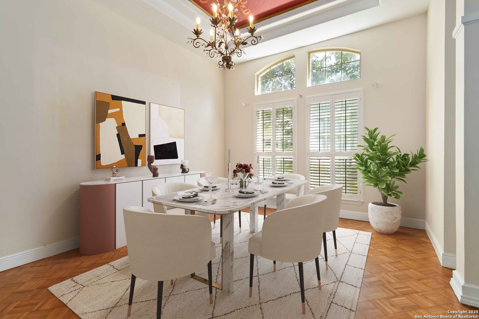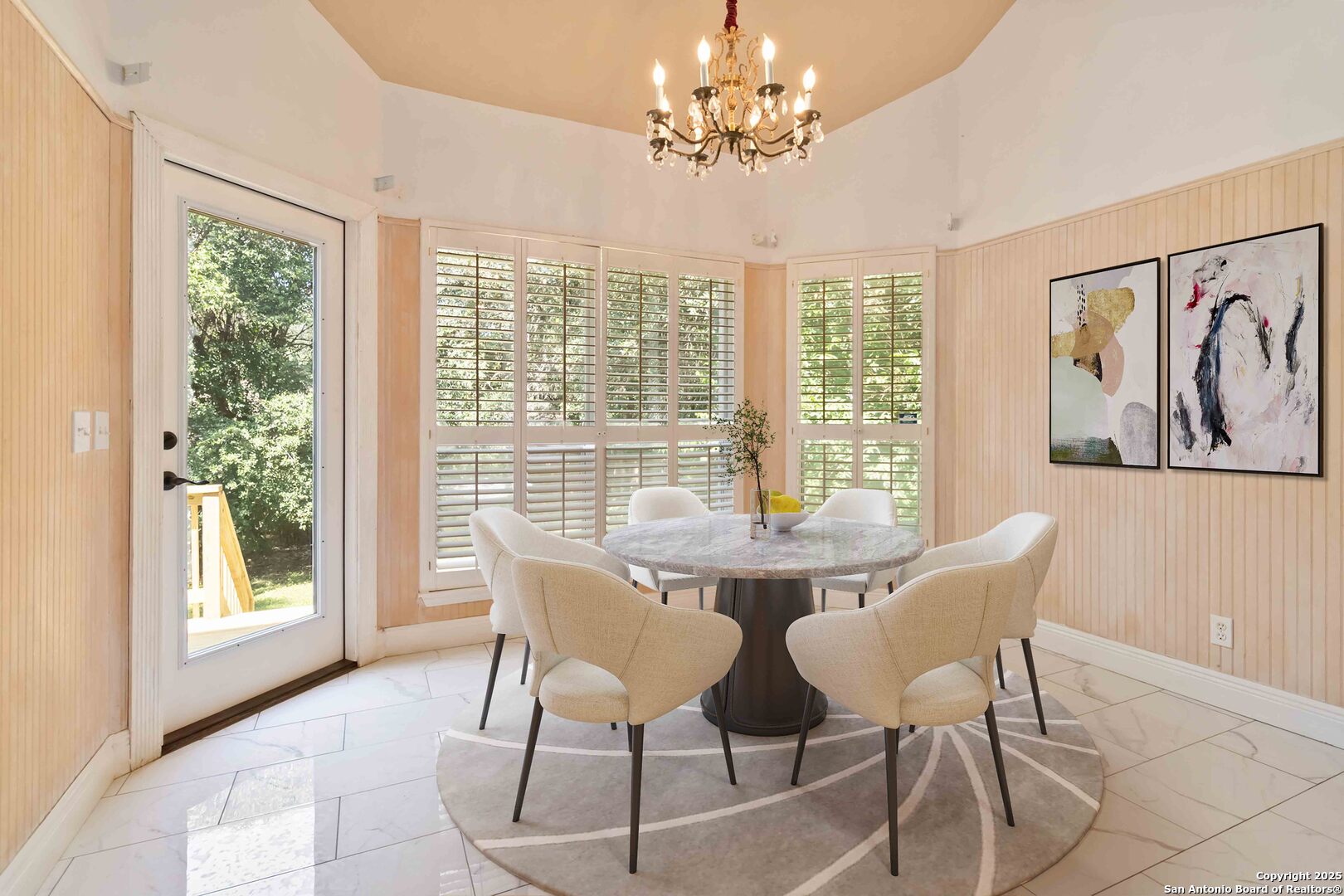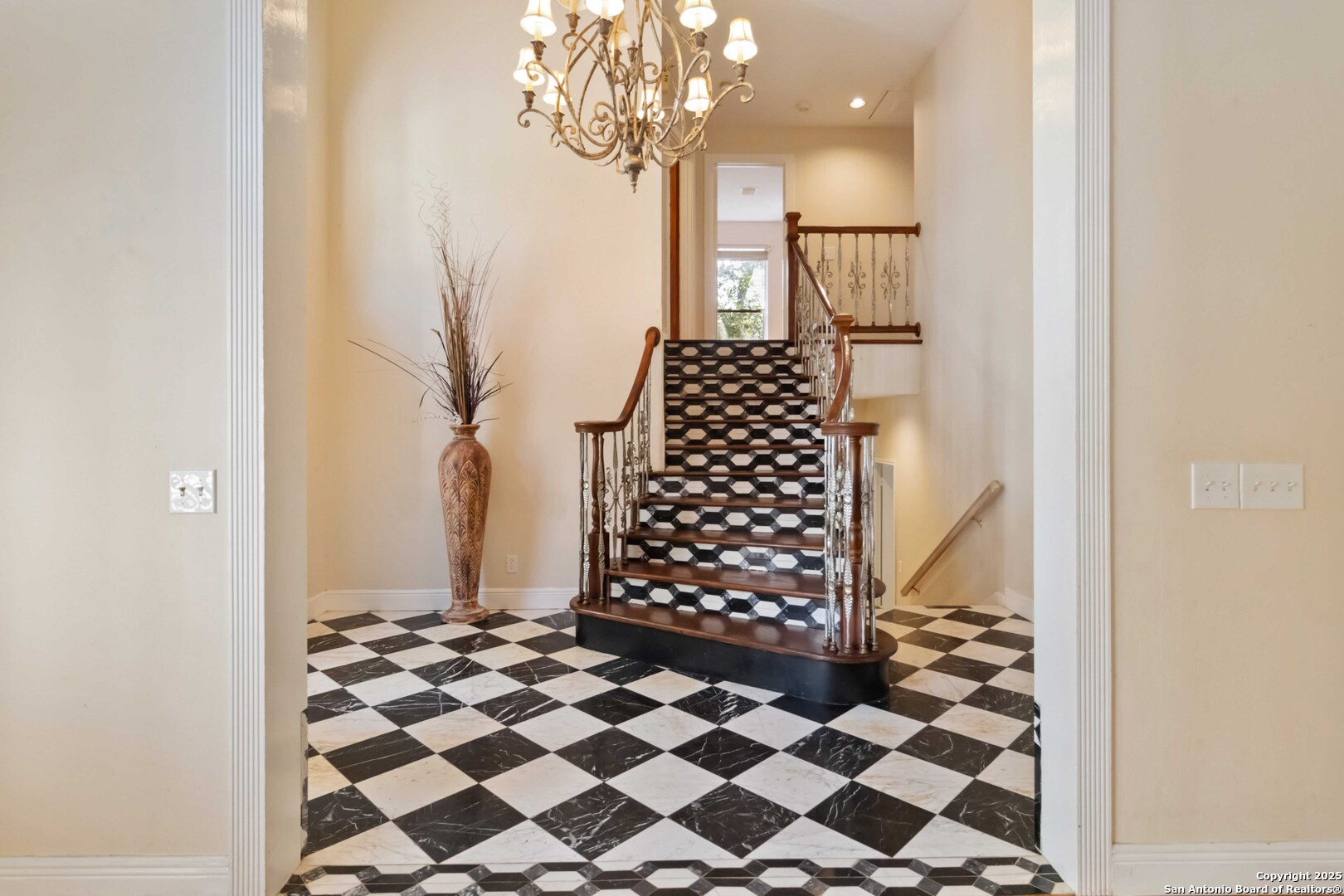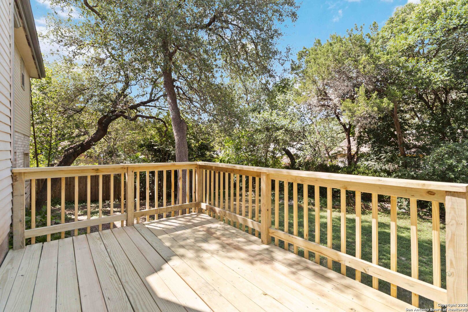 Tucked away behind the gates of the exclusive, guard-gated Mission Ridge community, this custom Sitterle home with 3147 sf, 4 bedrooms, 3.5 bath, offers privacy, charm, and timeless style. With mature trees and lush landscaping framing every window, you'll enjoy a serene, green view from every room. Designed with both elegance and comfort in mind, this spacious home features an abundance of natural light, classic upgraded finishes, and plantation shutters throughout. The thoughtfully designed floor plan includes zero-step entry for convenience and accessibility. The main level starts with the classic checkerboard tiled entry with lovely winding half staircase leading to the guest rooms. To the right relax in the formal living and dining anchored by custom parquet wood flooring accented with checkerboard edges perfectly bringing the entry and formal areas together. The large family room features a floor to ceiling fireplace for cozy evenings at home and sight lines to the sunlit breakfast nook. The chef's kitchen with a center island, induction cooktop, and ample counter space-is perfect for everyday living and entertaining alike. Just a half-flight down, you'll find the private primary suite and garage, providing a peaceful retreat without sacrificing accessibility. Up the stately half staircase off the entry , discover the secondary bedrooms connected by a Jack-and-Jill bath, a dedicated office, and a generously sized 4th bedroom/secondary primary with its own en suite bath. The 4th bedroom would make a great bunk room or flexible enough to be a game room or prewired media room. Outside, the front yard has been professionally xeriscaped for low-maintenance beauty, while the backyard is a quiet, tree-lined haven offering both privacy and potential, with a grassy area ready for your personal touch-be it a garden, pool, or play space. Recent upgrades include a HVAC system, dishwasher, garage doors (securing the extra deep 2 car garage), and lighting fixtures-all within the past few years-adding peace of mind to this already exceptional home. All of this in a prime location just minutes from 281 and 1604, with a convenient 20-minute commute to downtown San Antonio. Don't miss your opportunity to live in one of the city's most sought-after neighborhoods-this home truly has it all.