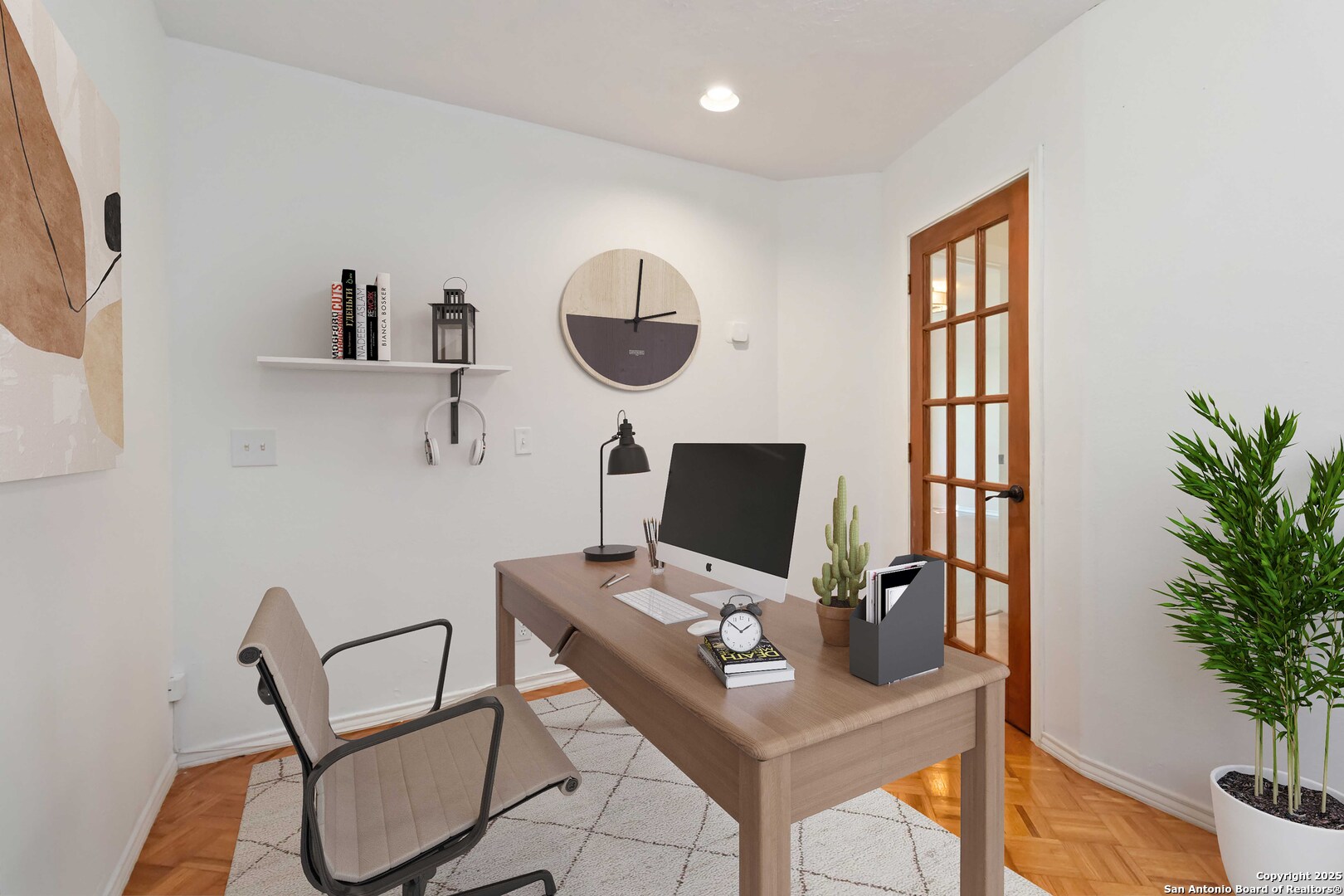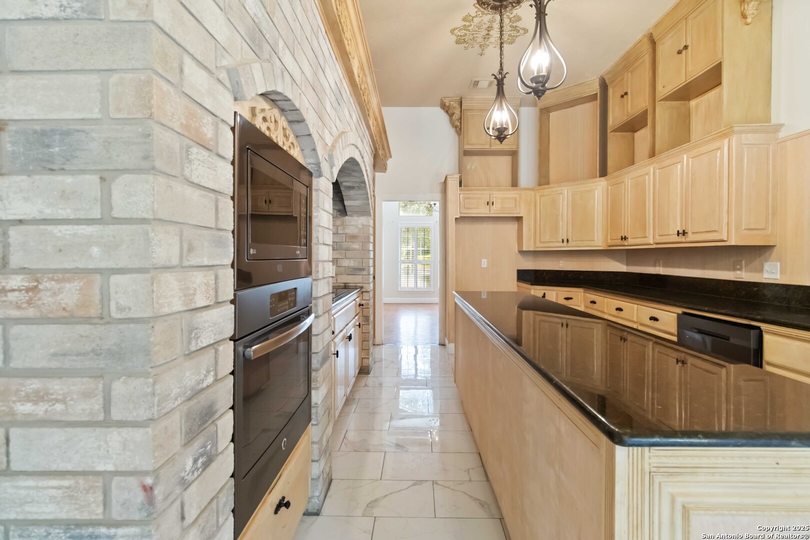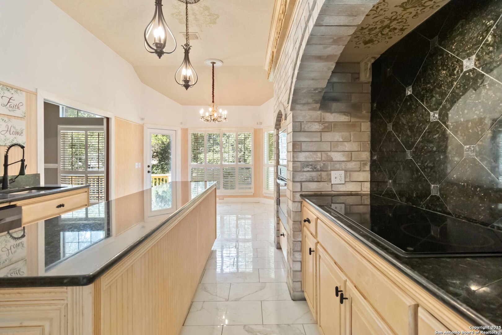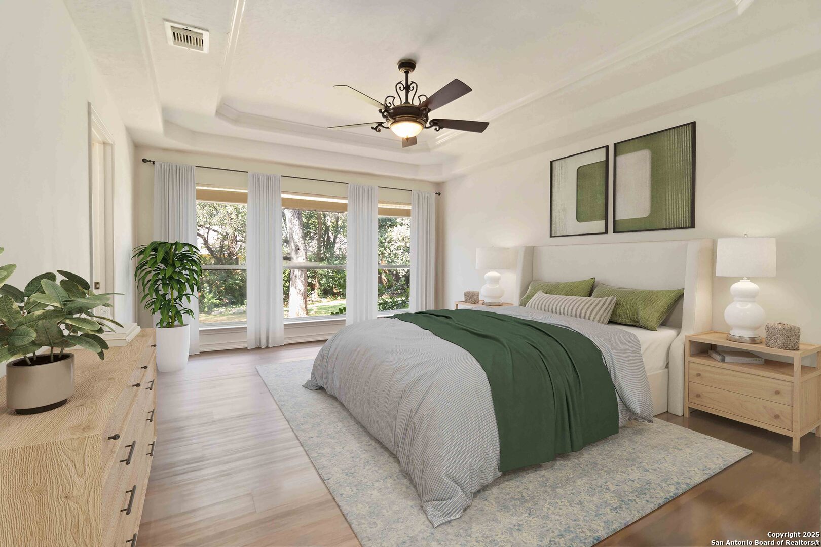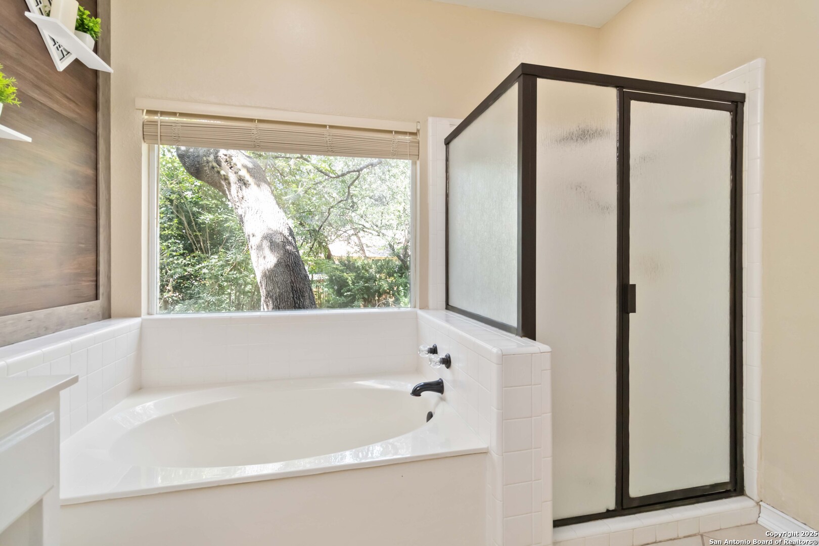 Tucked away behind the gates of the exclusive, guard-gated Mission Ridge community, this custom Sitterle home with 3147 sf, 4 bedrooms, 3.5 bath, offers privacy, charm, and timeless style. With mature trees and lush landscaping framing every window, you'll enjoy a serene, green view from every room. Designed with both elegance and comfort in mind, this spacious home features an abundance of natural light, classic upgraded finishes, and plantation shutters throughout. The thoughtfully designed floor plan includes zero-step entry for convenience and accessibility. The main level starts with the classic checkerboard tiled entry with lovely winding half staircase leading to the guest rooms. To the right relax in the formal living and dining anchored by custom parquet wood flooring accented with checkerboard edges perfectly bringing the entry and formal areas together. The large family room features a floor to ceiling fireplace for cozy evenings at home and sight lines to the sunlit breakfast nook. The chef's kitchen with a center island, induction cooktop, and ample counter space-is perfect for everyday living and entertaining alike. Just a half-flight down, you'll find the private primary suite and garage, providing a peaceful retreat without sacrificing accessibility. Up the stately half staircase off the entry , discover the secondary bedrooms connected by a Jack-and-Jill bath, a dedicated office, and a generously sized 4th bedroom/secondary primary with its own en suite bath. The 4th bedroom would make a great bunk room or flexible enough to be a game room or prewired media room. Outside, the front yard has been professionally xeriscaped for low-maintenance beauty, while the backyard is a quiet, tree-lined haven offering both privacy and potential, with a grassy area ready for your personal touch-be it a garden, pool, or play space. Recent upgrades include a HVAC system, dishwasher, garage doors (securing the extra deep 2 car garage), and lighting fixtures-all within the past few years-adding peace of mind to this already exceptional home. All of this in a prime location just minutes from 281 and 1604, with a convenient 20-minute commute to downtown San Antonio. Don't miss your opportunity to live in one of the city's most sought-after neighborhoods-this home truly has it all.