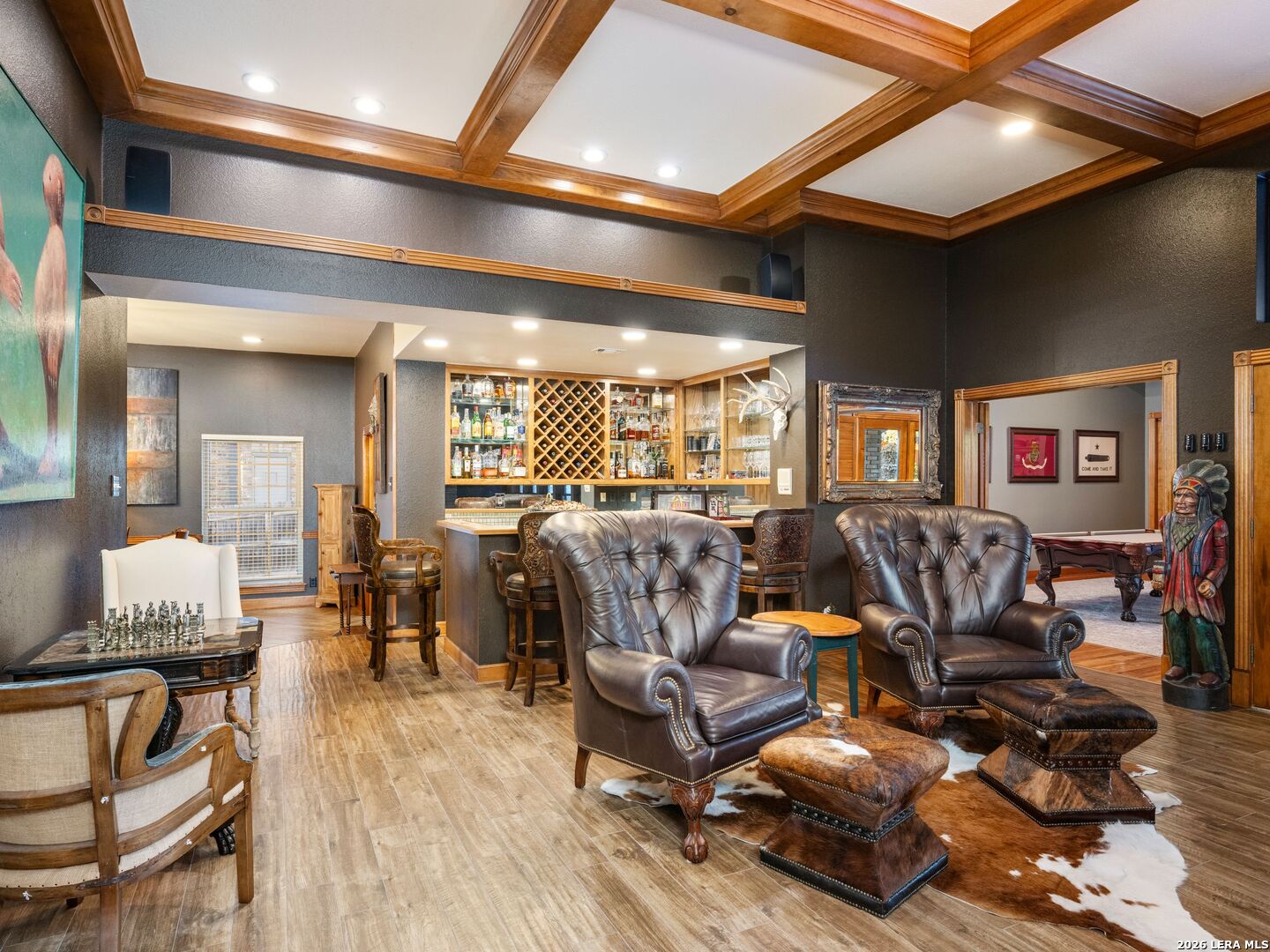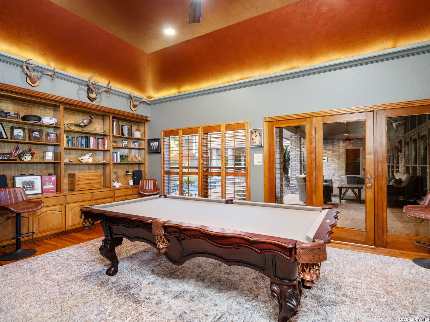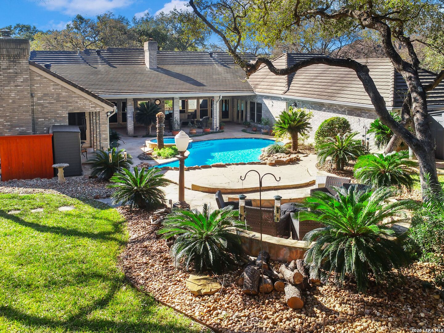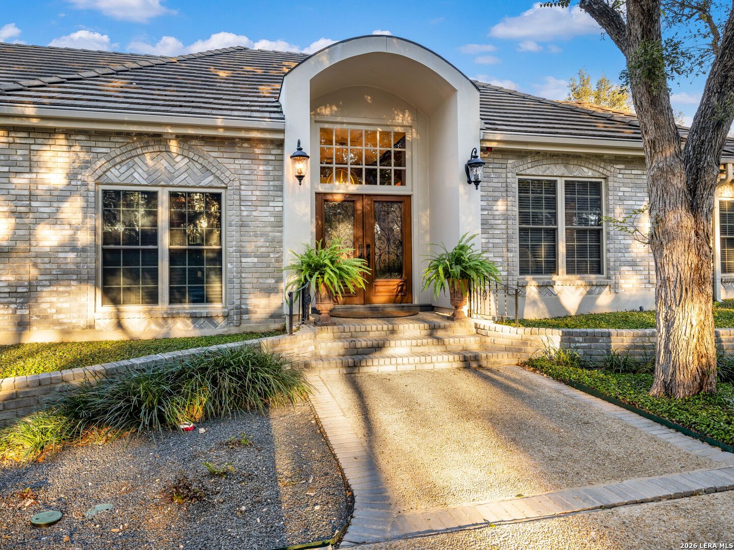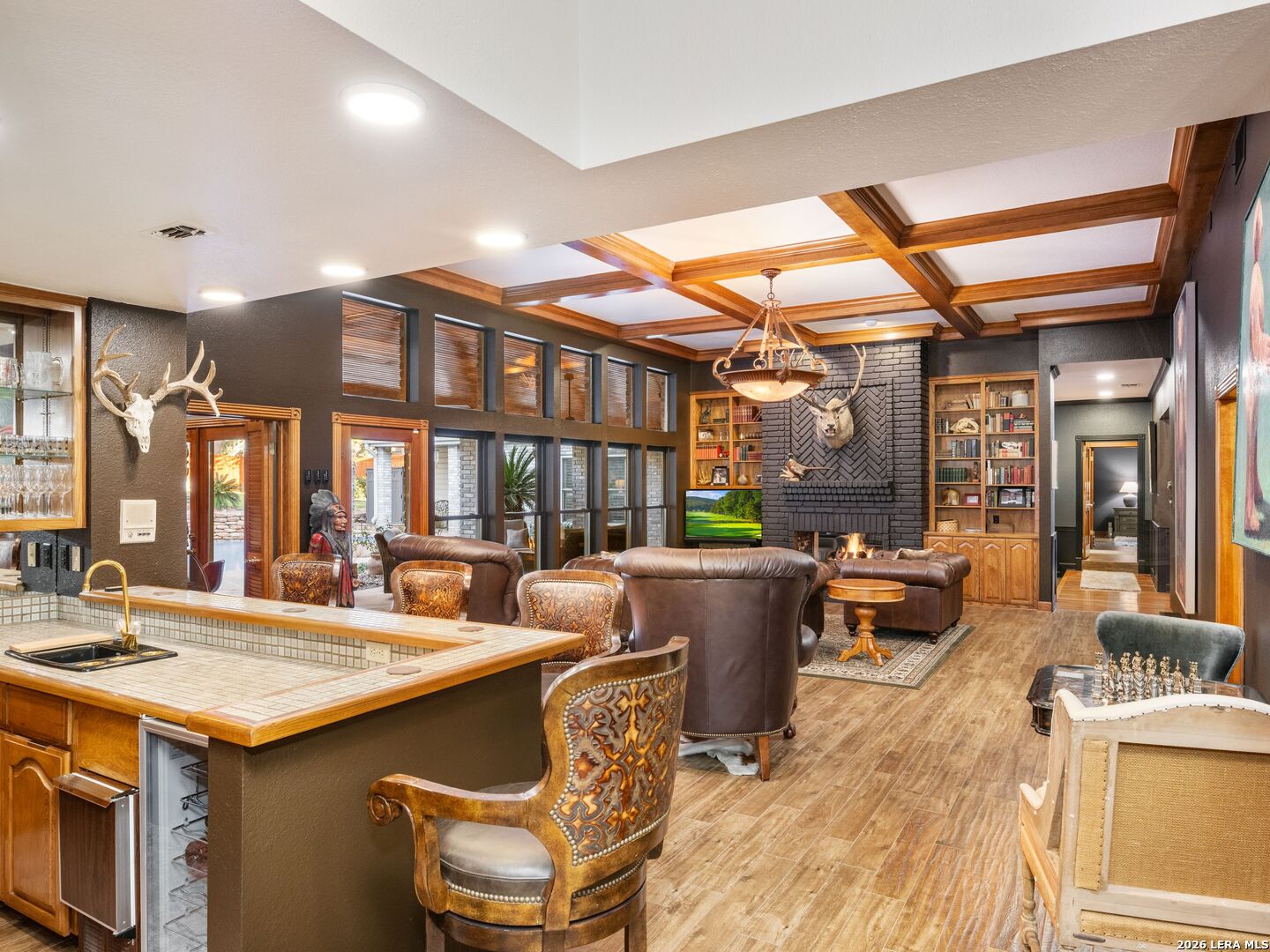 A rare find in coveted Bluffview Estates, this single-story residence delivers the space, layout, and amenities buyers search for-wrapped in a prime, treelined location. Thoughtfully updated and impeccably styled, the 4 bedroom, 4.5 bath home blends comfort with refined character. Inside, the design leans into a warm, moody dark academia aesthetic inspired by classic Ralph Lauren interiors. Metal infused paints in rich iron and copper tones create depth and sophistication, while abundant skylights and soaring ceilings flood the home with natural light. Multiple living and dining areas offer exceptional flexibility for everyday living and effortless entertaining.The family room features a full wet bar and a striking two-sided fireplace that anchors the main gathering spaces. The kitchen includes stainless steel appliances, generous counter space, ample storage, and options for both casual and formal dining. The spacious primary suite serves as a private retreat, complete with dual closets and an adjoining office featuring a brick fireplace and direct access to the backyard-ideal for working from home or unwinding in peace. All bathrooms, including the primary and secondary suites, have been tastefully updated with high quality tile selections and distinctive metallic mirrored stone accents. A large billiards room connects seamlessly to the family room and outdoor living area, creating an ideal setting for movie nights, hobbies, or play. Step outside to a true backyard oasis: mature trees, outdoor speakers, a wide covered patio, and a beautiful pool and spa designed for year round enjoyment. A Mosquito Nix system ensures comfort during summer gatherings or quiet evenings outdoors. The oversized three car garage with epoxy flooring and a circular drive provides abundant parking and storage. Recent improvements include new KitchenAid appliances in the kitchen, a refreshed roof with replaced tiles, new skylights, updated attic vents, and fully resealed flashing. The home features all tile flooring after removing carpet, along with gel stained wood trim and doors for a clean, updated look. Lighting has been modernized with LED upgrades, dimmer switches, and new wall plate covers, complemented by upgraded ceiling fans. The garage now showcases a carbon epoxy floor and a black finished ceiling. Outdoors, the property benefits from a new high efficiency sprinkler system, new sod in both front and back yards, updated landscaping, and added dramatic landscape lighting. Major system upgrades include a new Lennox main HVAC unit. Interior spaces have been refreshed with designer paint, and the billiards, hall, and bedroom bathrooms have all been updated. The improvements are rounded out with a newly replaced cedar fence. This is an exceptional home that must be experienced in person to fully appreciate-an opportunity that rarely comes available in Bluffview Estates!