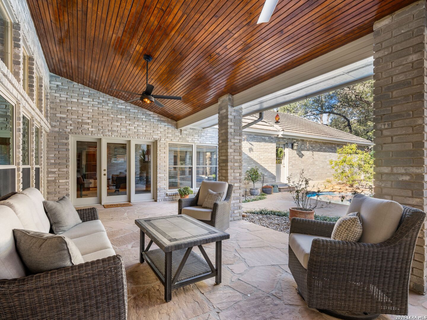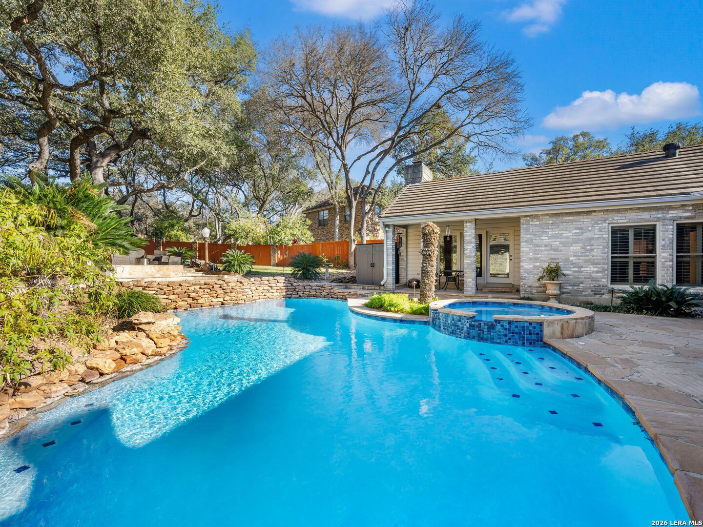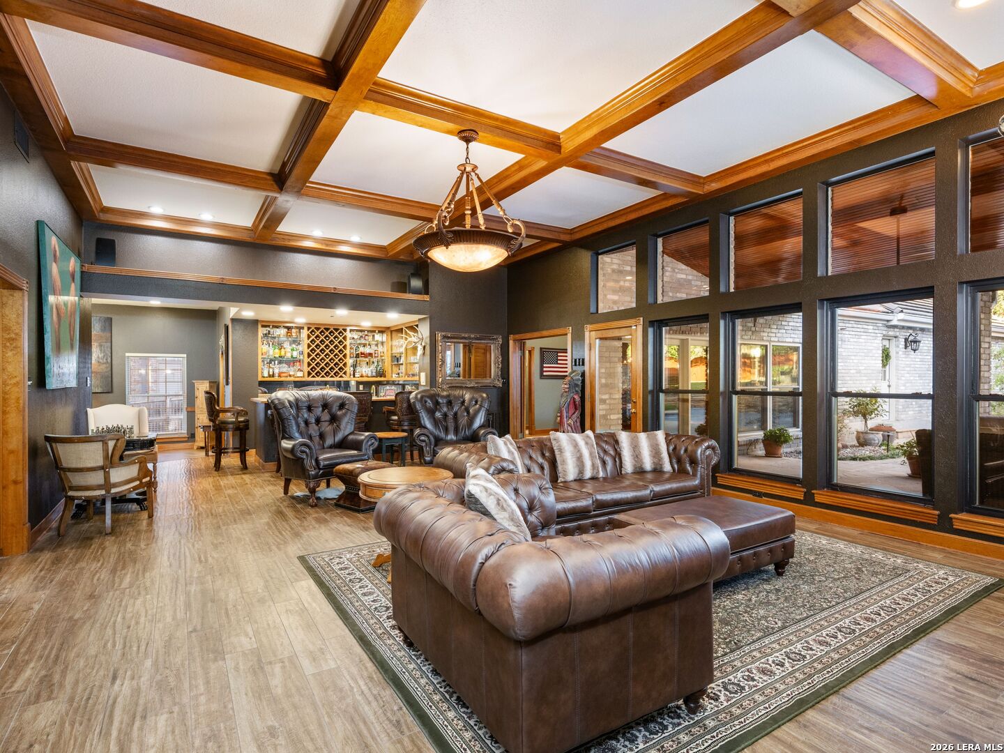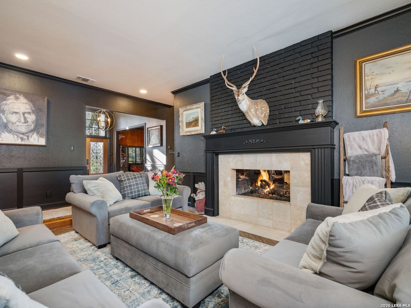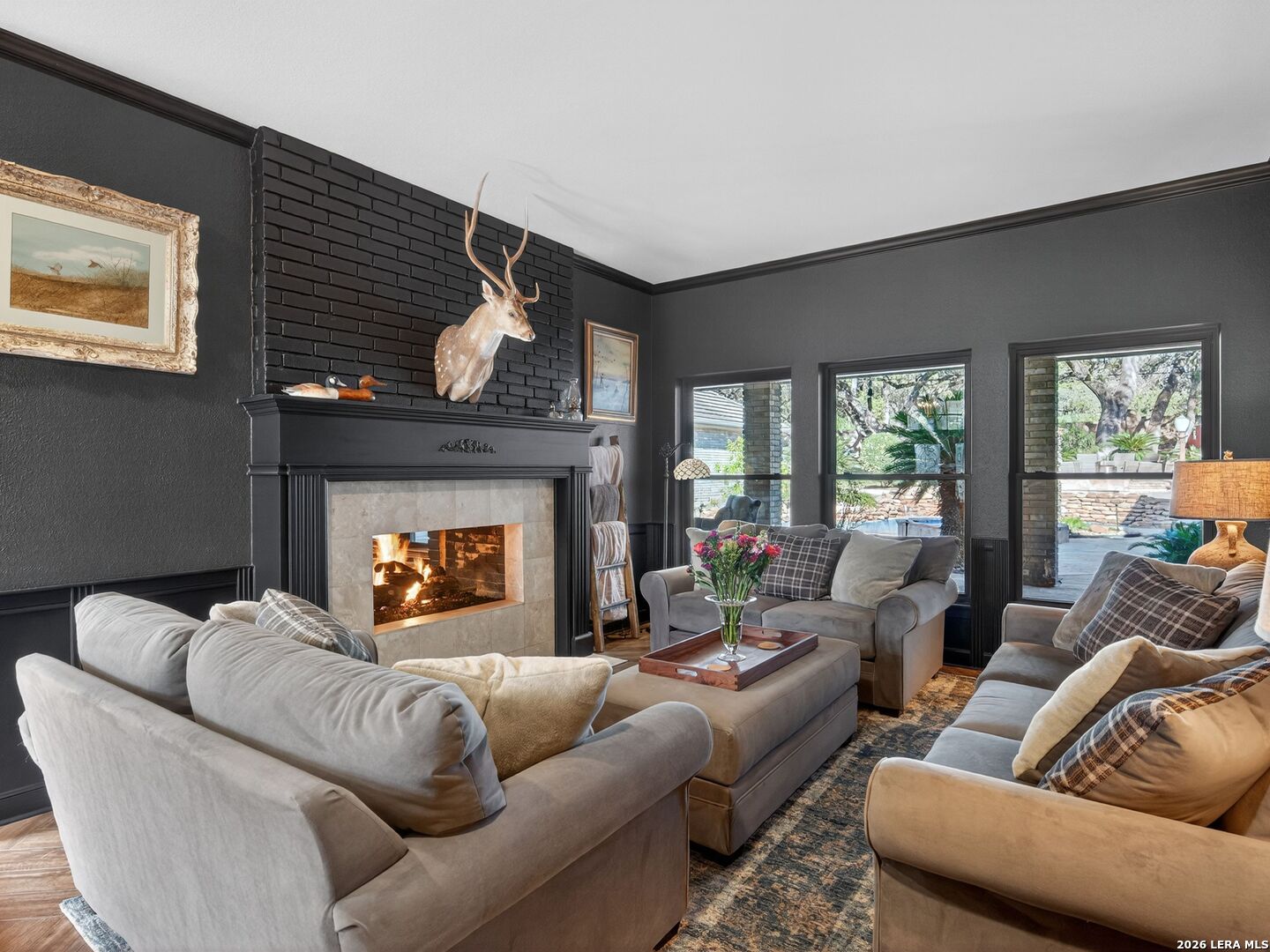 A rare find in coveted Bluffview Estates, this single-story residence delivers the space, layout, and amenities buyers search for-wrapped in a prime, treelined location. Thoughtfully updated and impeccably styled, the 4 bedroom, 4.5 bath home blends comfort with refined character. Inside, the design leans into a warm, moody dark academia aesthetic inspired by classic Ralph Lauren interiors. Metal infused paints in rich iron and copper tones create depth and sophistication, while abundant skylights and soaring ceilings flood the home with natural light. Multiple living and dining areas offer exceptional flexibility for everyday living and effortless entertaining.The family room features a full wet bar and a striking two-sided fireplace that anchors the main gathering spaces. The kitchen includes stainless steel appliances, generous counter space, ample storage, and options for both casual and formal dining. The spacious primary suite serves as a private retreat, complete with dual closets and an adjoining office featuring a brick fireplace and direct access to the backyard-ideal for working from home or unwinding in peace. All bathrooms, including the primary and secondary suites, have been tastefully updated with high quality tile selections and distinctive metallic mirrored stone accents. A large billiards room connects seamlessly to the family room and outdoor living area, creating an ideal setting for movie nights, hobbies, or play. Step outside to a true backyard oasis: mature trees, outdoor speakers, a wide covered patio, and a beautiful pool and spa designed for year round enjoyment. A Mosquito Nix system ensures comfort during summer gatherings or quiet evenings outdoors. The oversized three car garage with epoxy flooring and a circular drive provides abundant parking and storage. Recent improvements include new KitchenAid appliances in the kitchen, a refreshed roof with replaced tiles, new skylights, updated attic vents, and fully resealed flashing. The home features all tile flooring after removing carpet, along with gel stained wood trim and doors for a clean, updated look. Lighting has been modernized with LED upgrades, dimmer switches, and new wall plate covers, complemented by upgraded ceiling fans. The garage now showcases a carbon epoxy floor and a black finished ceiling. Outdoors, the property benefits from a new high efficiency sprinkler system, new sod in both front and back yards, updated landscaping, and added dramatic landscape lighting. Major system upgrades include a new Lennox main HVAC unit. Interior spaces have been refreshed with designer paint, and the billiards, hall, and bedroom bathrooms have all been updated. The improvements are rounded out with a newly replaced cedar fence. This is an exceptional home that must be experienced in person to fully appreciate-an opportunity that rarely comes available in Bluffview Estates!