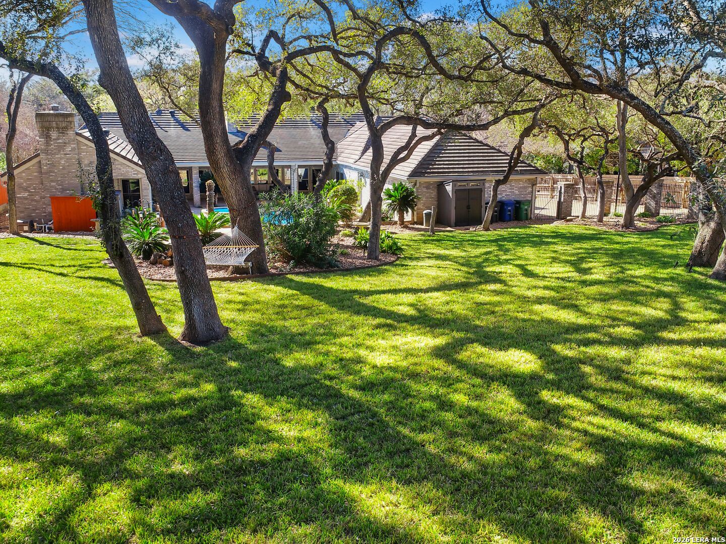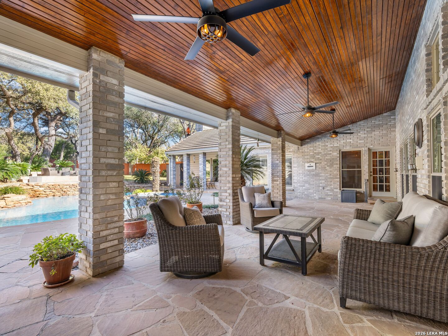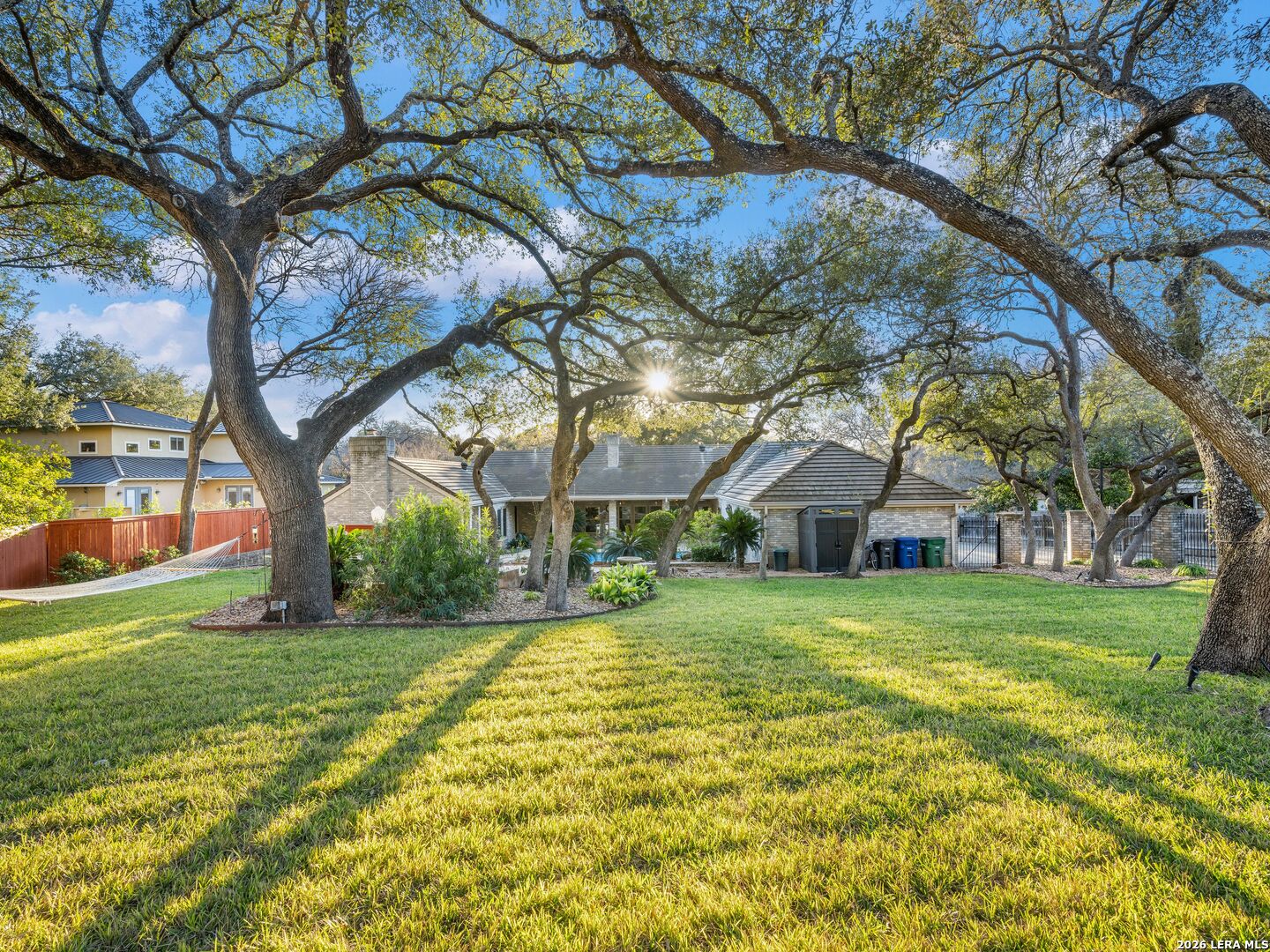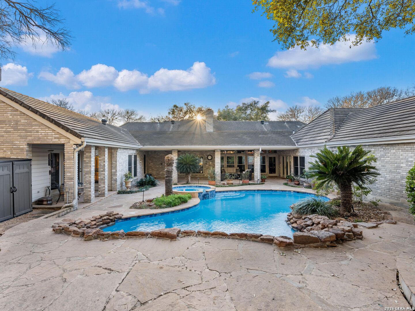 A rare find in coveted Bluffview Estates, this single-story residence delivers the space, layout, and amenities buyers search for-wrapped in a prime, treelined location. Thoughtfully updated and impeccably styled, the 4 bedroom, 4.5 bath home blends comfort with refined character. Inside, the design leans into a warm, moody dark academia aesthetic inspired by classic Ralph Lauren interiors. Metal infused paints in rich iron and copper tones create depth and sophistication, while abundant skylights and soaring ceilings flood the home with natural light. Multiple living and dining areas offer exceptional flexibility for everyday living and effortless entertaining.The family room features a full wet bar and a striking two-sided fireplace that anchors the main gathering spaces. The kitchen includes stainless steel appliances, generous counter space, ample storage, and options for both casual and formal dining. The spacious primary suite serves as a private retreat, complete with dual closets and an adjoining office featuring a brick fireplace and direct access to the backyard-ideal for working from home or unwinding in peace. All bathrooms, including the primary and secondary suites, have been tastefully updated with high quality tile selections and distinctive metallic mirrored stone accents. A large billiards room connects seamlessly to the family room and outdoor living area, creating an ideal setting for movie nights, hobbies, or play. Step outside to a true backyard oasis: mature trees, outdoor speakers, a wide covered patio, and a beautiful pool and spa designed for year round enjoyment. A Mosquito Nix system ensures comfort during summer gatherings or quiet evenings outdoors. The oversized three car garage with epoxy flooring and a circular drive provides abundant parking and storage. Recent improvements include new KitchenAid appliances in the kitchen, a refreshed roof with replaced tiles, new skylights, updated attic vents, and fully resealed flashing. The home features all tile flooring after removing carpet, along with gel stained wood trim and doors for a clean, updated look. Lighting has been modernized with LED upgrades, dimmer switches, and new wall plate covers, complemented by upgraded ceiling fans. The garage now showcases a carbon epoxy floor and a black finished ceiling. Outdoors, the property benefits from a new high efficiency sprinkler system, new sod in both front and back yards, updated landscaping, and added dramatic landscape lighting. Major system upgrades include a new Lennox main HVAC unit. Interior spaces have been refreshed with designer paint, and the billiards, hall, and bedroom bathrooms have all been updated. The improvements are rounded out with a newly replaced cedar fence. This is an exceptional home that must be experienced in person to fully appreciate-an opportunity that rarely comes available in Bluffview Estates!